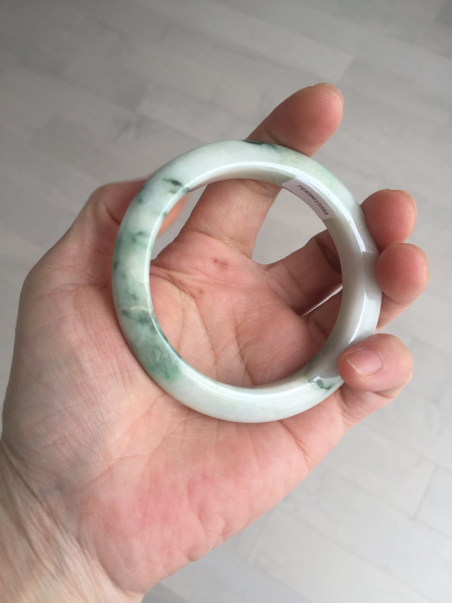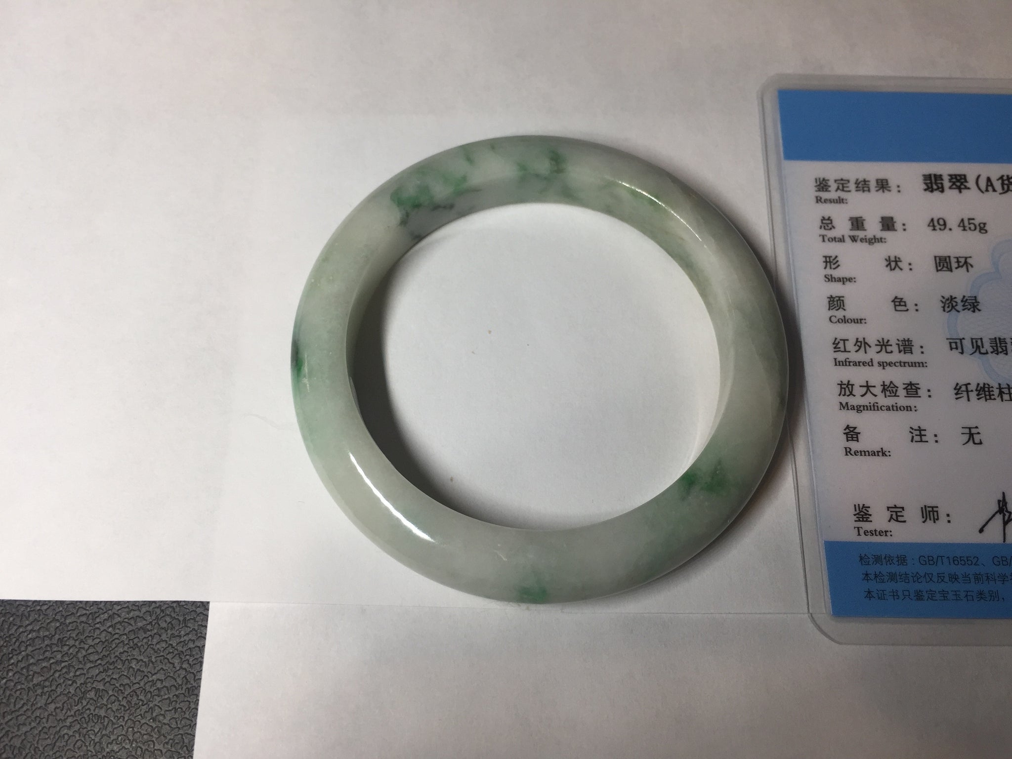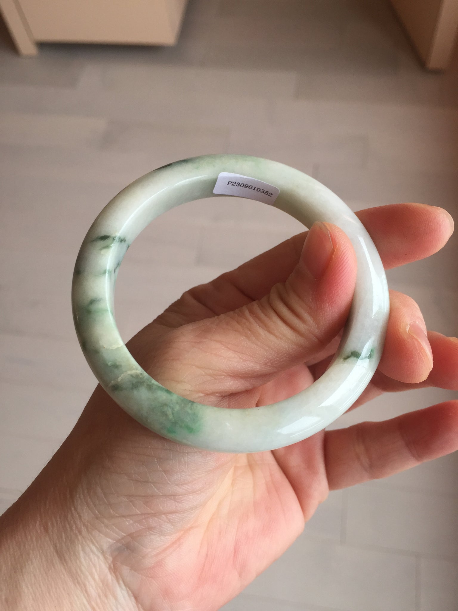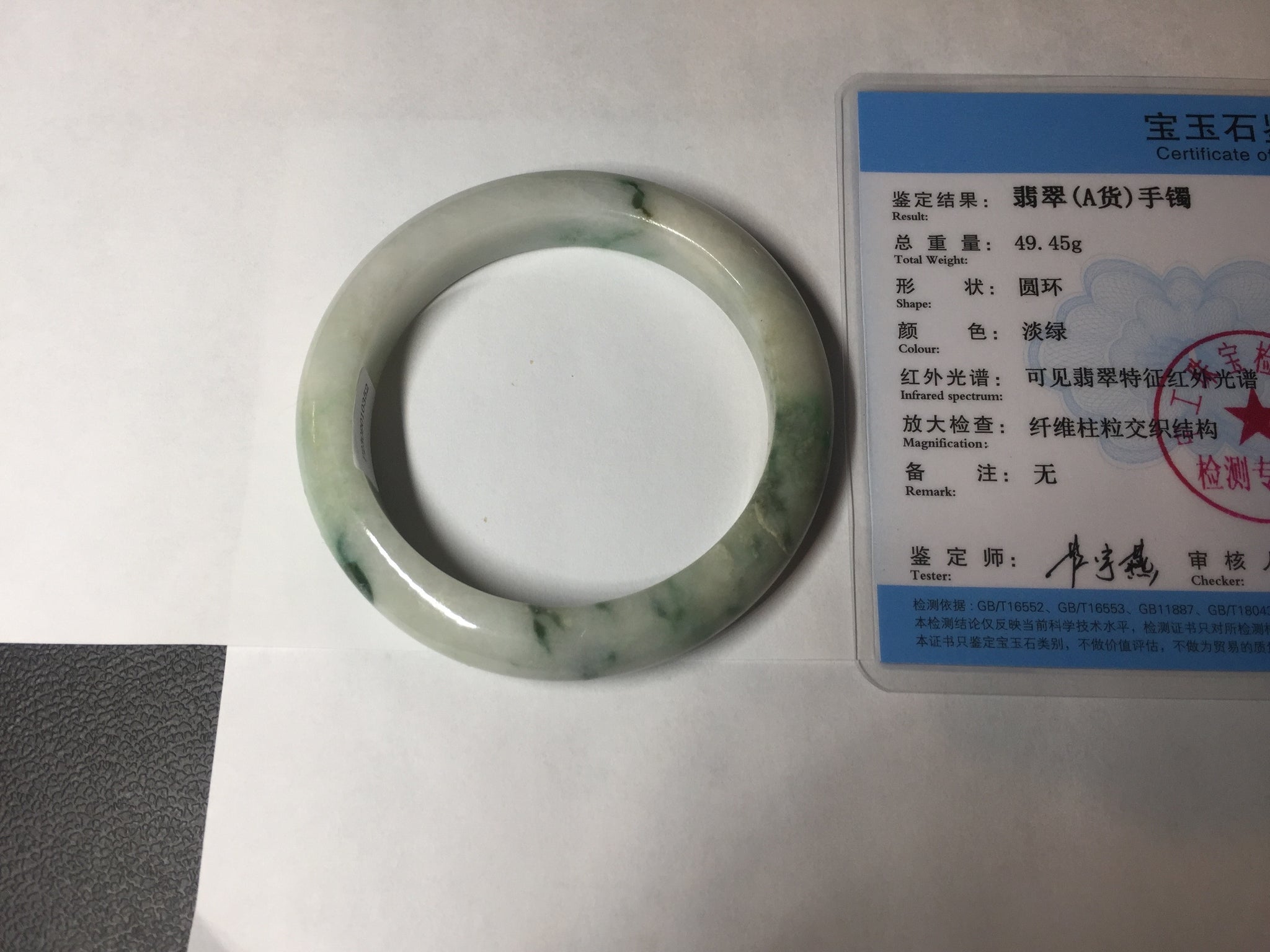 Some cracks with a medium amount of wax. One crack is deep. The bangle is solid. Some hairlines, cotton areas, lines, and spots. It is not transparent.