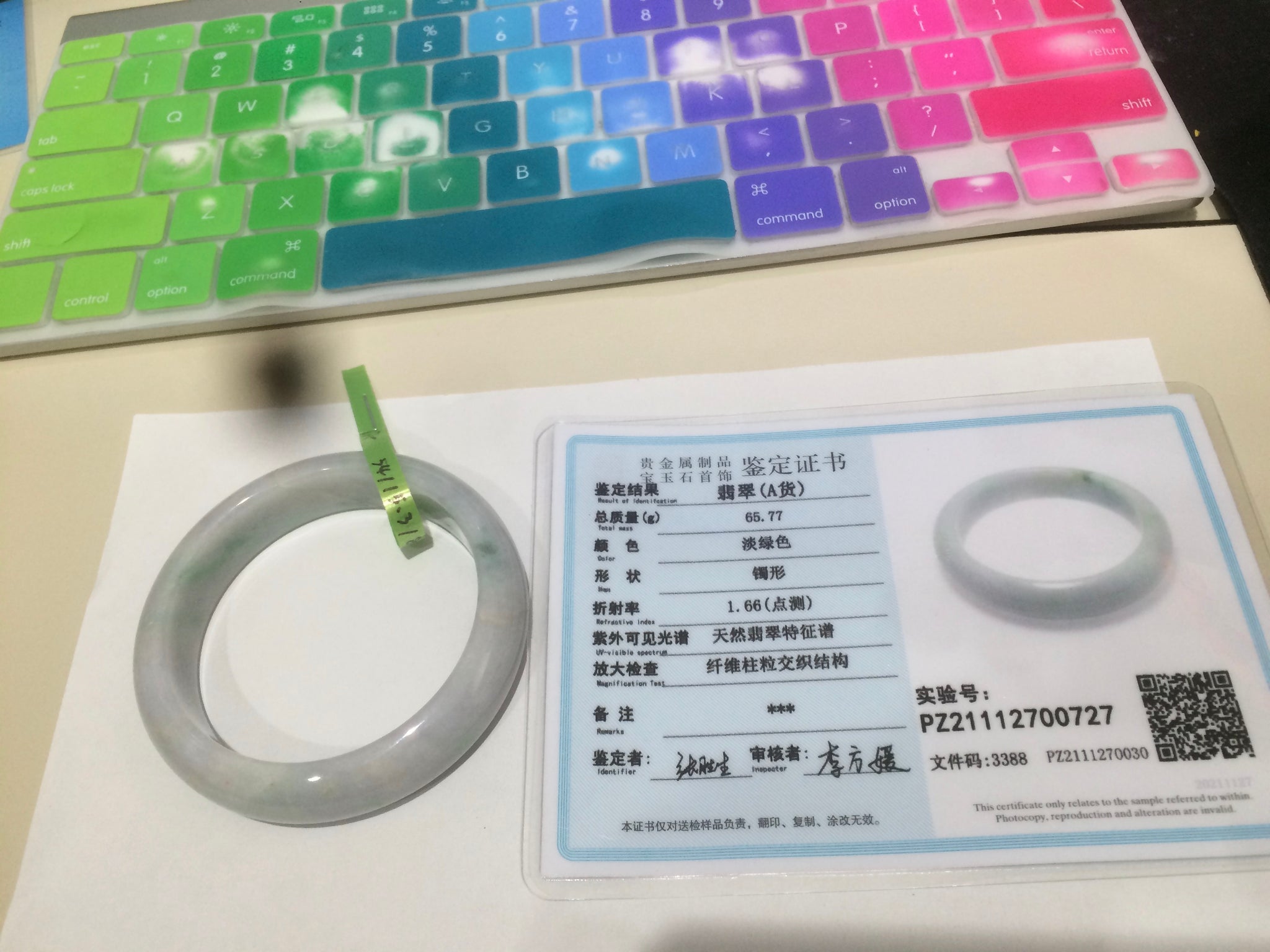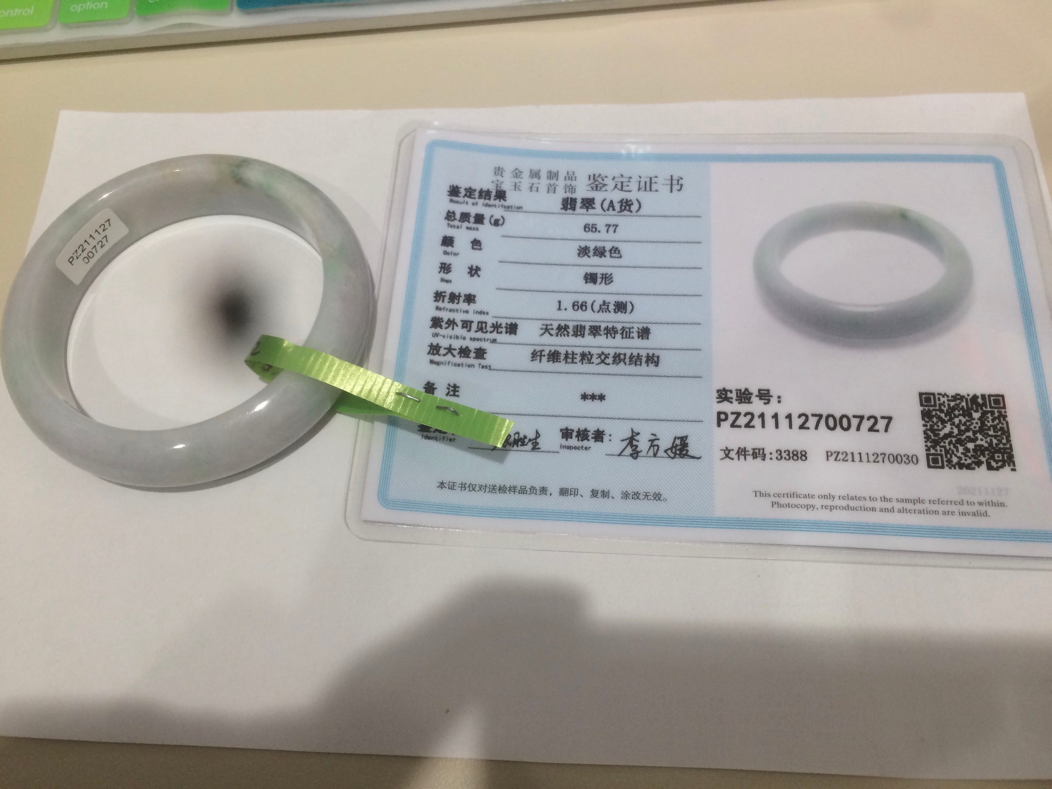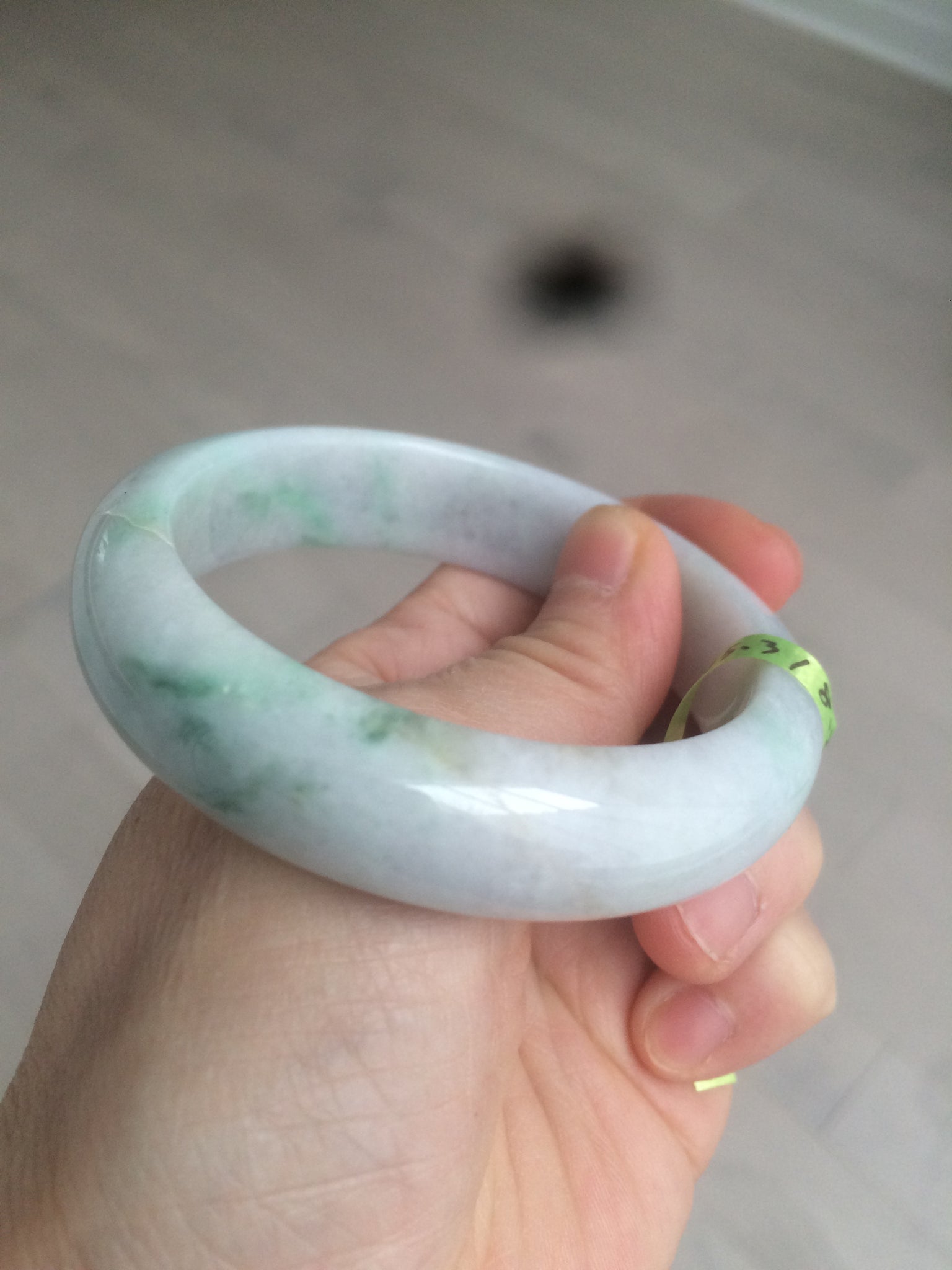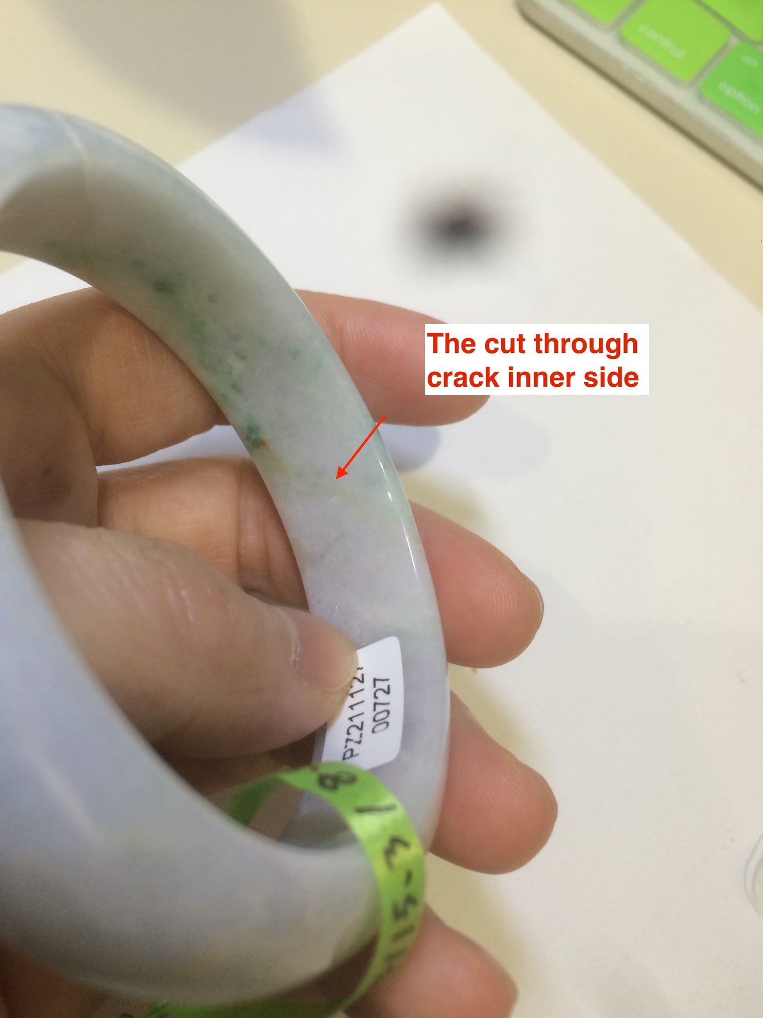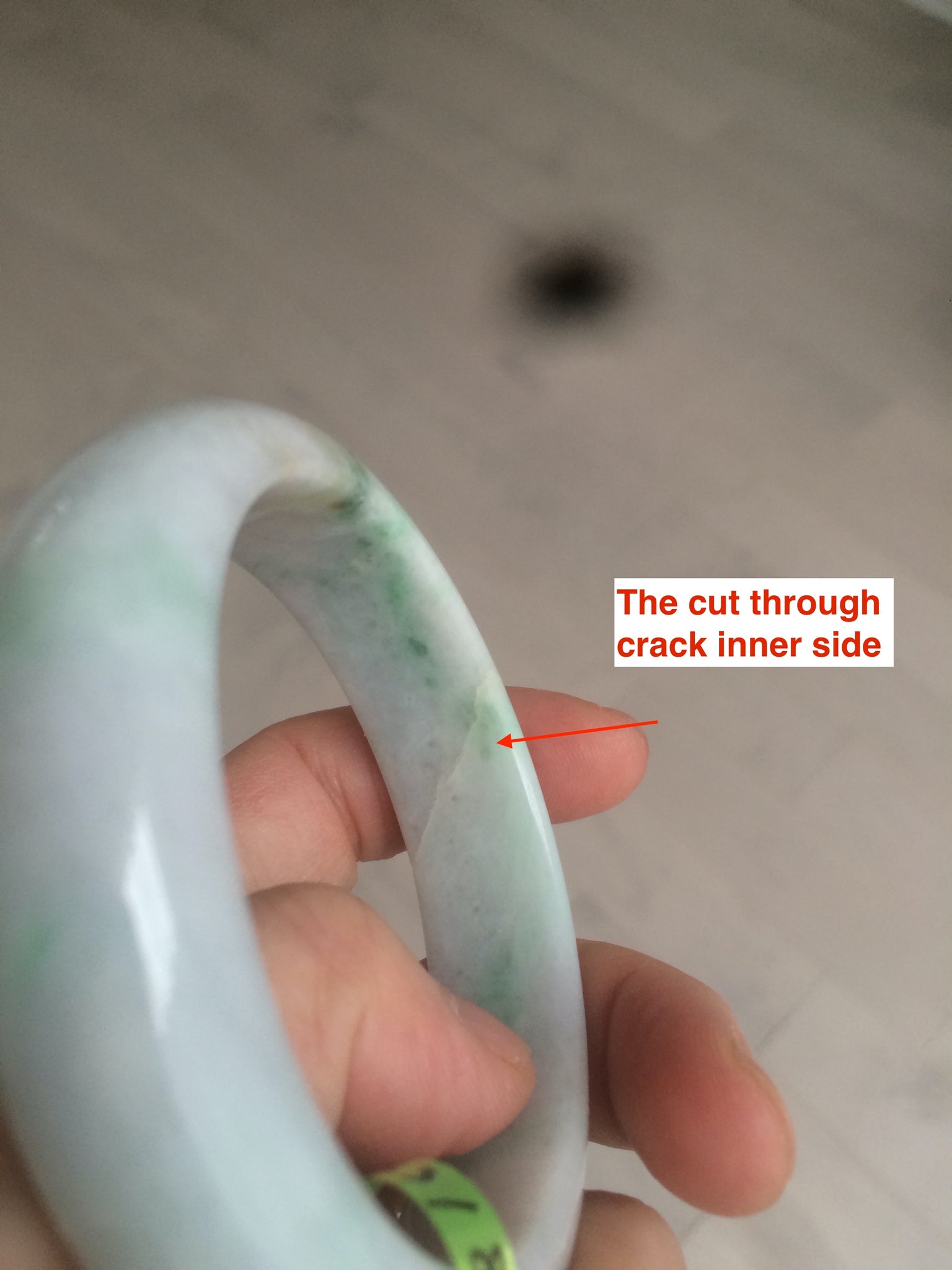 One ring shape crack with some wax residue. Both side of the ring cut through the bangle. The firmness will be decreased. Tight fit is NOT recomaneded. One hairline. Cotton spots.