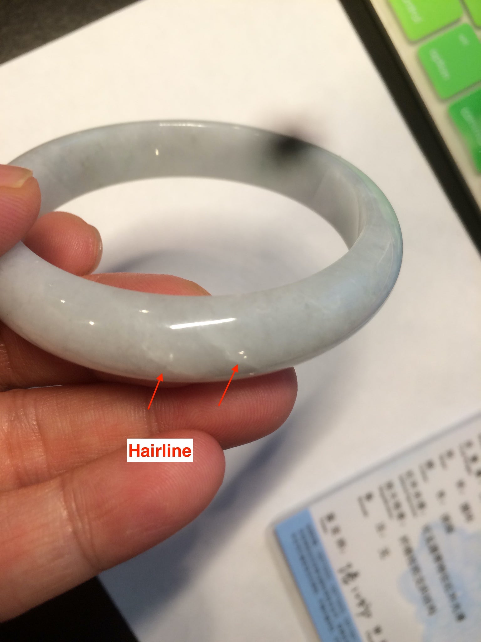 One crack. 2 hairlines. Some cotton lines and spots.