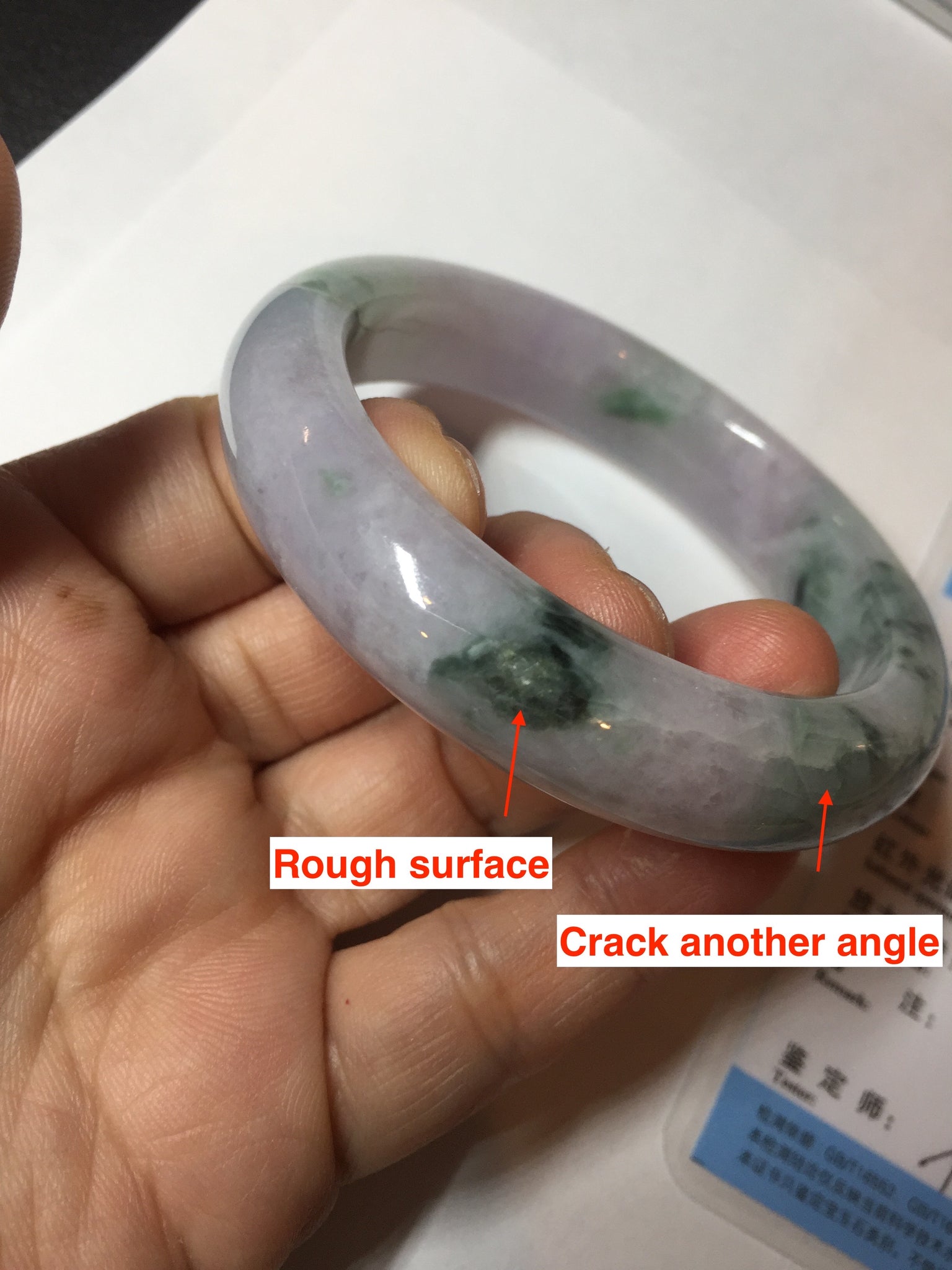 Some cracks.  Some of them are long. But the bangle is still solid (guaranteed!). Some hairlines.  Some cotton lines and cotton spots. The purple is lighter than the photos due to the purple always being more camera-friendly.