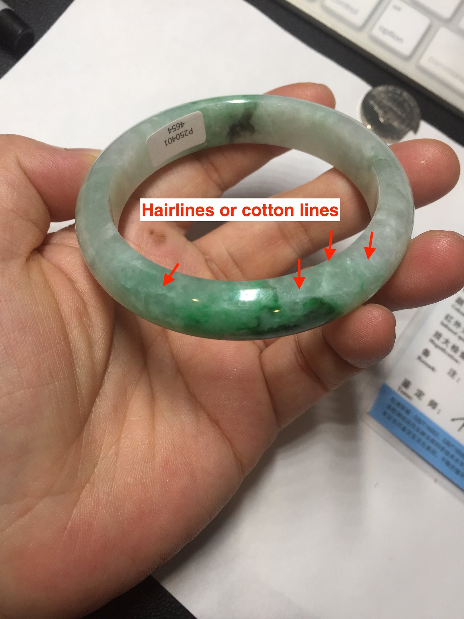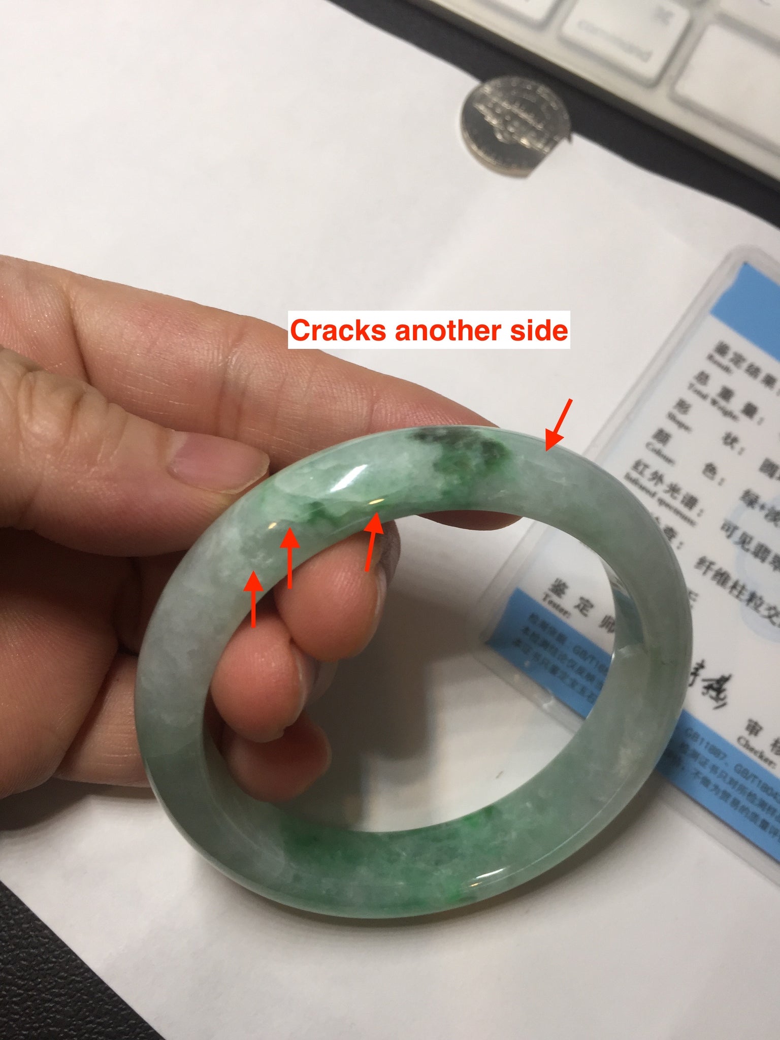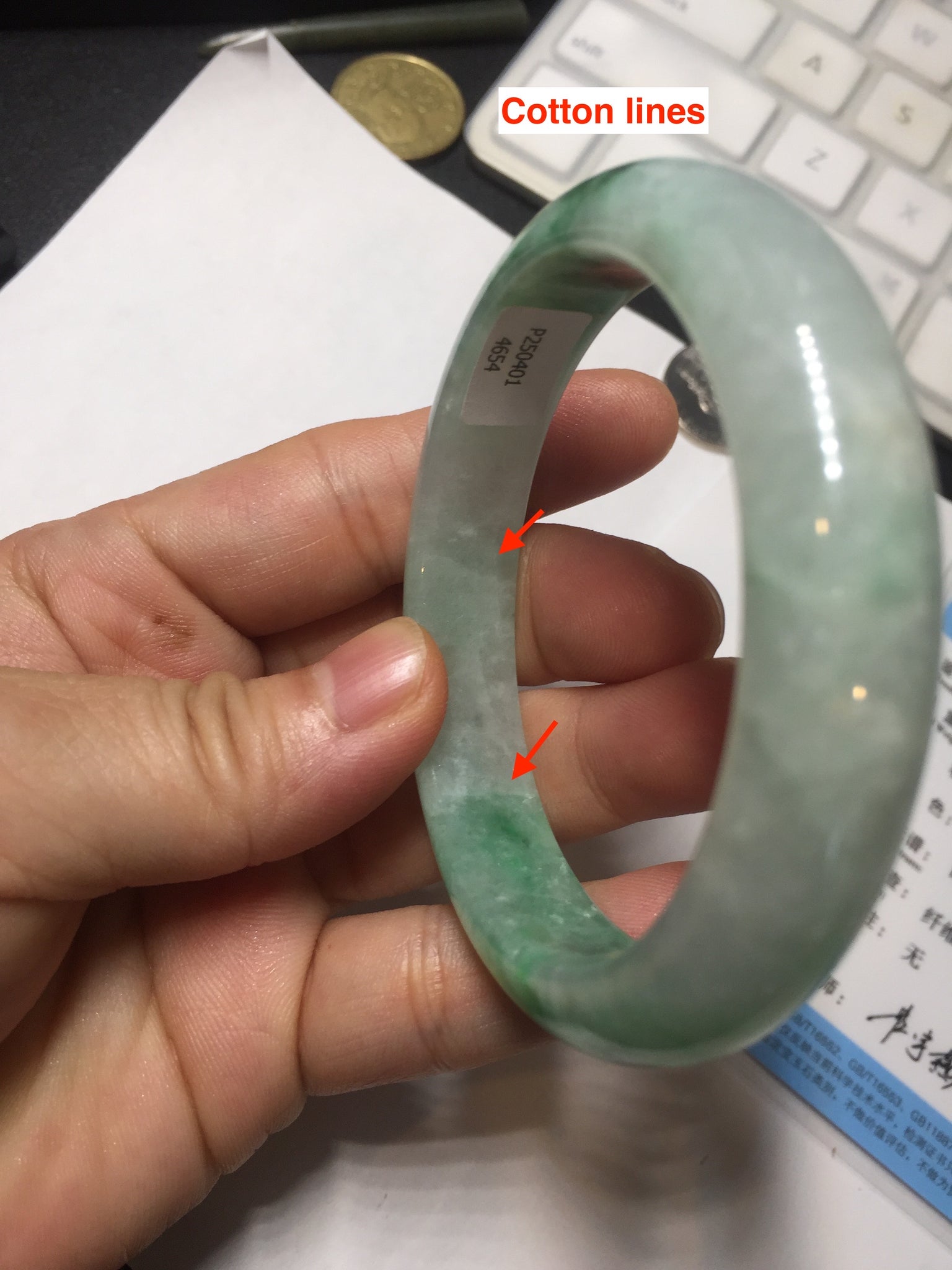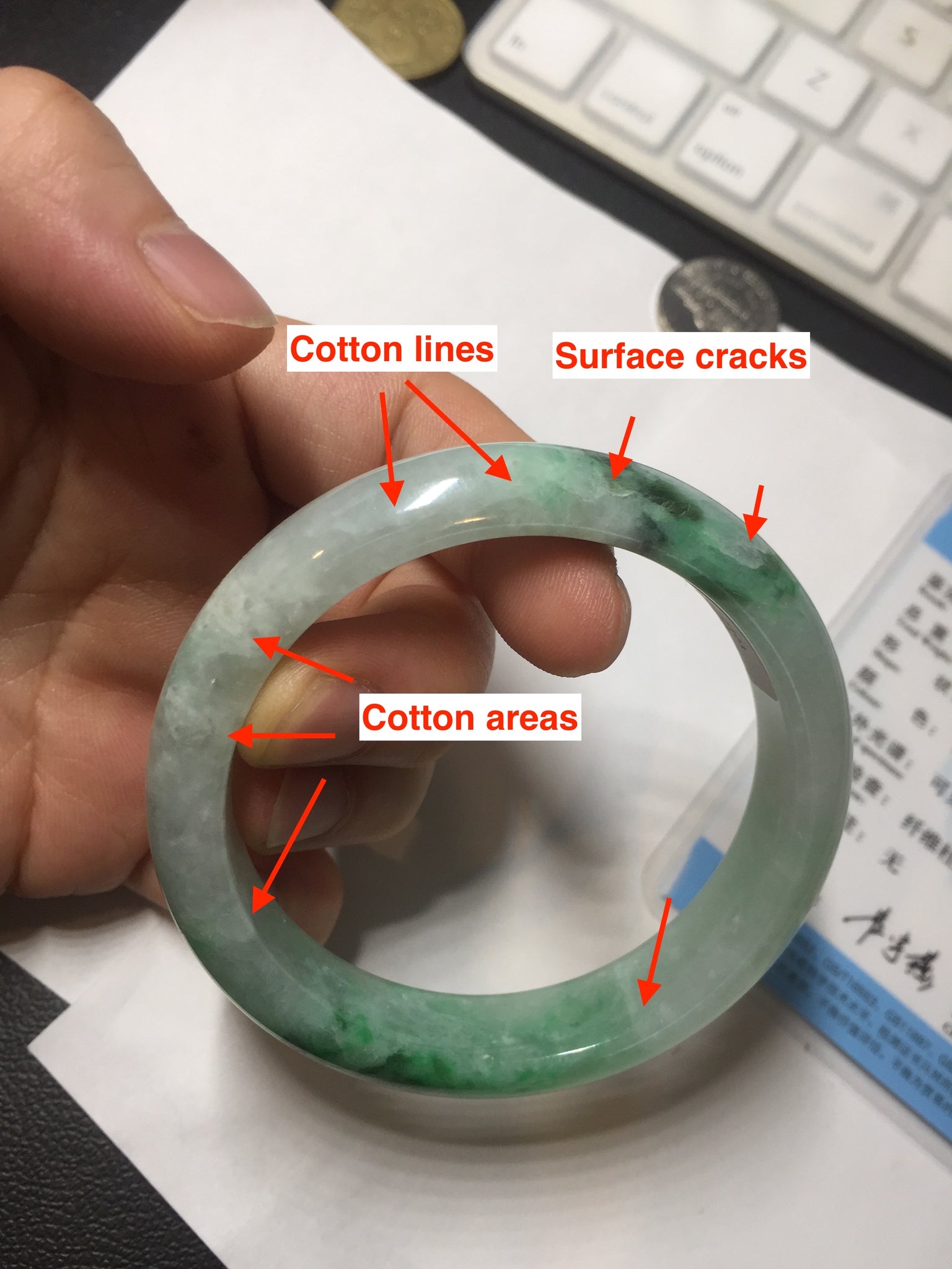 Some crack. Some rough surface areas with surface fissures or cracks. The bangle is solid. Some hairlines. Some cotton lines and cotton spots. Some blisters and rough spots. The texture is not delicate.