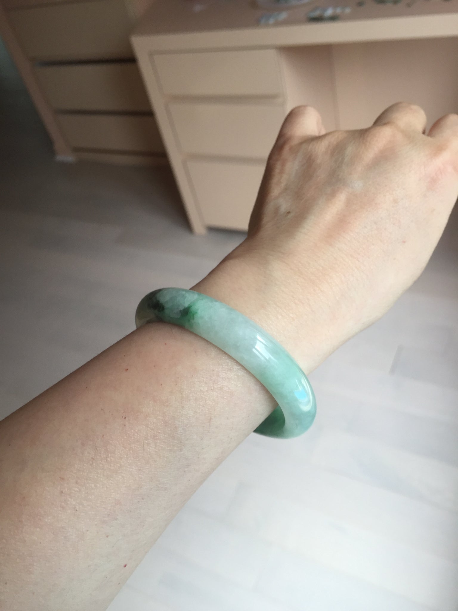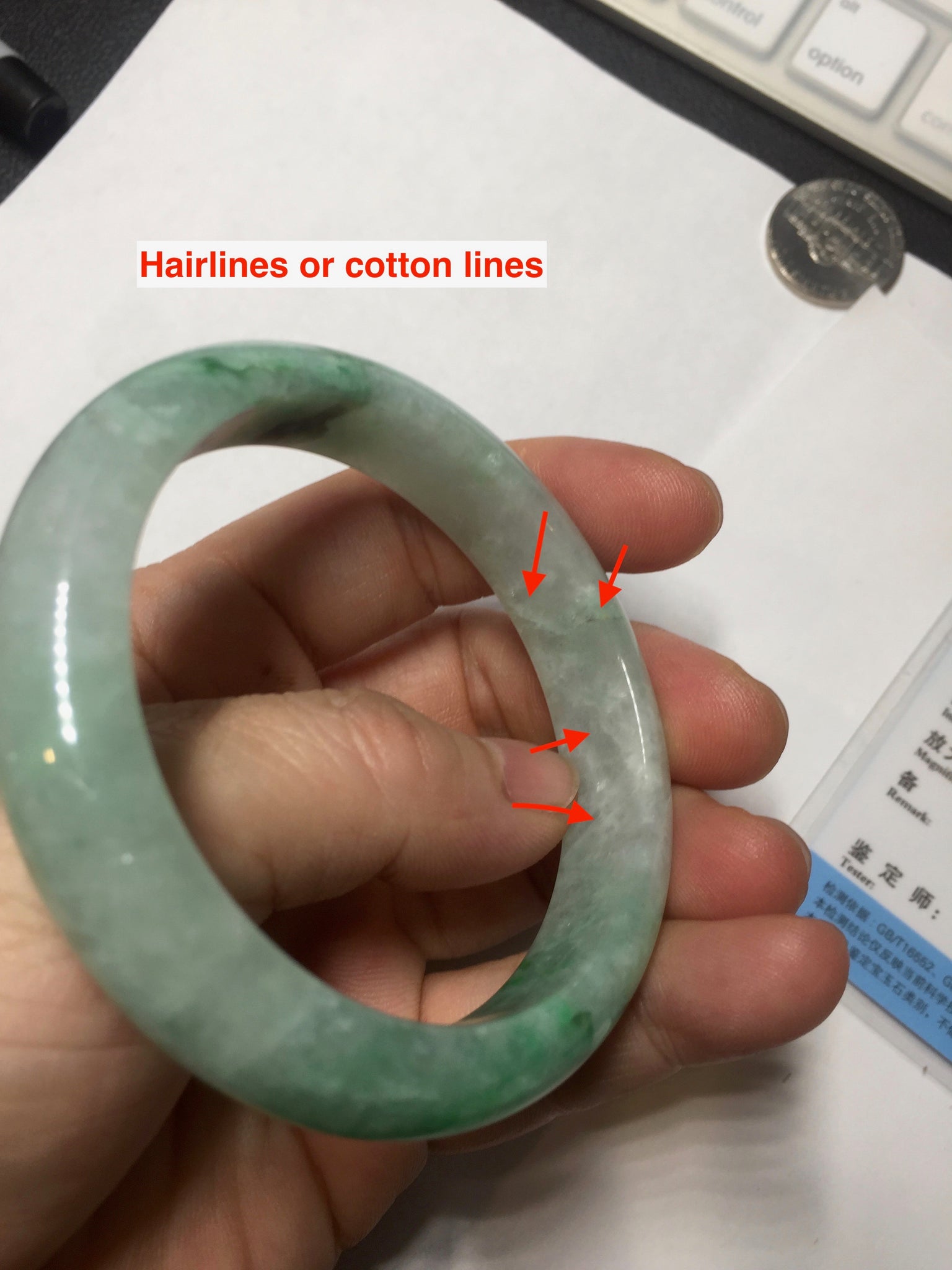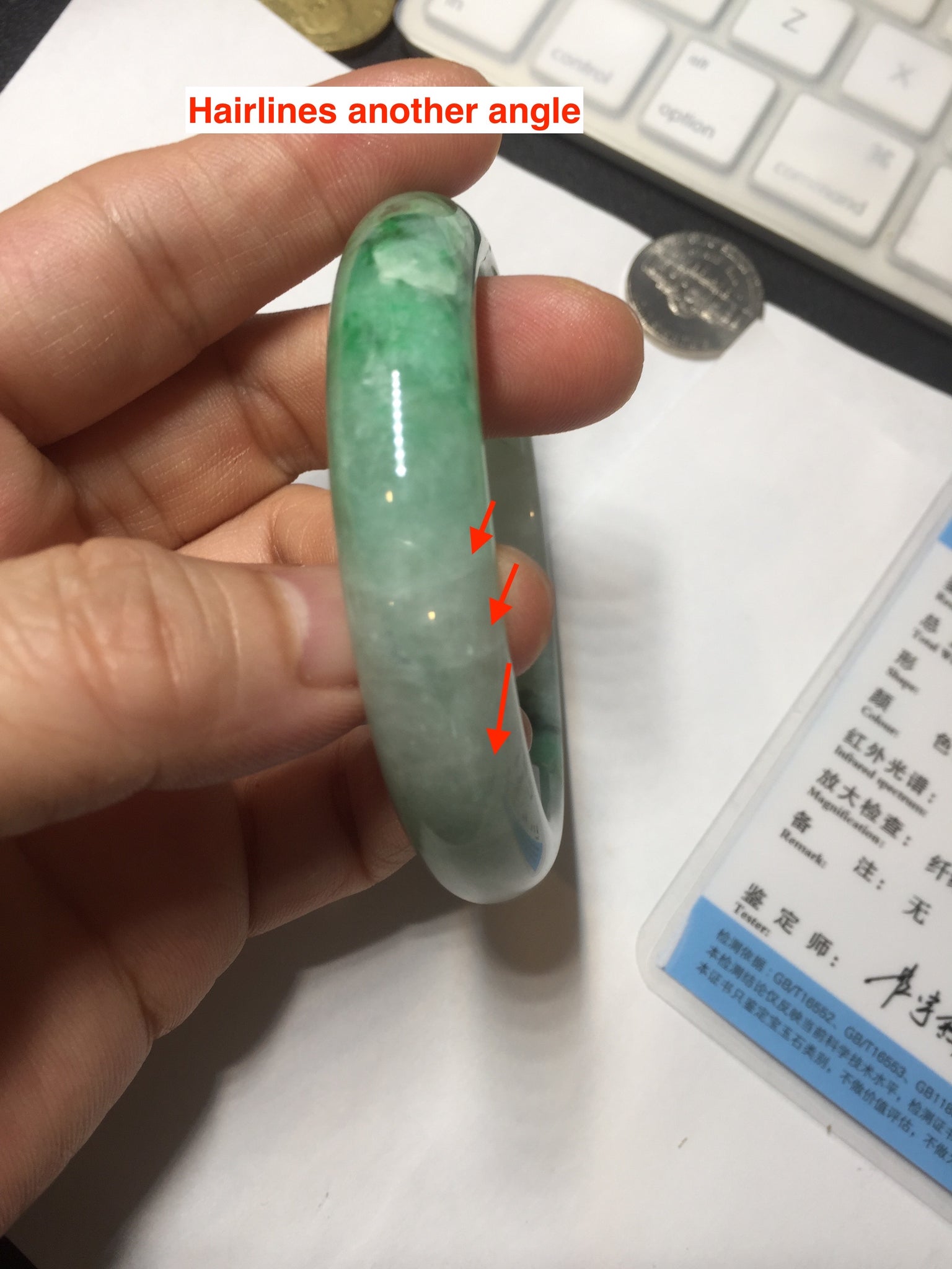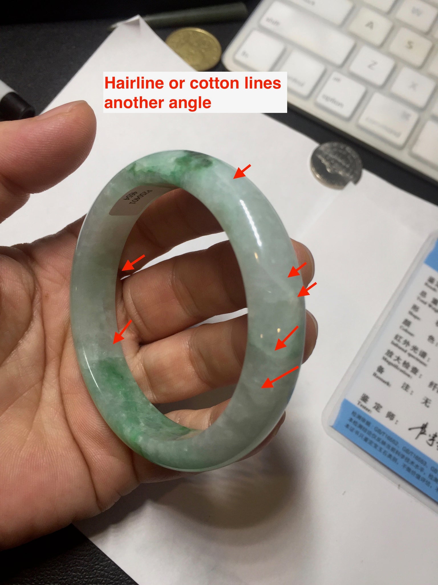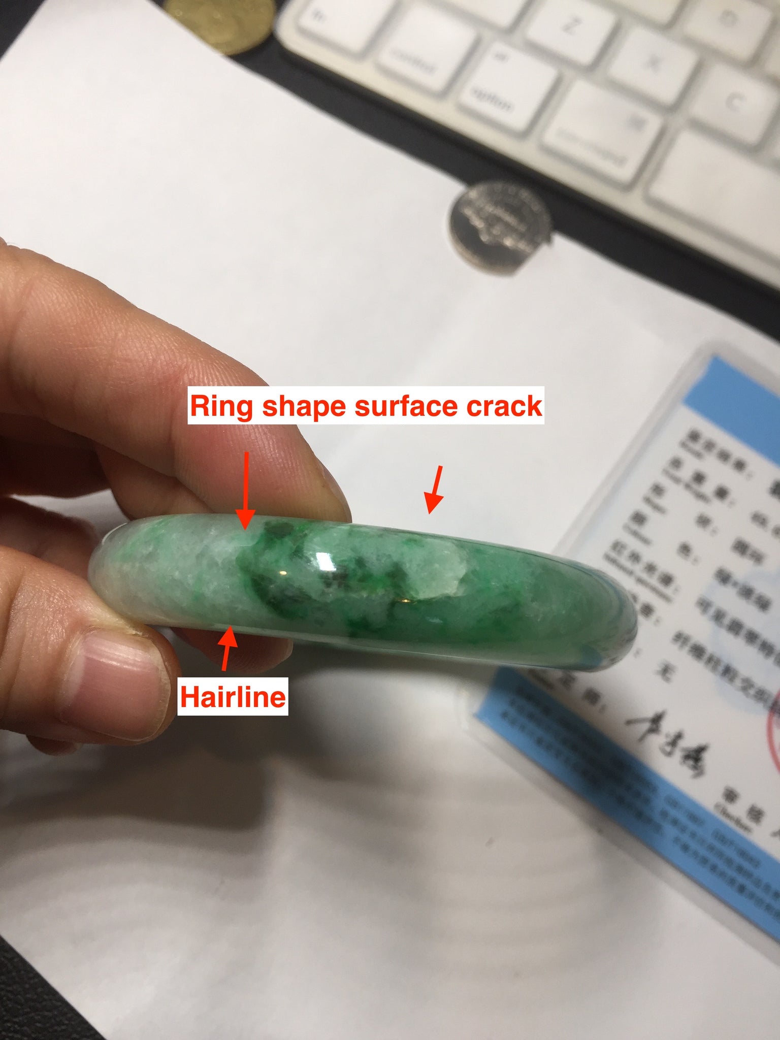 Some crack. Some rough surface areas with surface fissures or cracks. The bangle is solid. Some hairlines. Some cotton lines and cotton spots. Some blisters and rough spots. The texture is not delicate.