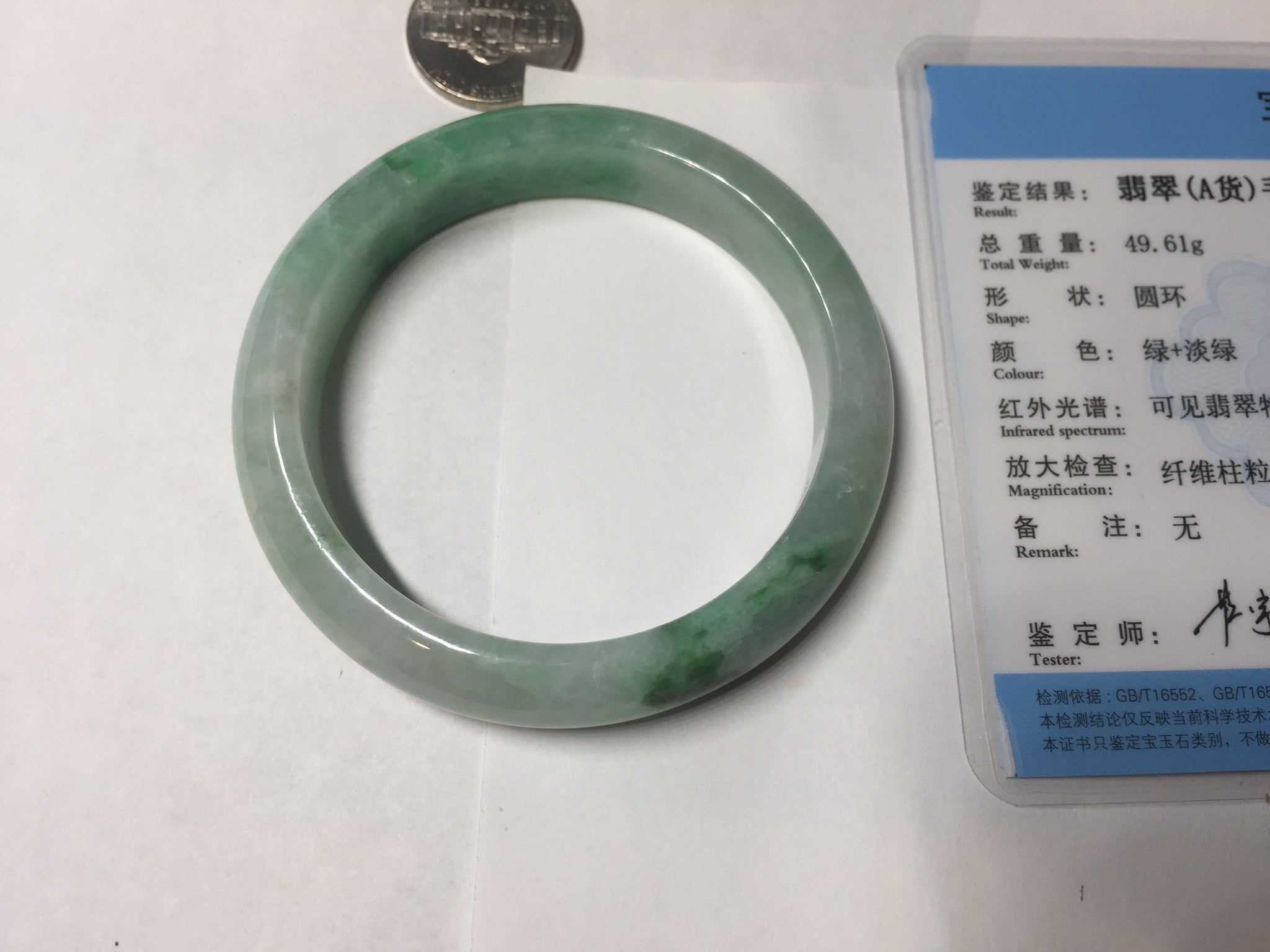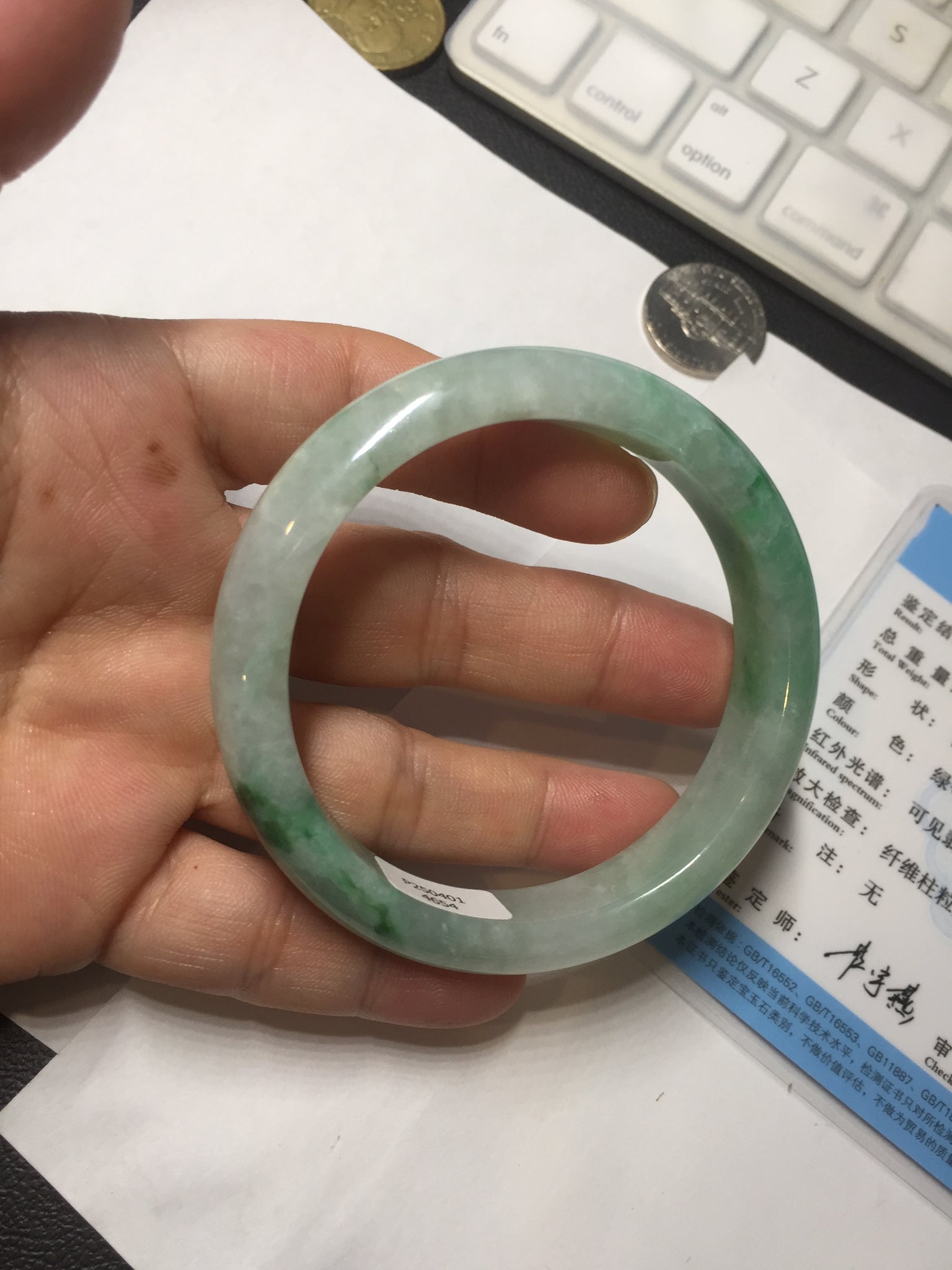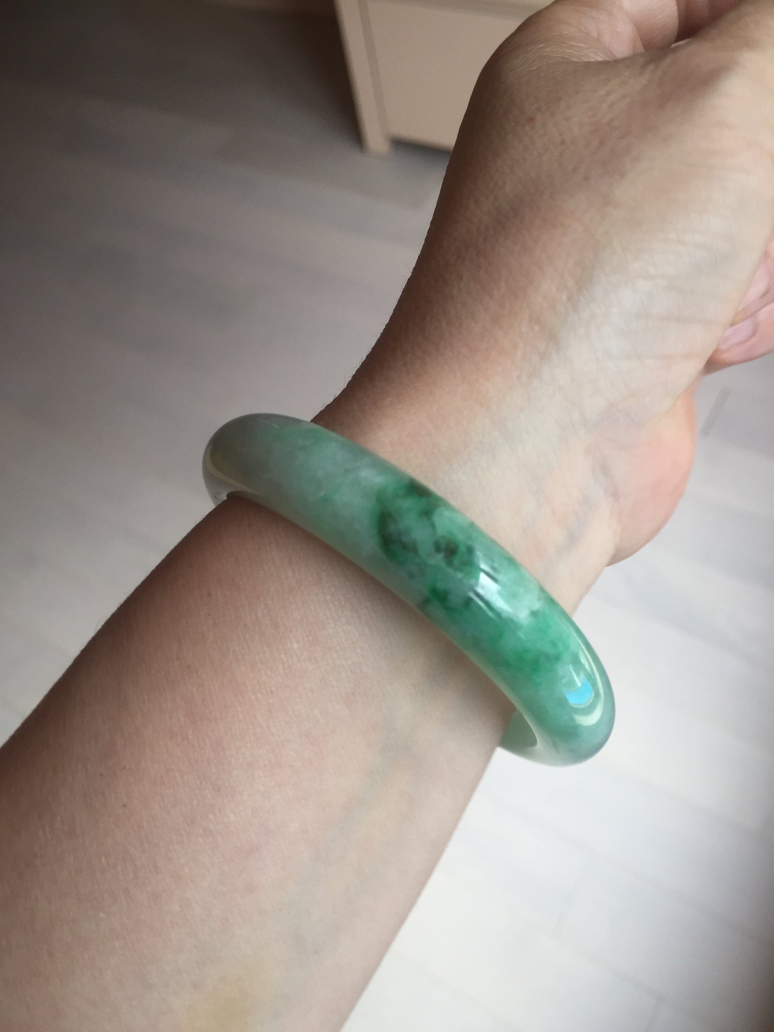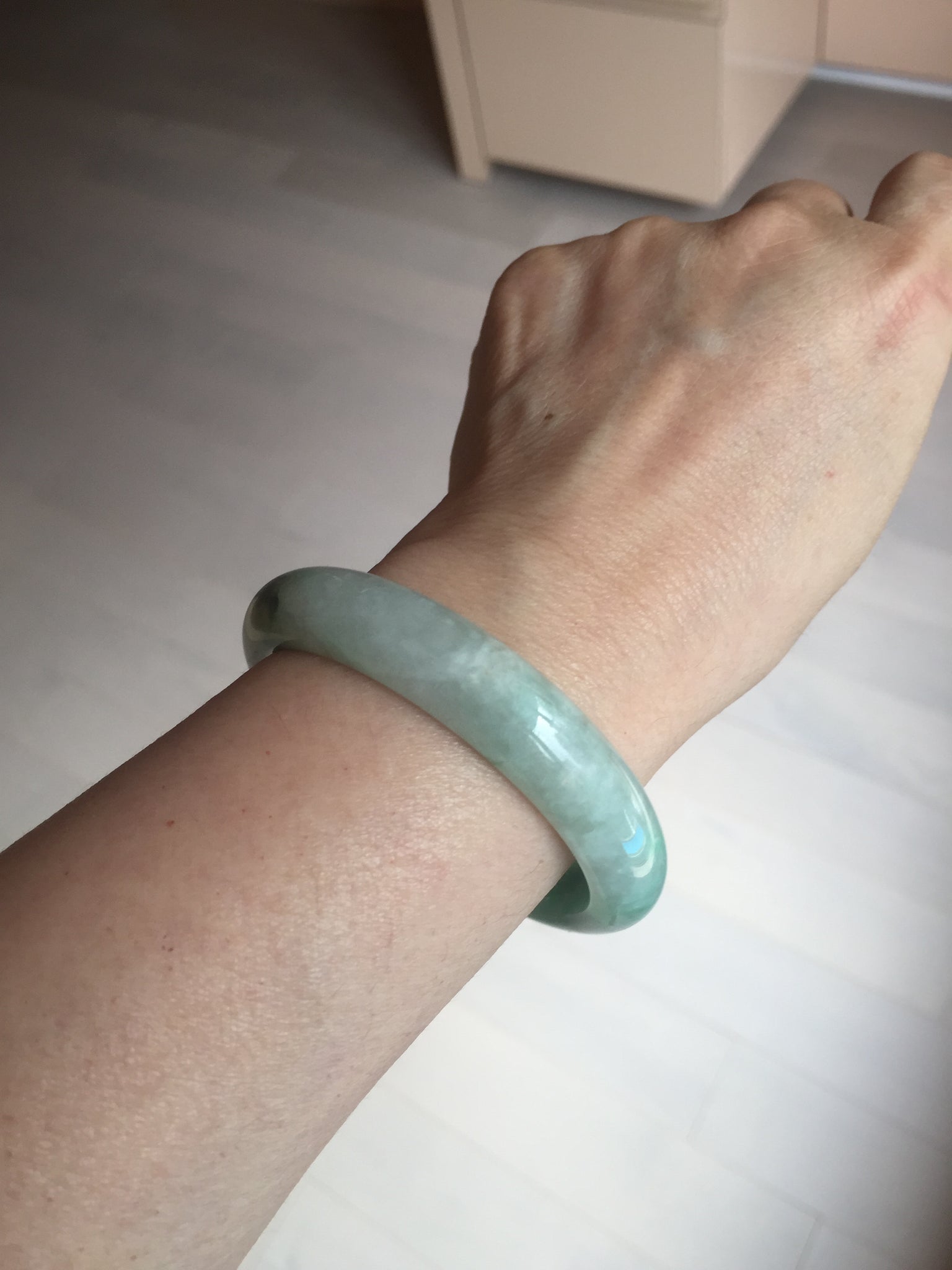 Some crack. Some rough surface areas with surface fissures or cracks. The bangle is solid. Some hairlines. Some cotton lines and cotton spots. Some blisters and rough spots. The texture is not delicate.