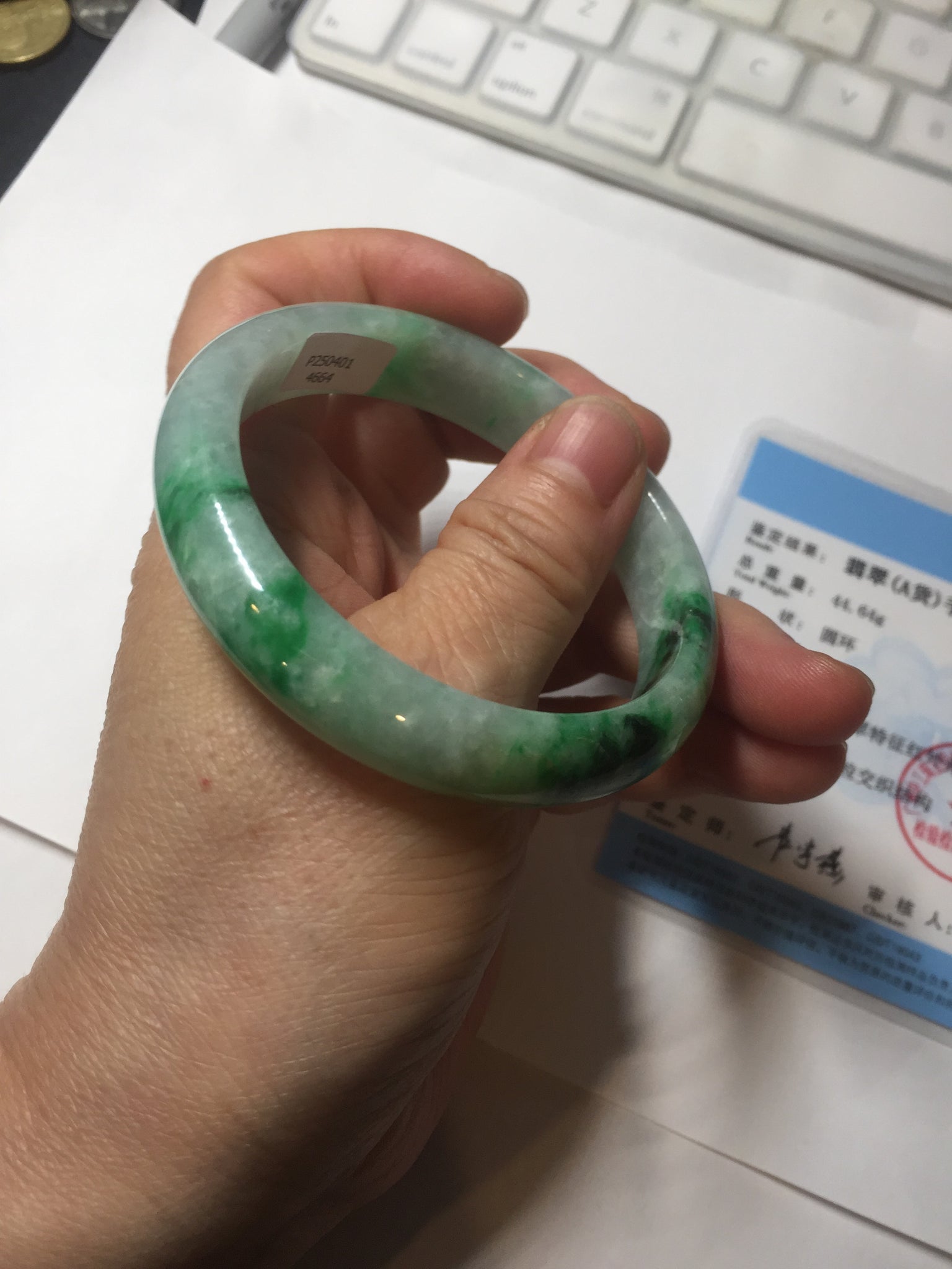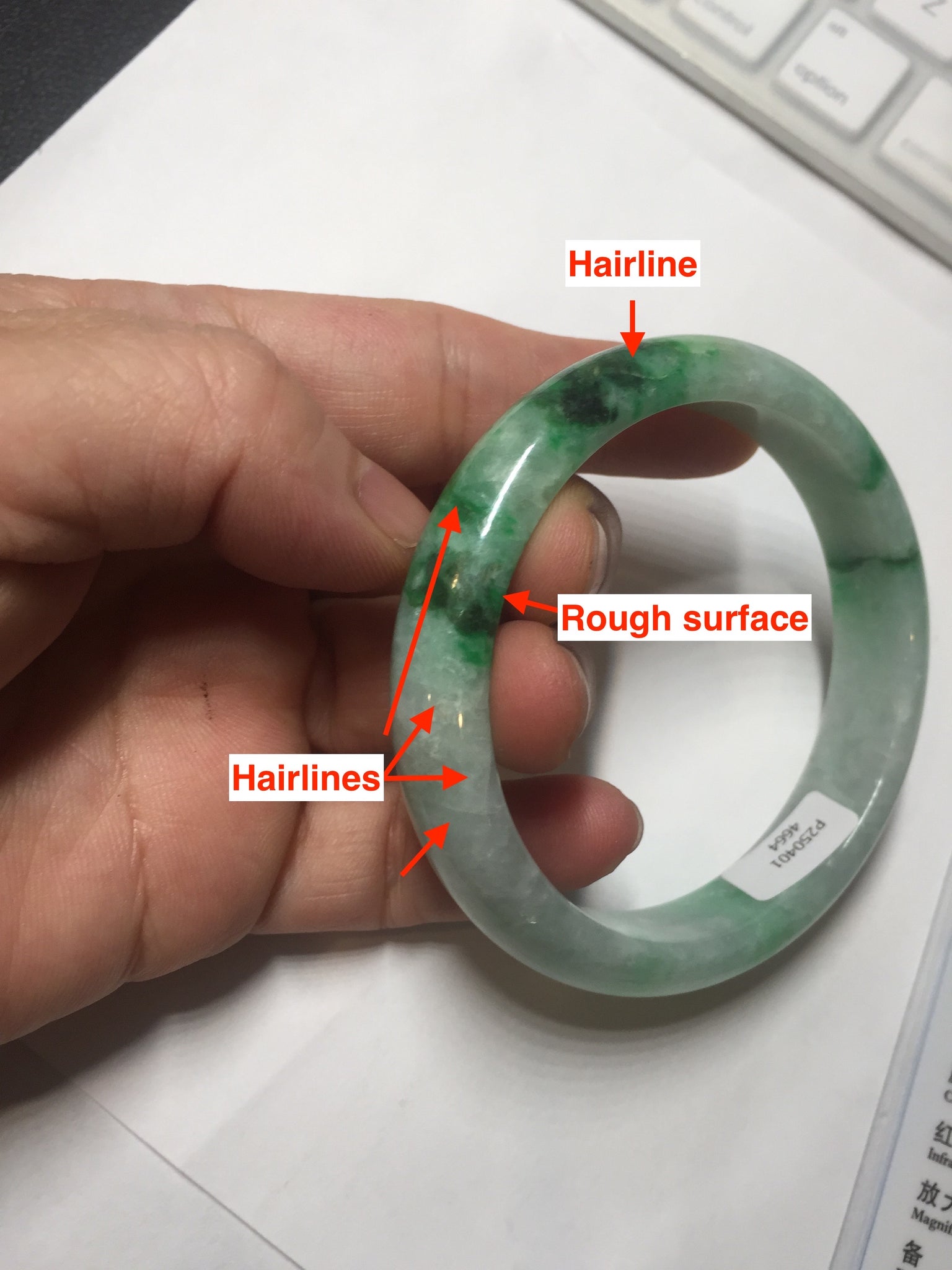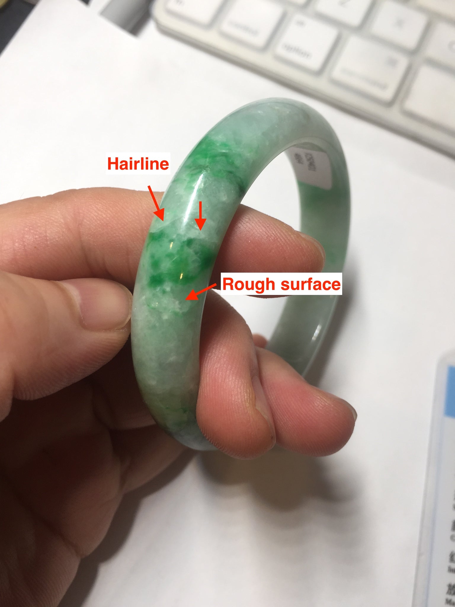Some cracks. Some rough surface areas with surface fissures or cracks. The bangle is solid. Some hairlines. Some cotton lines and cotton spots. The texture is not delicate.