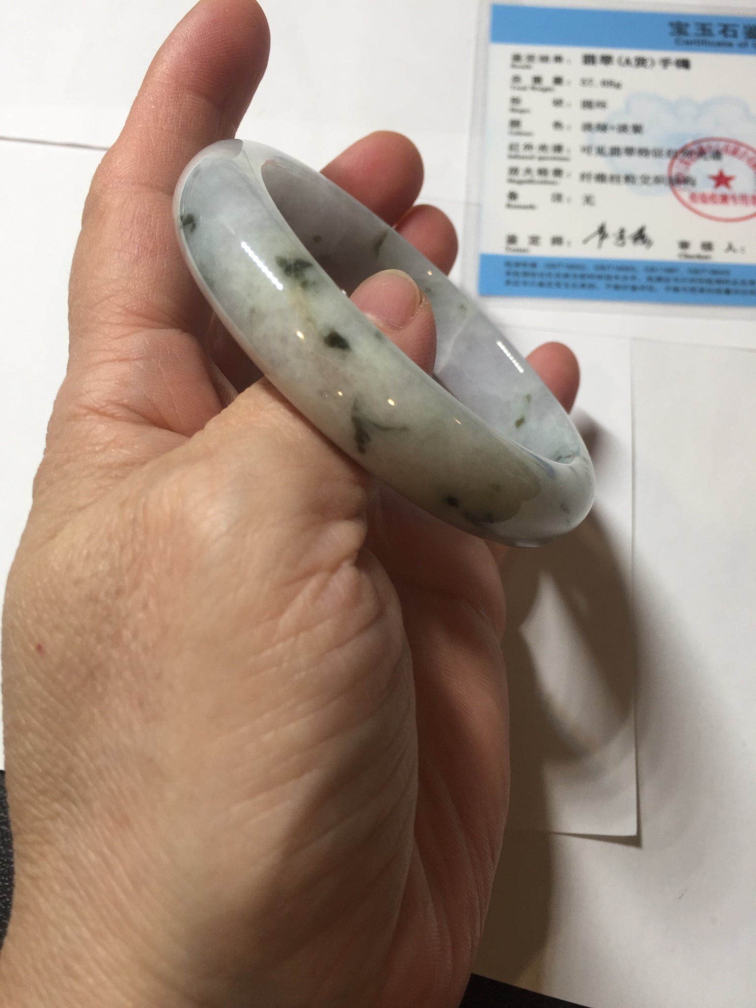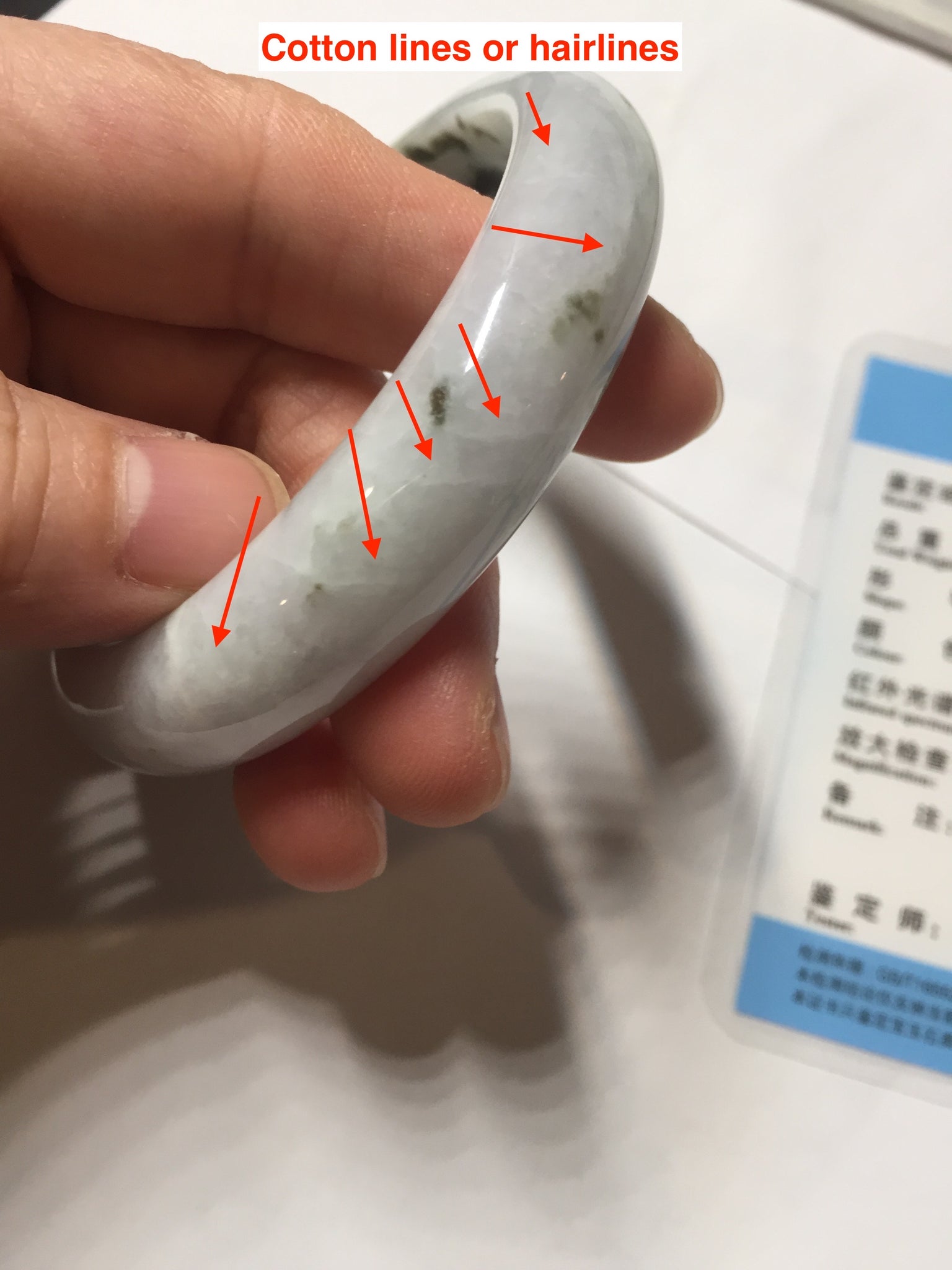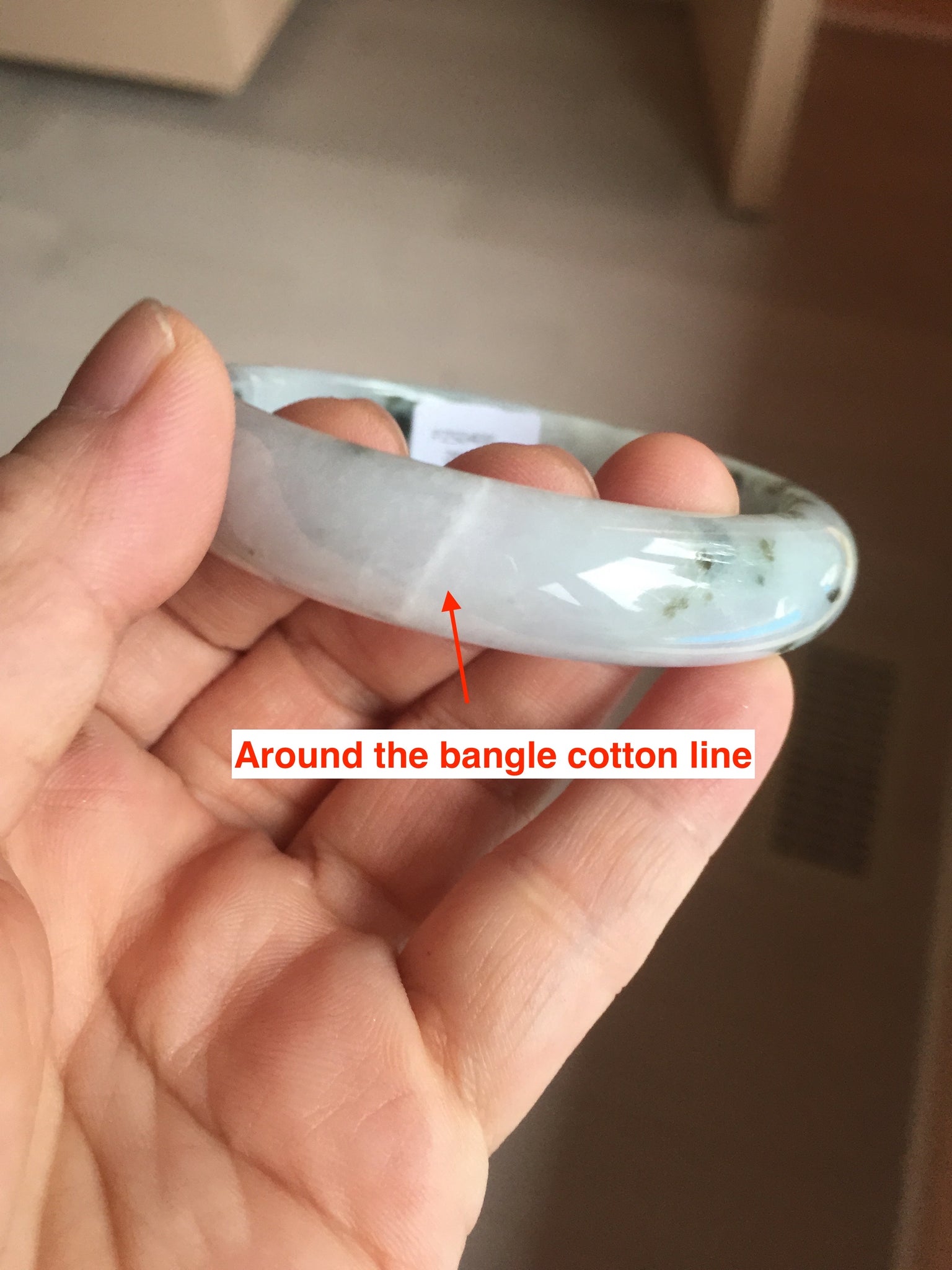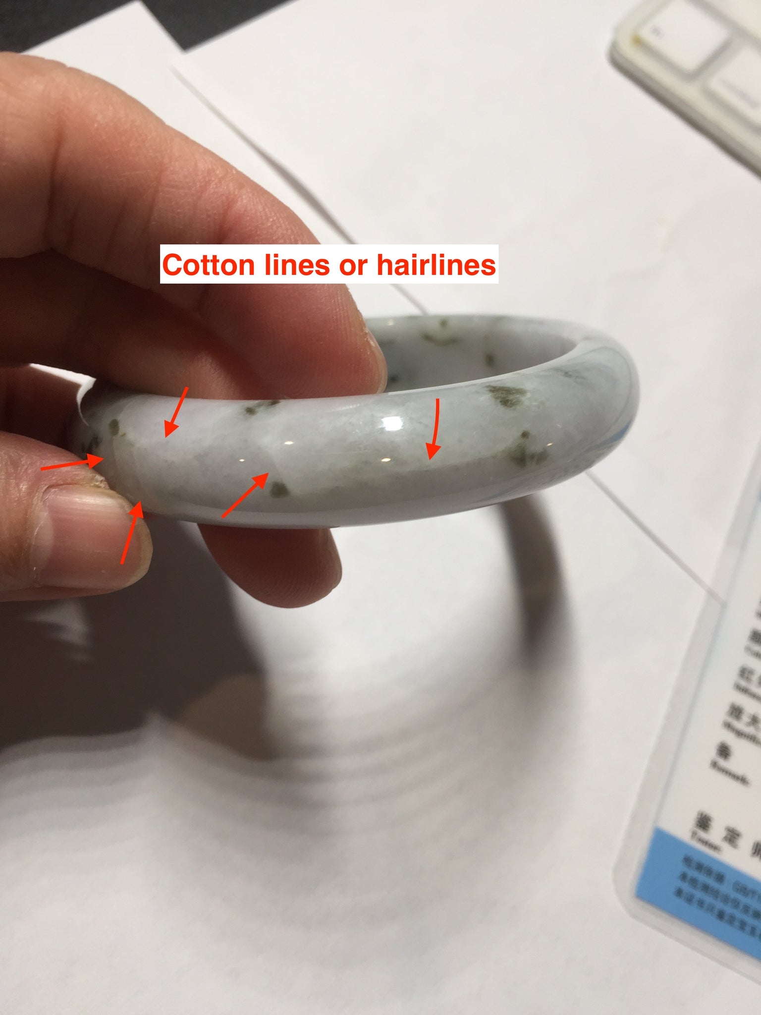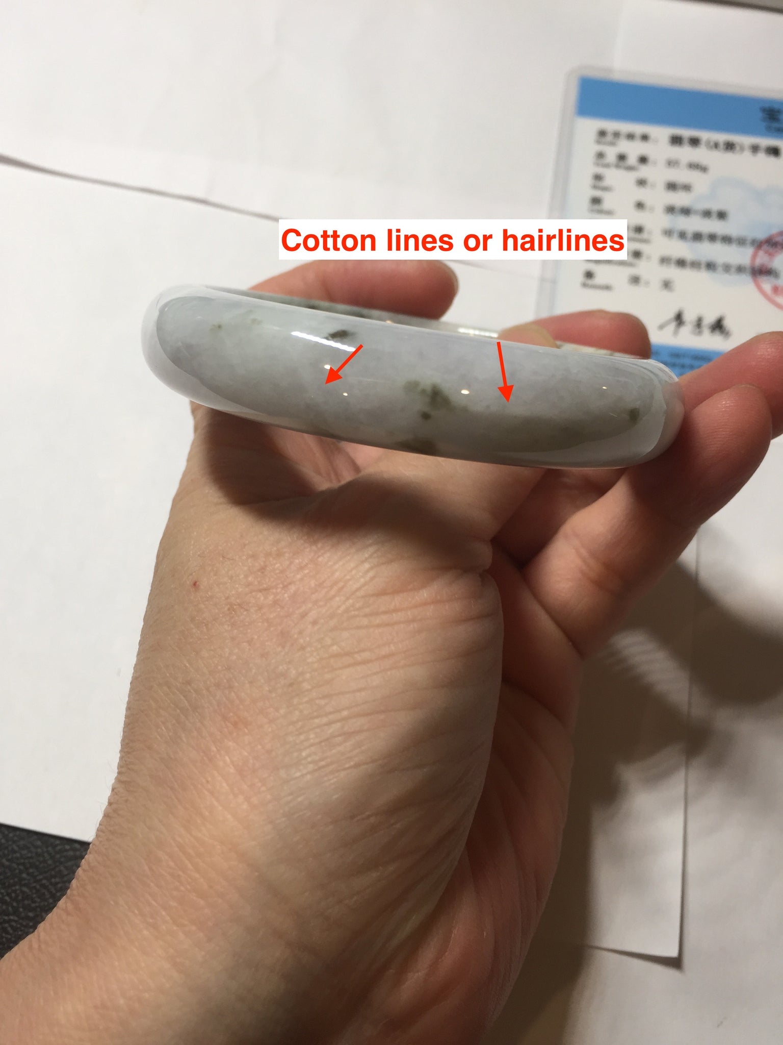 Some surface cracks. Some dark green rough surfaces. Some cotton lines or hairlines. One of them is an around the bangle cotton line. Some cotton spots and cotton areas. Not transparent. The purple is lighter than in the photos due to the purple color always more camera friendly.