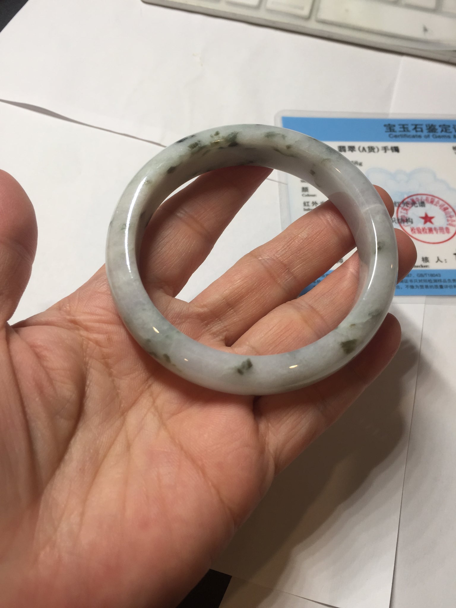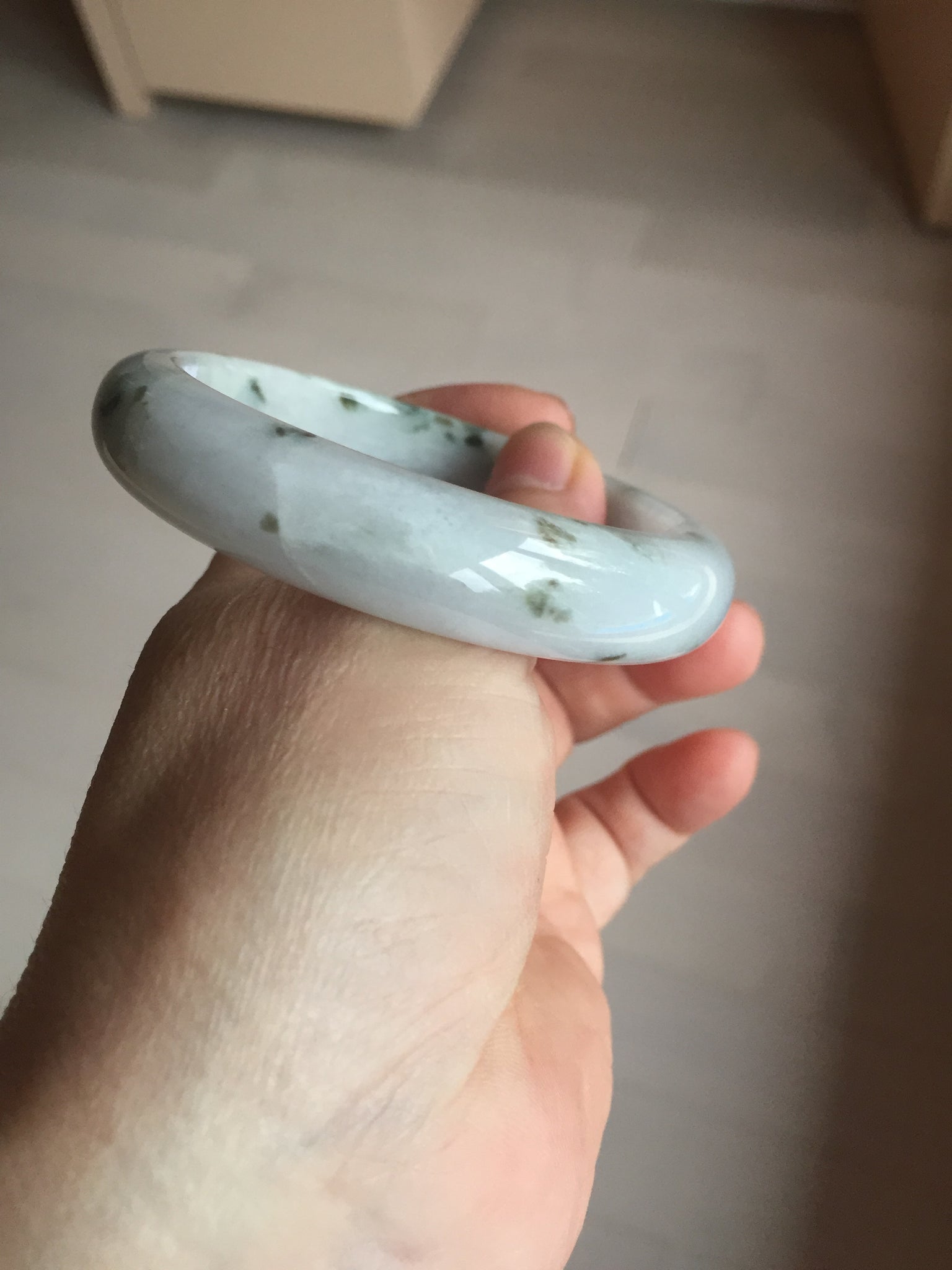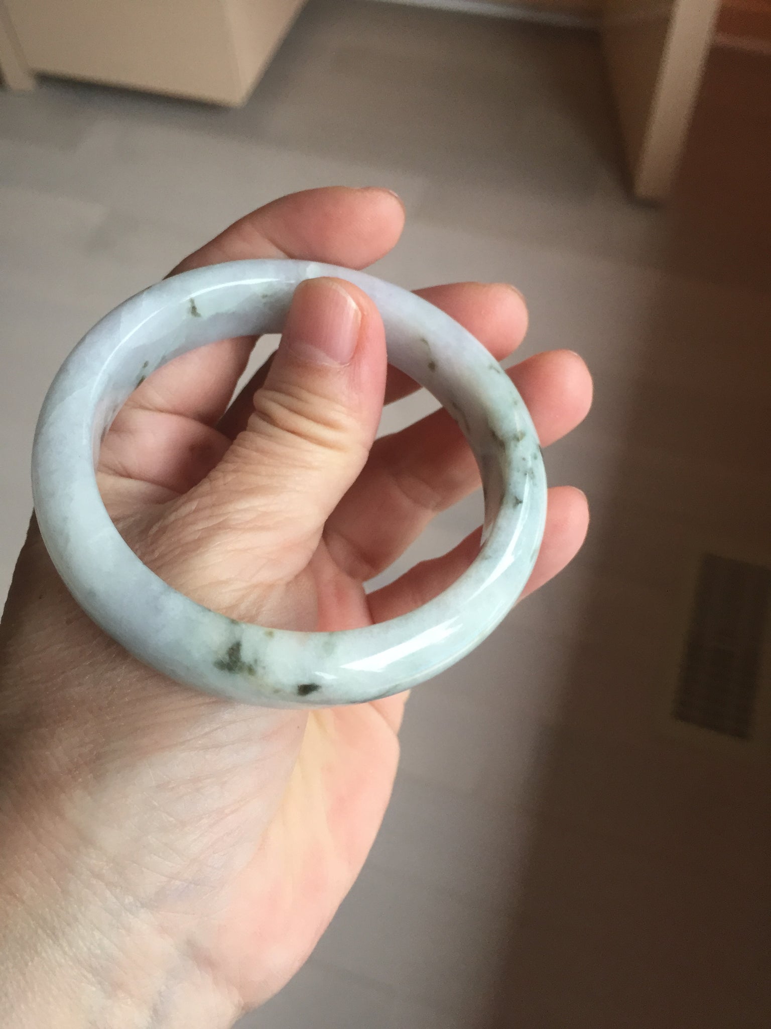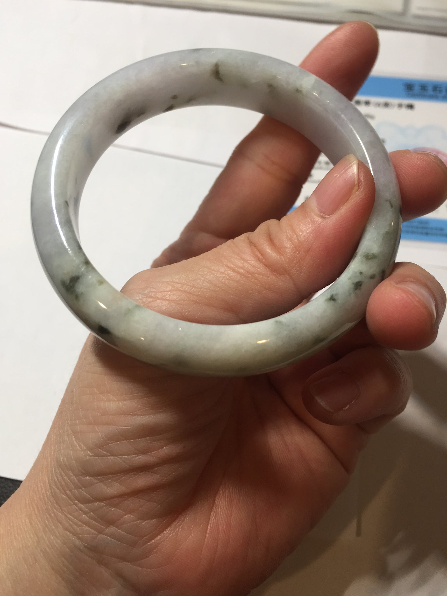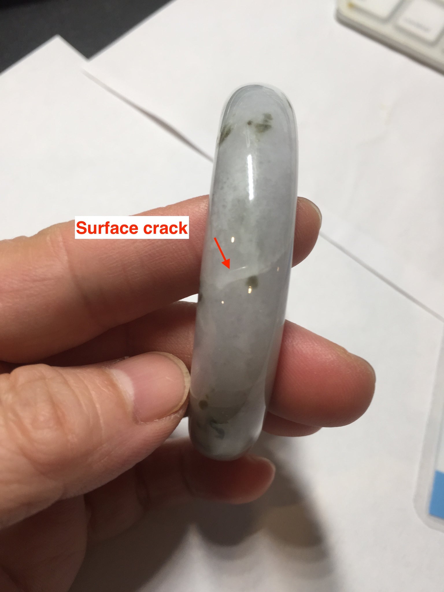 Some surface cracks. Some dark green rough surfaces. Some cotton lines or hairlines. One of them is an around the bangle cotton line. Some cotton spots and cotton areas. Not transparent. The purple is lighter than in the photos due to the purple color always more camera friendly.