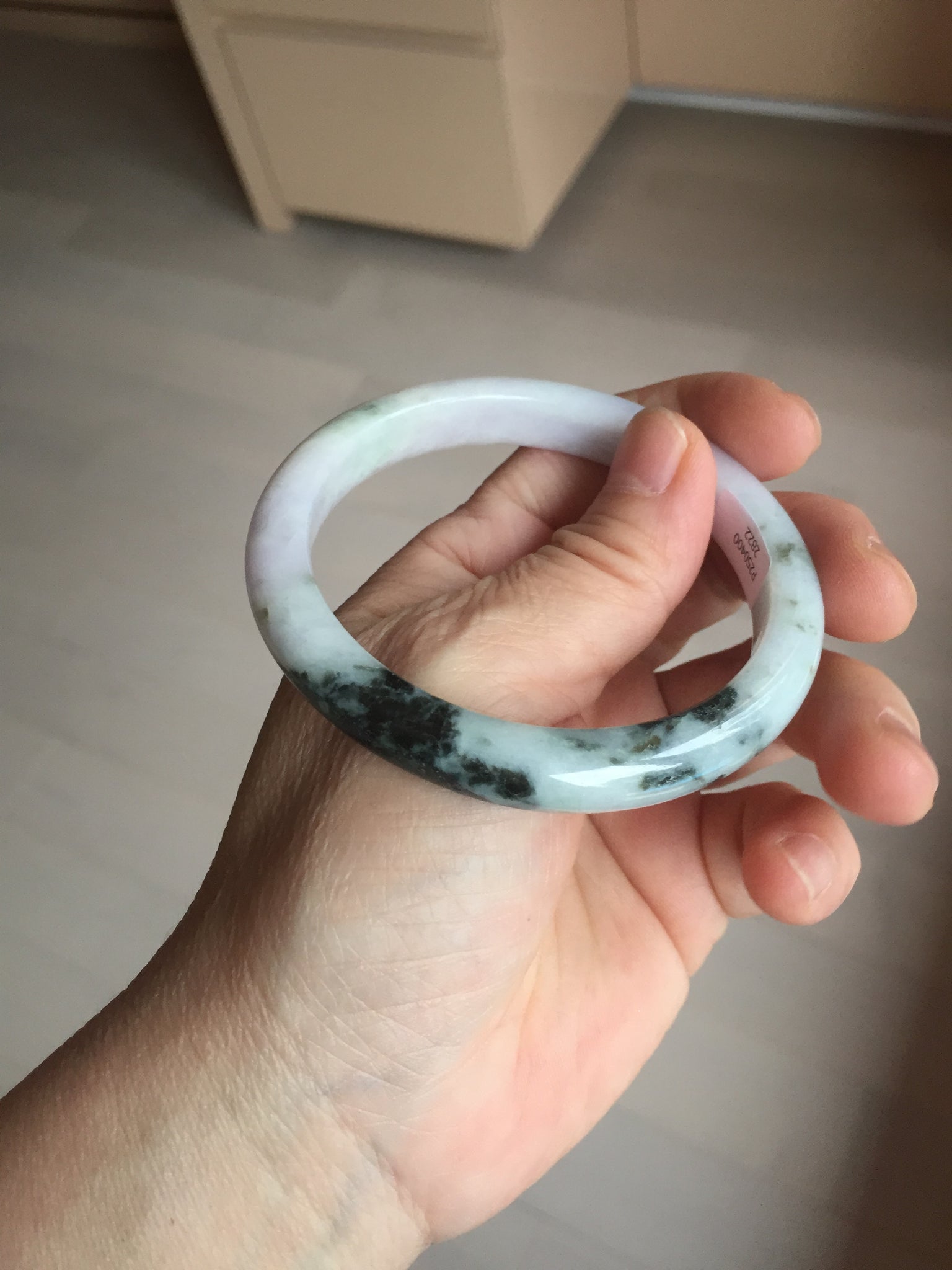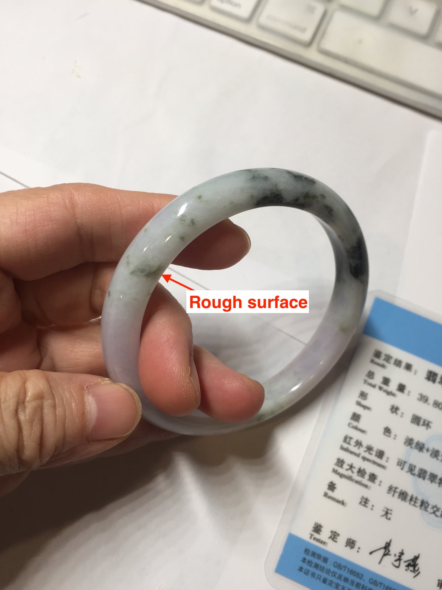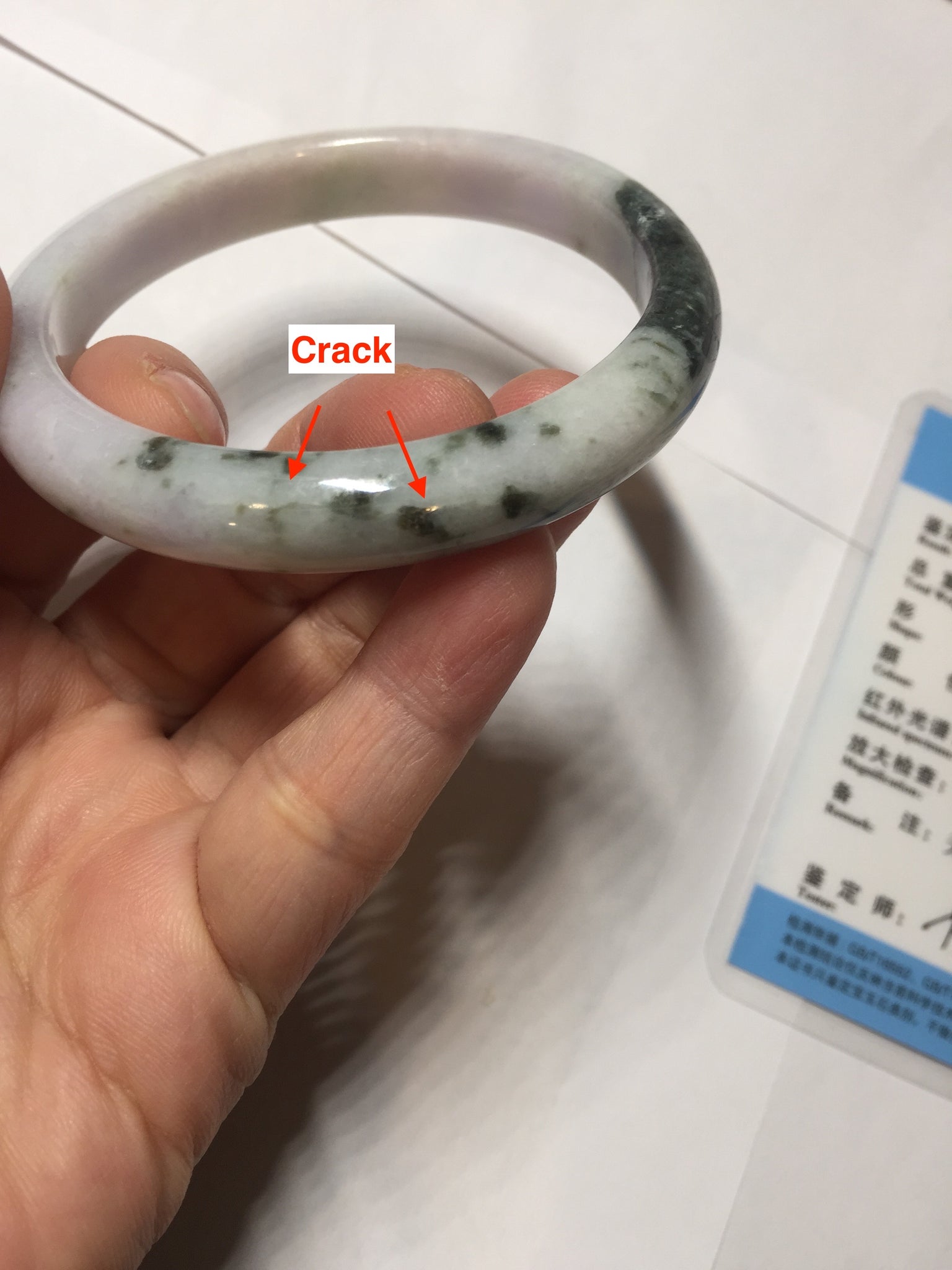 One crack. Some rough surfaces with fissures or mine pits. Some cotton lines or hairlines. Some cotton spots and cotton areas. Not transparent.