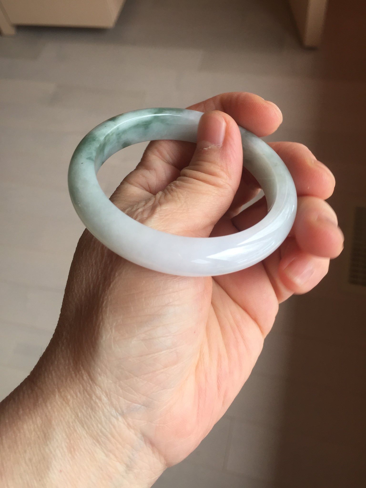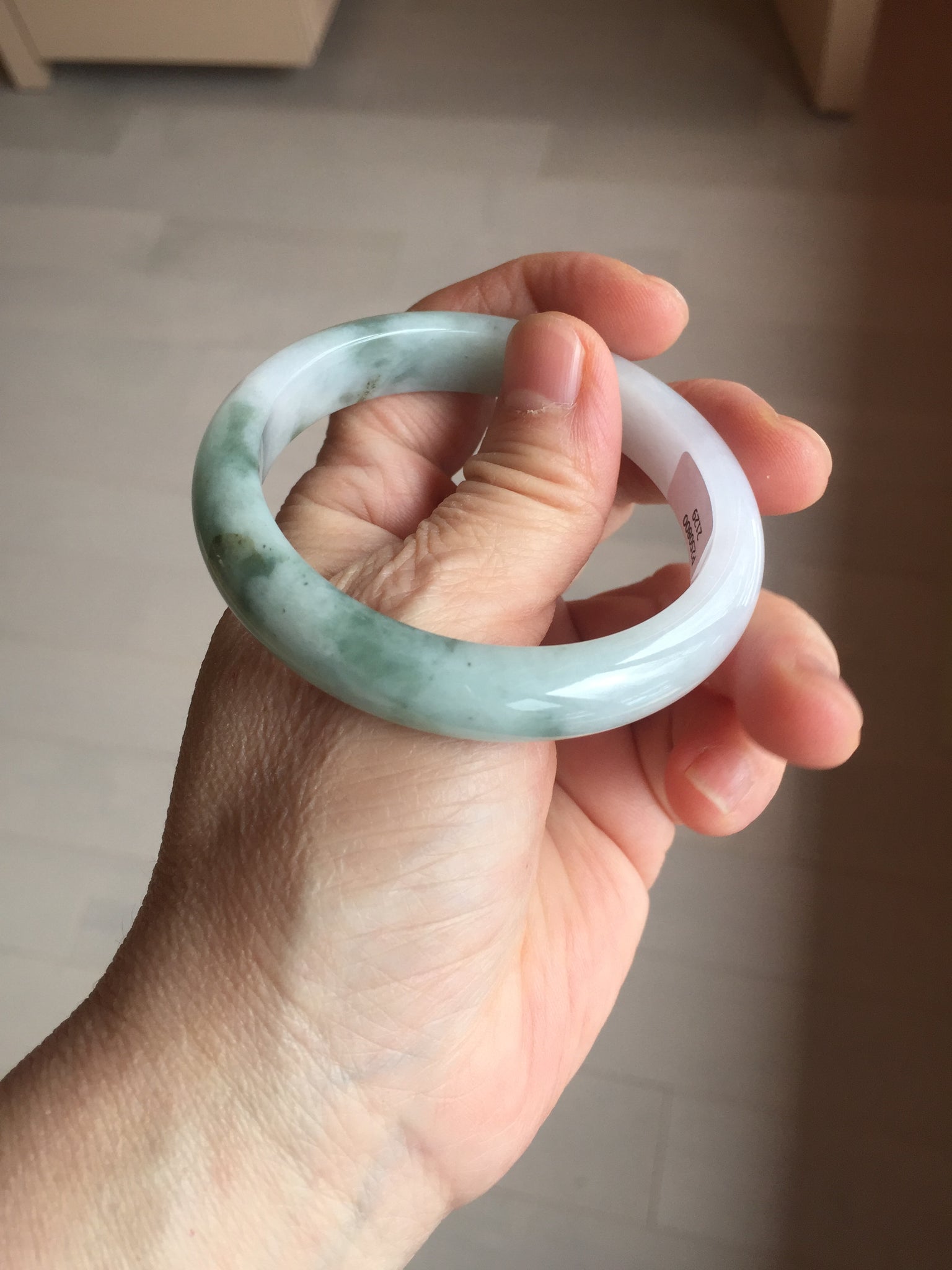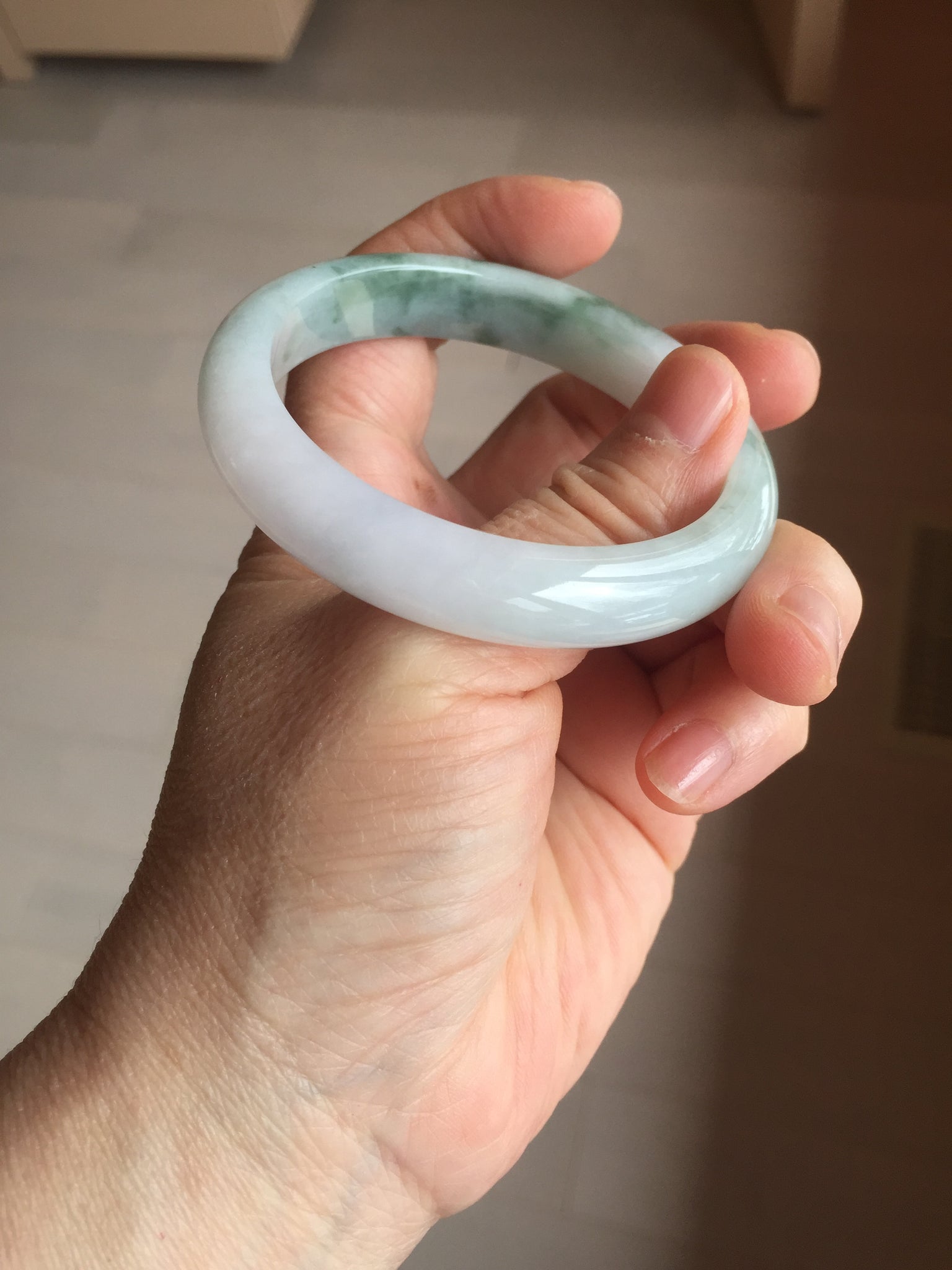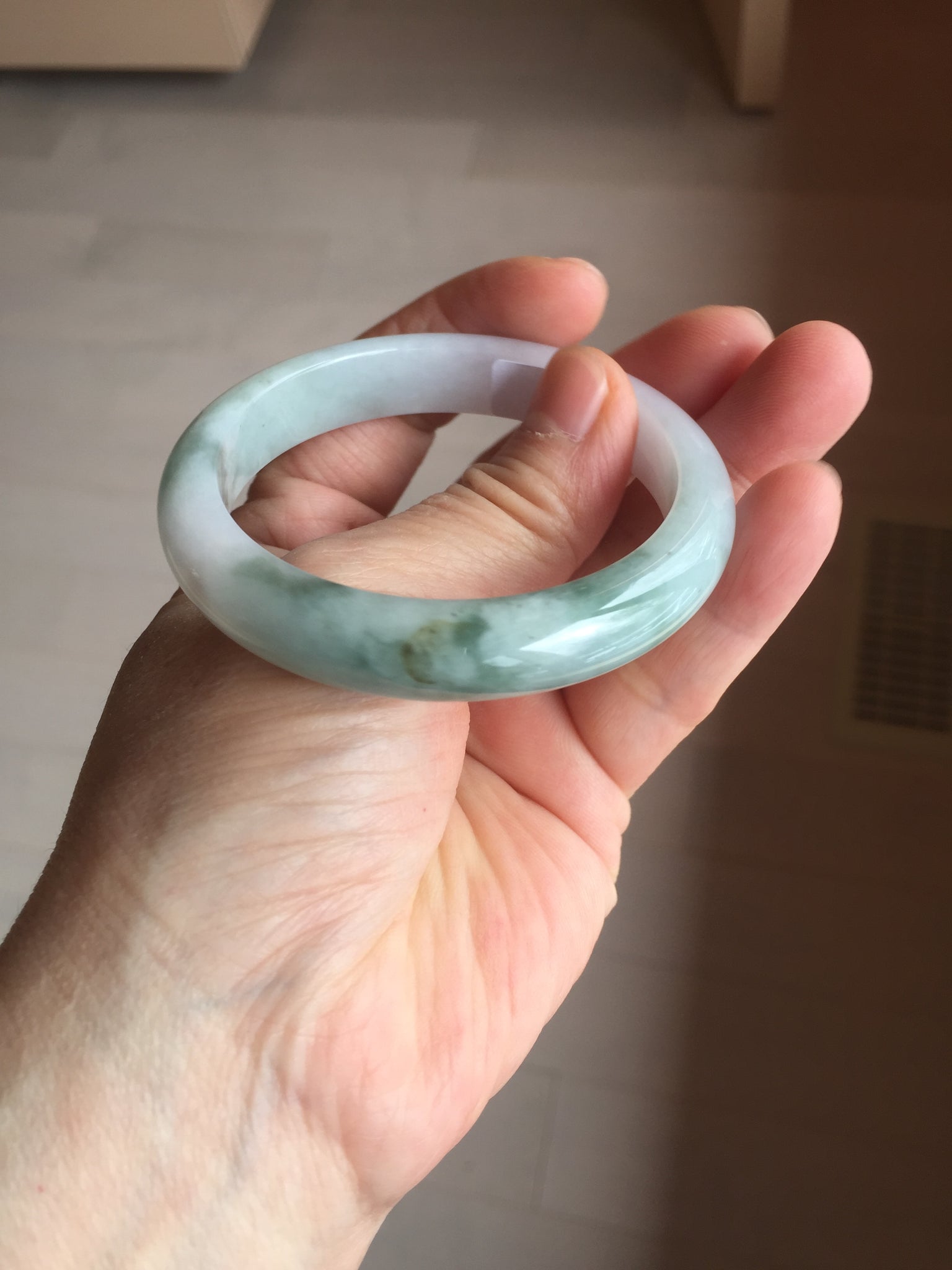 Some surface cracks. The bangle is solid(Guaranteed). Some hairlines. Some cotton areas, cotton spots, and cotton lines. Have a hint of purple but super light. Lighter than in the photos.