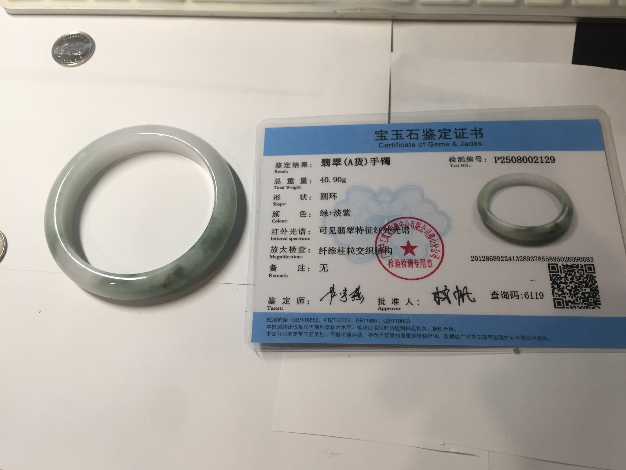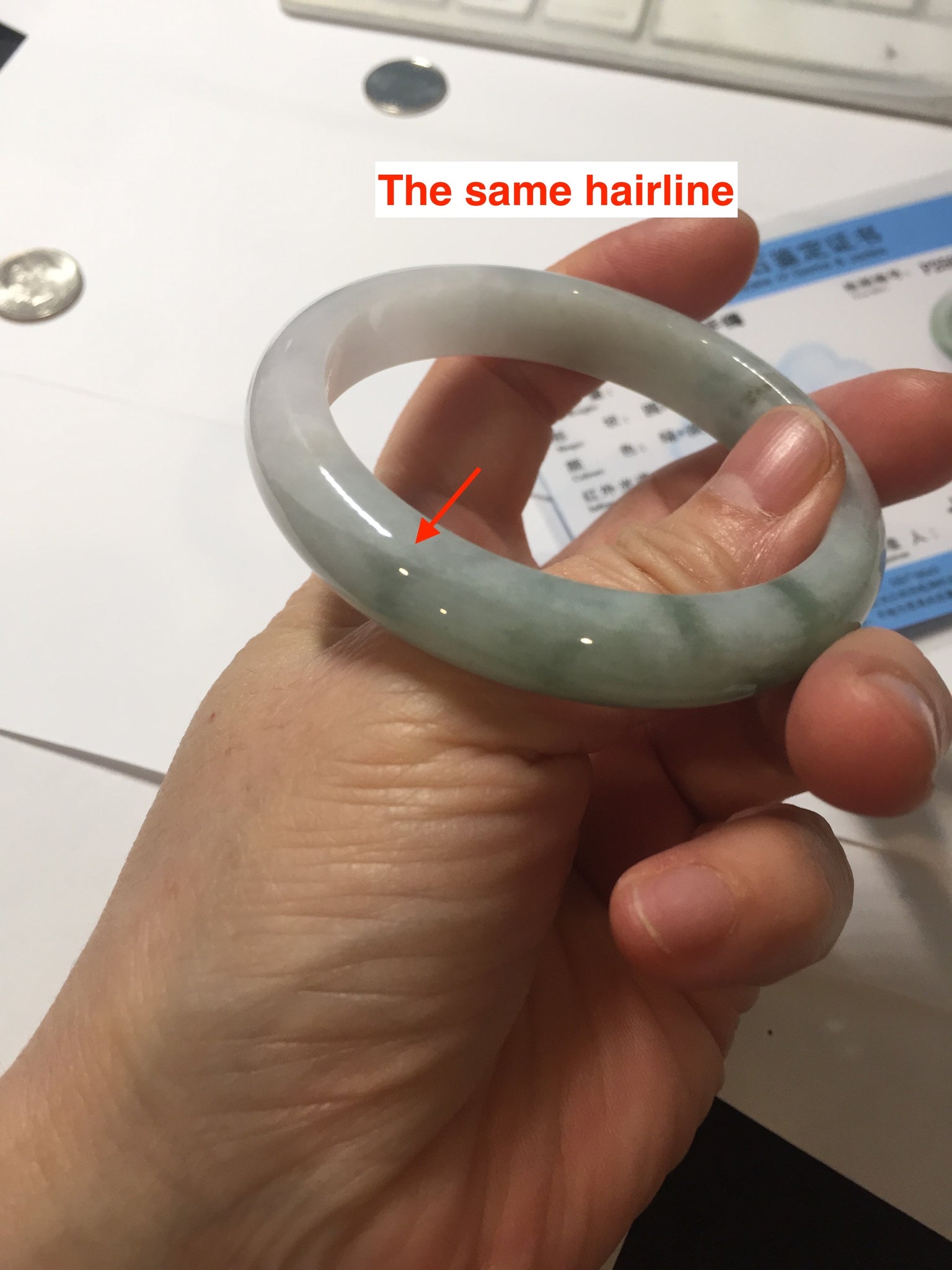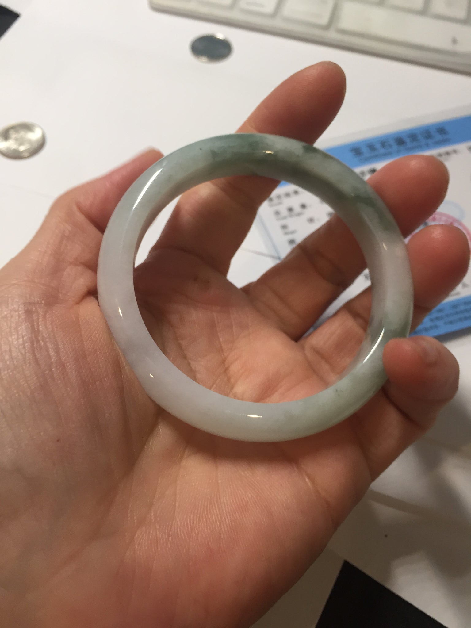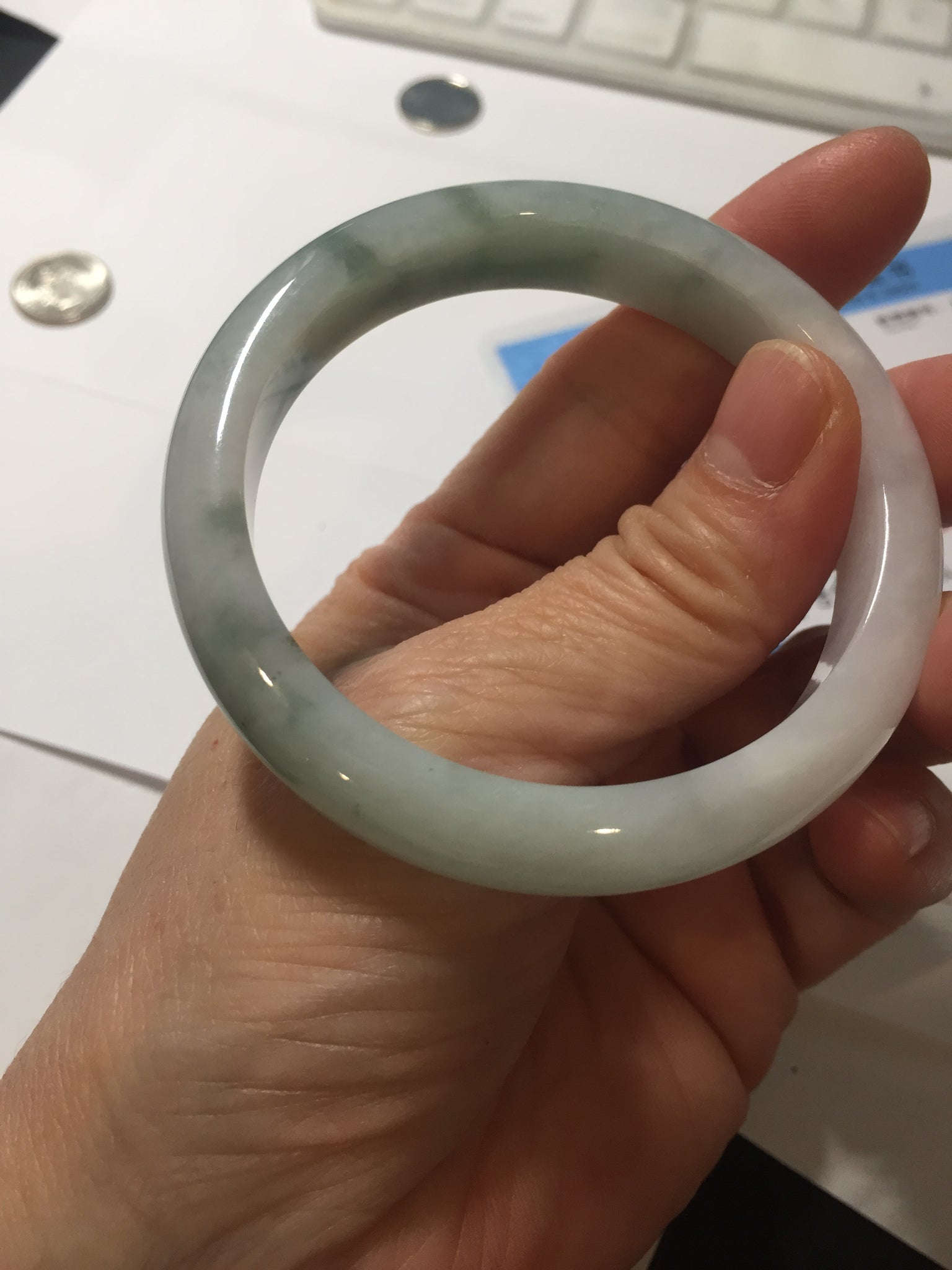 Some surface cracks. The bangle is solid(Guaranteed). Some hairlines. Some cotton areas, cotton spots, and cotton lines. Have a hint of purple but super light. Lighter than in the photos.