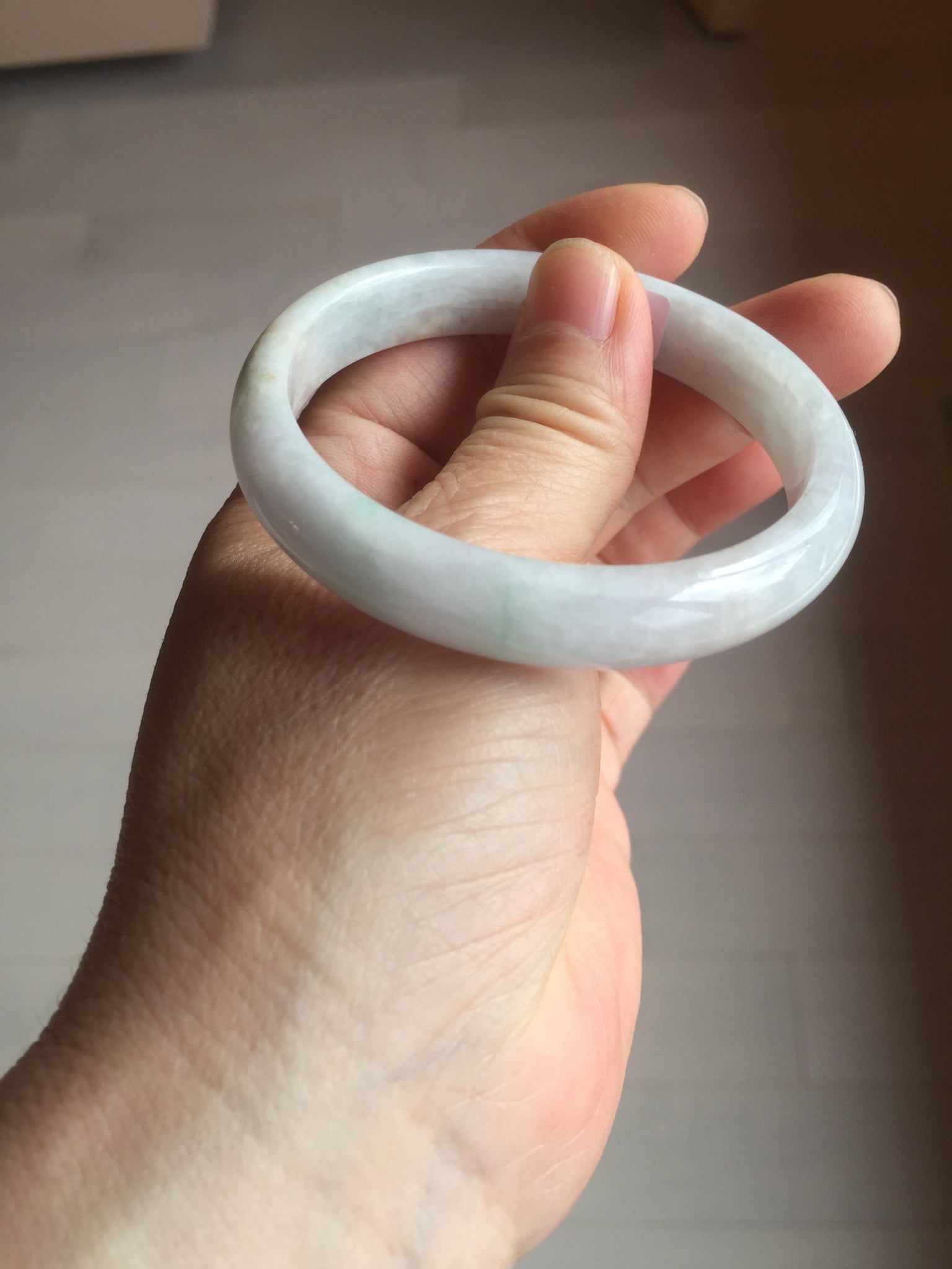 One ring shape surface crack. Quite a lots of hairlines. The bangle is solid(guaranteed!). Makes high pitched sound when clicked. Some cotton areas and lines.