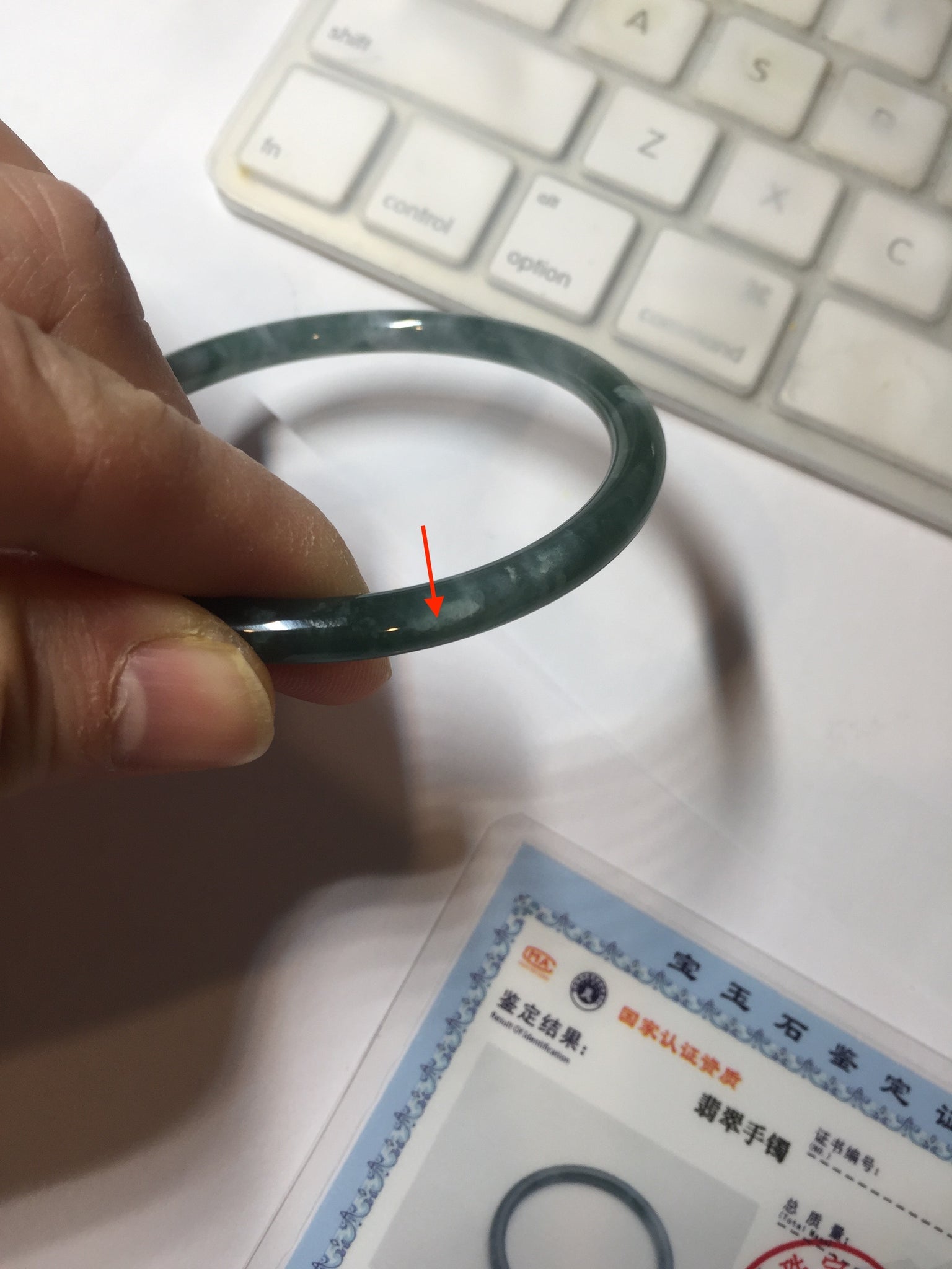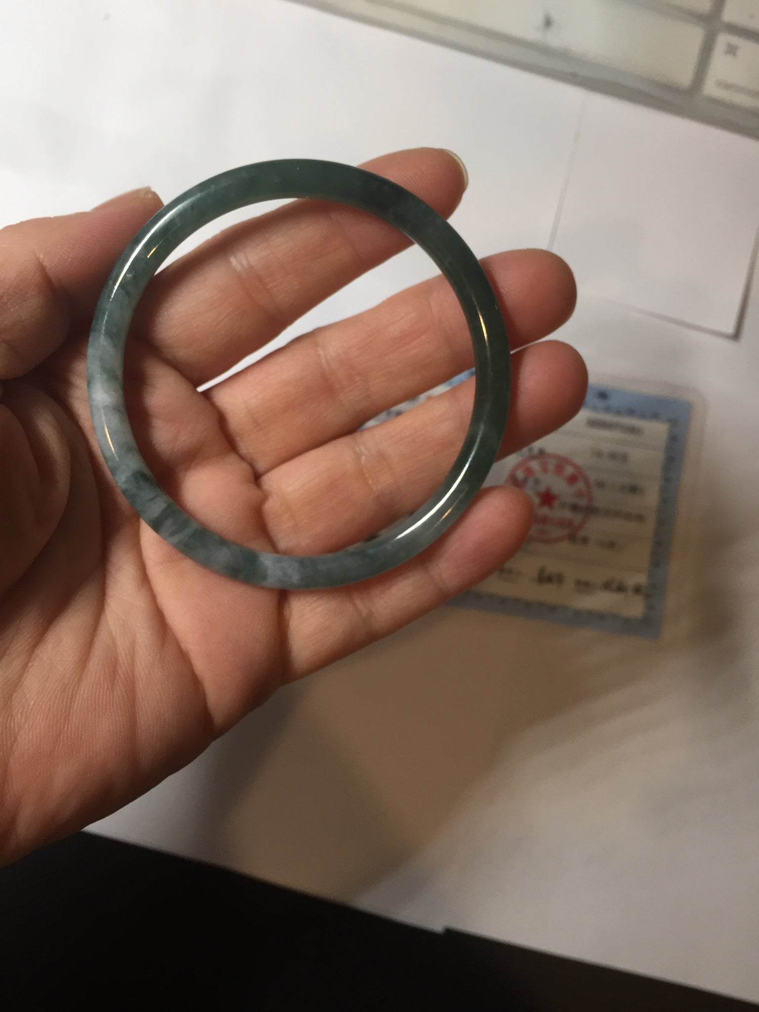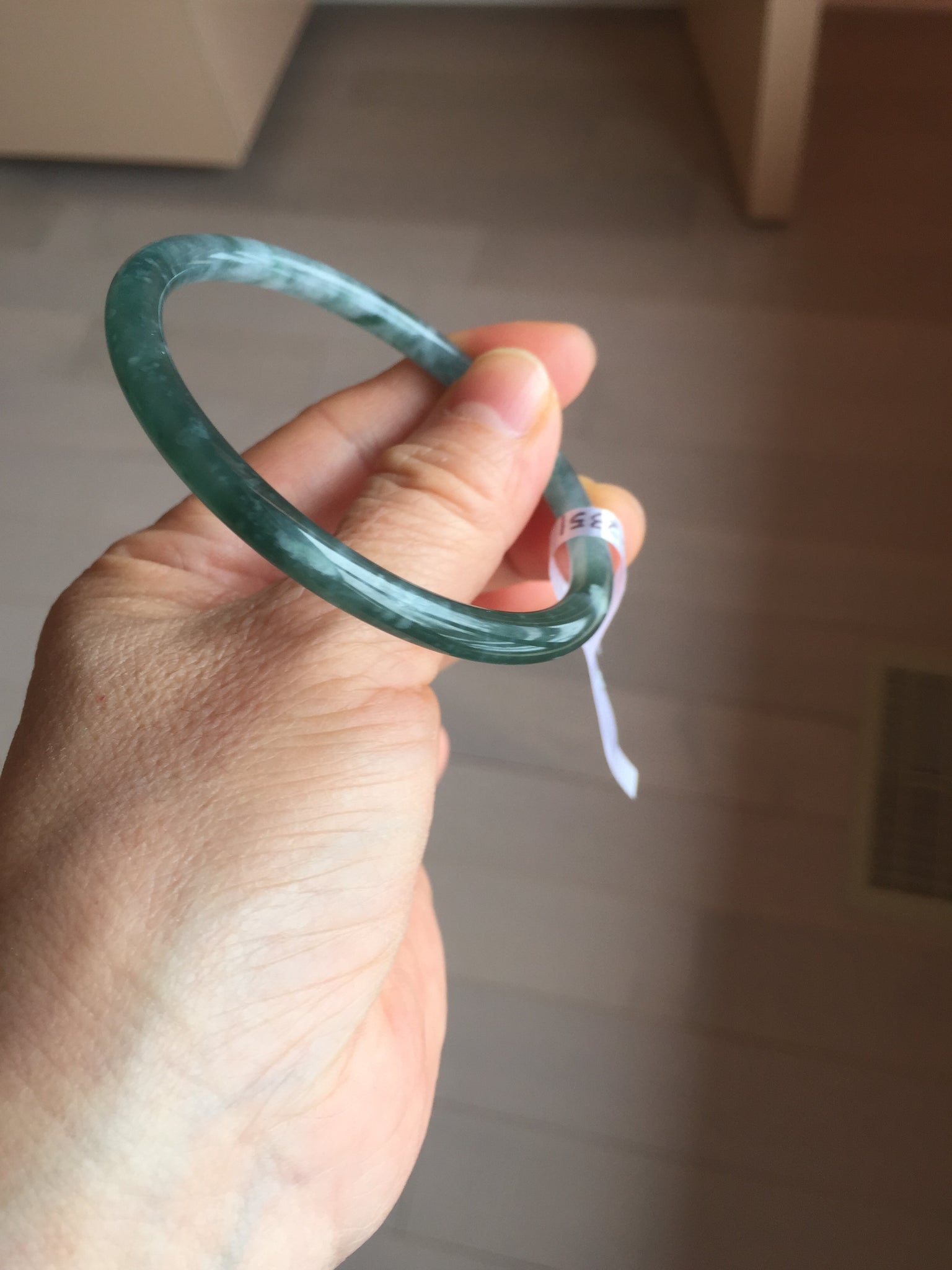 Some surface cracks. Some hairlines, cotton areas,cotton lines and cotton spots. The bangle has some gray/ black color.