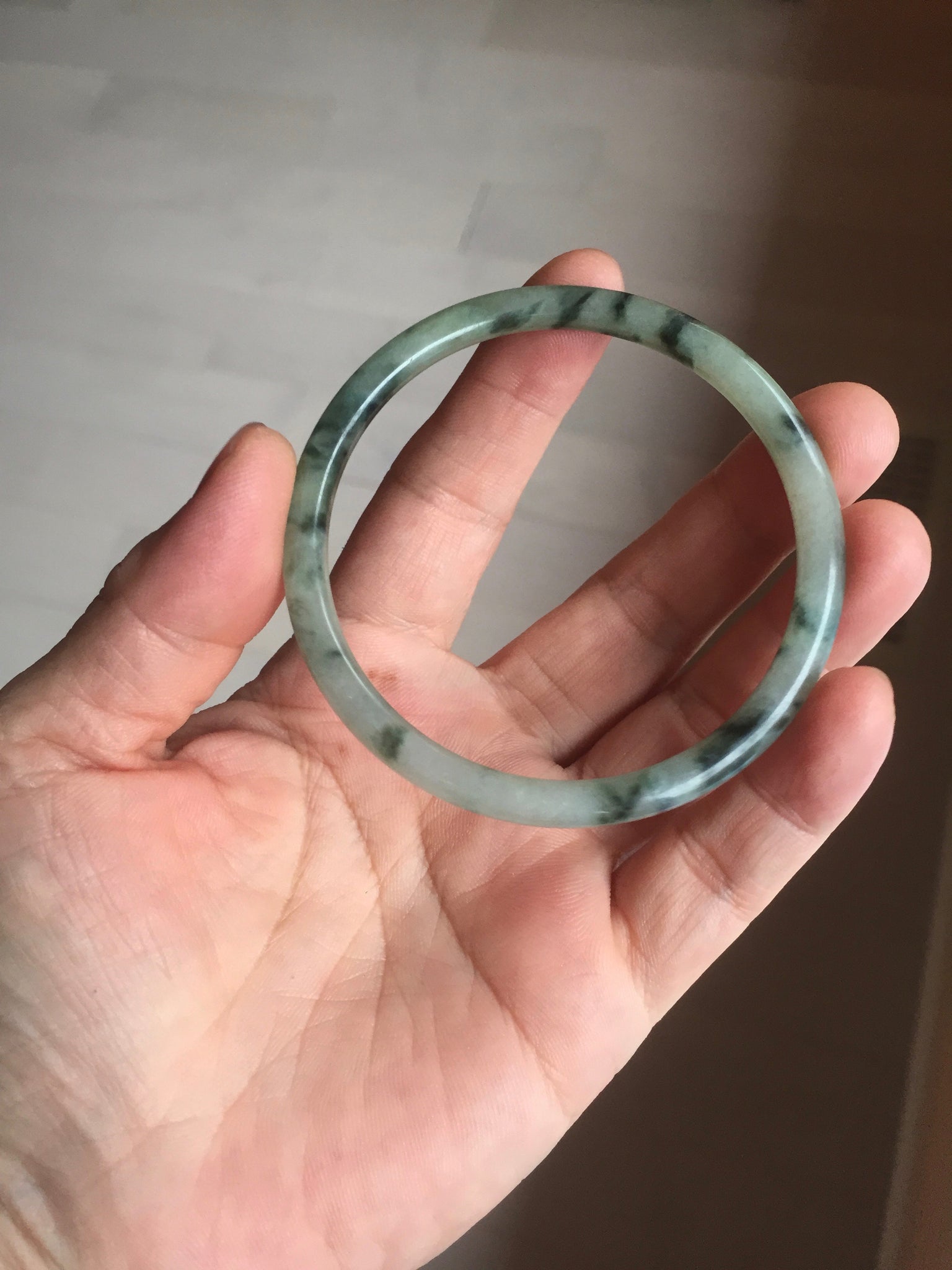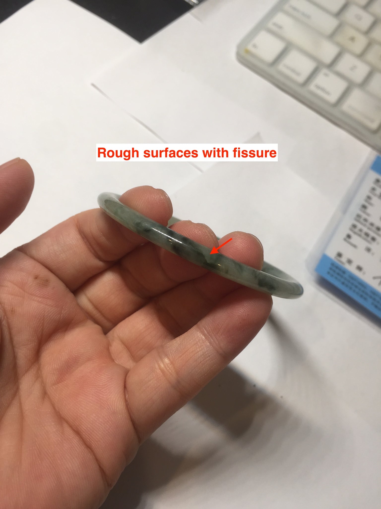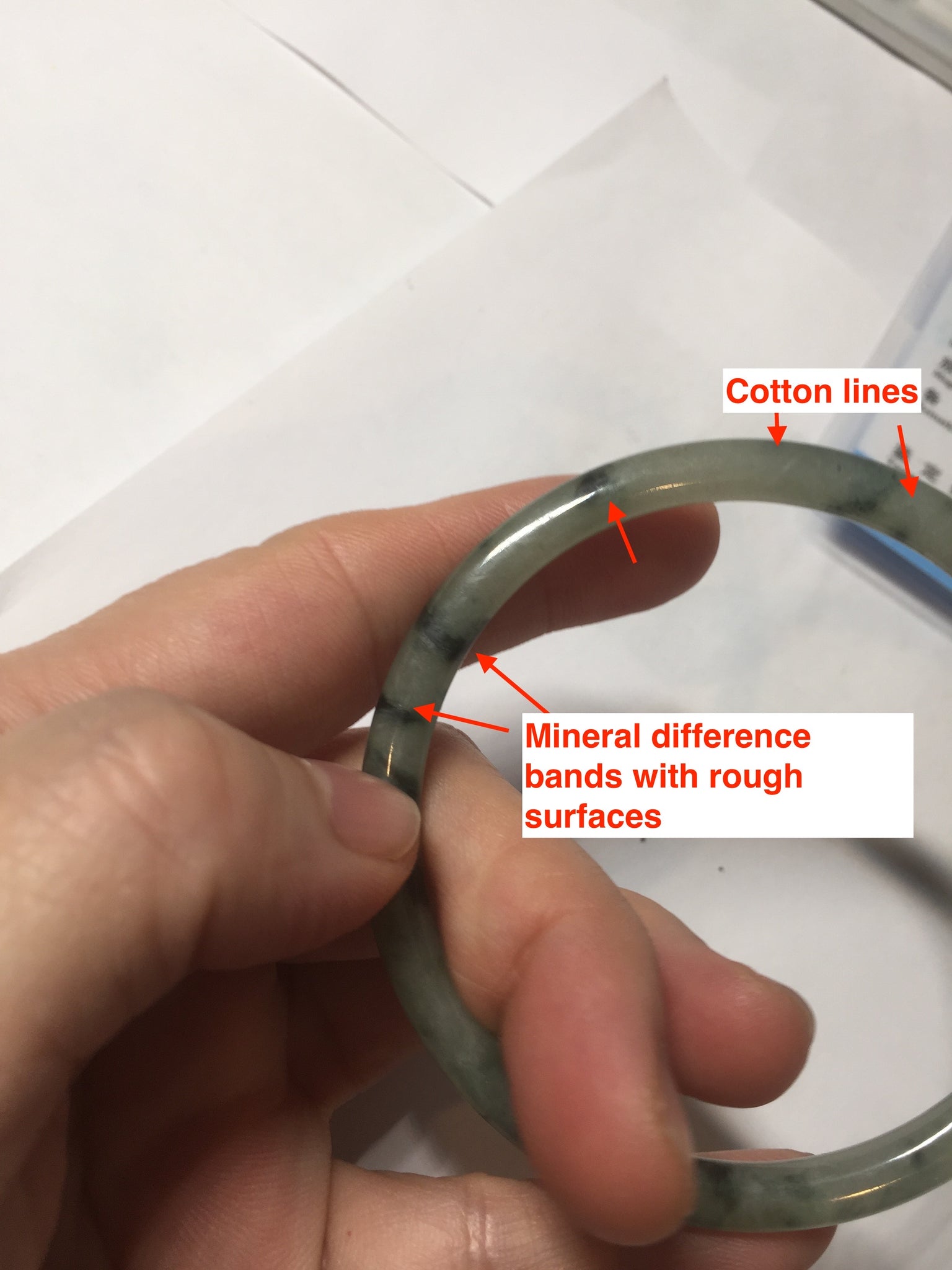 Some surface scratches, rough surfaces with fissures (photos did not mark them all). Some tiny rough spots. All won't influence the firmness. Some cotton lines, cotton spots, and cotton areas. The bangle has some gray/ black color.