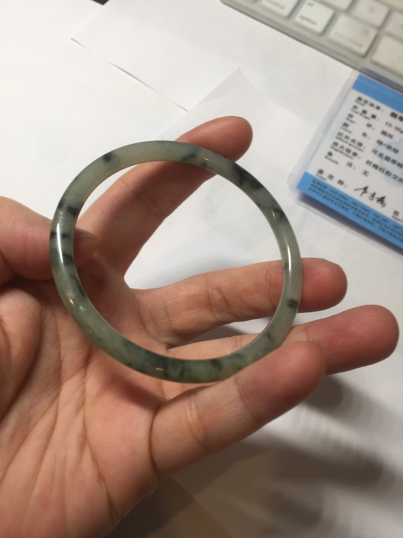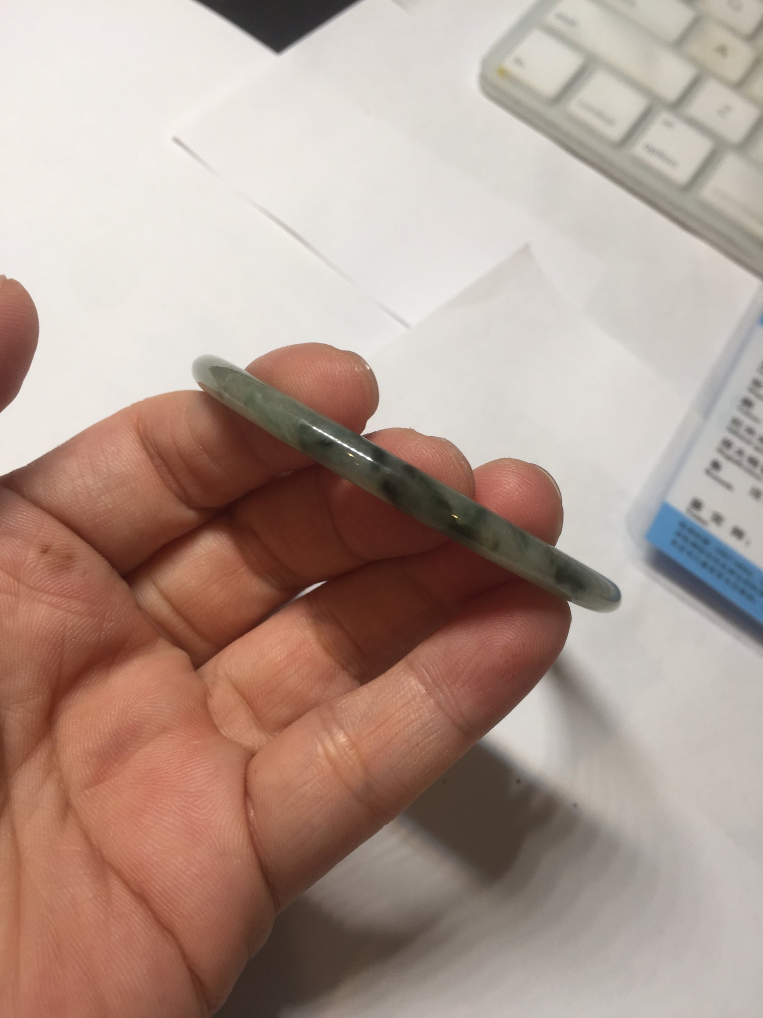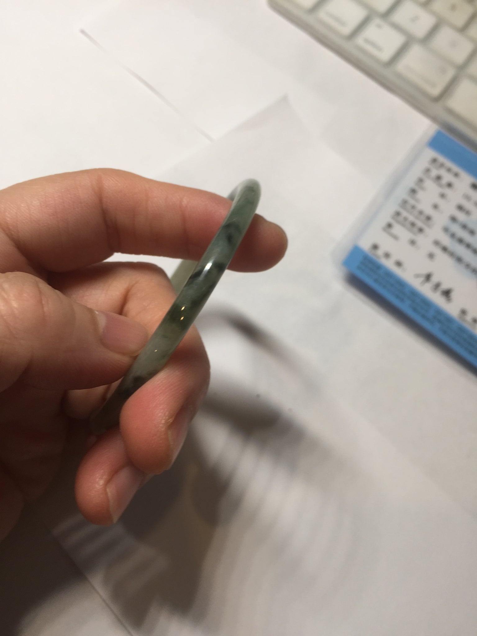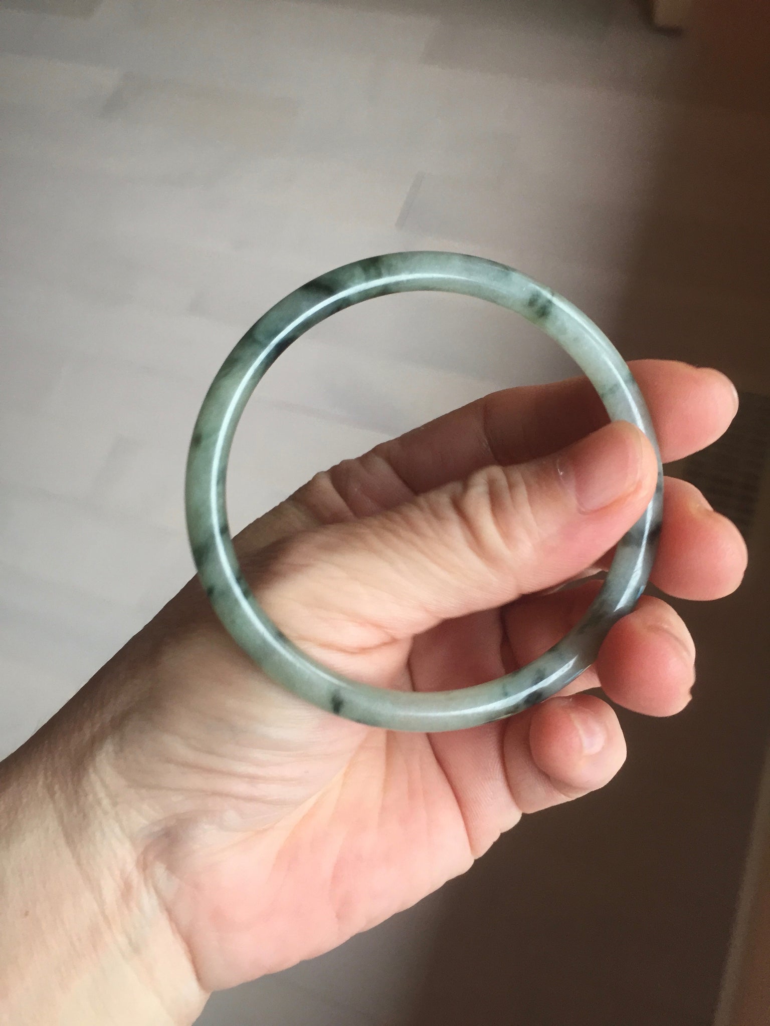 Some surface scratches, rough surfaces with fissures (photos did not mark them all). Some tiny rough spots. All won't influence the firmness. Some cotton lines, cotton spots, and cotton areas. The bangle has some gray/ black color.