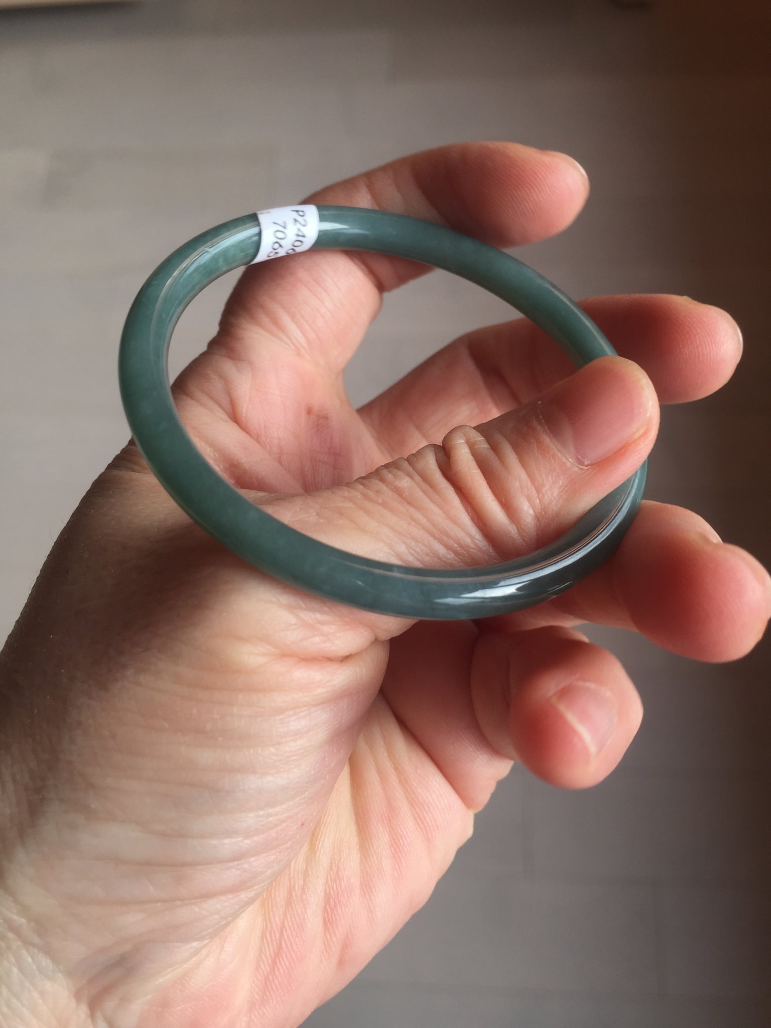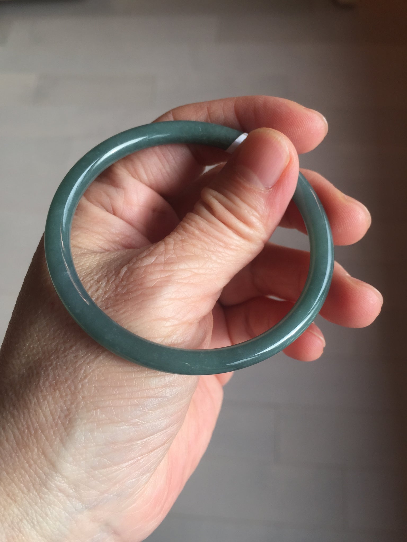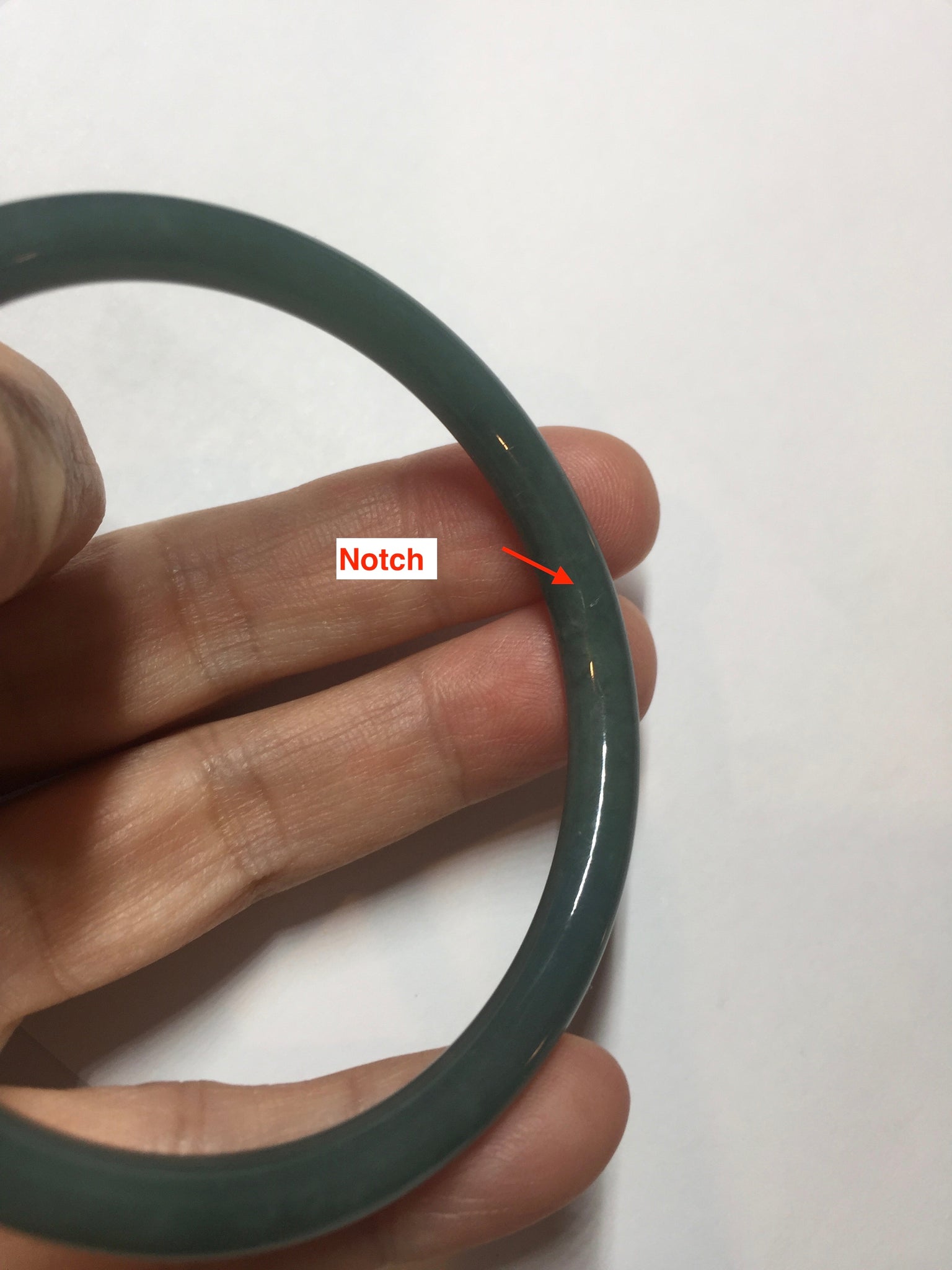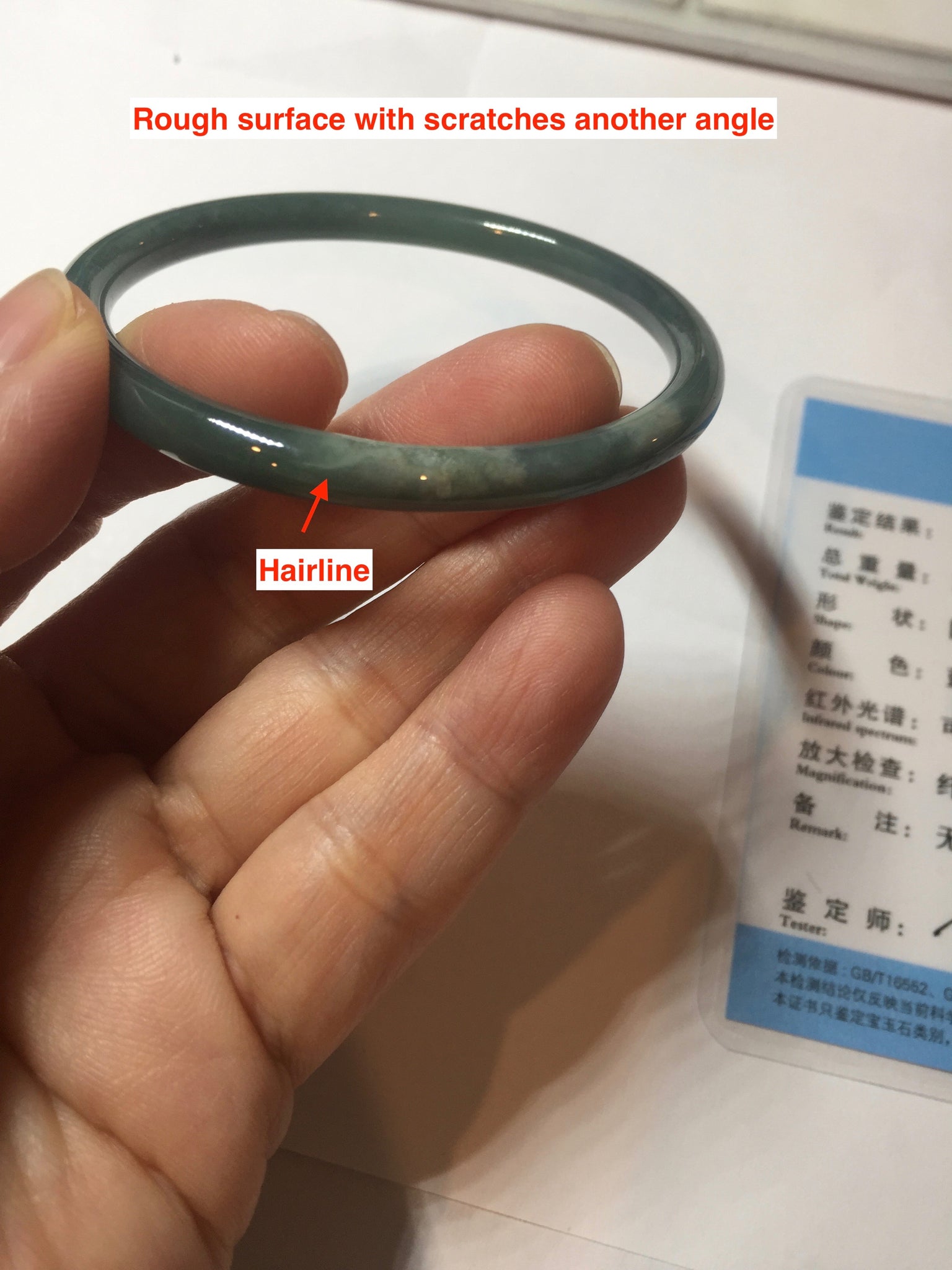 One dim rough surface with scratches. Some hairlines and notches. The bangle is solid. Some cotton areas,cotton lines and cotton spots. The bangle has some gray/ black color.