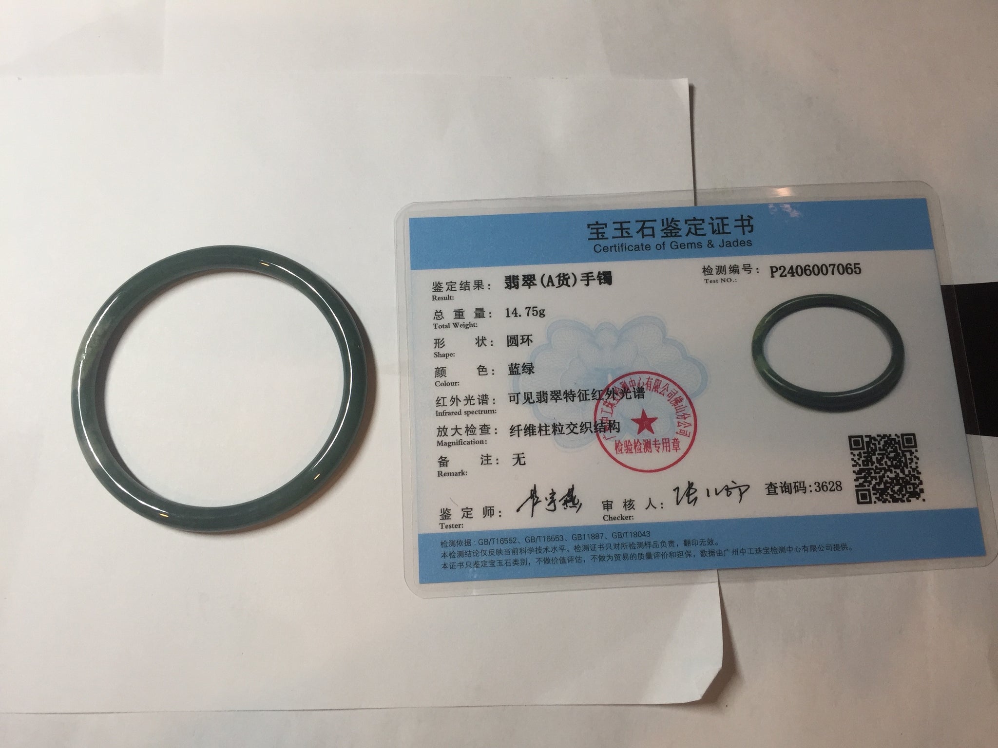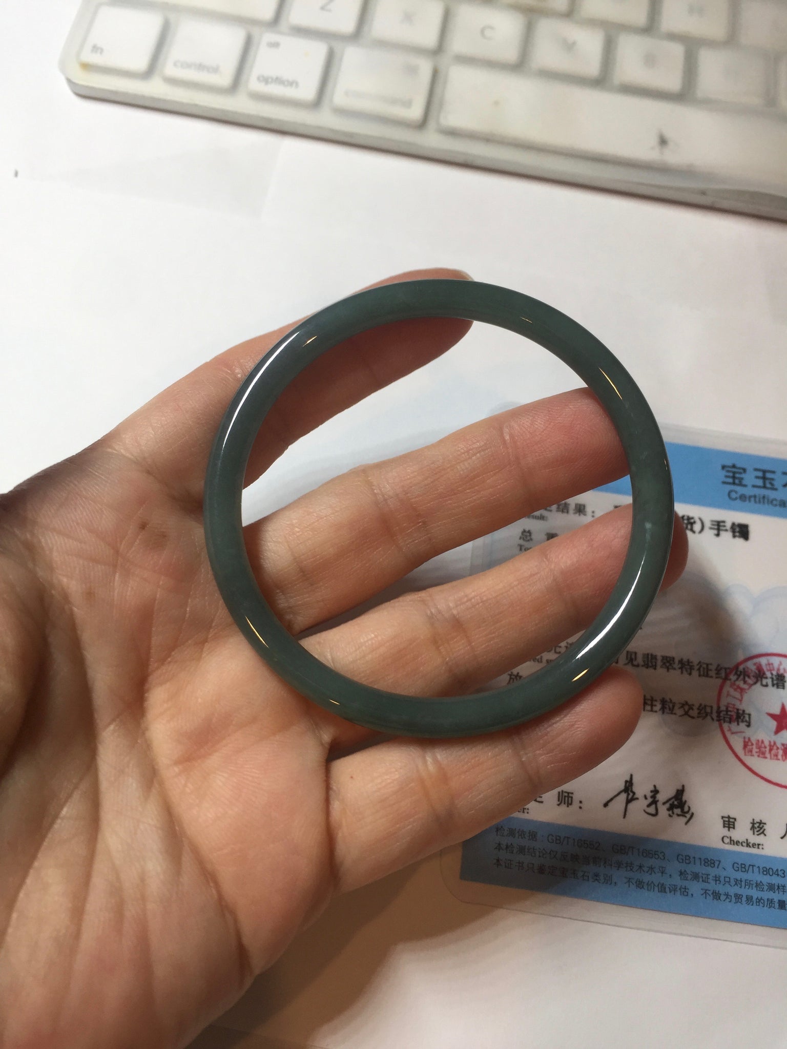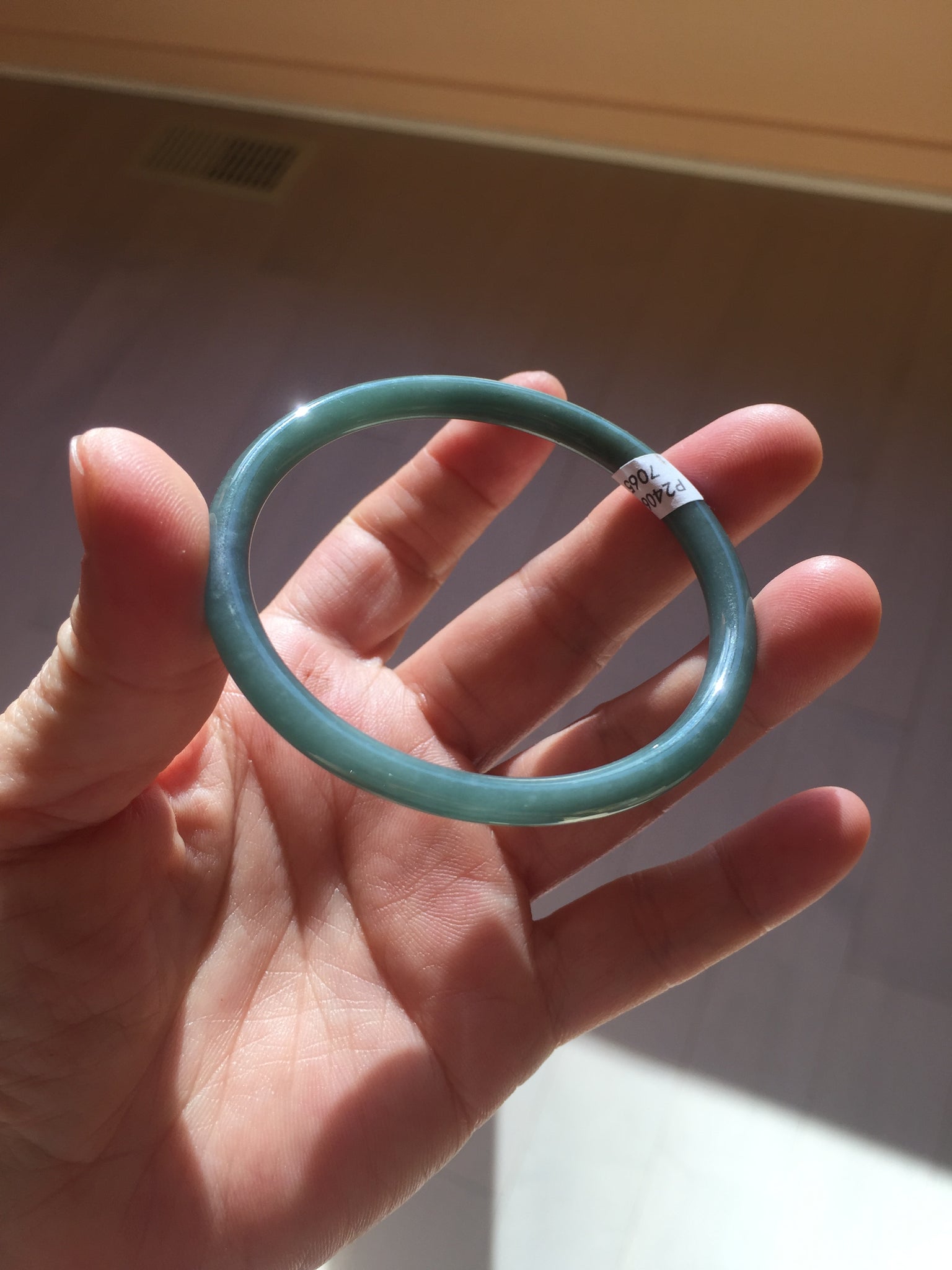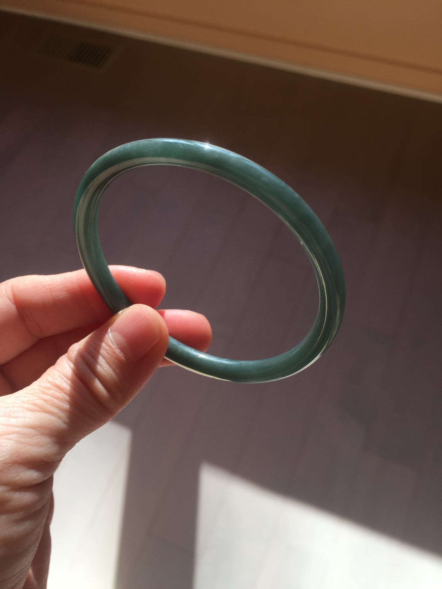 One dim rough surface with scratches. Some hairlines and notches. The bangle is solid. Some cotton areas,cotton lines and cotton spots. The bangle has some gray/ black color.