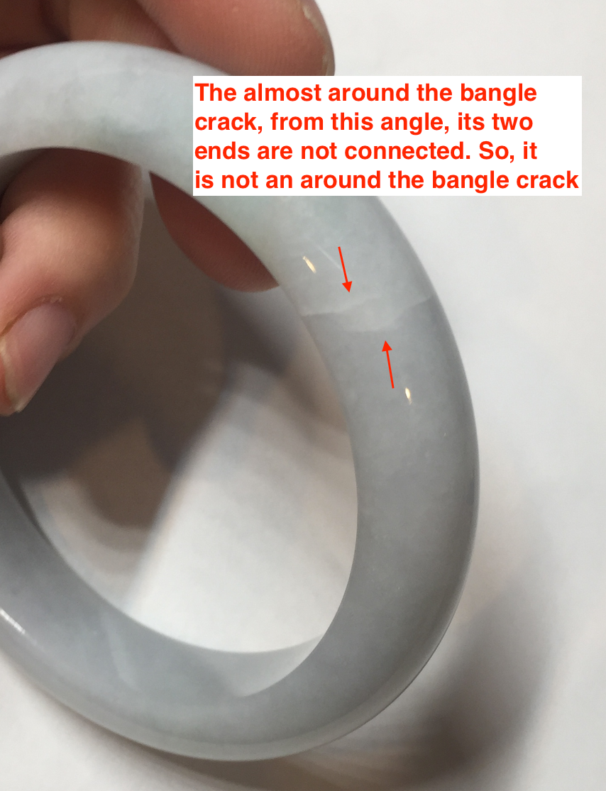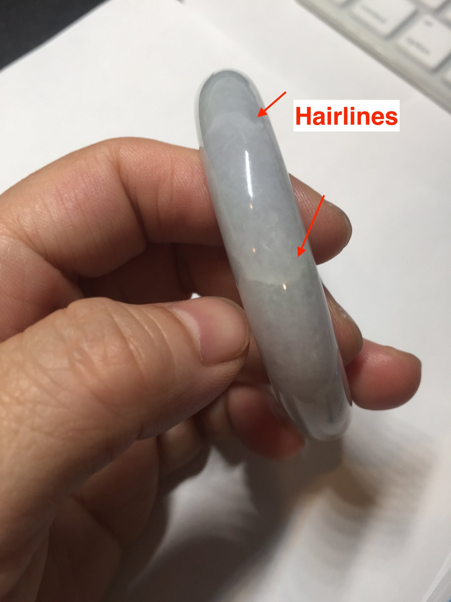 There is one almost around the bangle crack. Two hairlines. Some cotton areas and spots. The purple is super light, way lighter than in the photos.