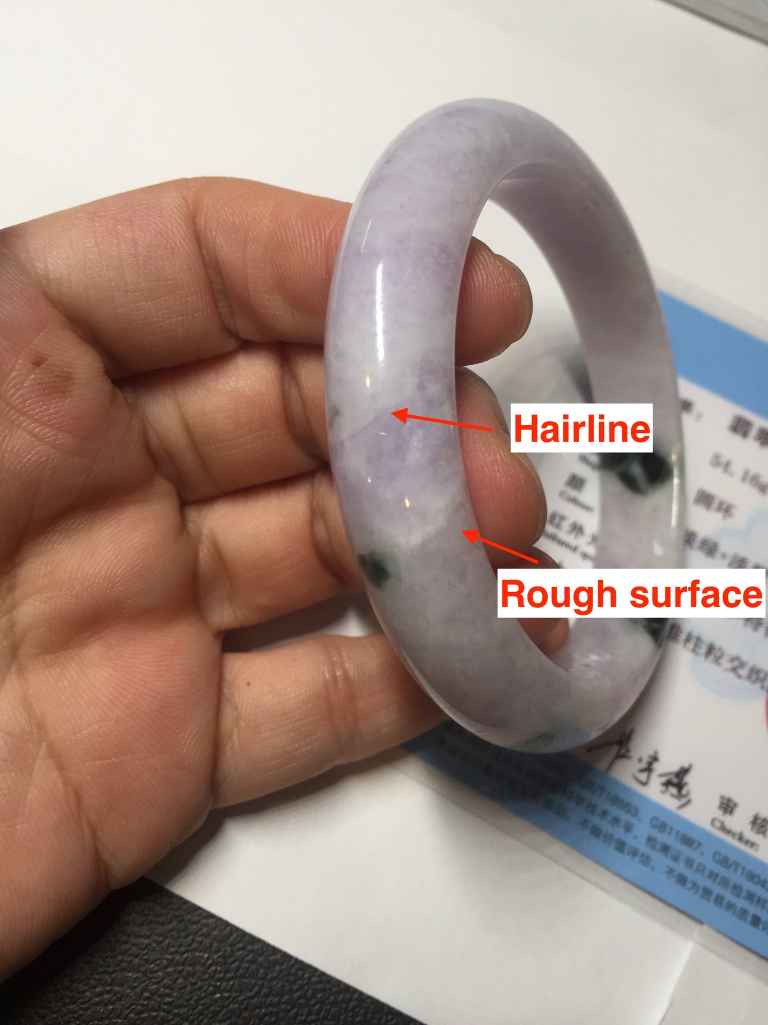 There are quite a lot of cracks with a little bit of wax (photos may not show all of them). Some hairlines, small rough surfaces, cotton and cotton areas. The purple is lighter than in the photos. The yellow is just a line.