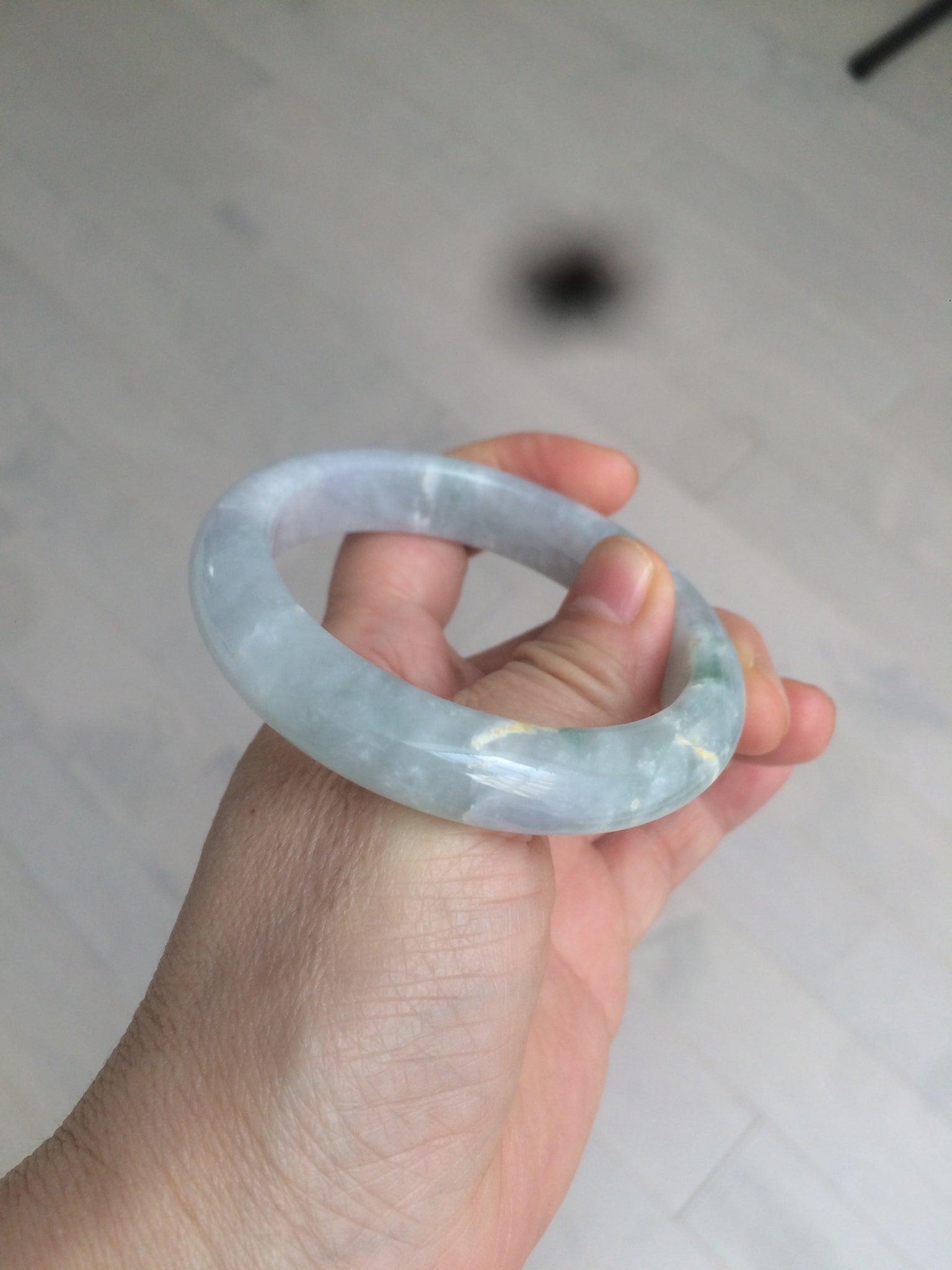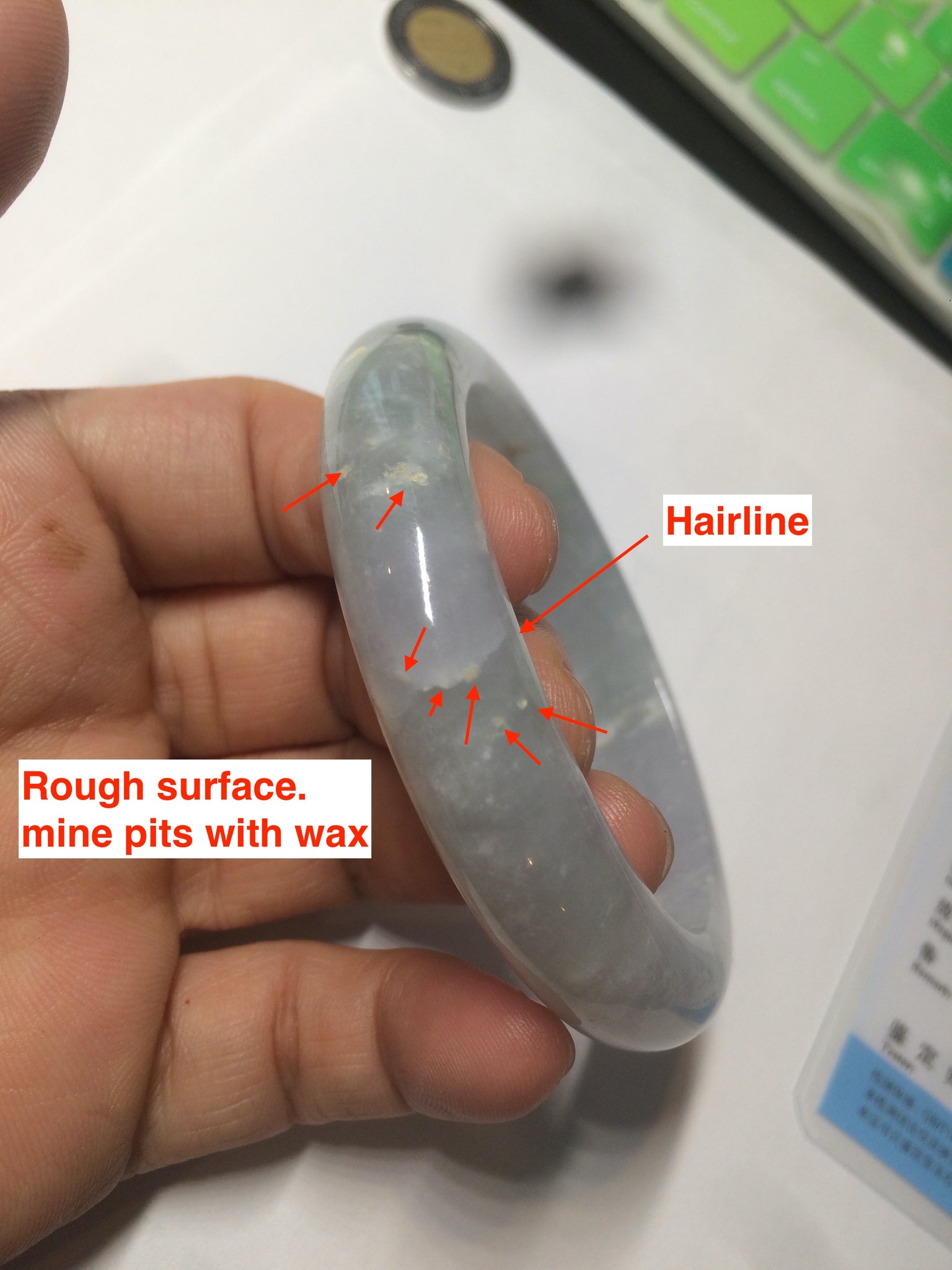 Some rough surfaces or mine pits with wax. Two hairlines, one is long u shape. Won't influence the firmness. Cotton areas and cotton spots. The purple is super light. Lighter than in photos.