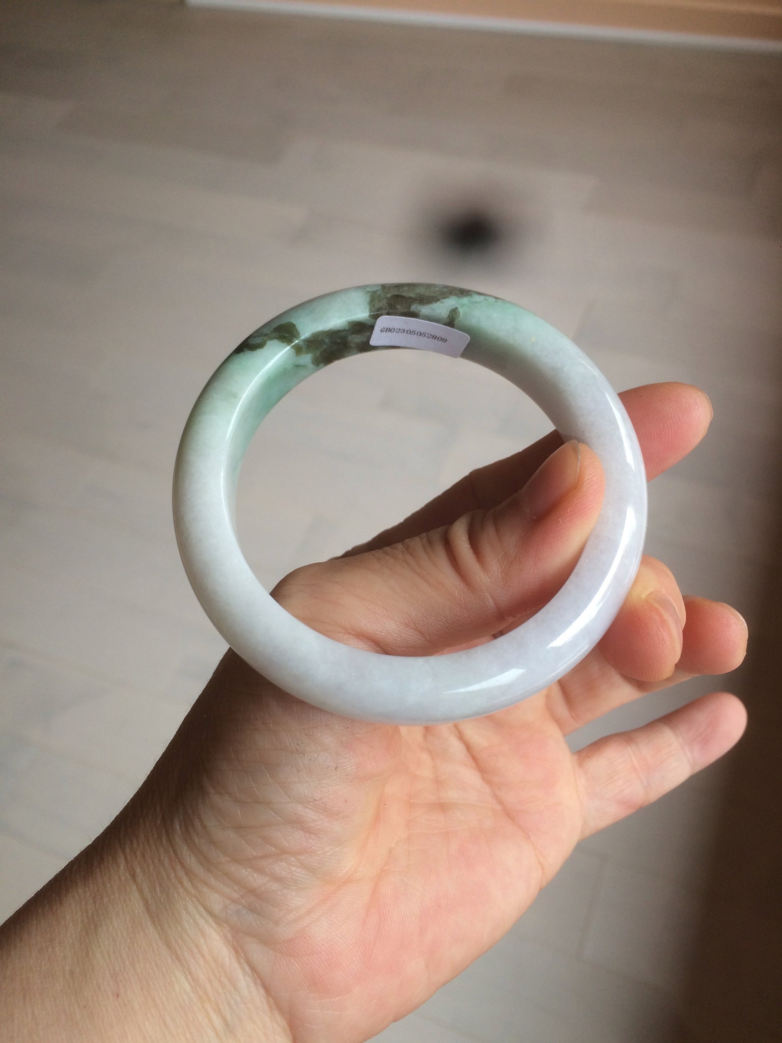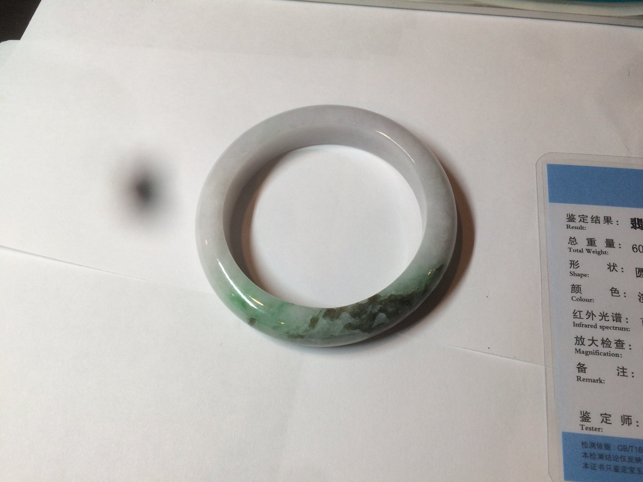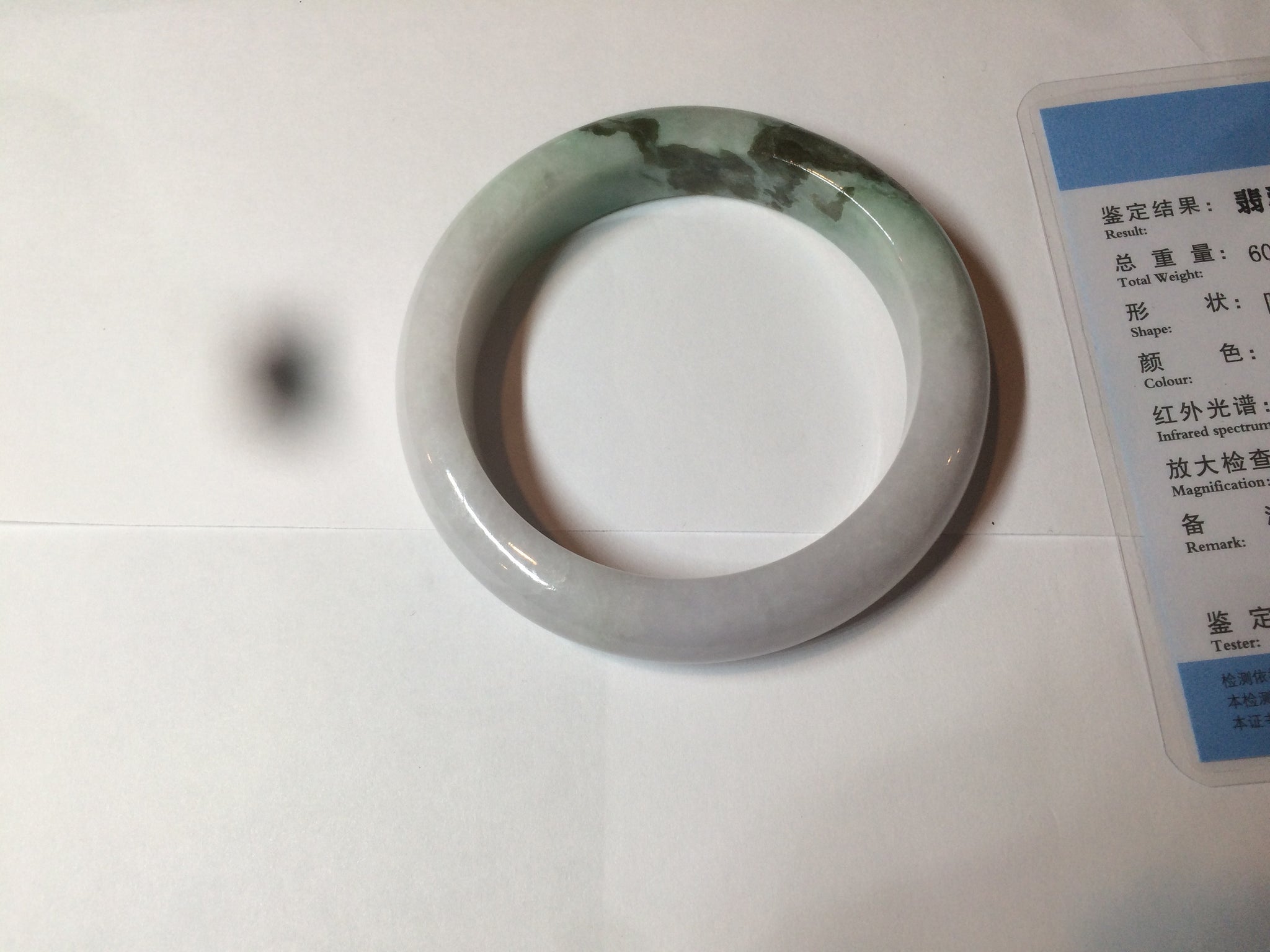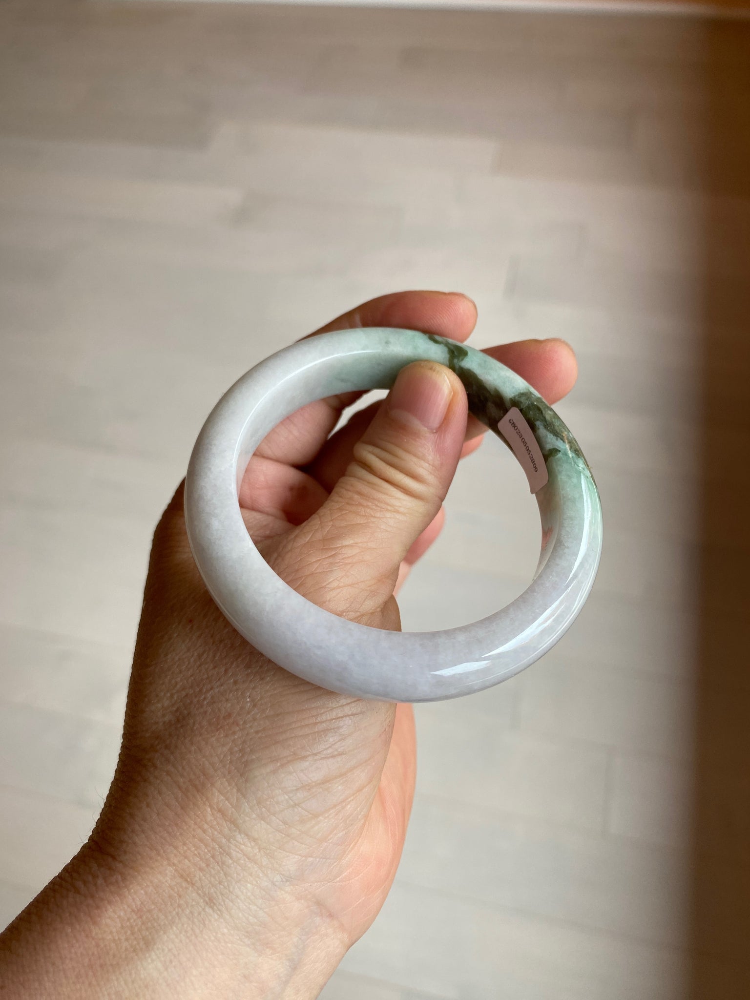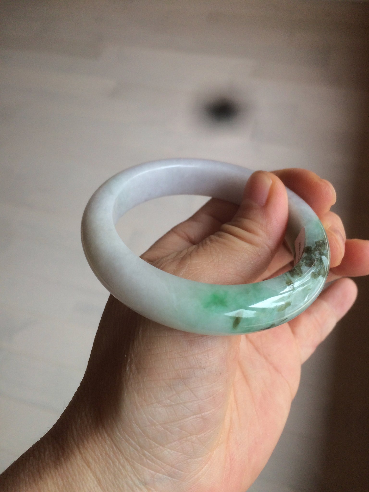 Some surface cracks. The bangle is firm. One rough surface area with surface fissures, hairlines, and mine pits. Cotton areas, lines, and spots. The purple is lighter than in the photos.
