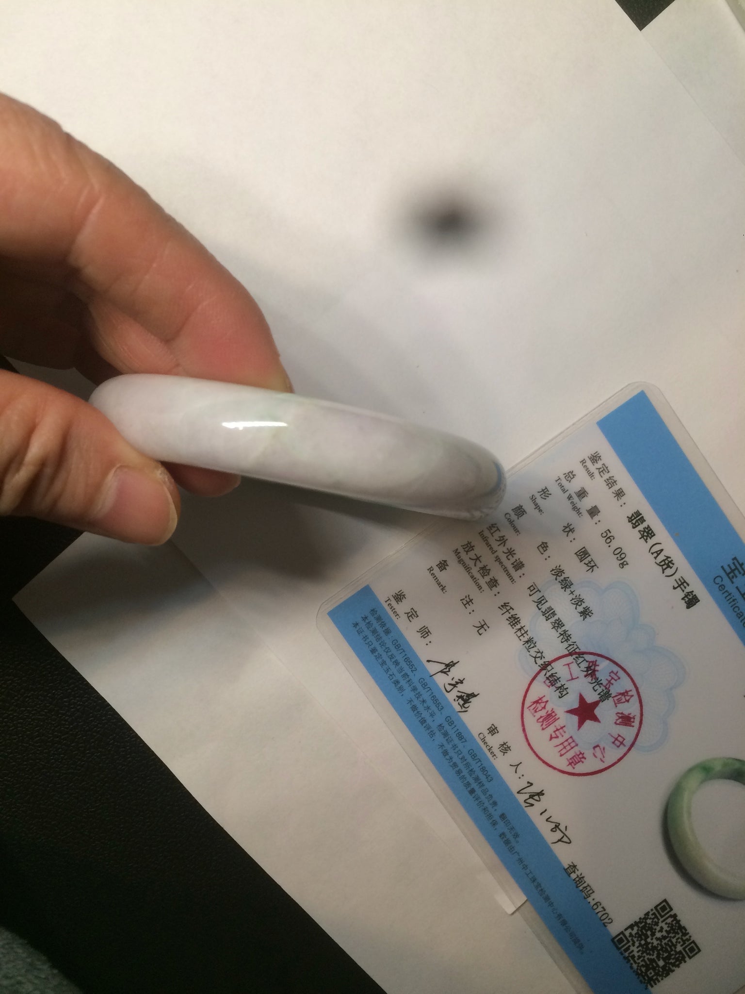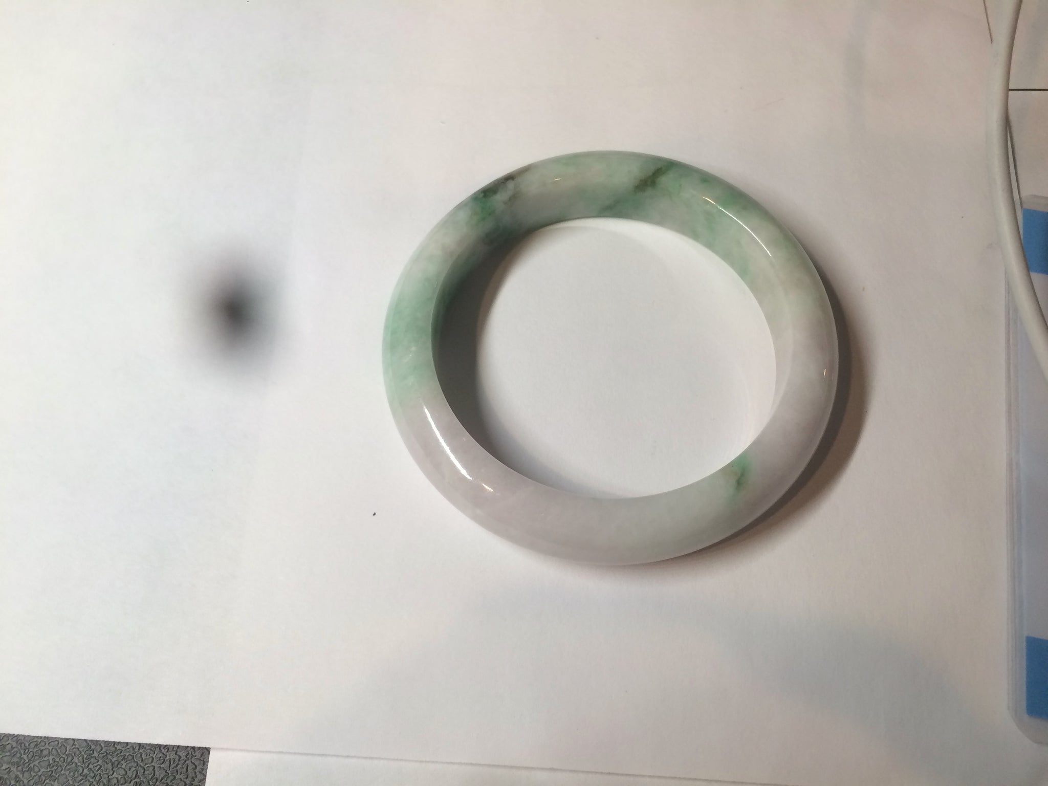 One brown rough surface area with surface crack. Some hairlines(more than 8). The bangle is solid. Cotton areas and spots. No transparent. The purple is lighter than in the photos. The brown area part of the bangle is thinner than the other part(7.8mm).