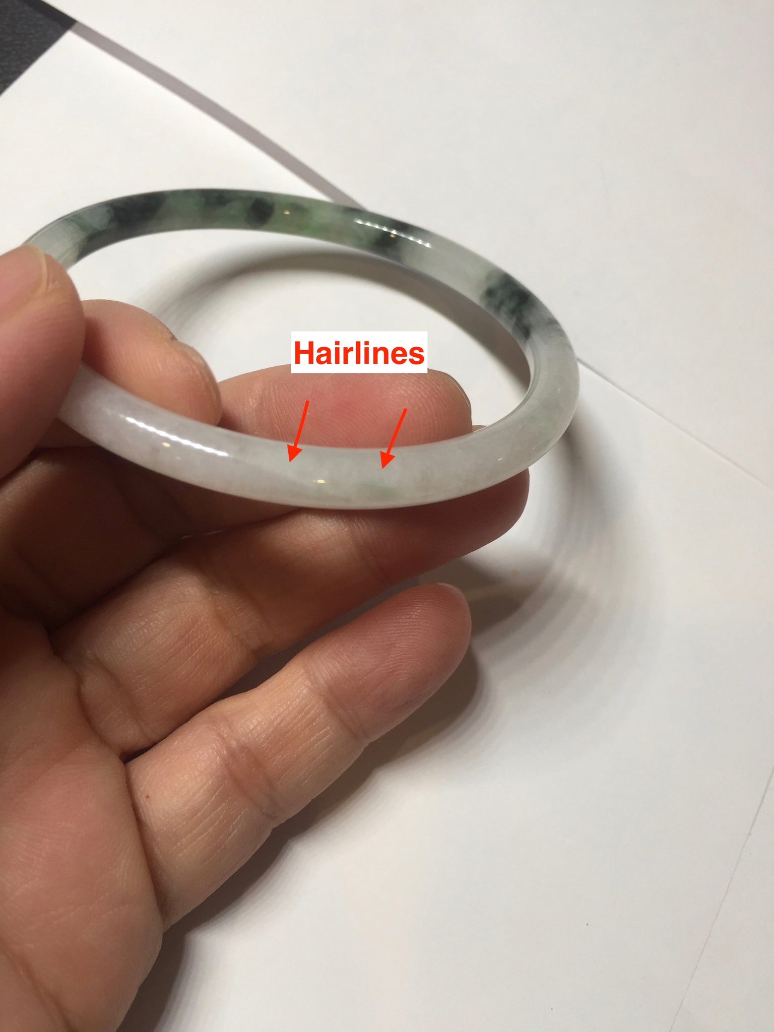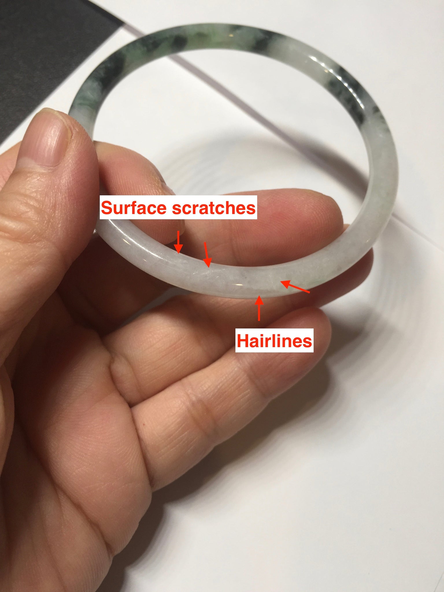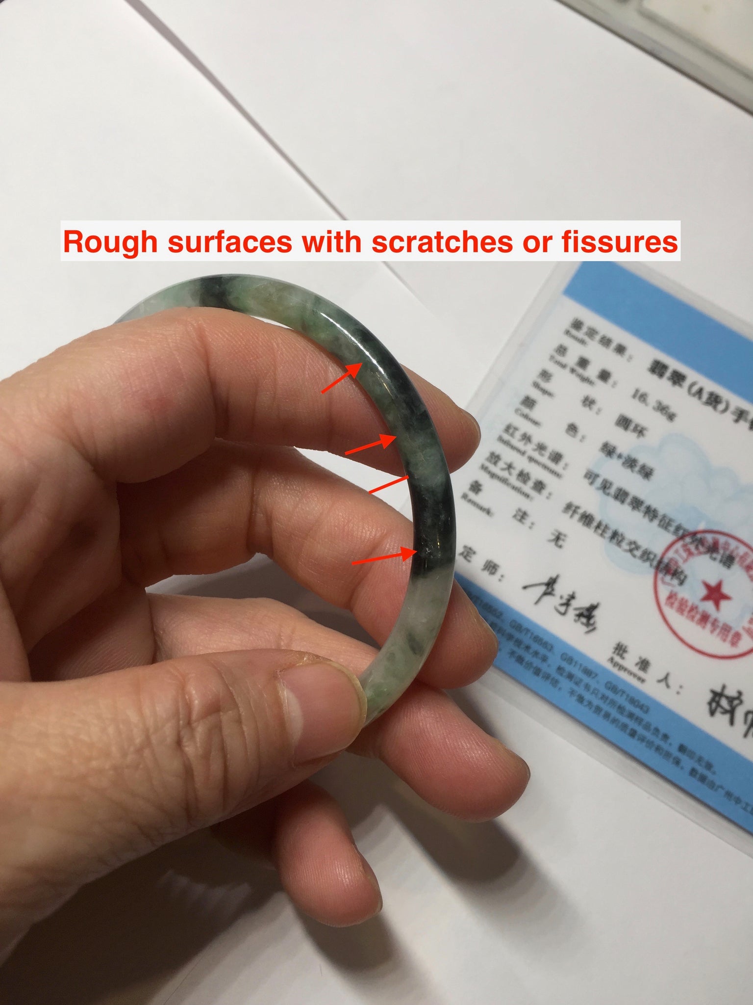 Some surface scratches, rough surfaces with scratches or fissures (photos did not mark them all). Some tiny rough spots. Some cotton lines, cotton spots, and cotton areas. The bangle has some gray/ black color.