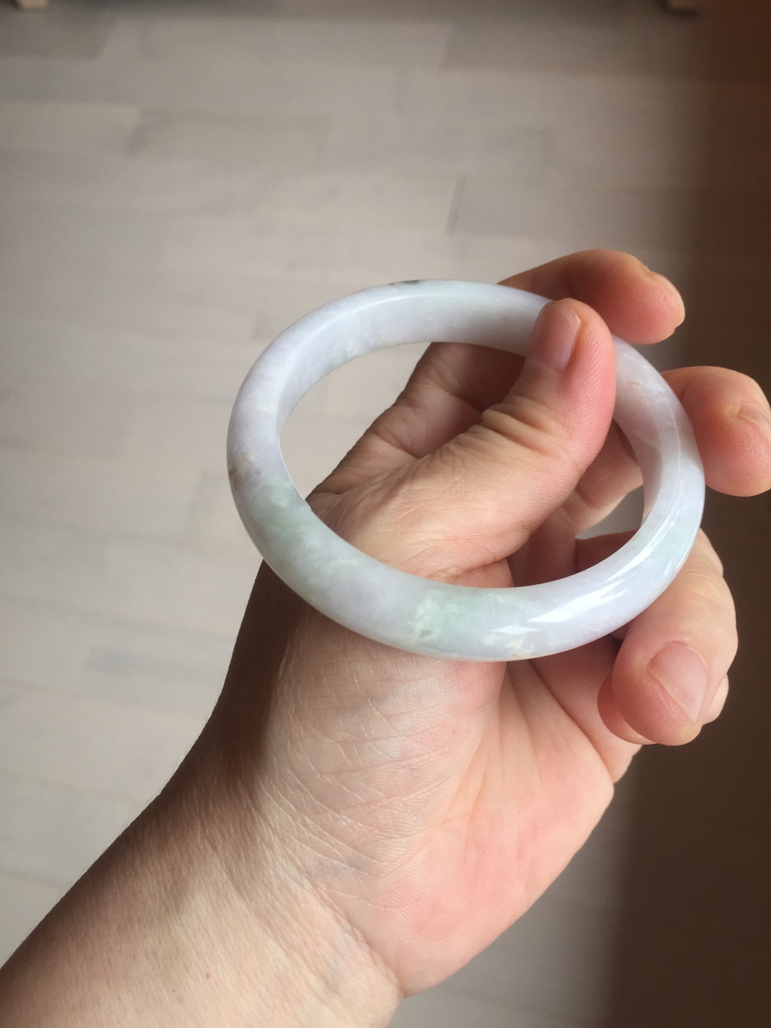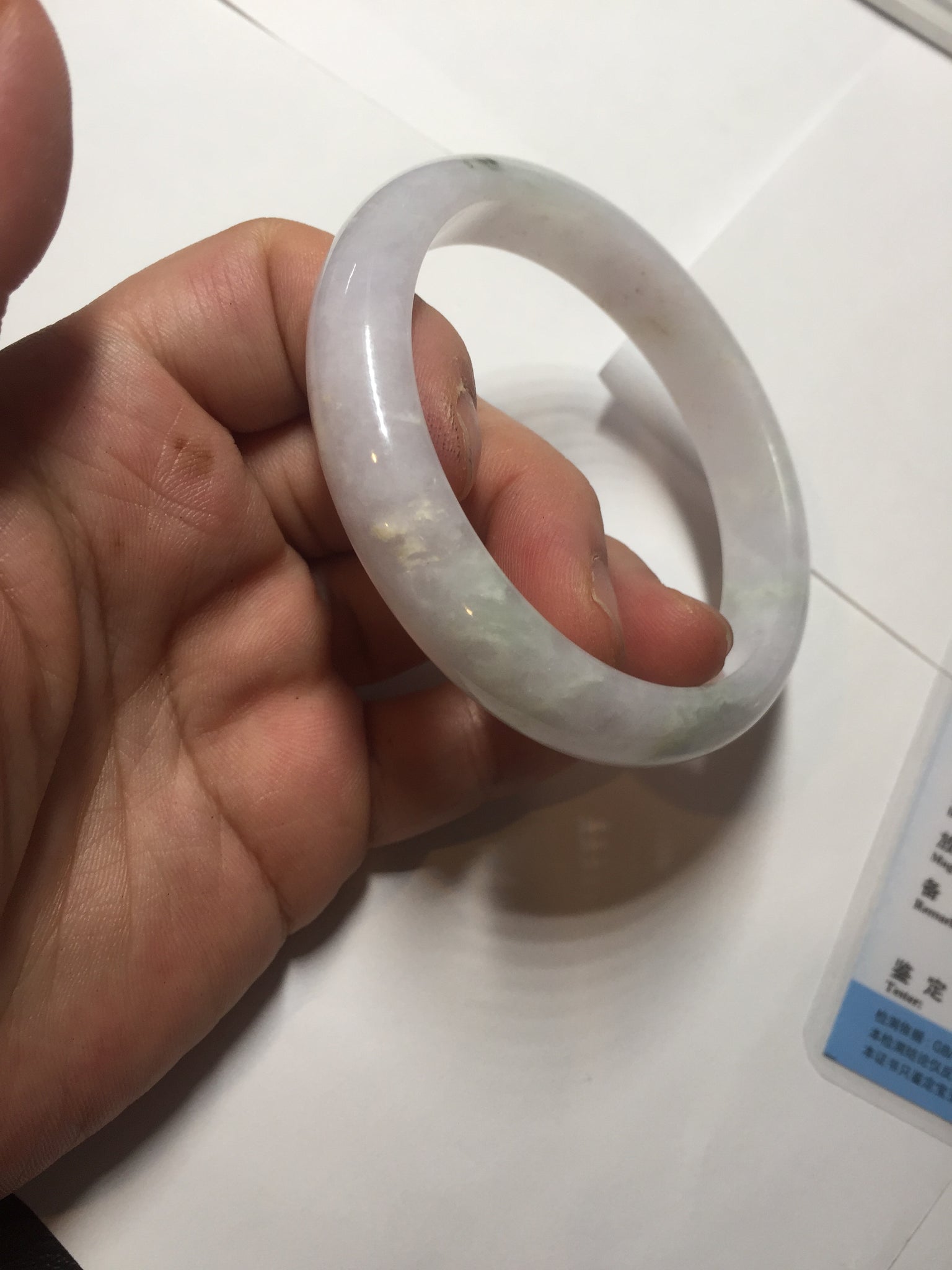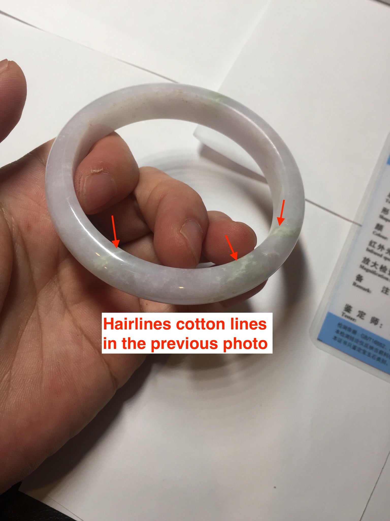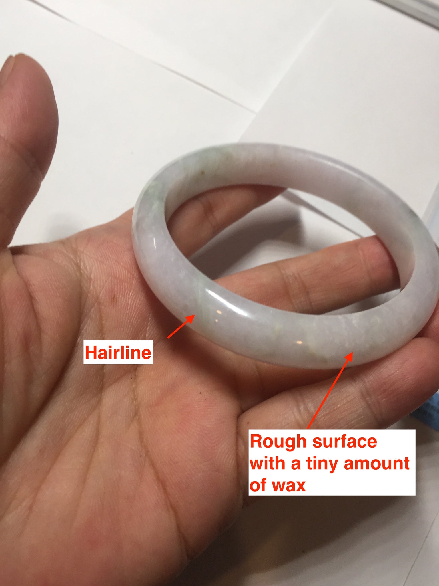 No crack. Some hairlines, rough surfaces with a tiny bit of wax, Cotton lines, and cotton areas. The purple is lighter than in the photos.