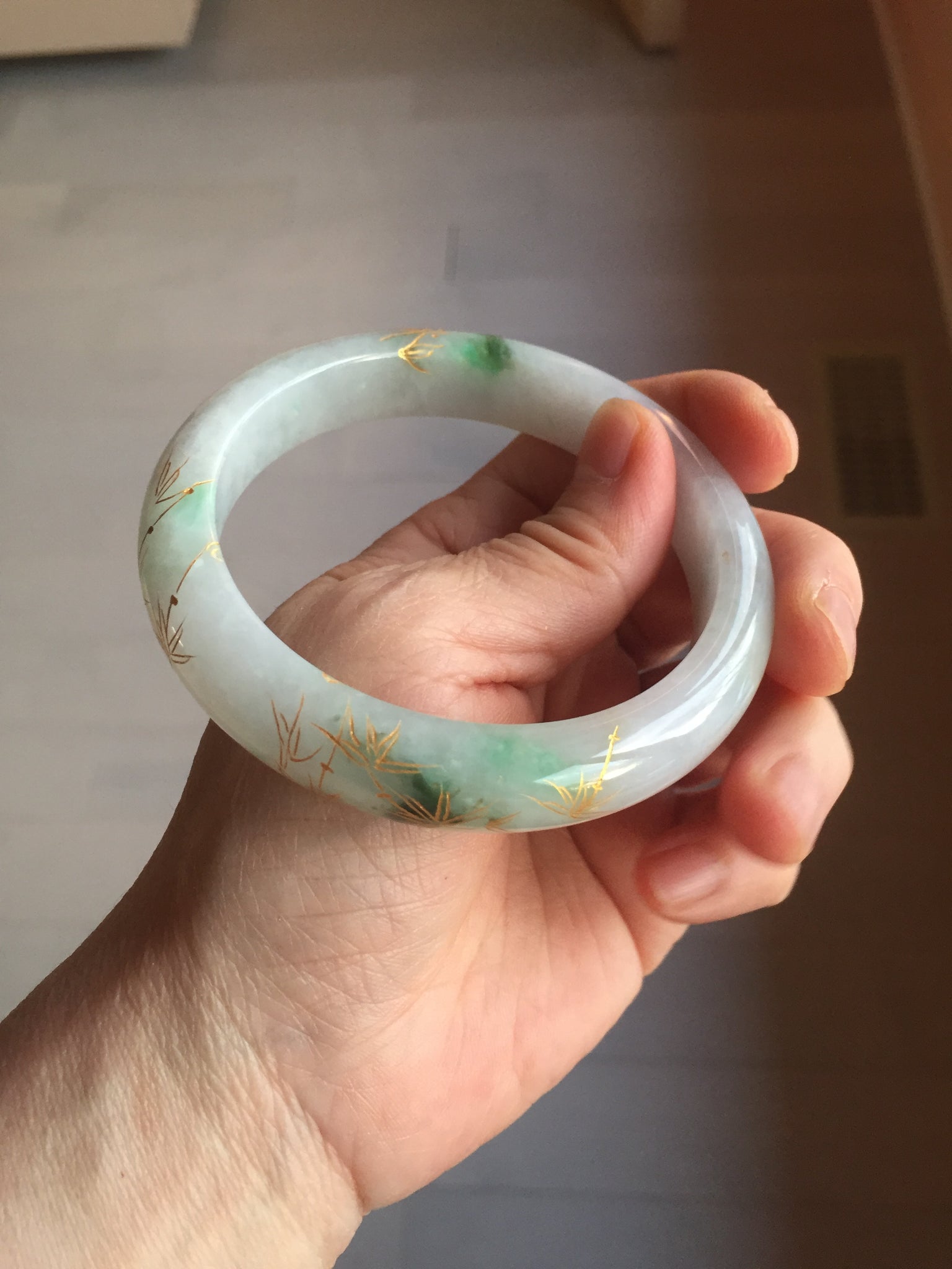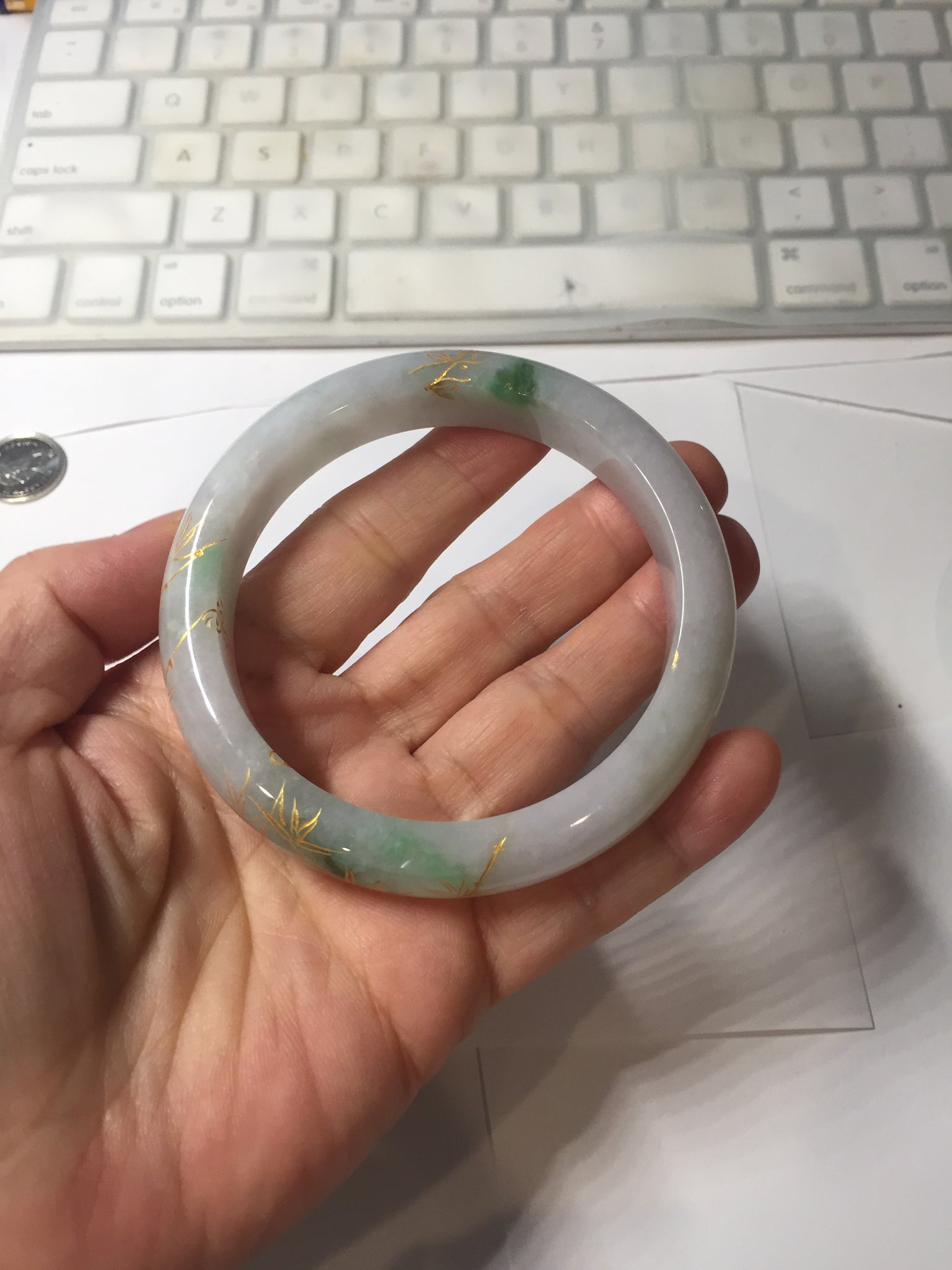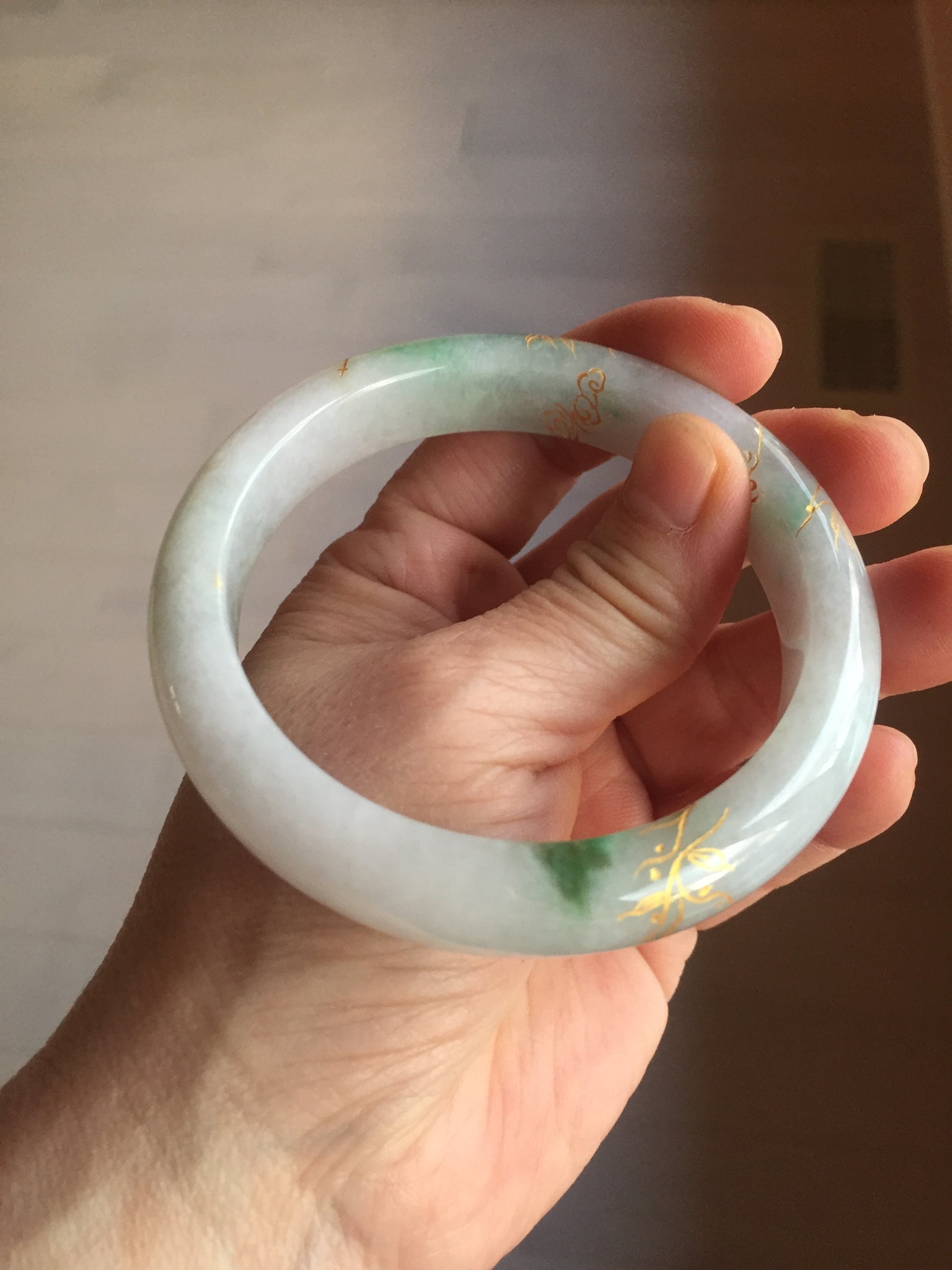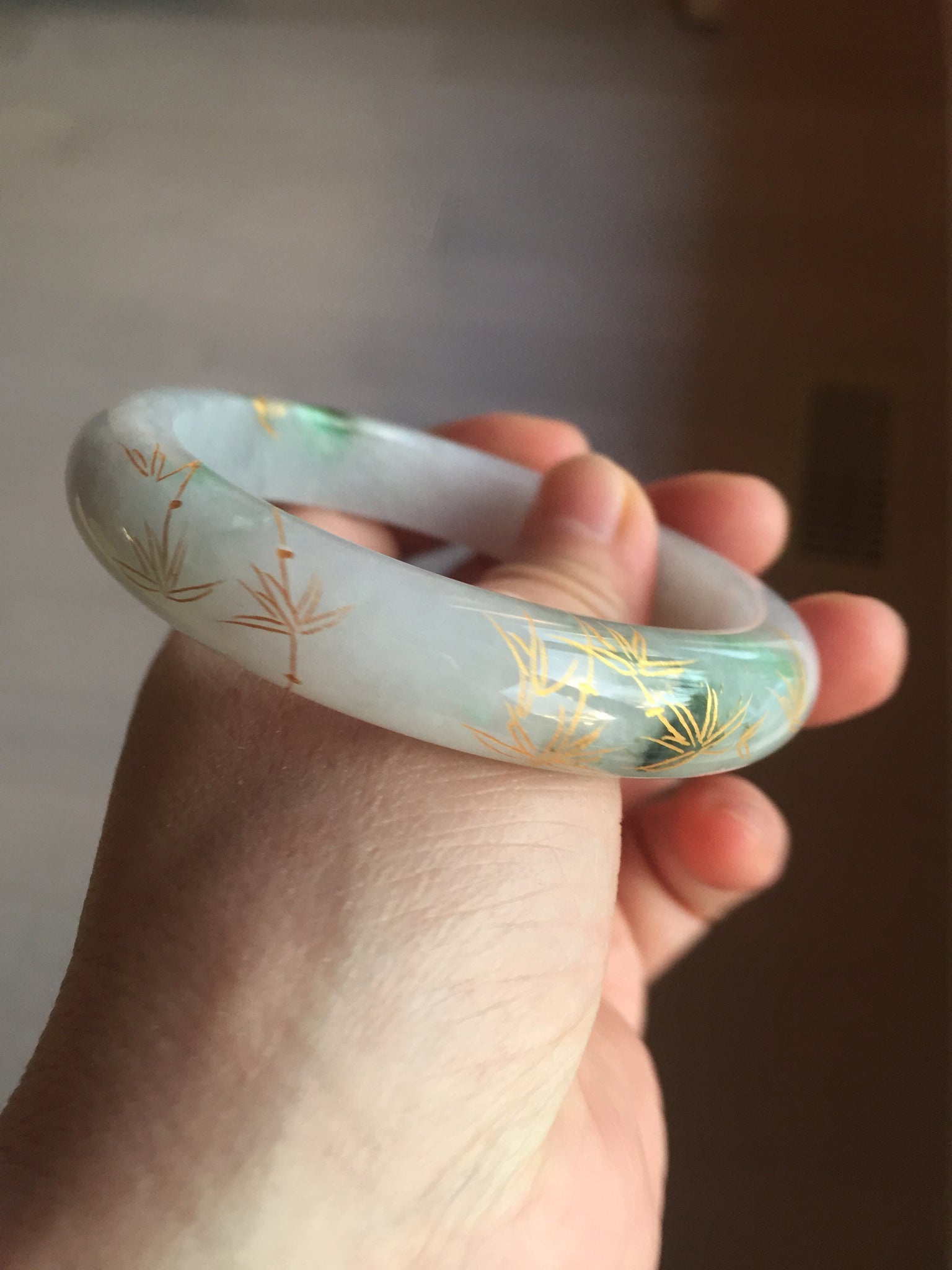 May have some surface cracks or hairlines was carved off or covered by the carving. The bangle is still firm(Guaranteed!). Makes high pitch sound when tapped. Some cotton spots, cotton lines, and cotton areas.