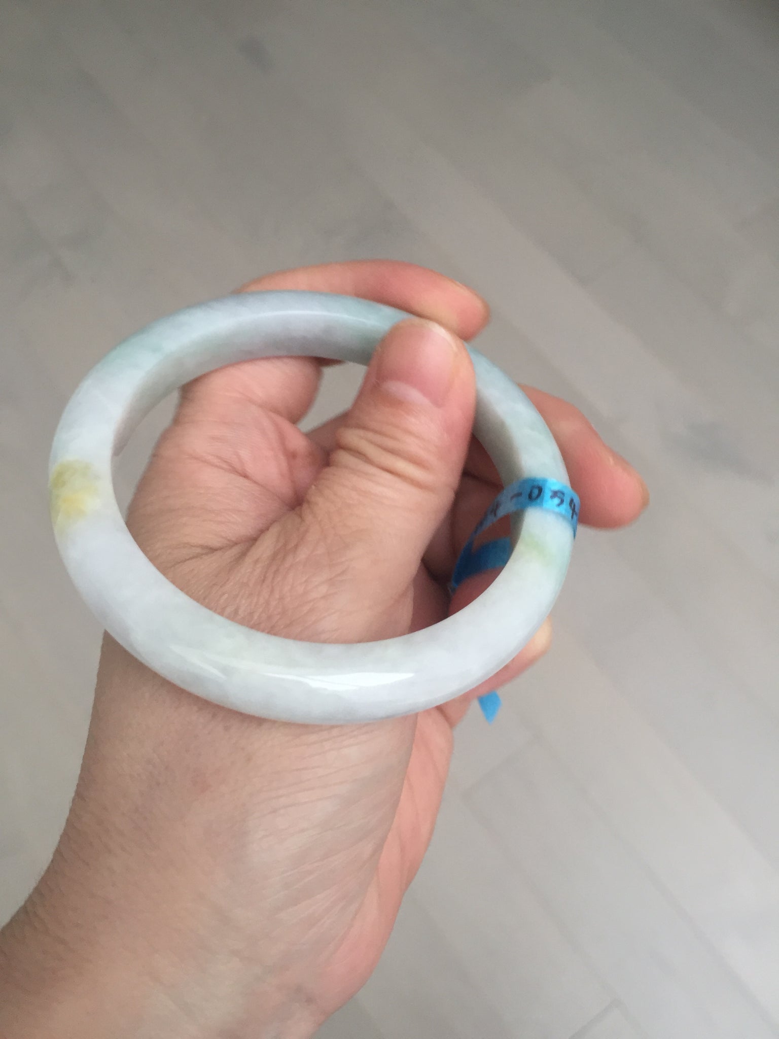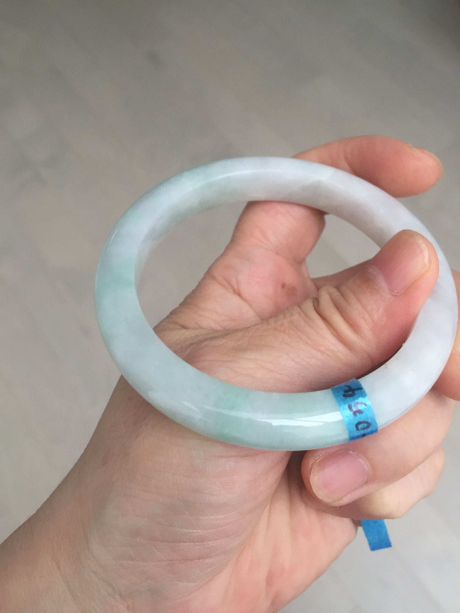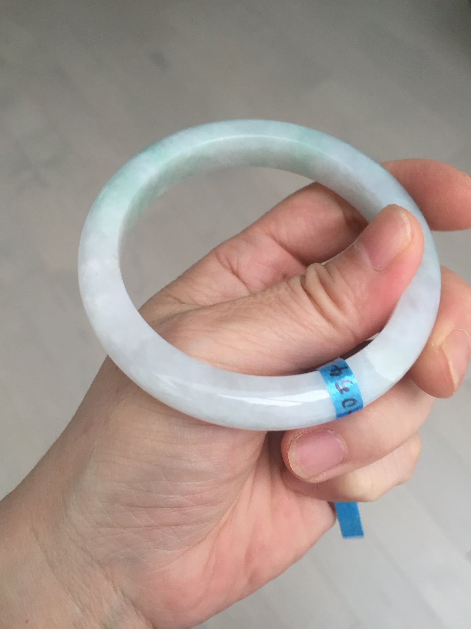 Some cracks. One of them is almost around the bangle. The bangle is still solid (Guaranteed!). Some hairlines, cotton lines, cotton spots, and areas. The purple is super light and just a hint of it.