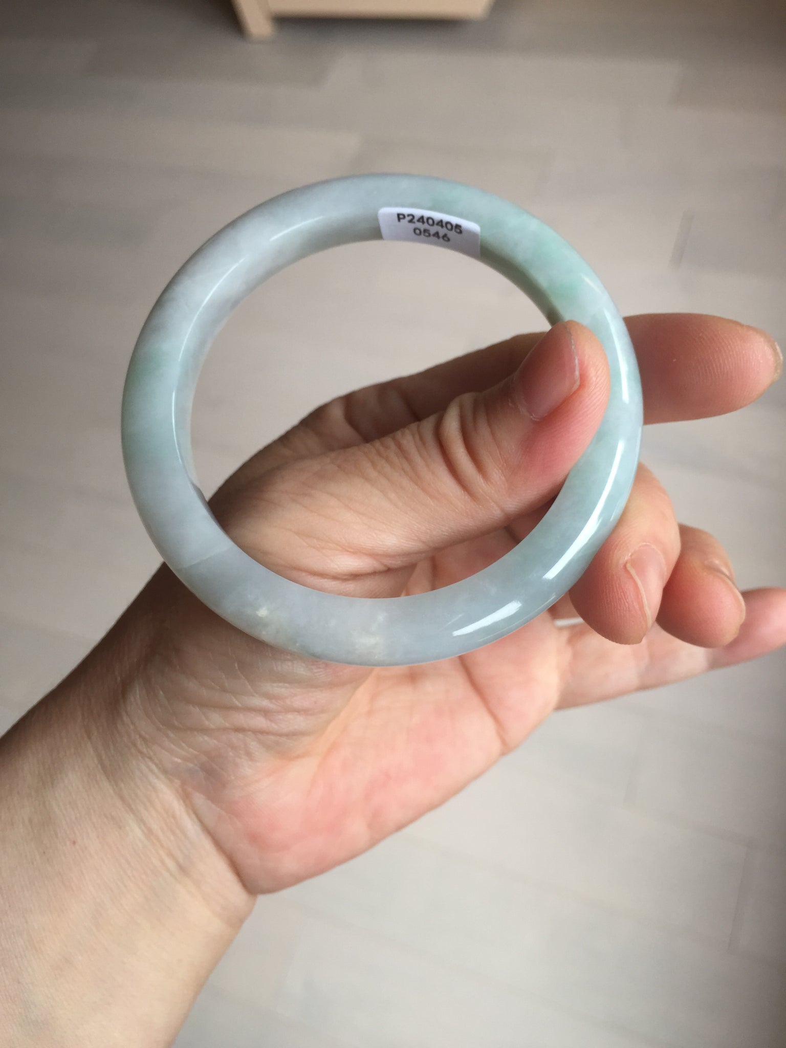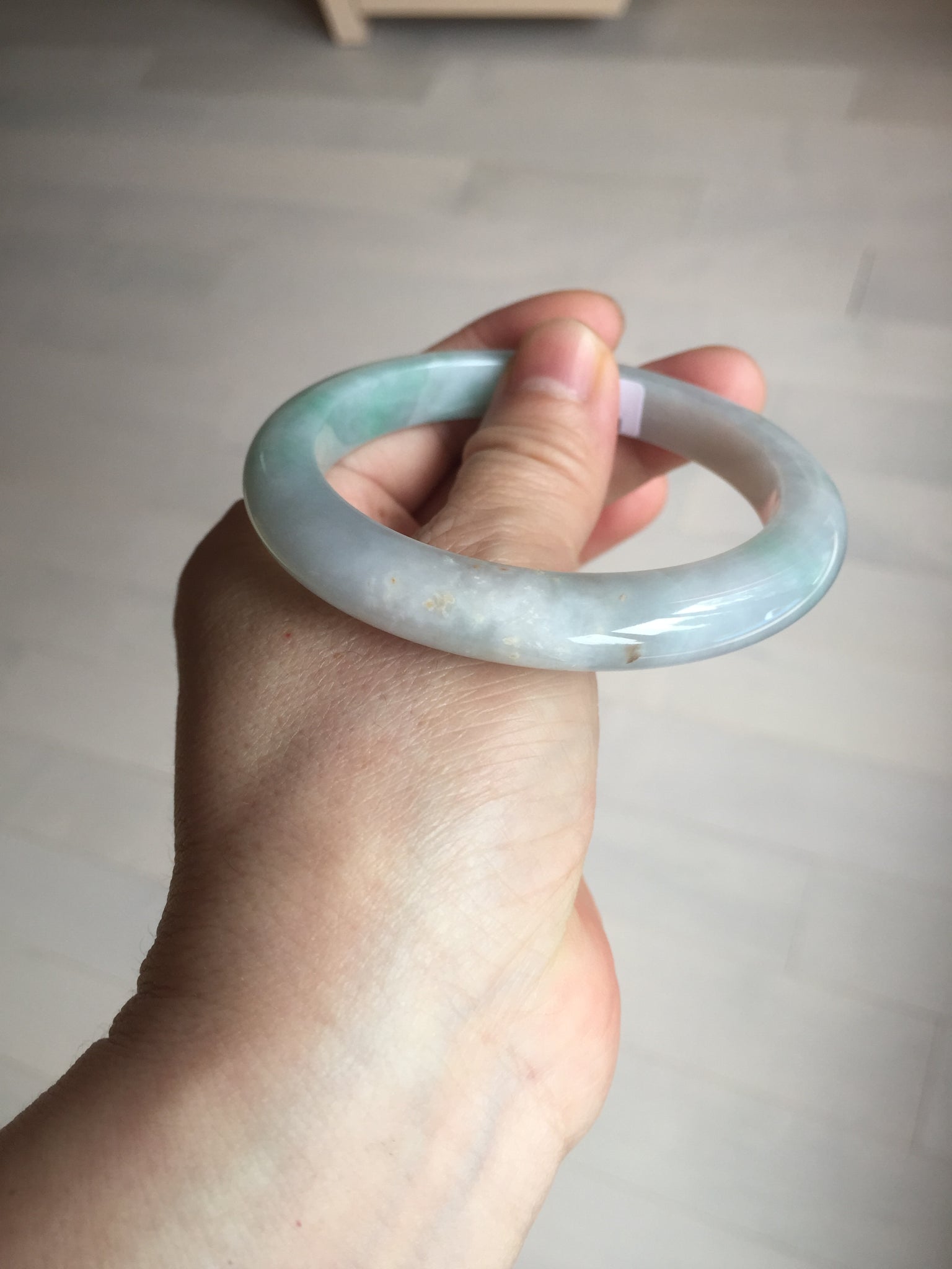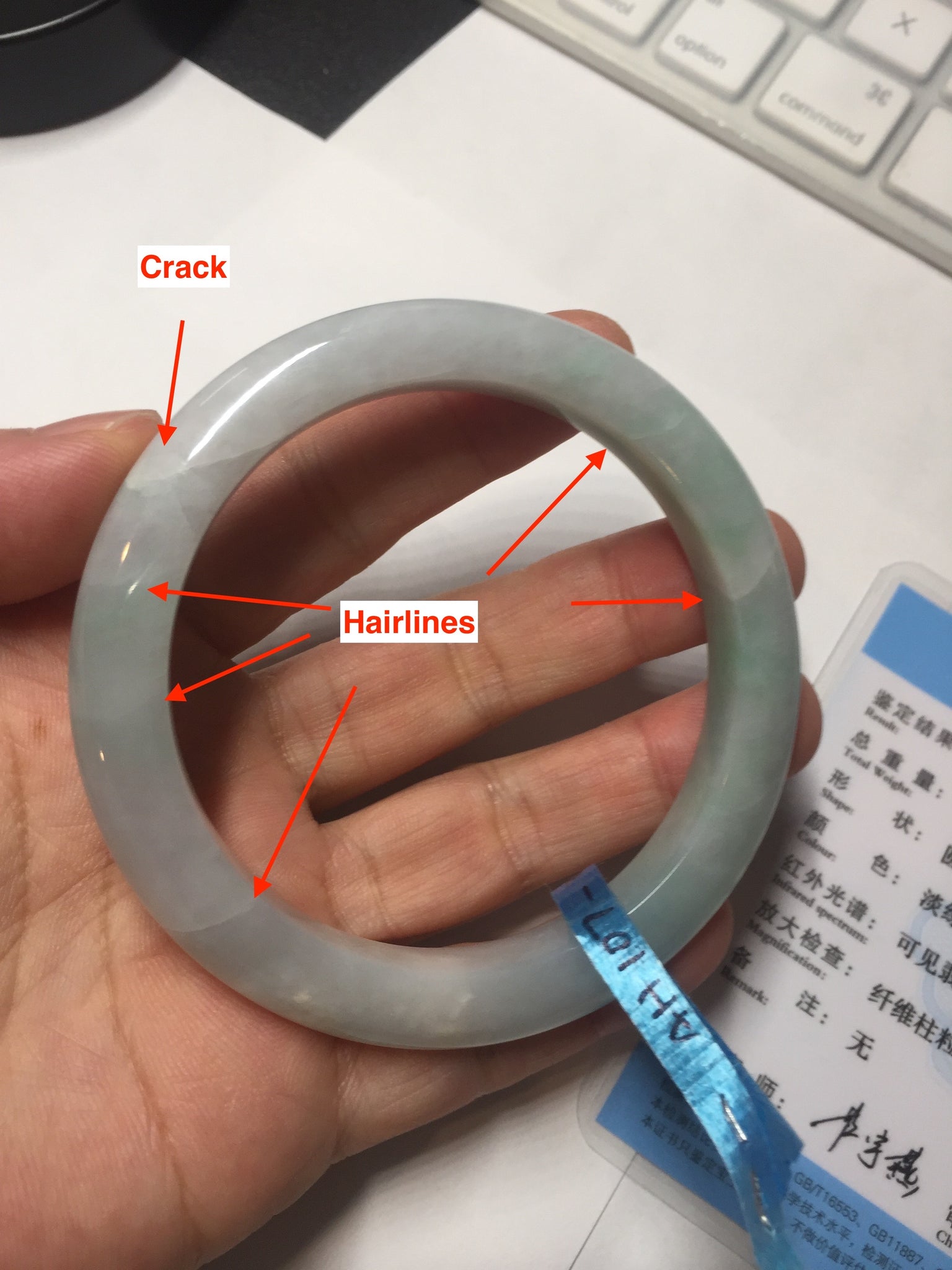 Some cracks. The bangle is still solid (Guaranteed!). Some hairlines, cotton lines, cotton spots, and areas. The purple is super light. Just a hint of it.
