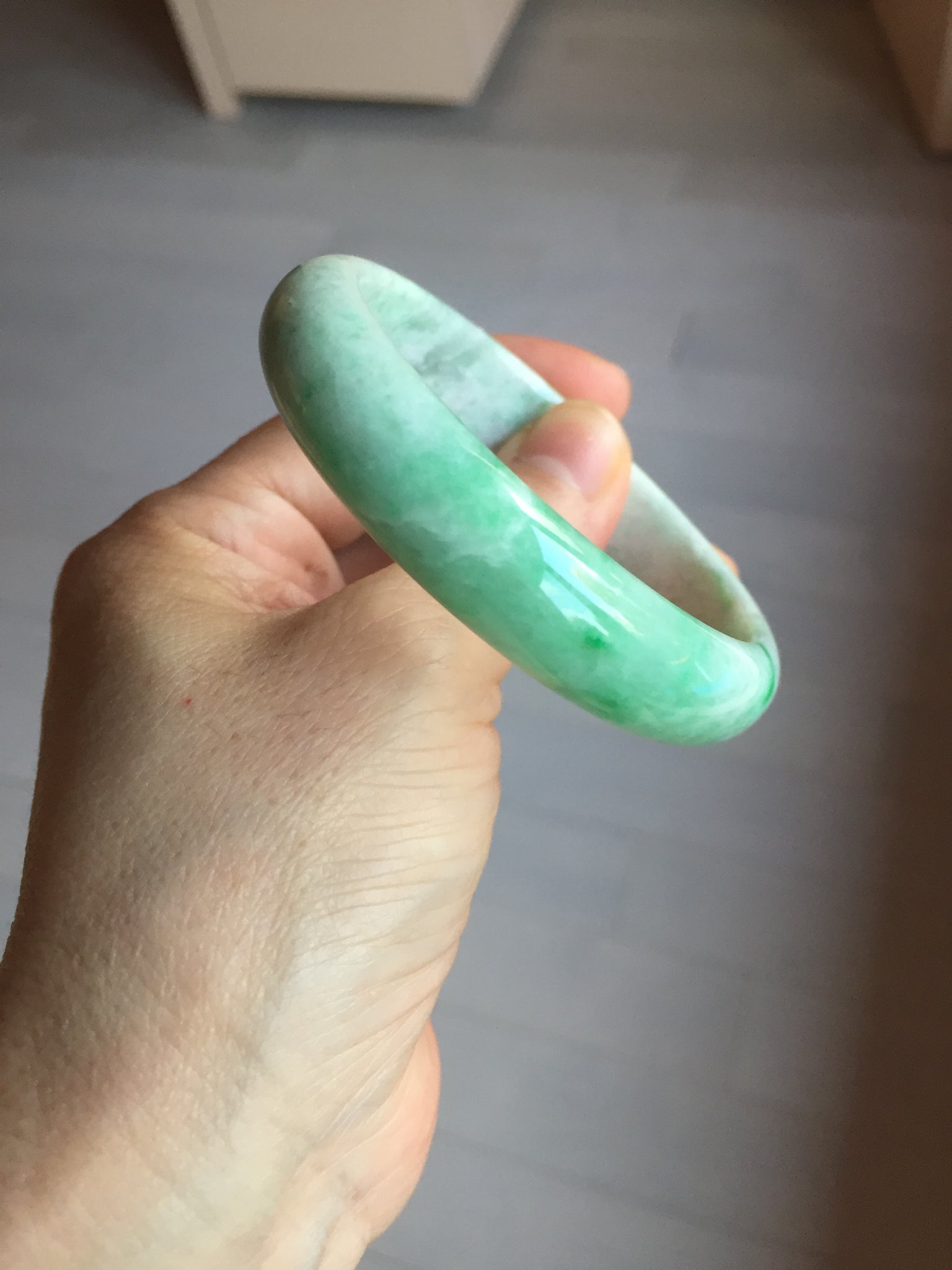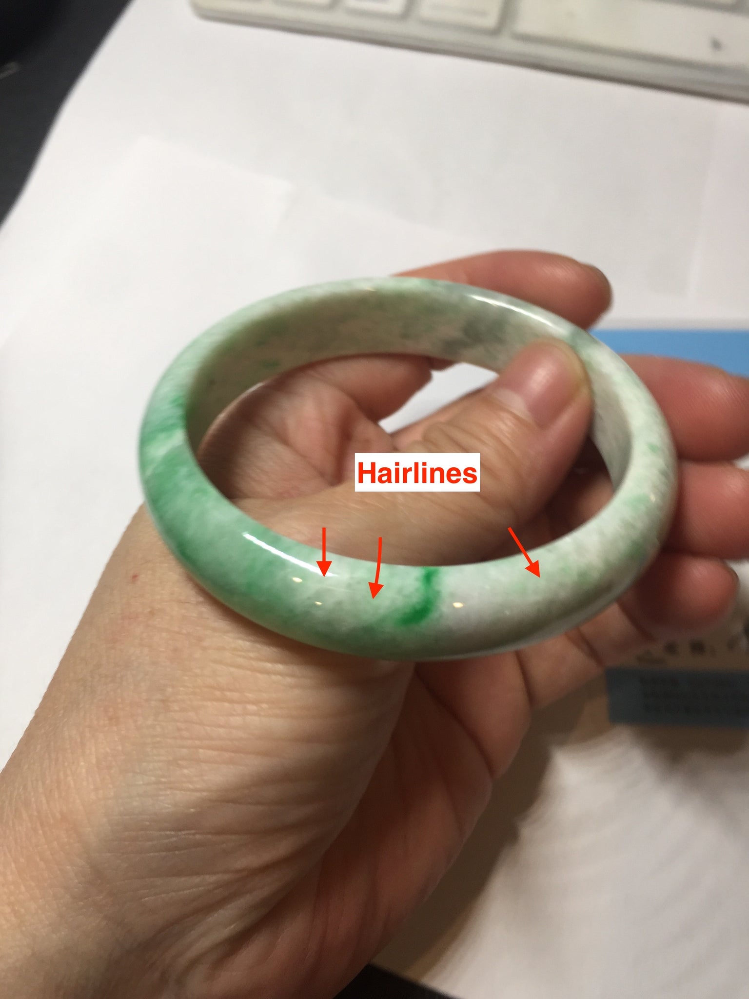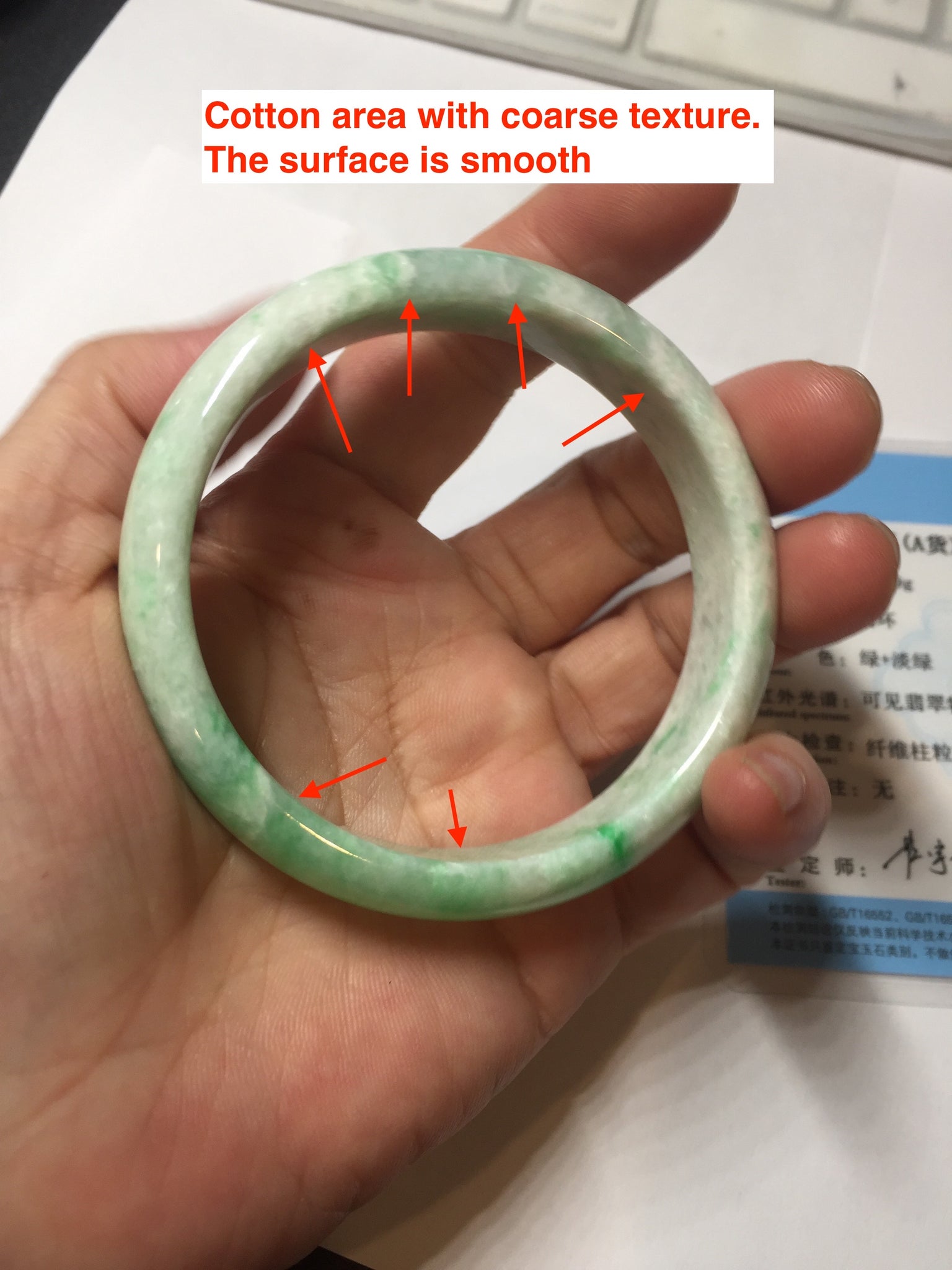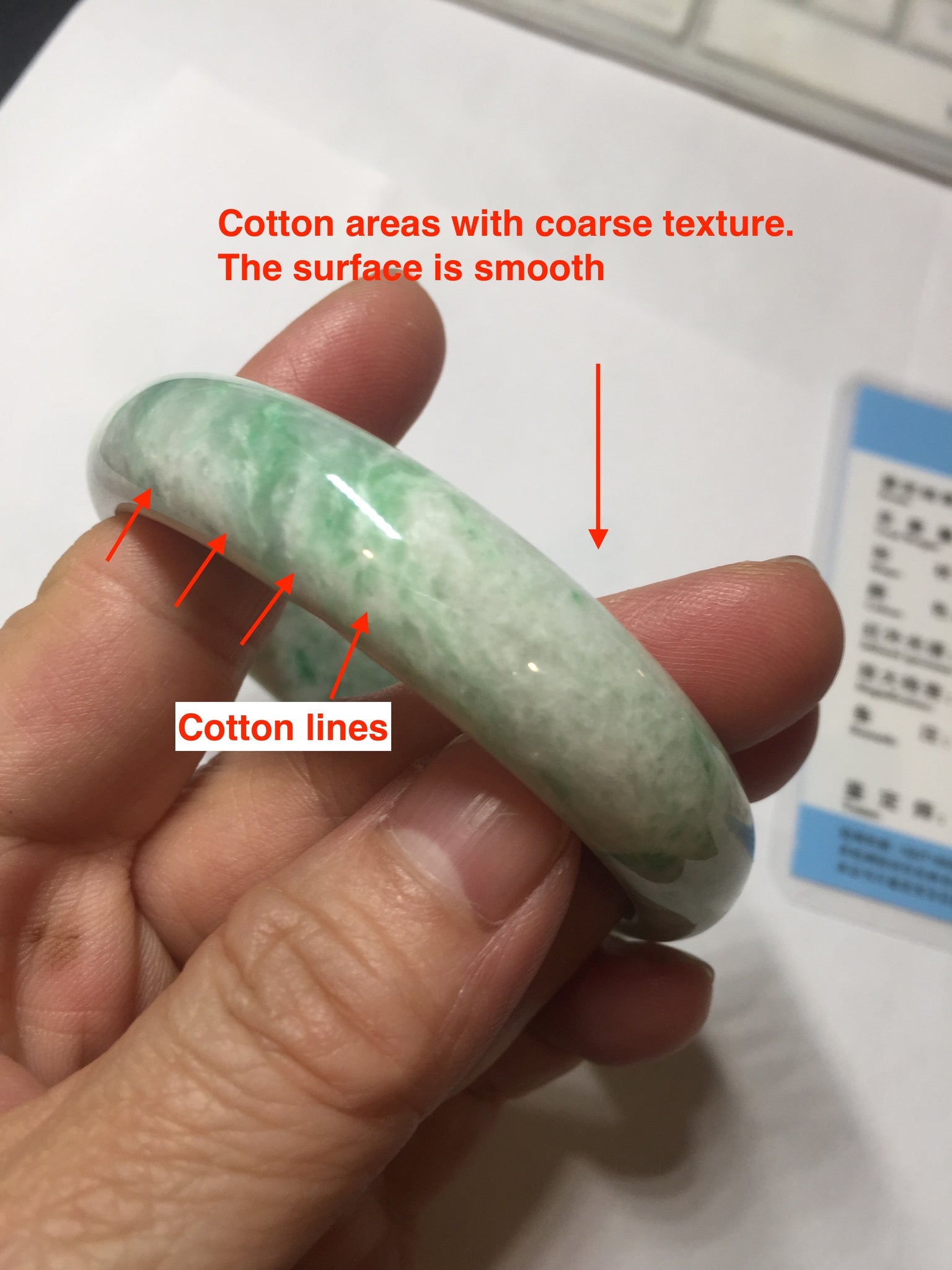 No crack. Some hairlines. One relativity big cotton area with cotton lines and coarse texture(the surface is smooth). Some small rough surfaces. Not transparent.