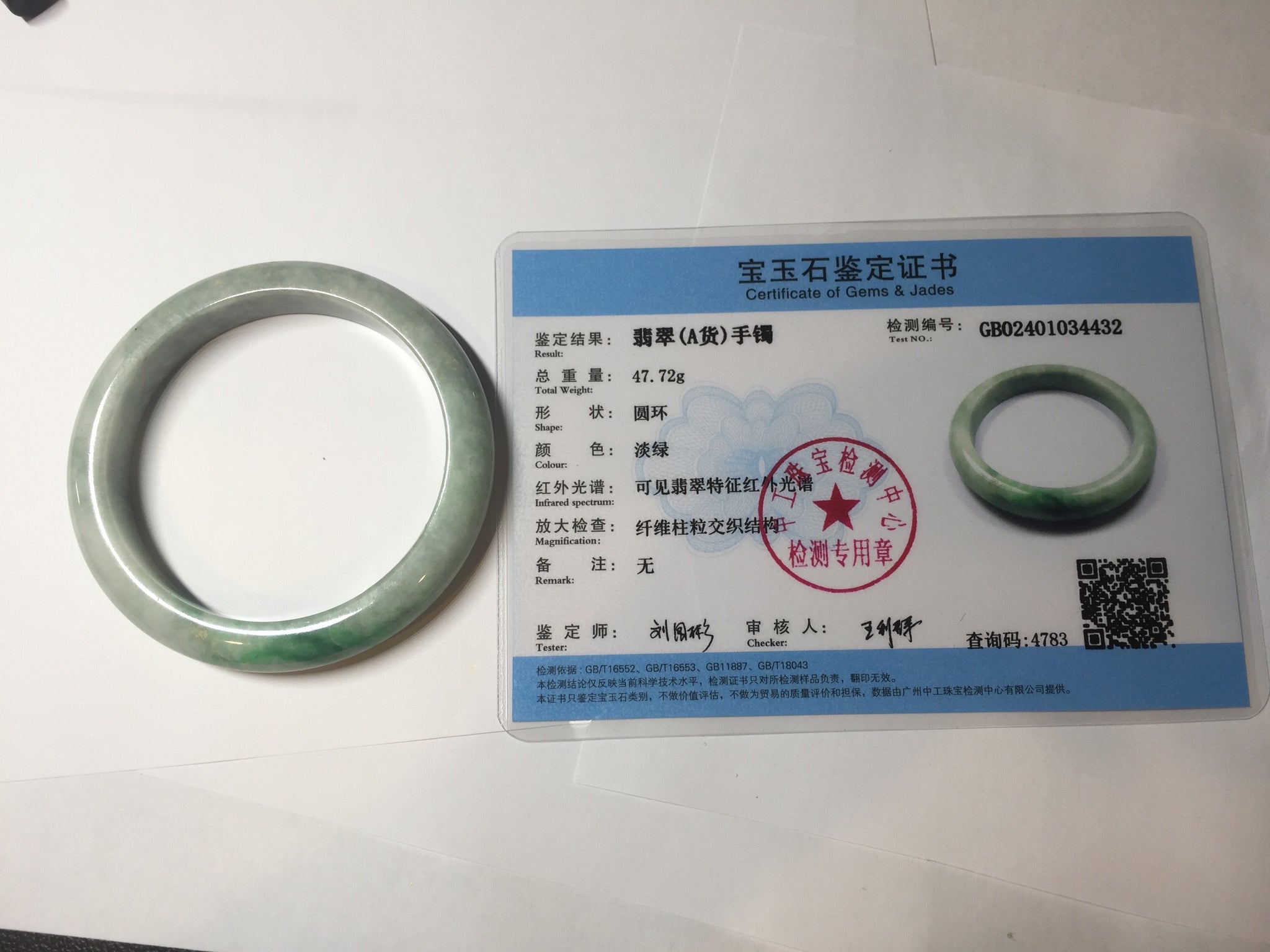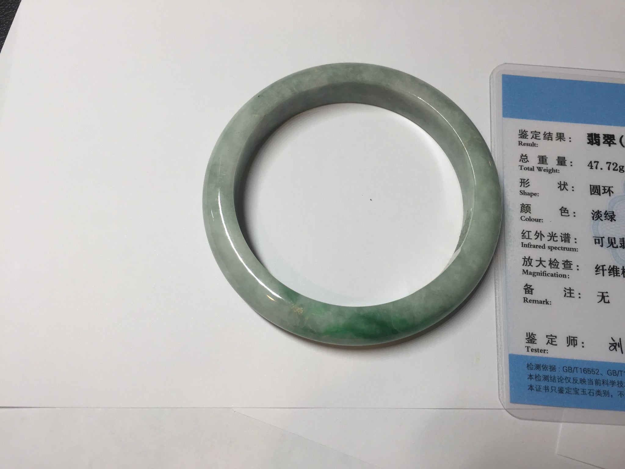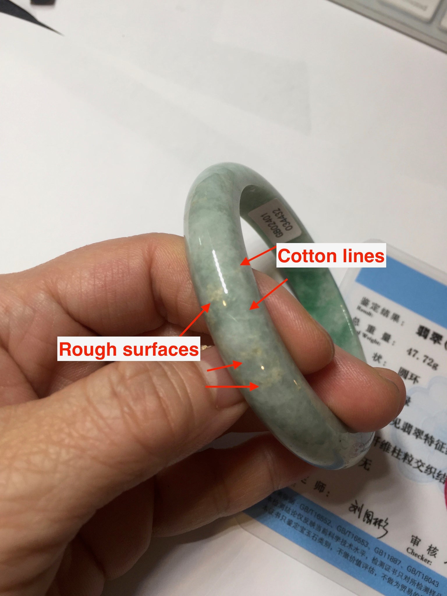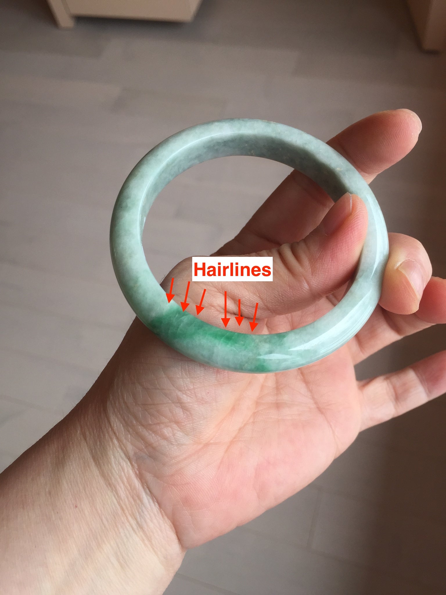 One surface crack. The bangle is still solid(Guaranteed!).  Some hairlines, small yellow rough surfaces, cotton lines, cotton spots, and cotton areas.  No transparent. Not watery.