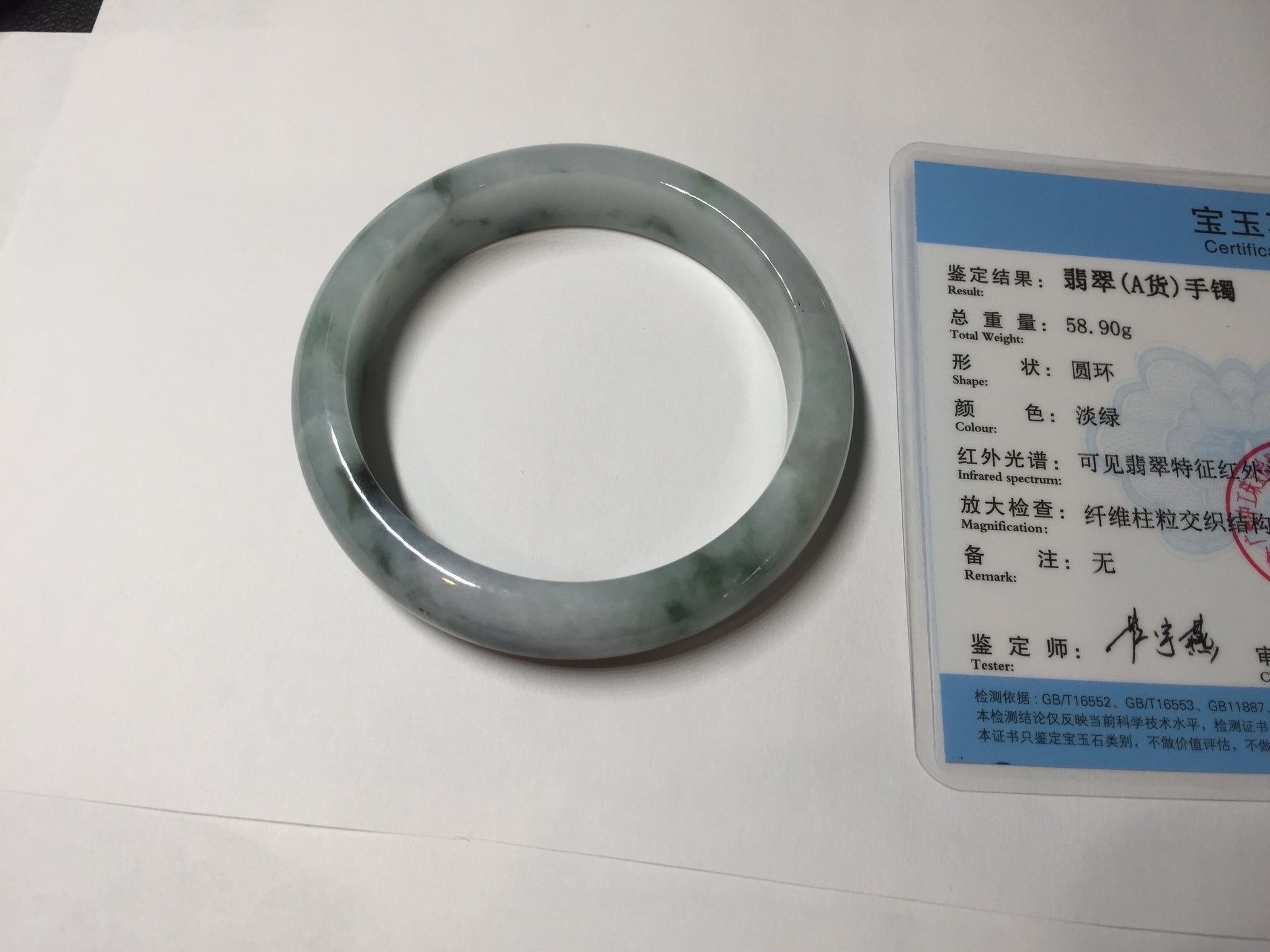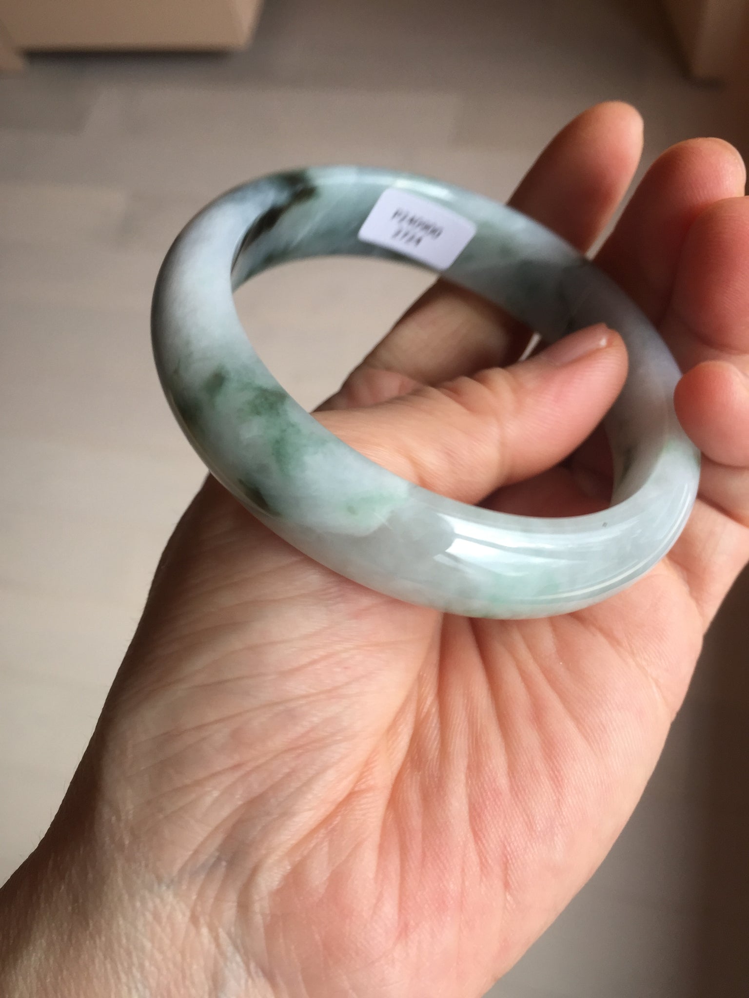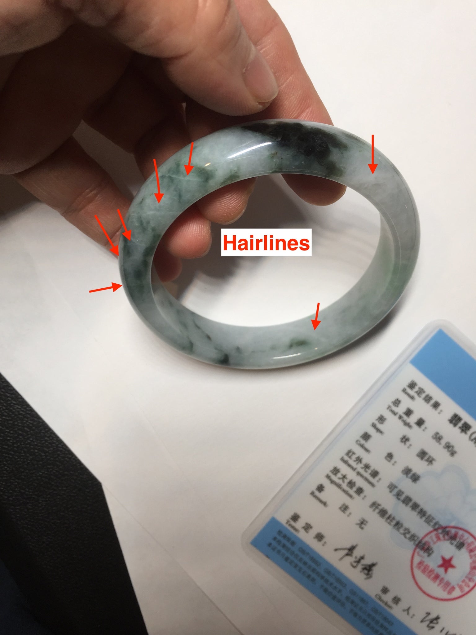 No crack. Quite a lots of hairlines. The bangle is solid(guaranteed!). Makes high pitched sound when clicked. Some cotton areas and lines.