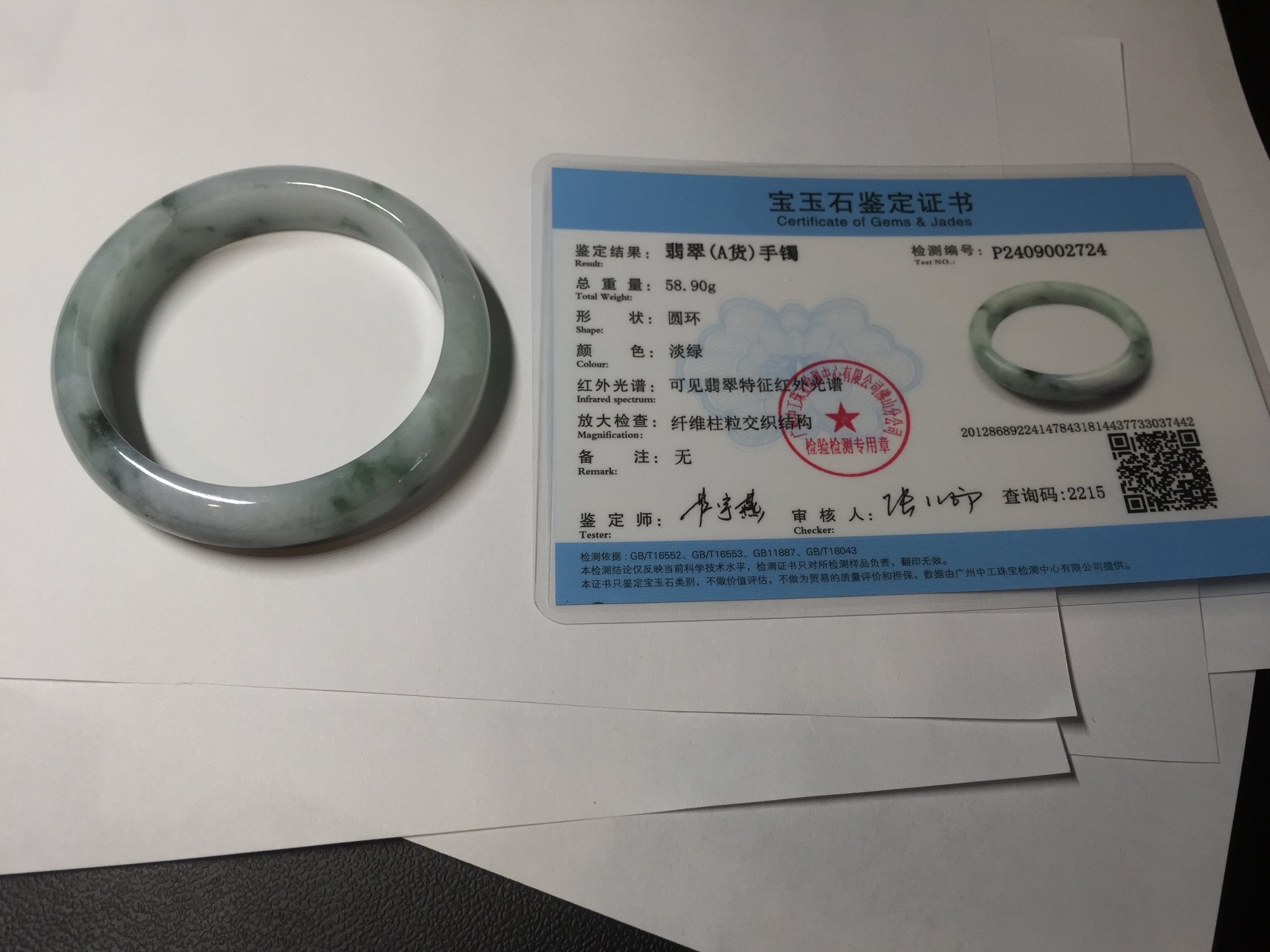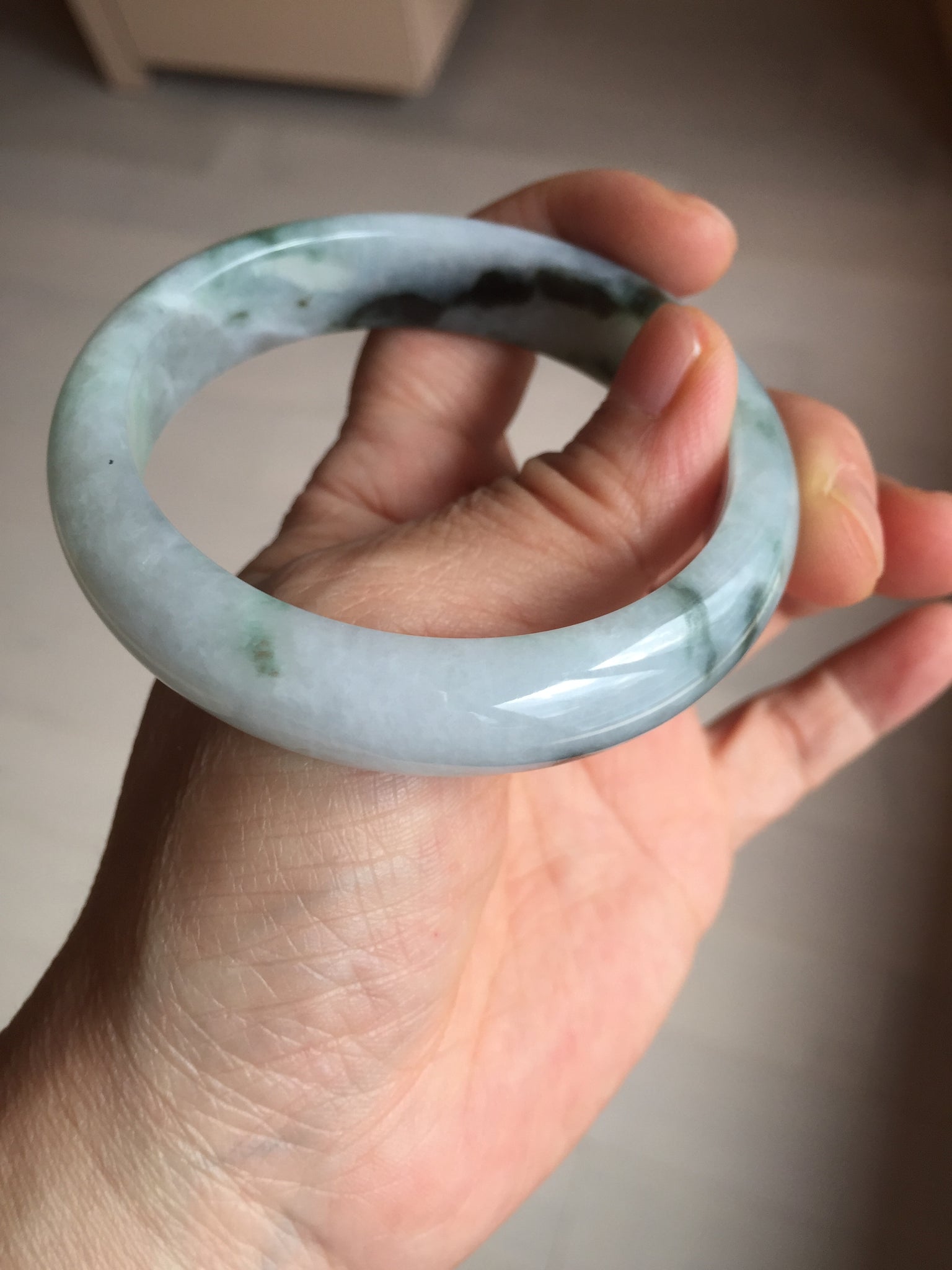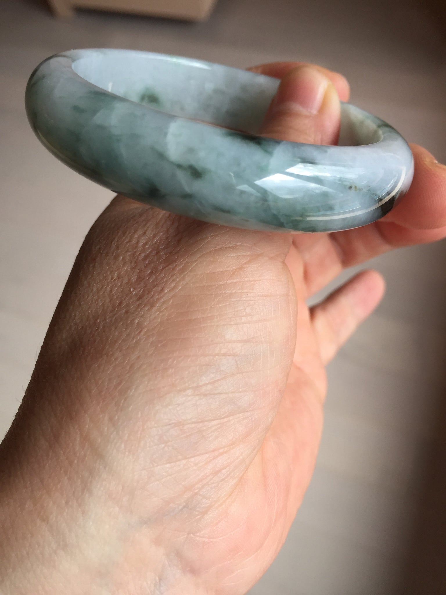 No crack. Quite a lots of hairlines. The bangle is solid(guaranteed!). Makes high pitched sound when clicked. Some cotton areas and lines.