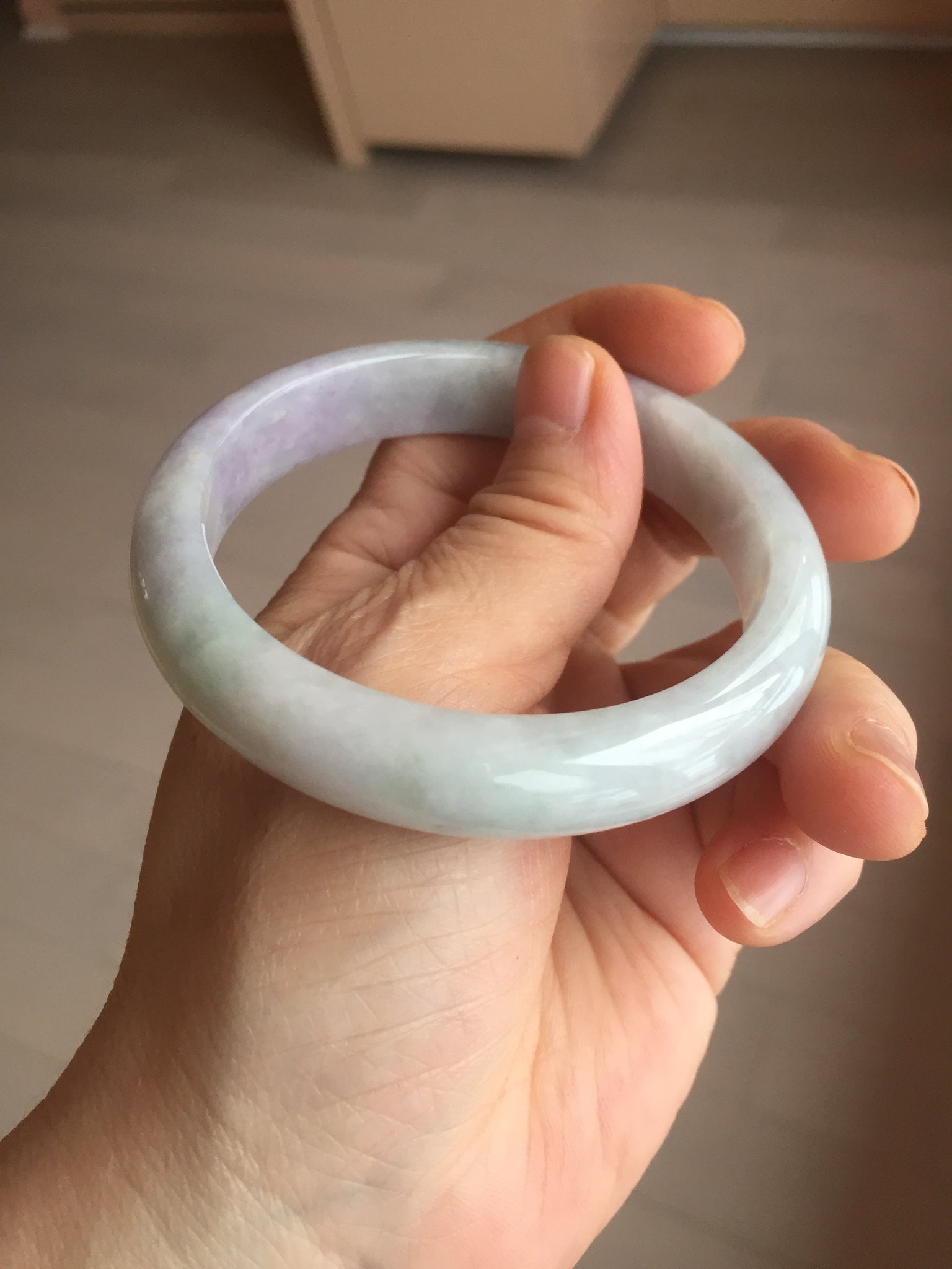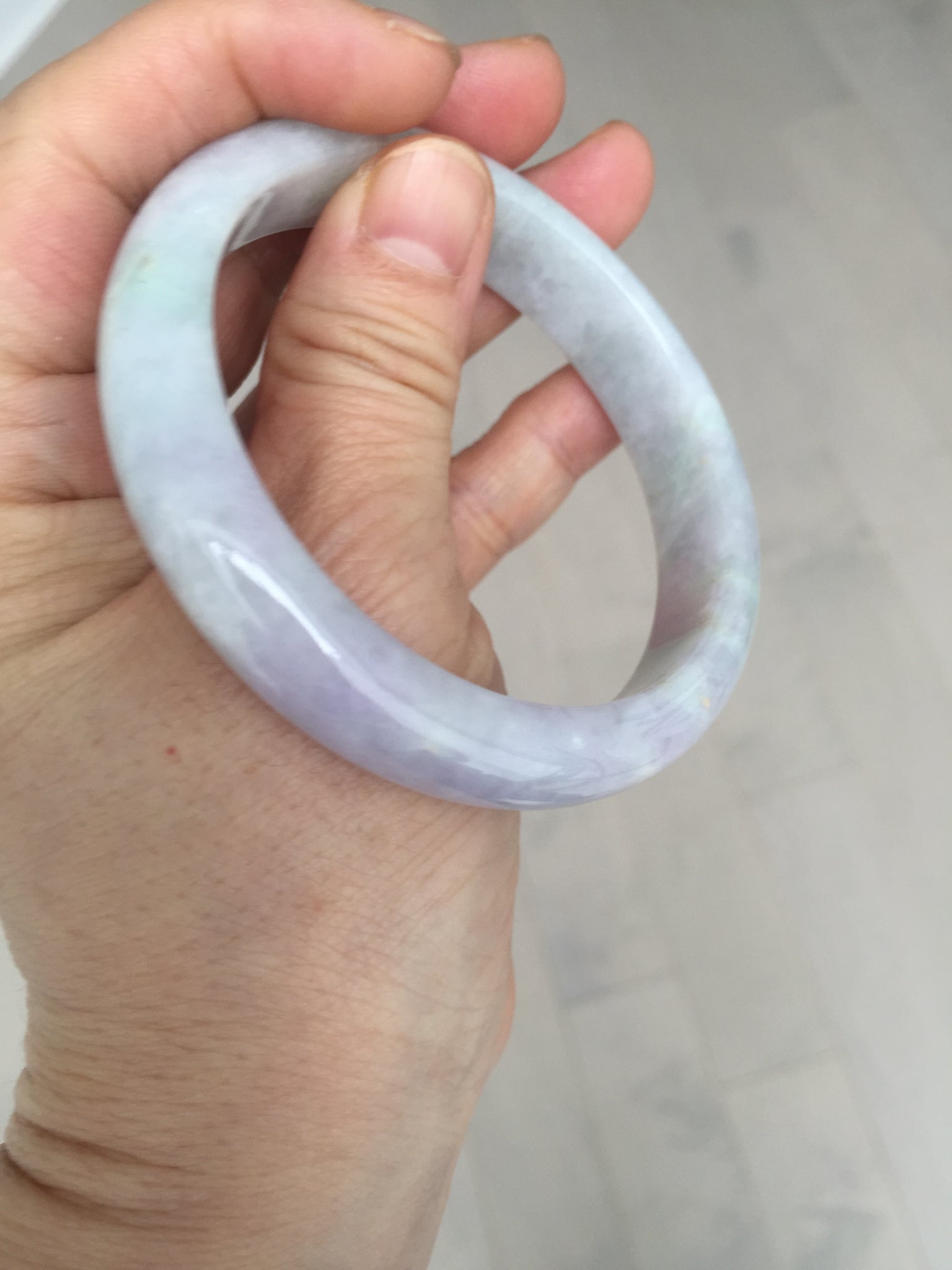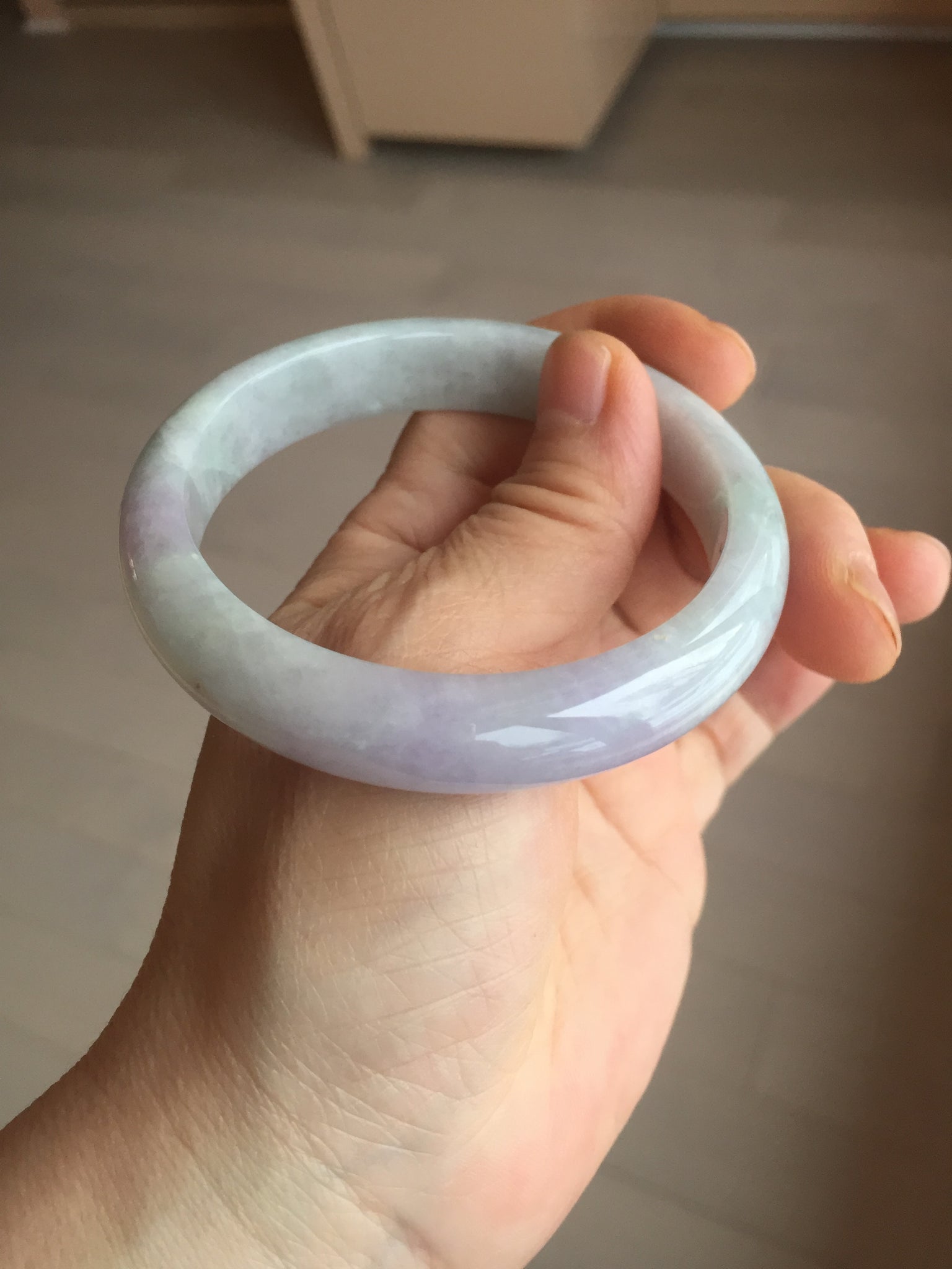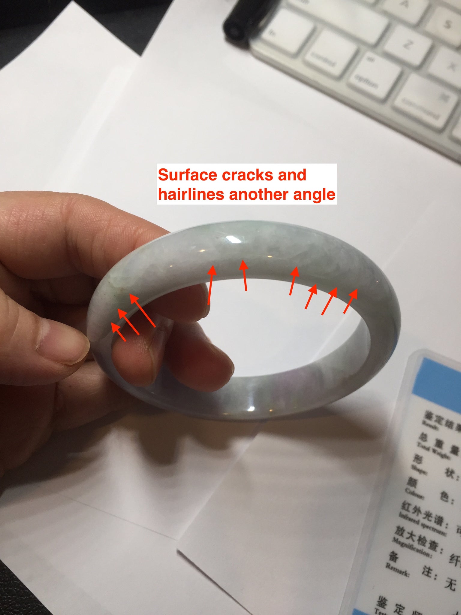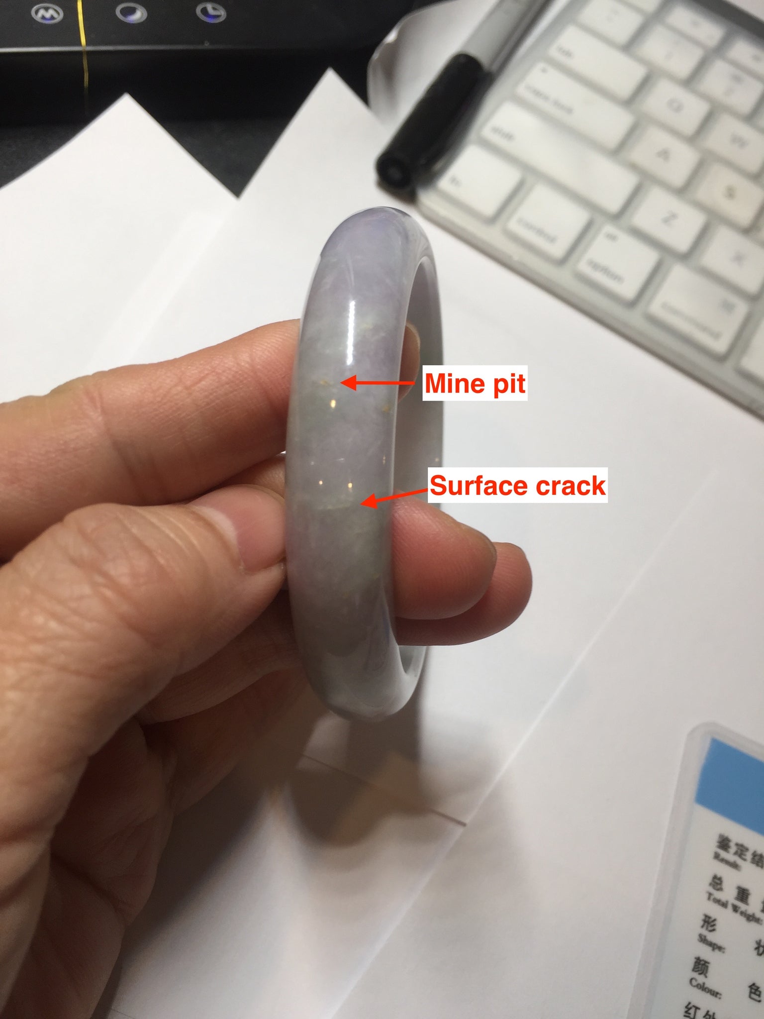 One surface crack. The bangle is solid(Guaranteed). Some hairlines, cotton lines, and small rough surface. (Photos may not show all). Not transparent. The purple is lighter than in the photos due to the purple color always being more camera-friendly.
