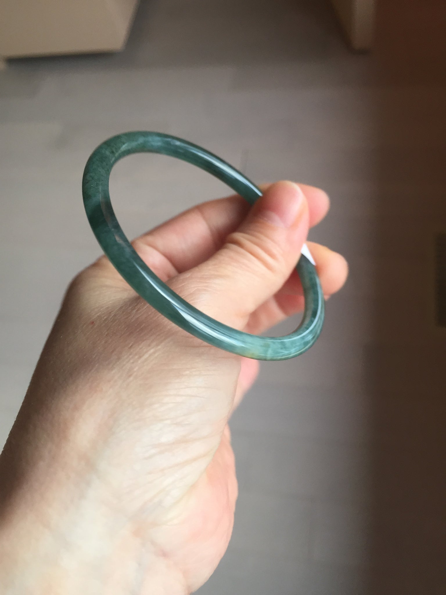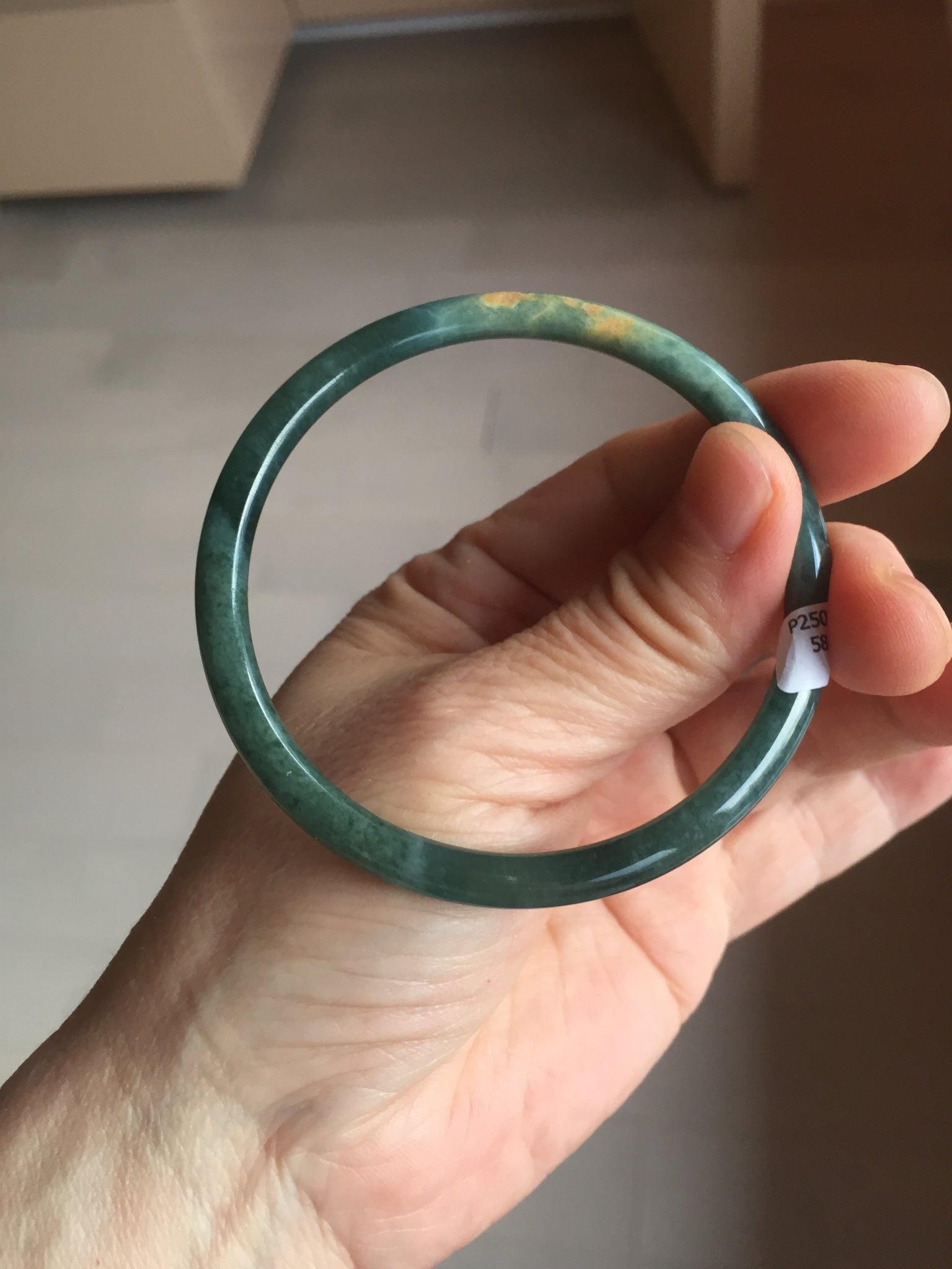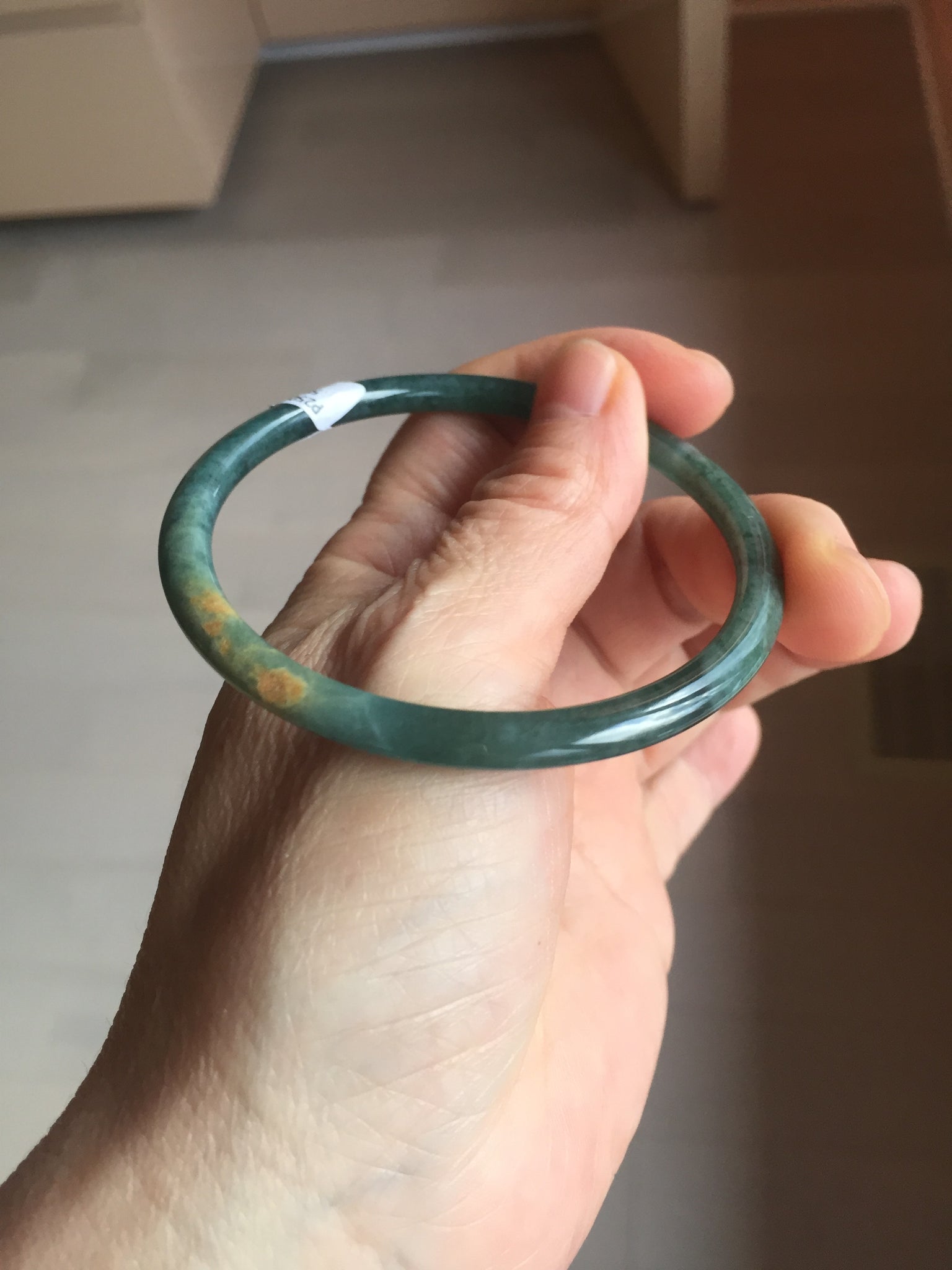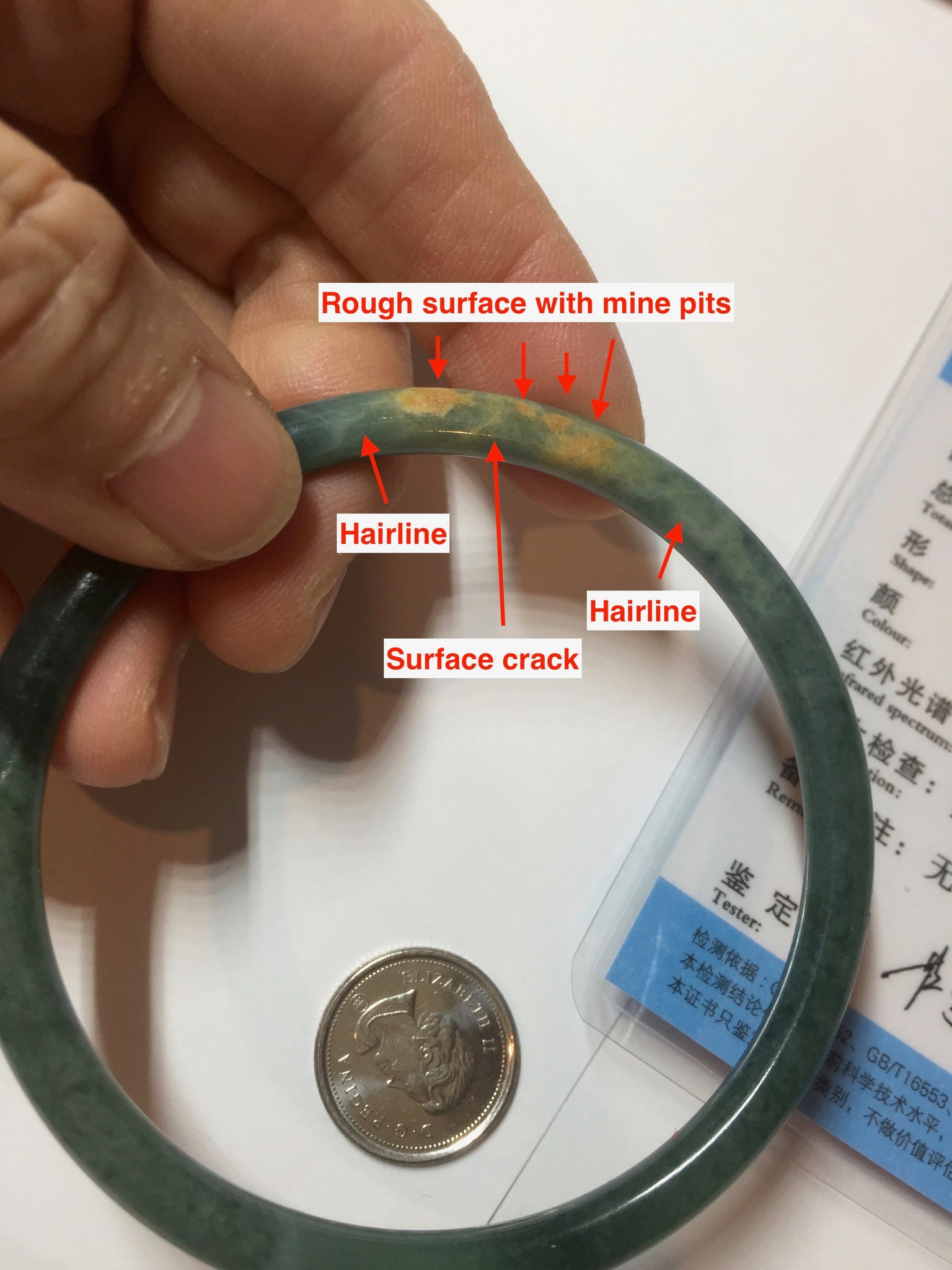 Two surface cracks. Some hairlines. Some yellow rough surfaces. Some cotton areas, cotton lines, and cotton spots. Not transparent . The bangle has some gray/ black color.