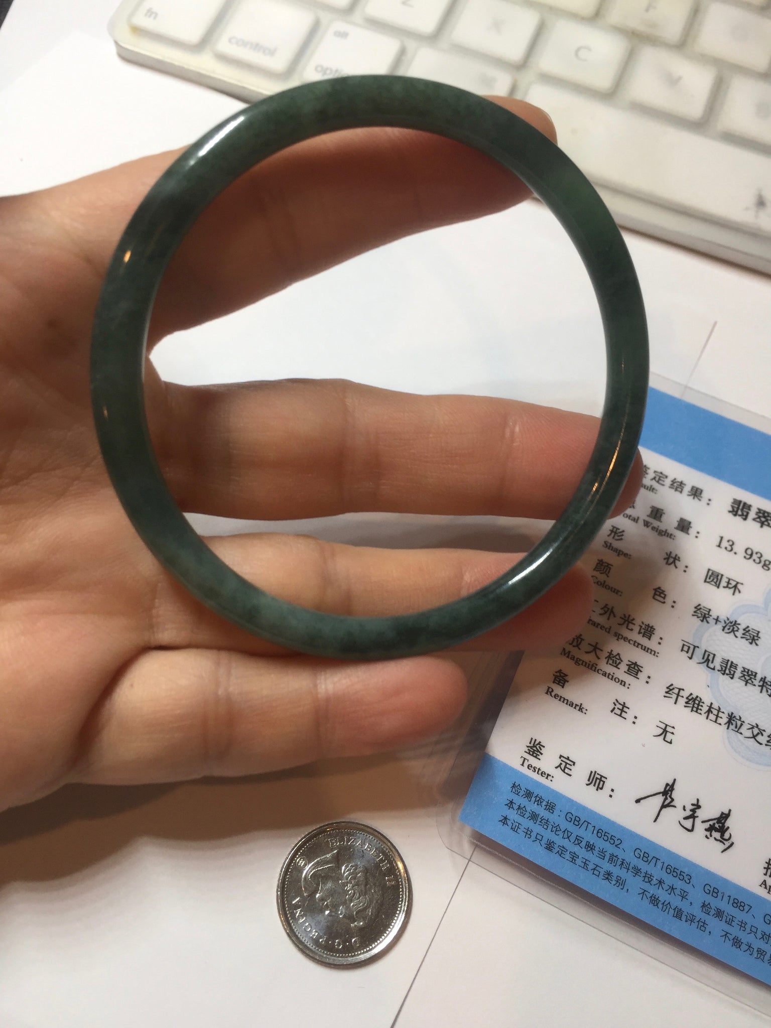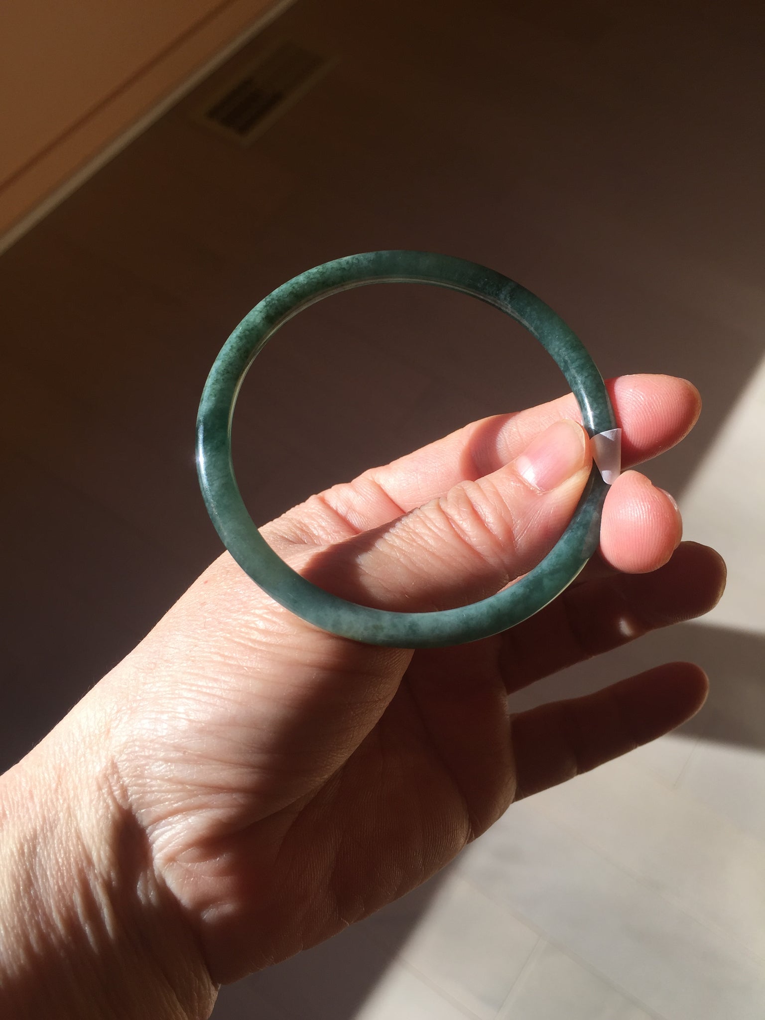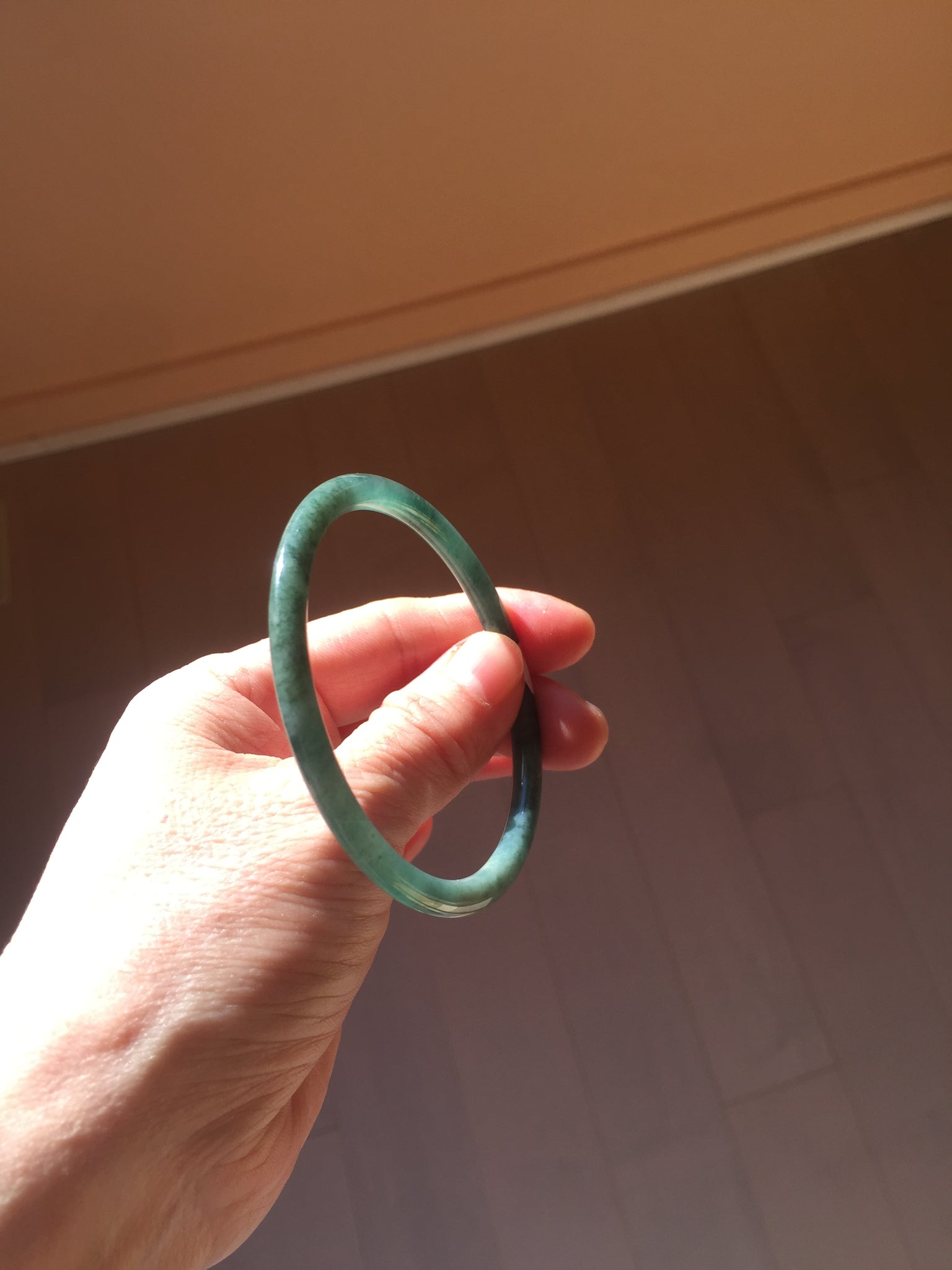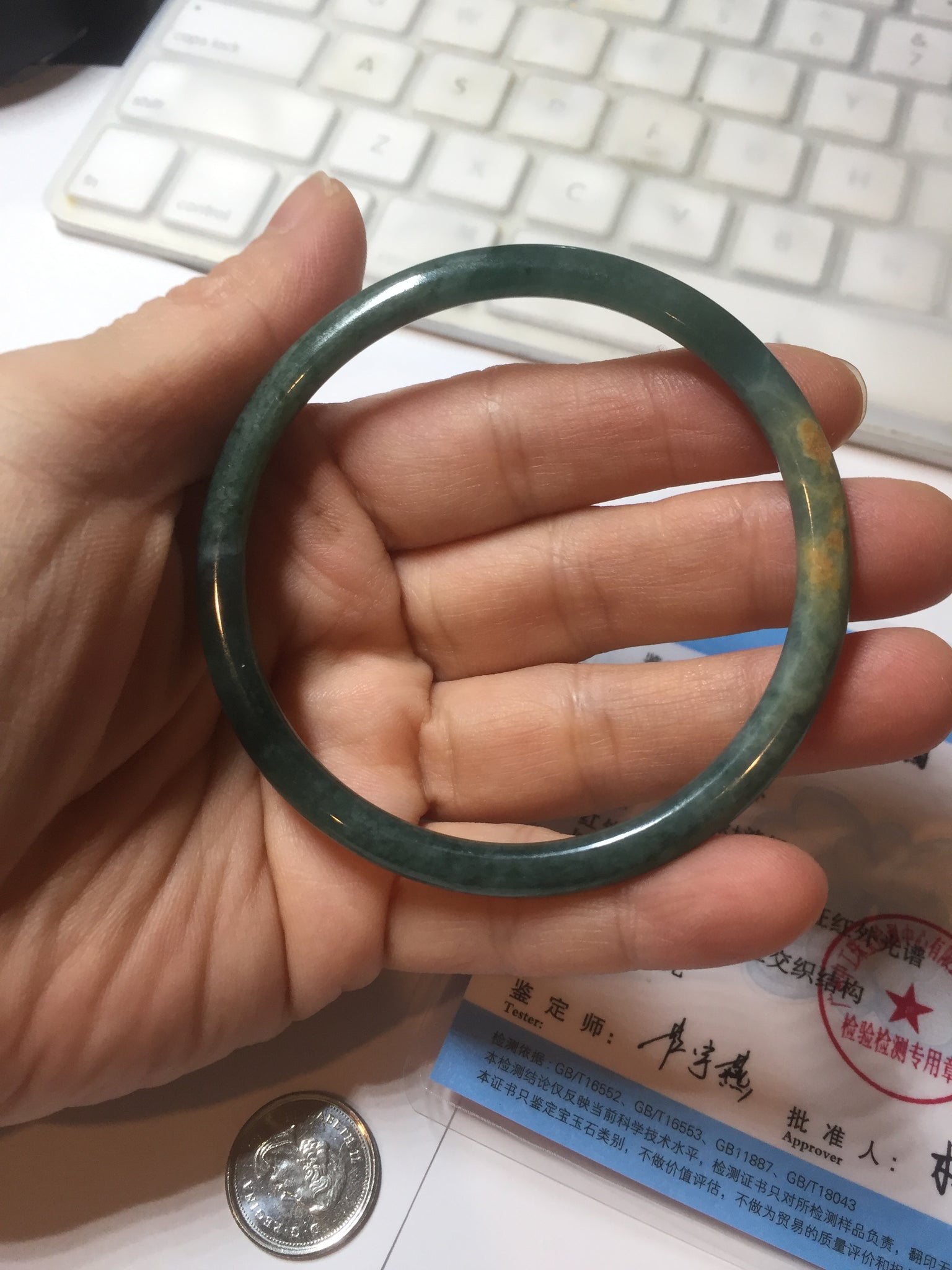 Two surface cracks. Some hairlines. Some yellow rough surfaces. Some cotton areas, cotton lines, and cotton spots. Not transparent . The bangle has some gray/ black color.
