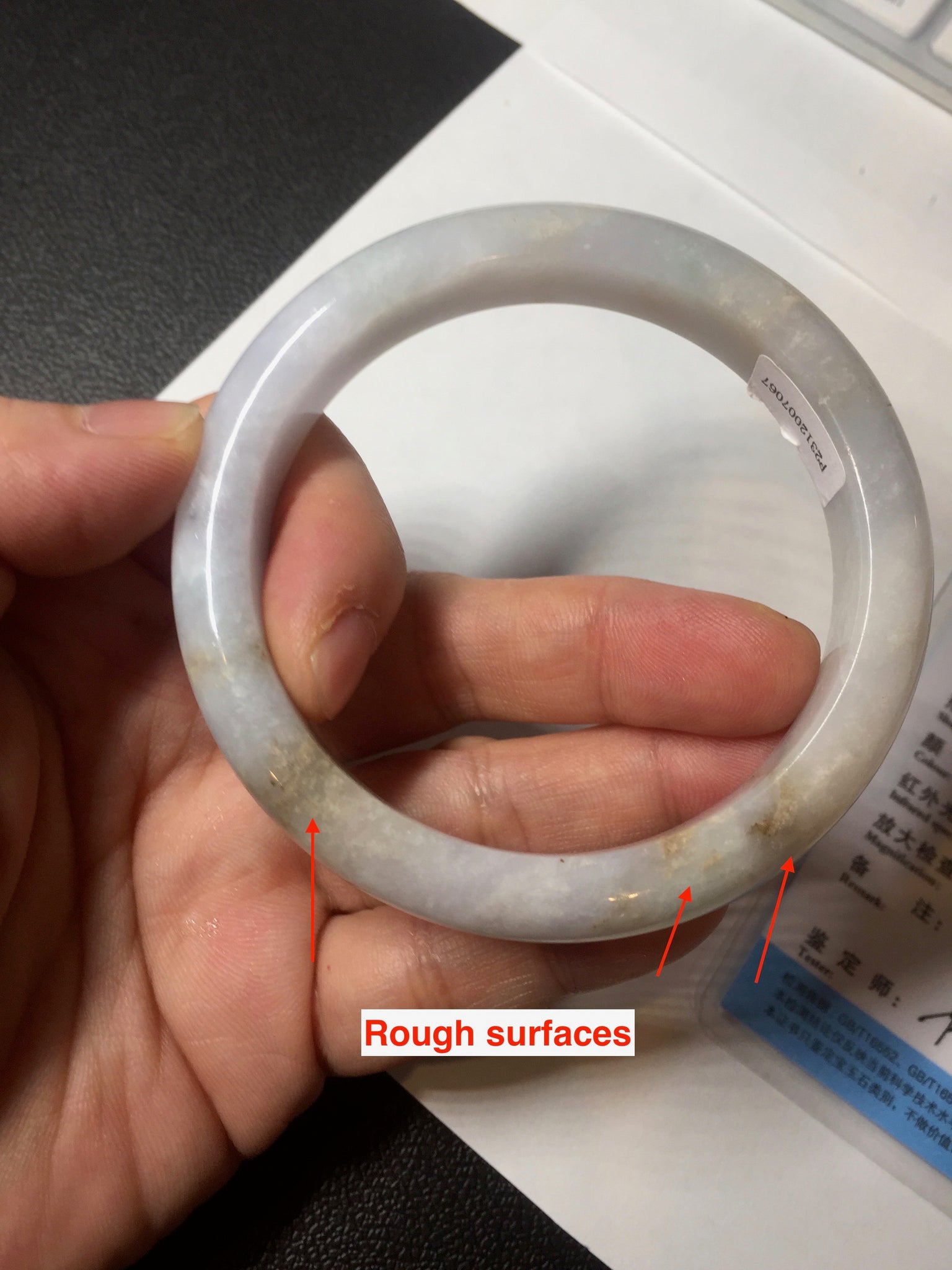Some cracks with the wax. Some hairlines. The bangle is solid (Guaranteed!). Some cotton lines and relatively big cotton areas. Some rough surfaces with mine pits and wax. One cotton area with a rough surface that has waxed in it.