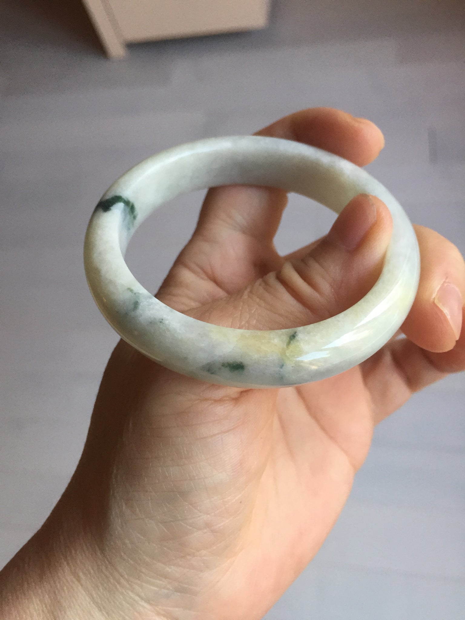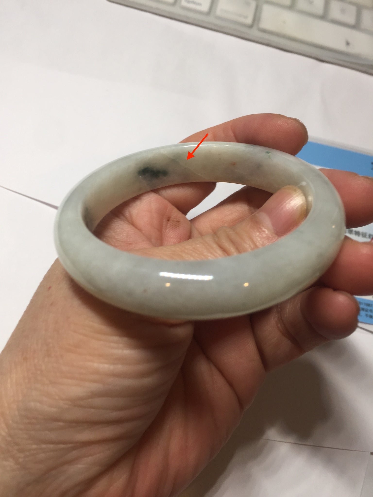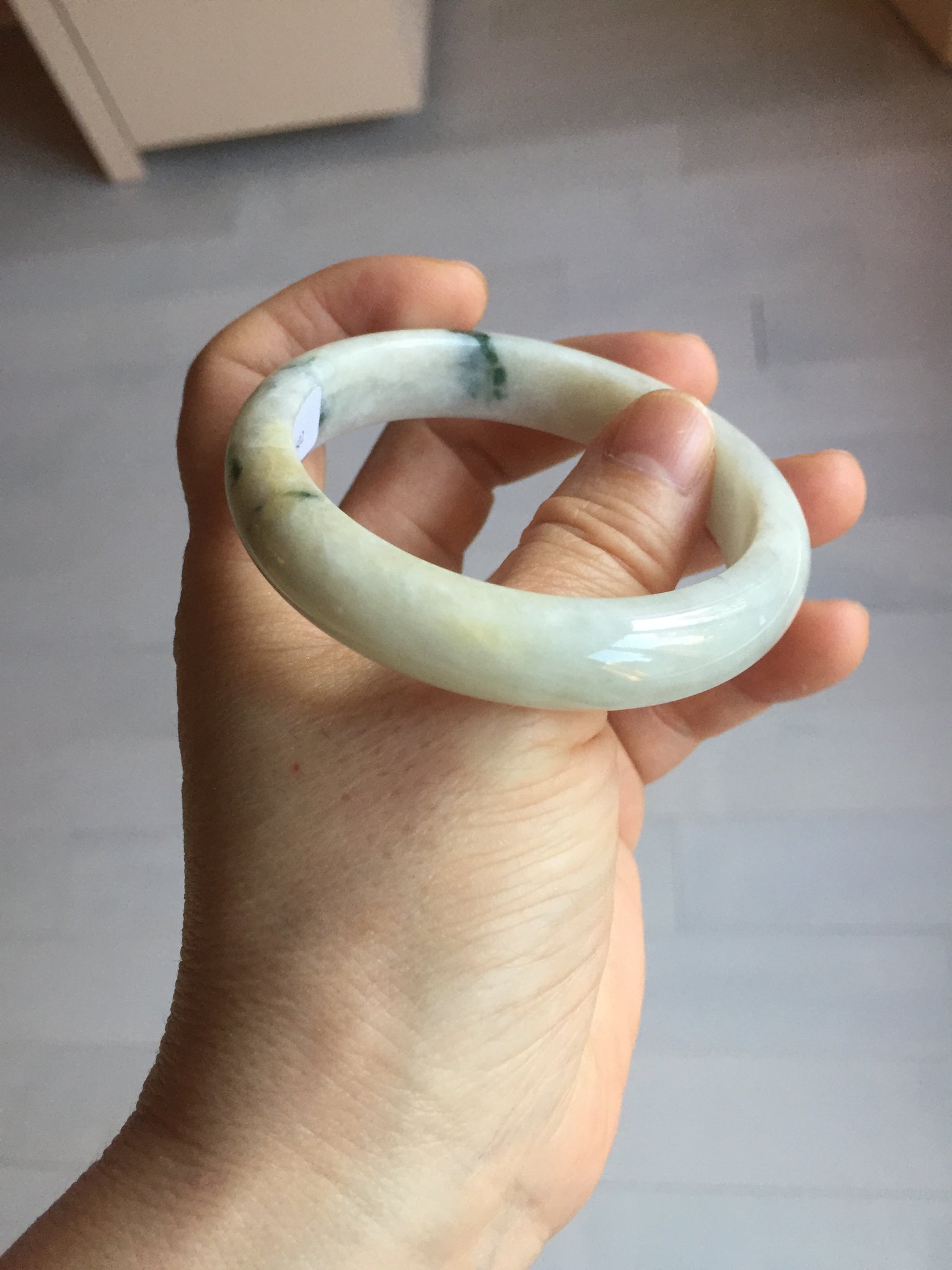 Some cracks. One is an around the bangle. The bangle is solid. Yellow rough surface. Some color roots, cotton lines, cotton areas, and cotton spots. porcelain background. Not transparent.