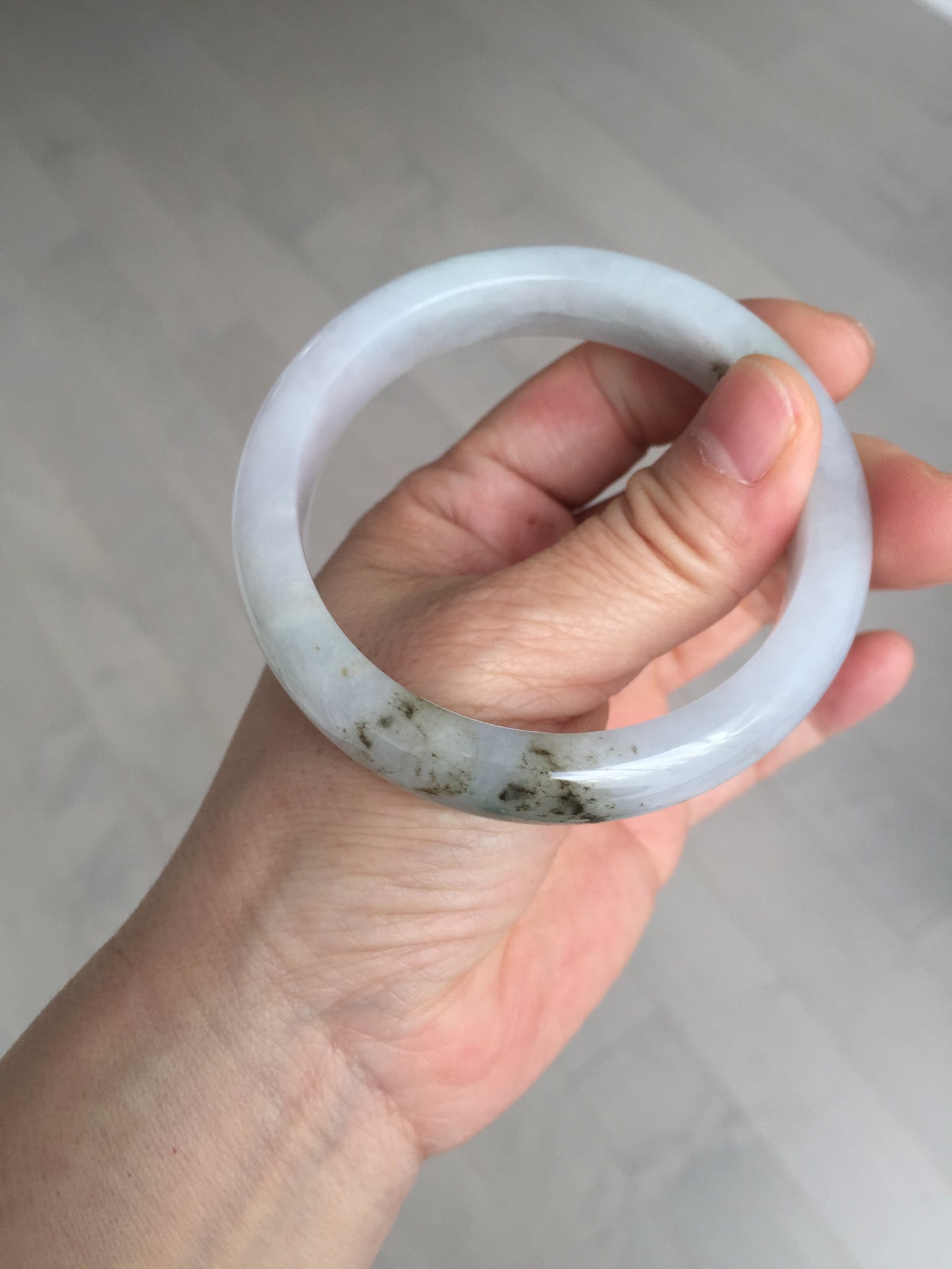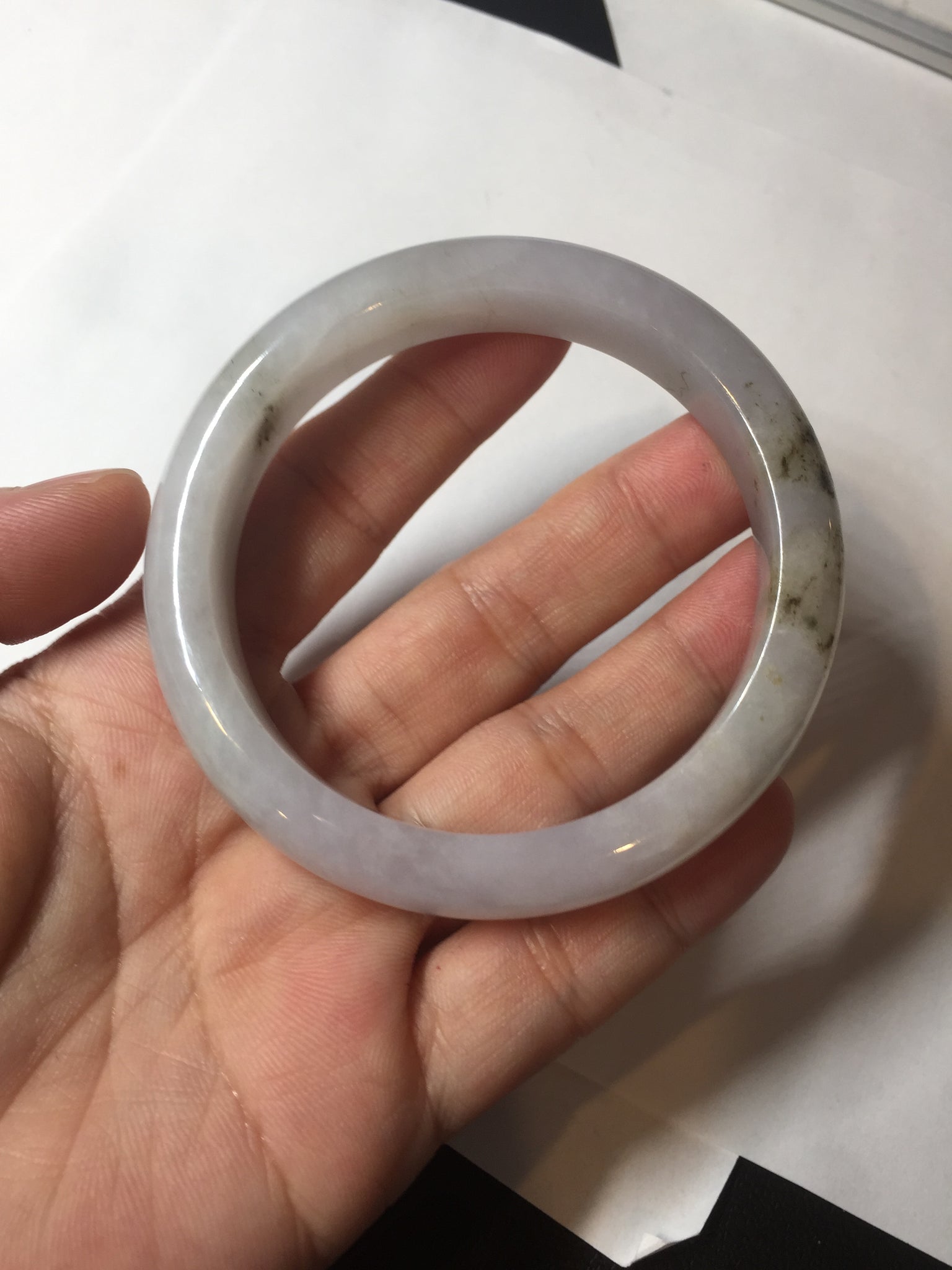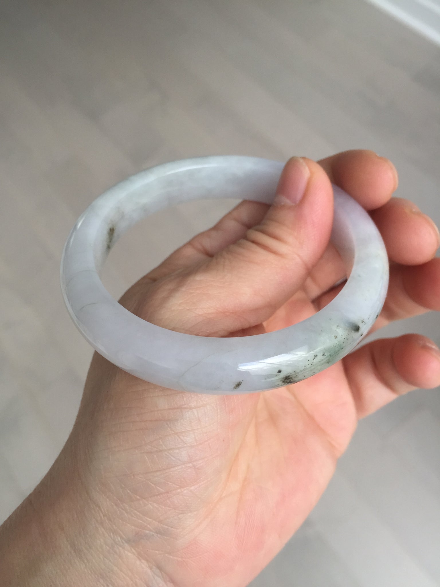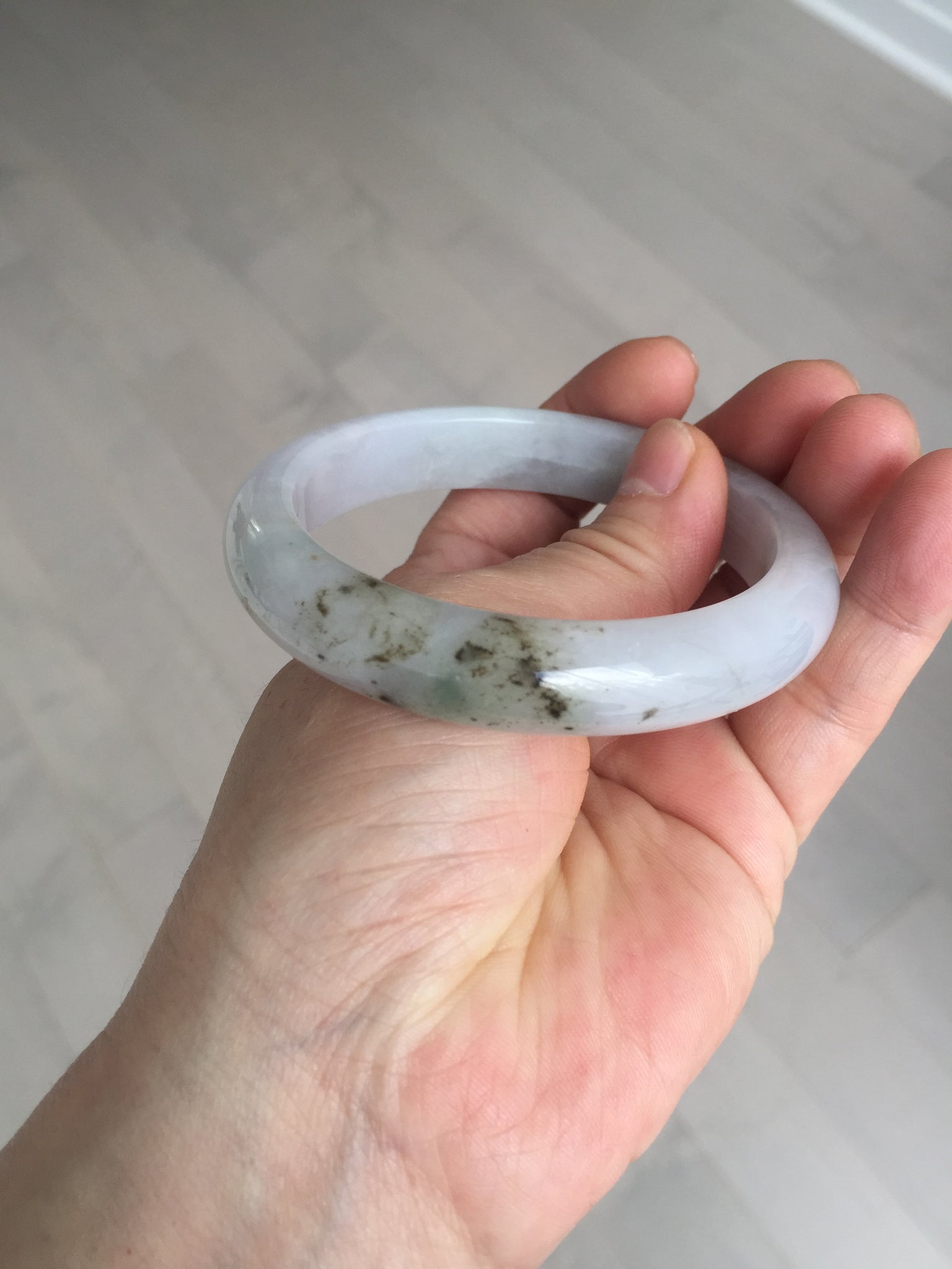 No cracks. Some hairlines. The bangle is solid (Guaranteed!). Some cotton lines and cotton areas, black/ brown spots and areas with rough surfaces. The purple is super light and it is only a hint of it.
