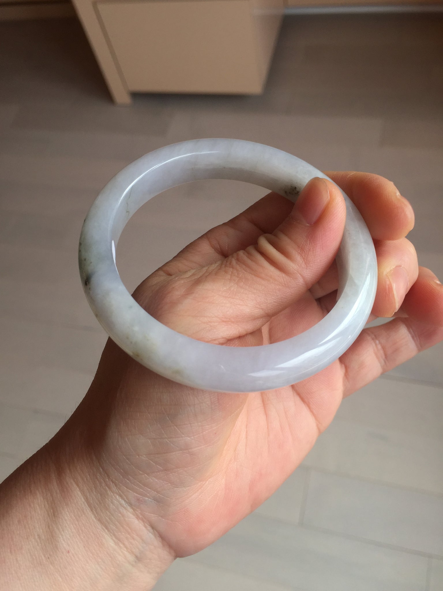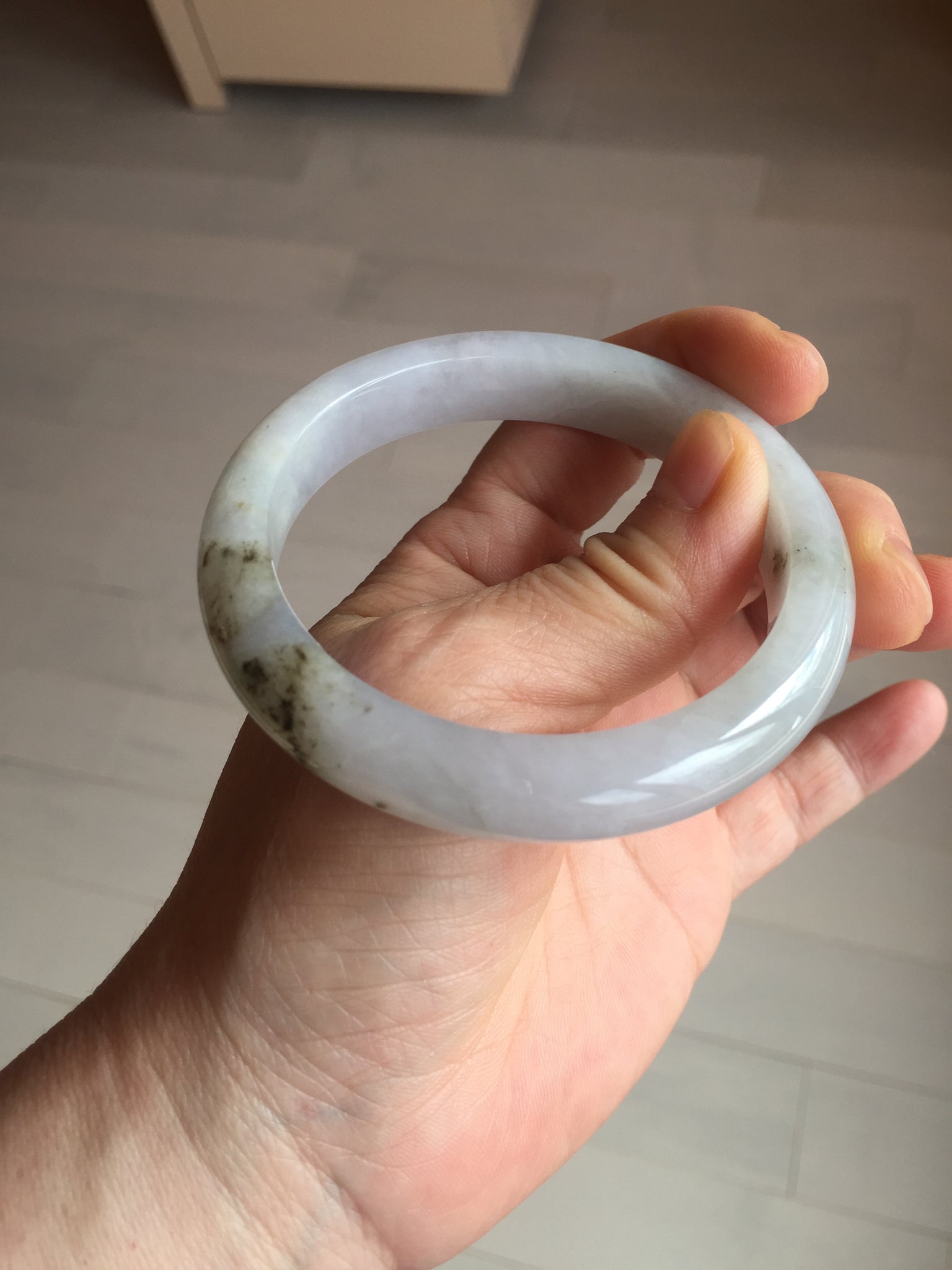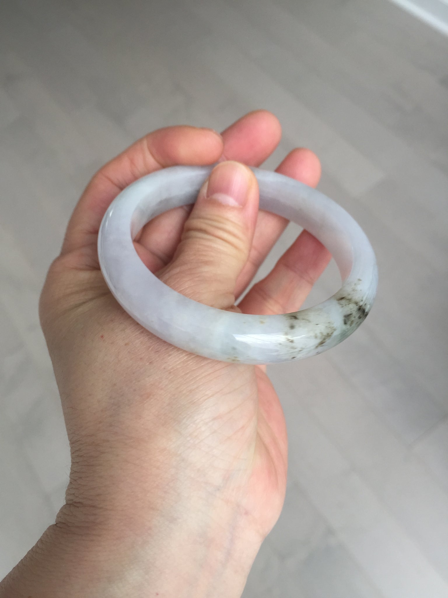 No cracks. Some hairlines. The bangle is solid (Guaranteed!). Some cotton lines and cotton areas, black/ brown spots and areas with rough surfaces. The purple is super light and it is only a hint of it.