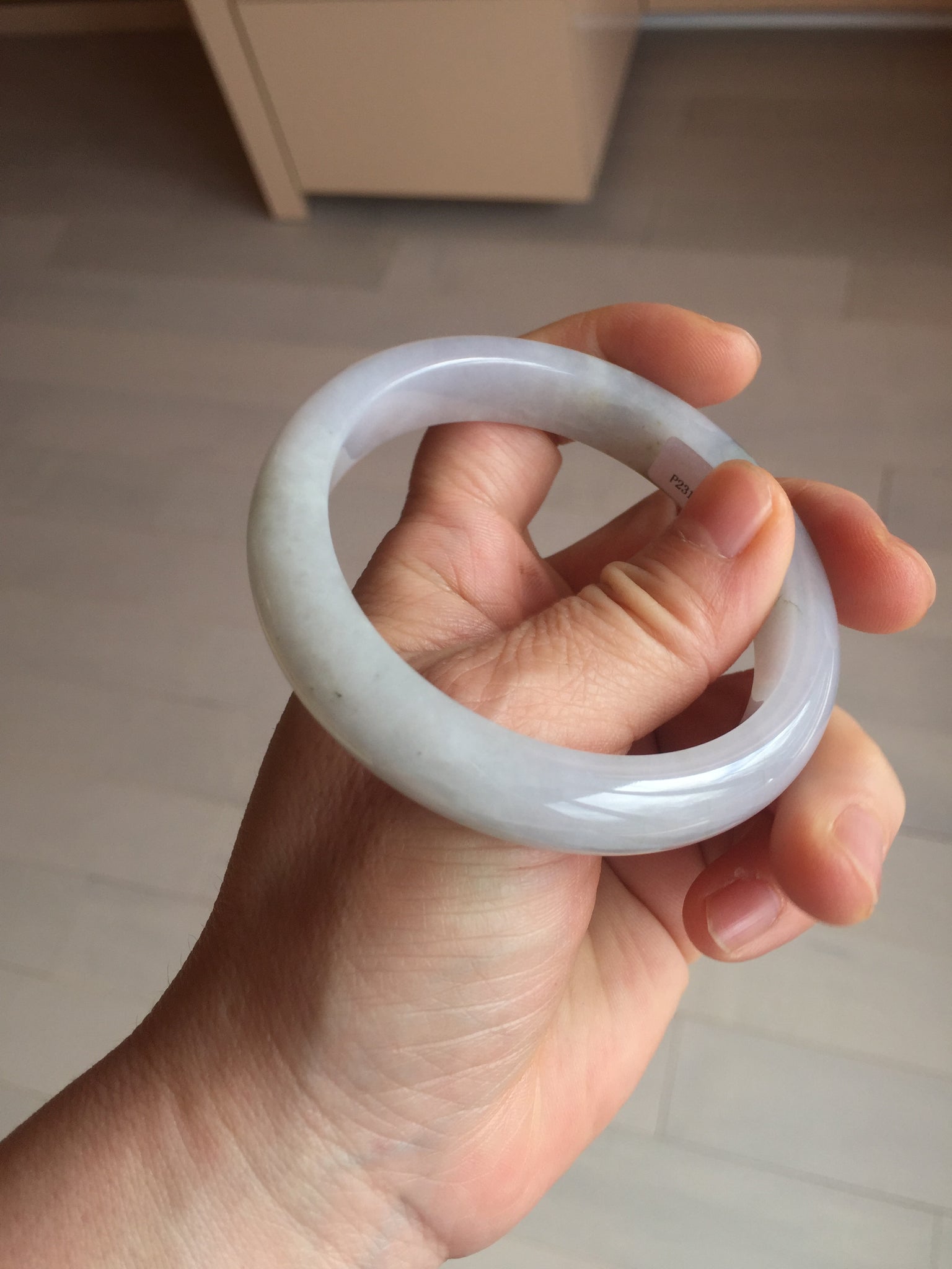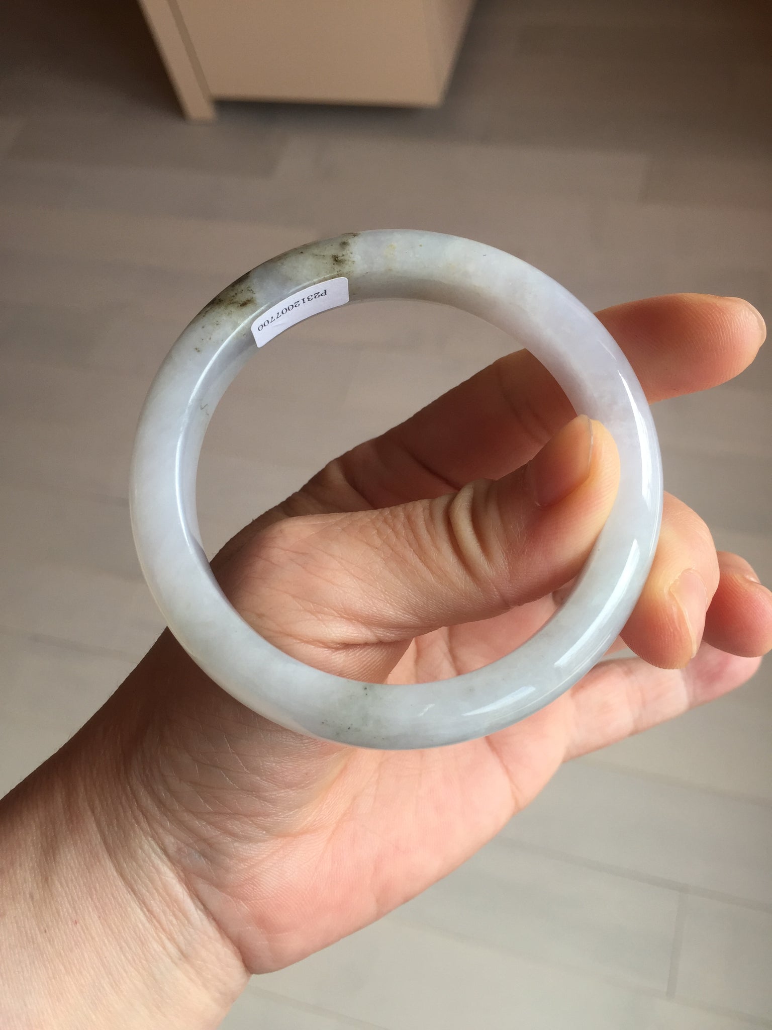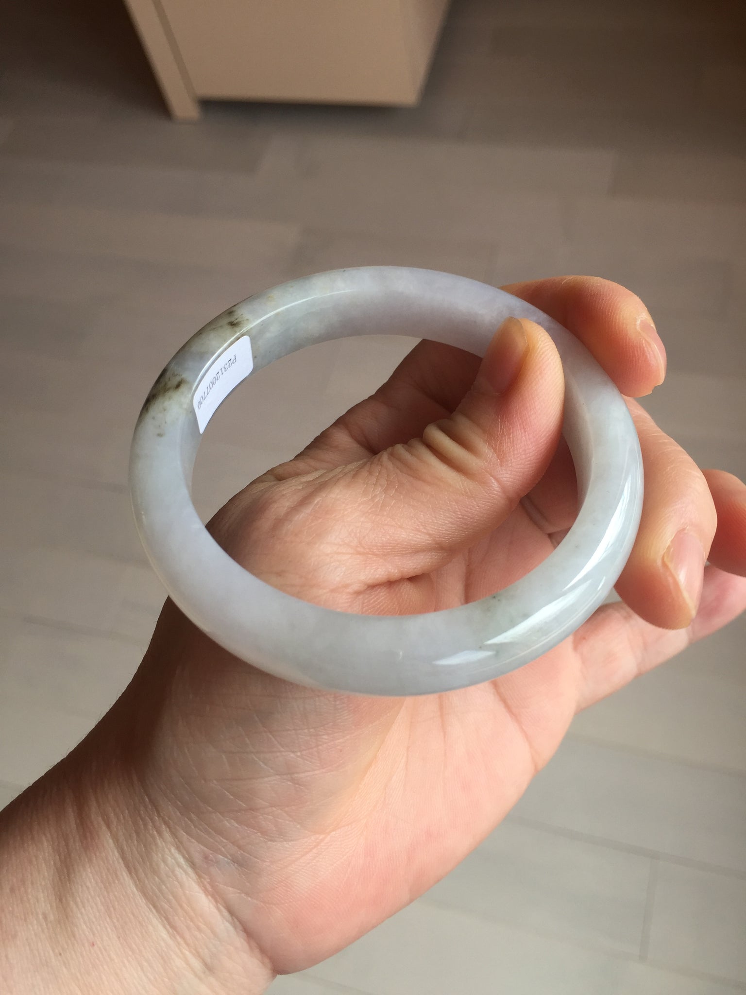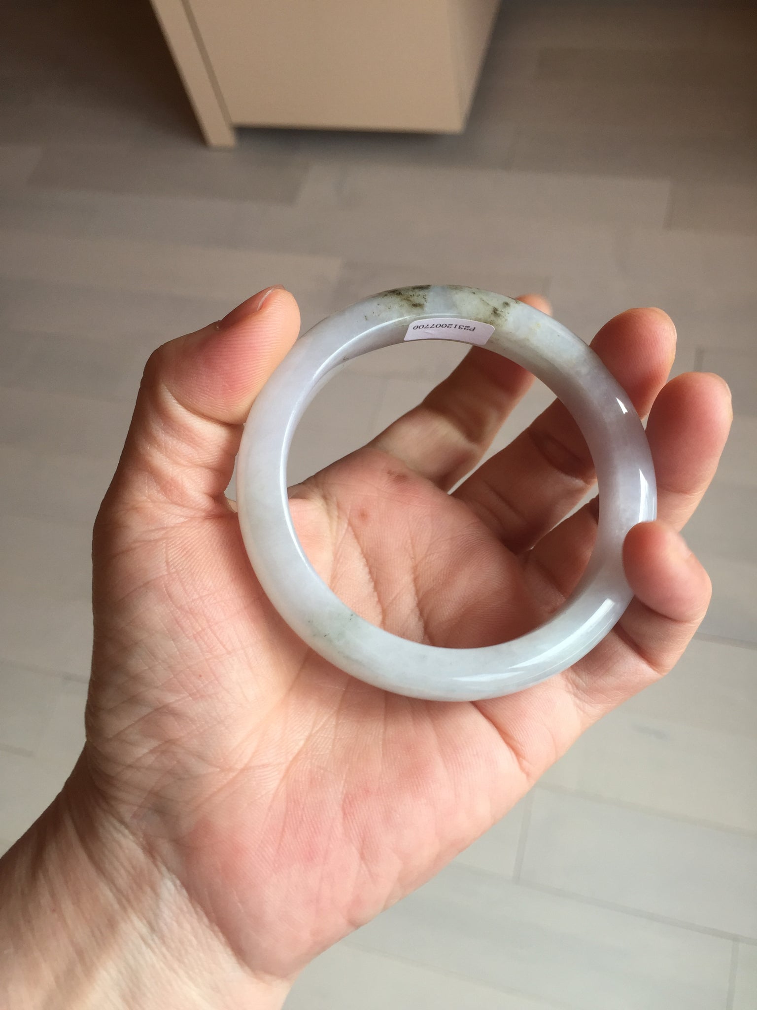 No cracks. Some hairlines. The bangle is solid (Guaranteed!). Some cotton lines and cotton areas, black/ brown spots and areas with rough surfaces. The purple is super light and it is only a hint of it.
