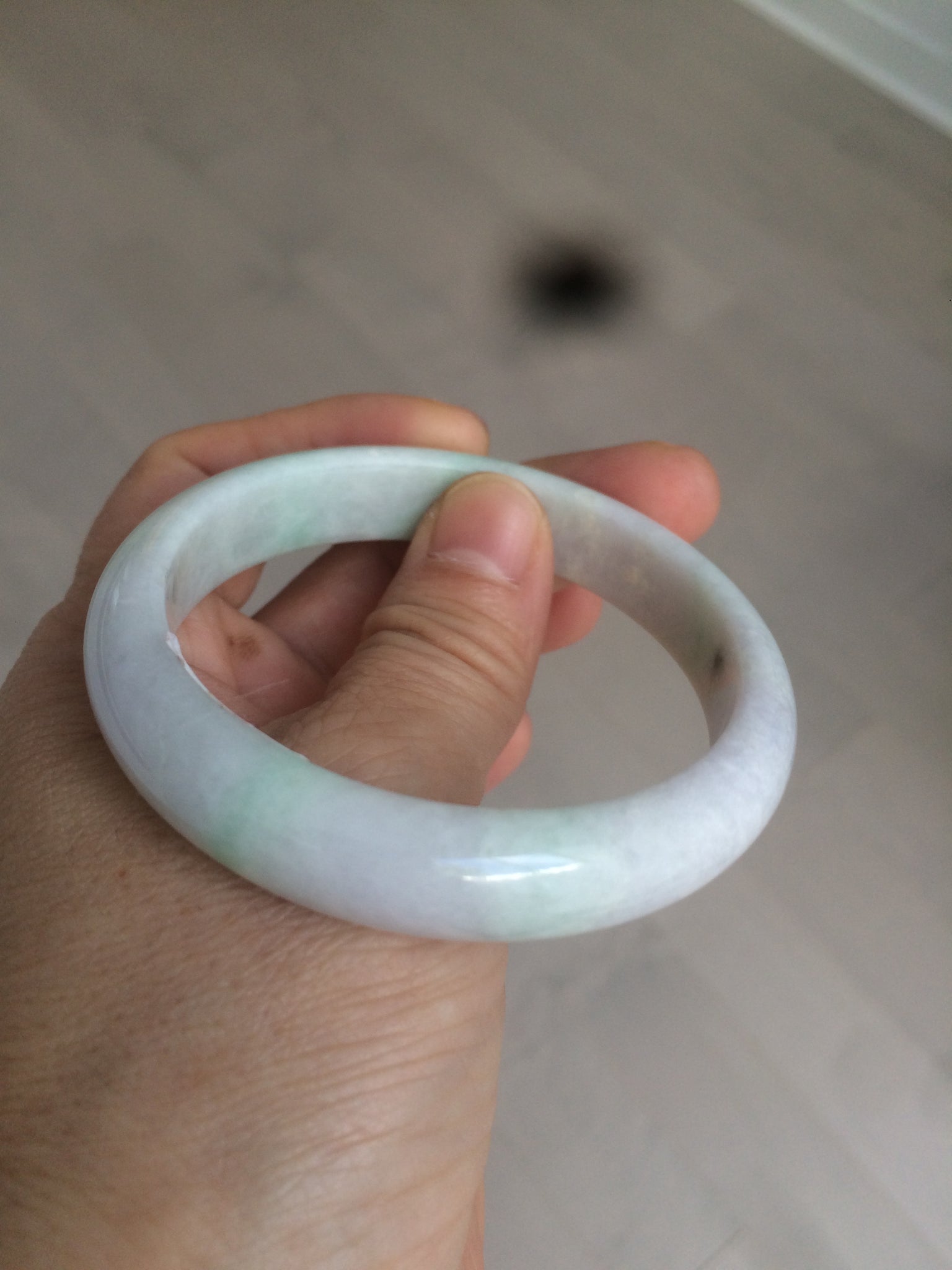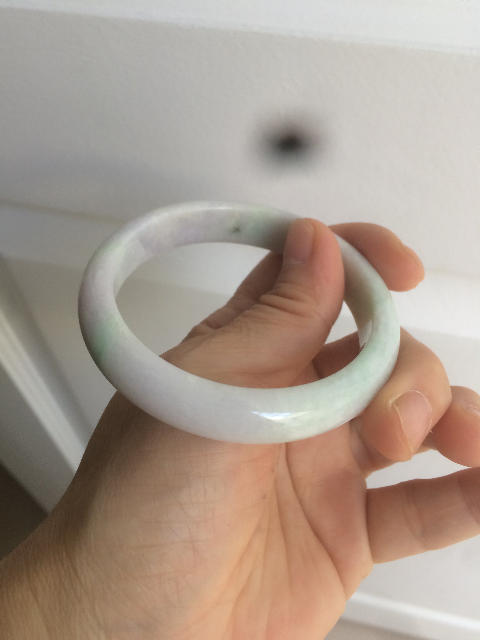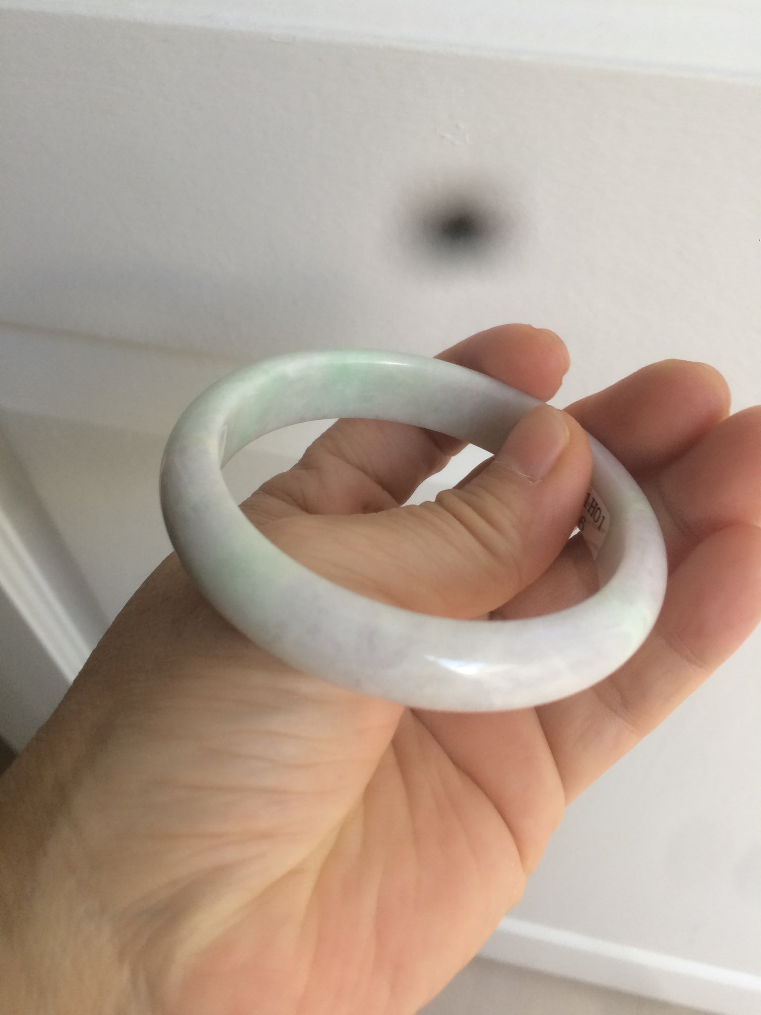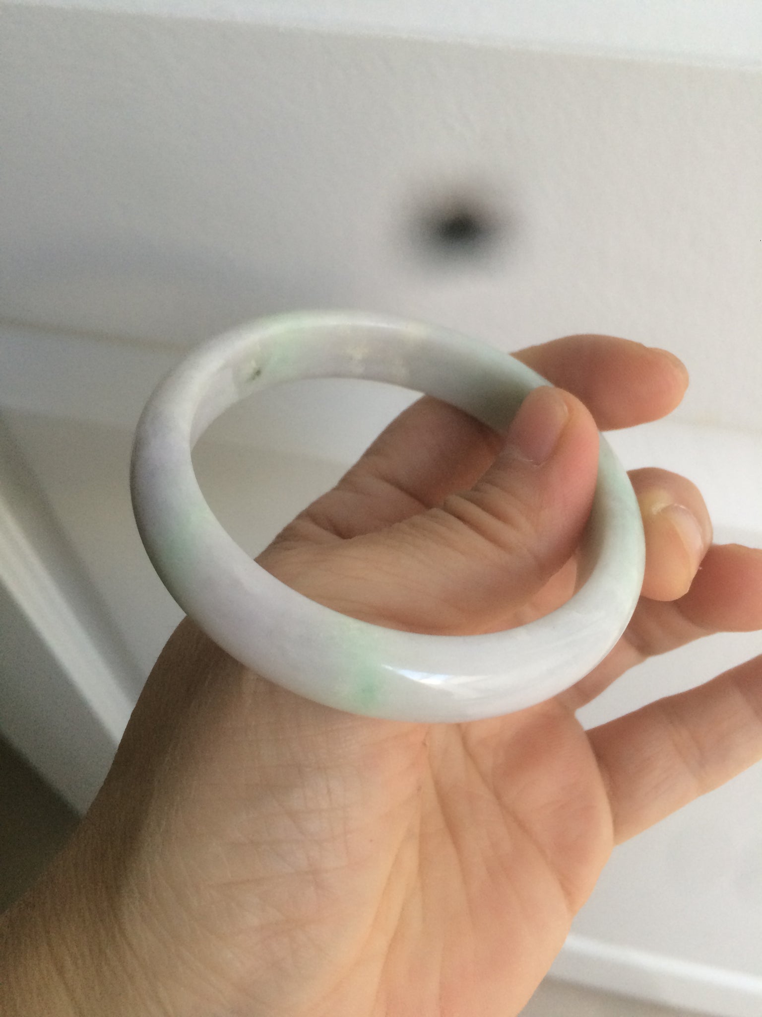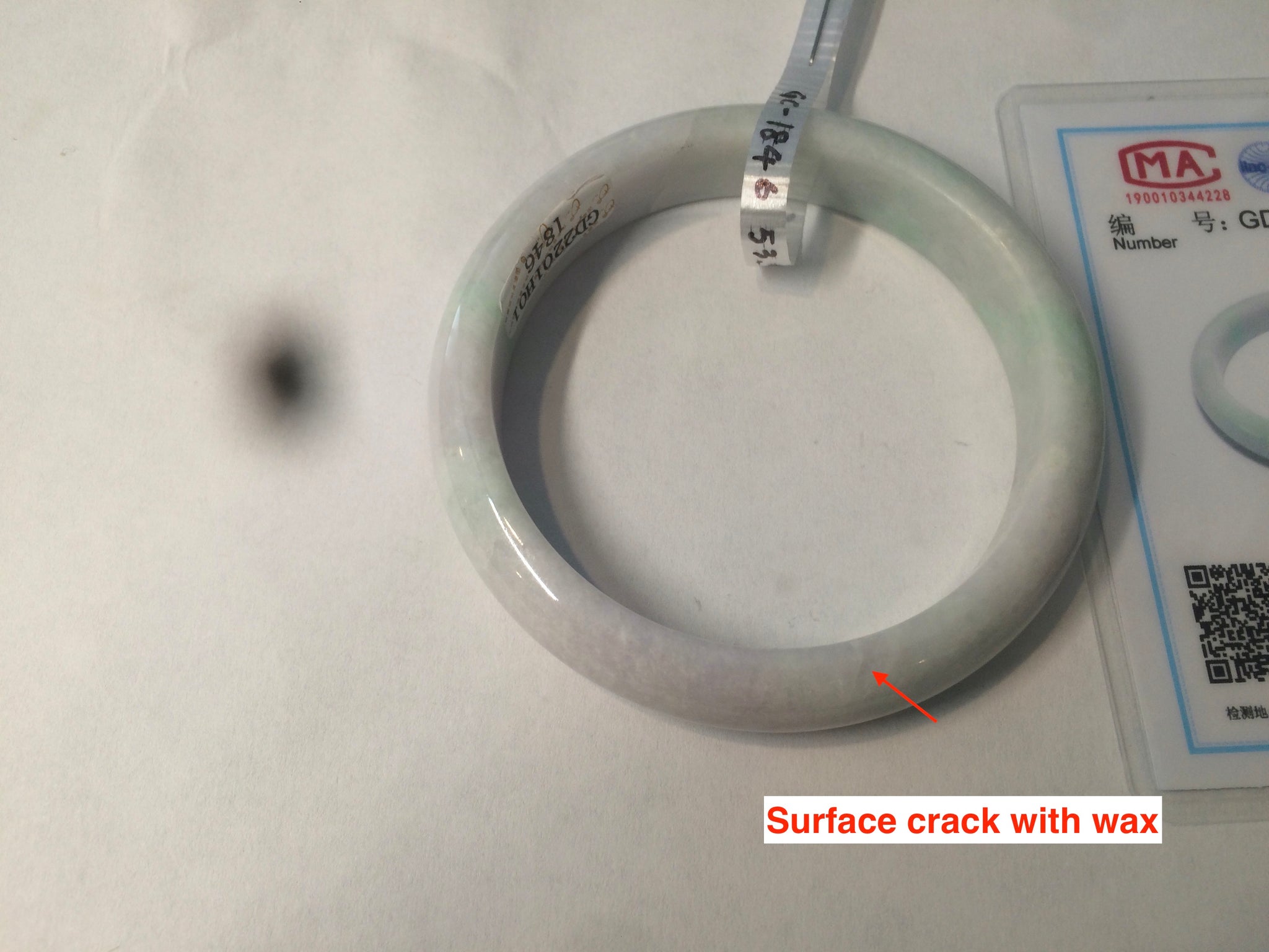 Imperfections: One crack with wax, almost around the bangle (the two end are not connected). This crack may decrease the firmness of the bangle. A tight fit is NOT recommended. Another surface crack. Some rough surfaces with wax. Not watery. Not transparent. Dry texture. The purple is lighter than in the photos.