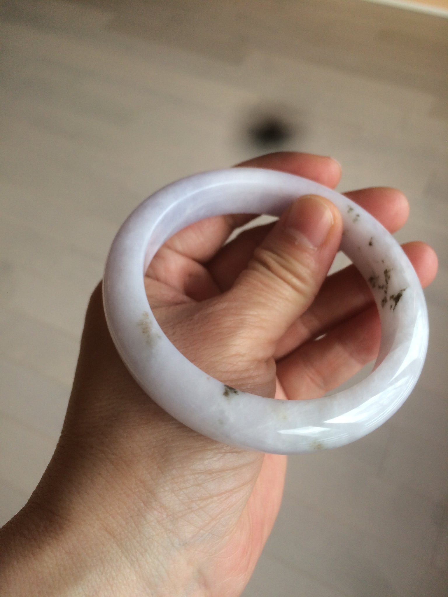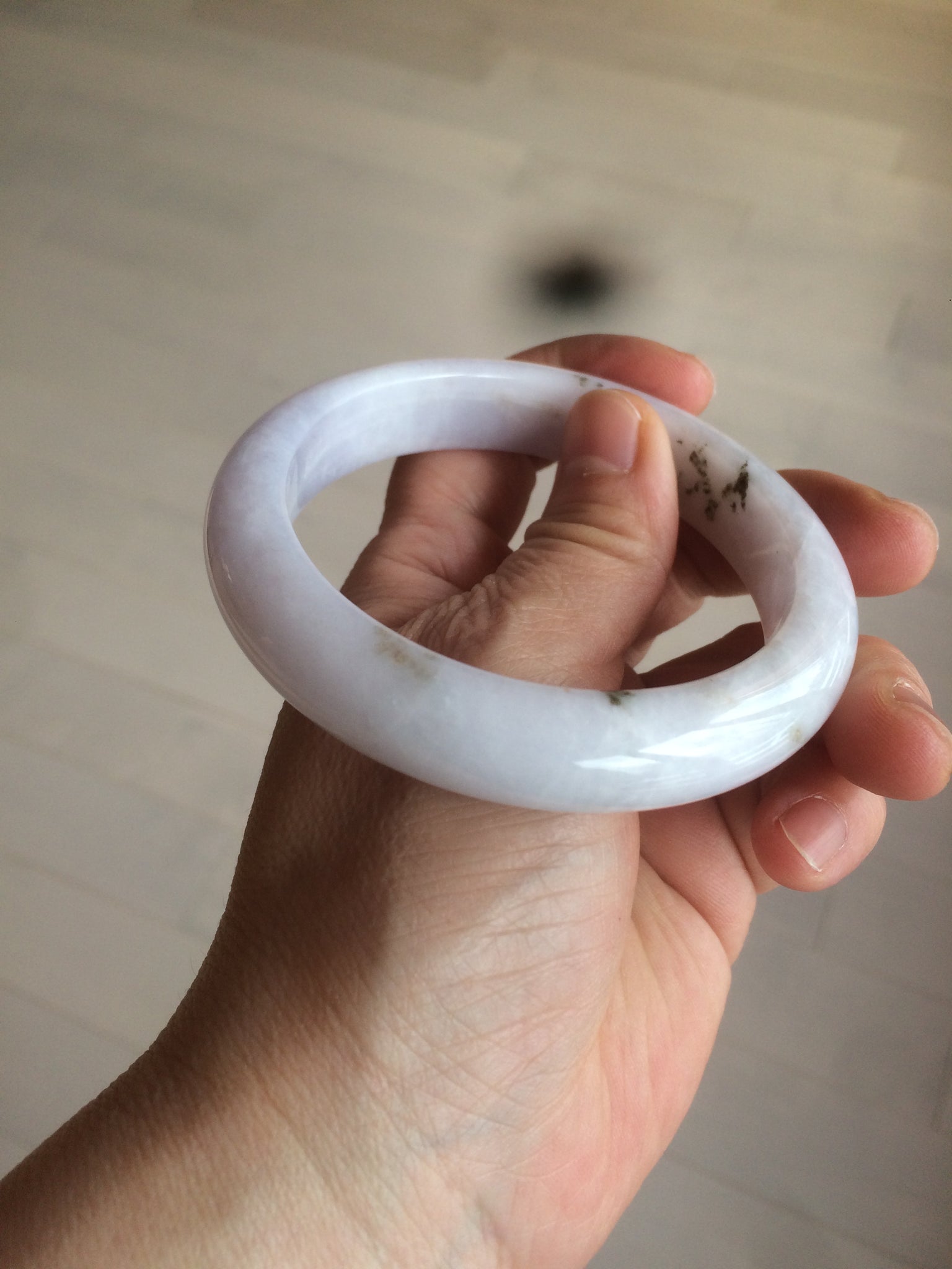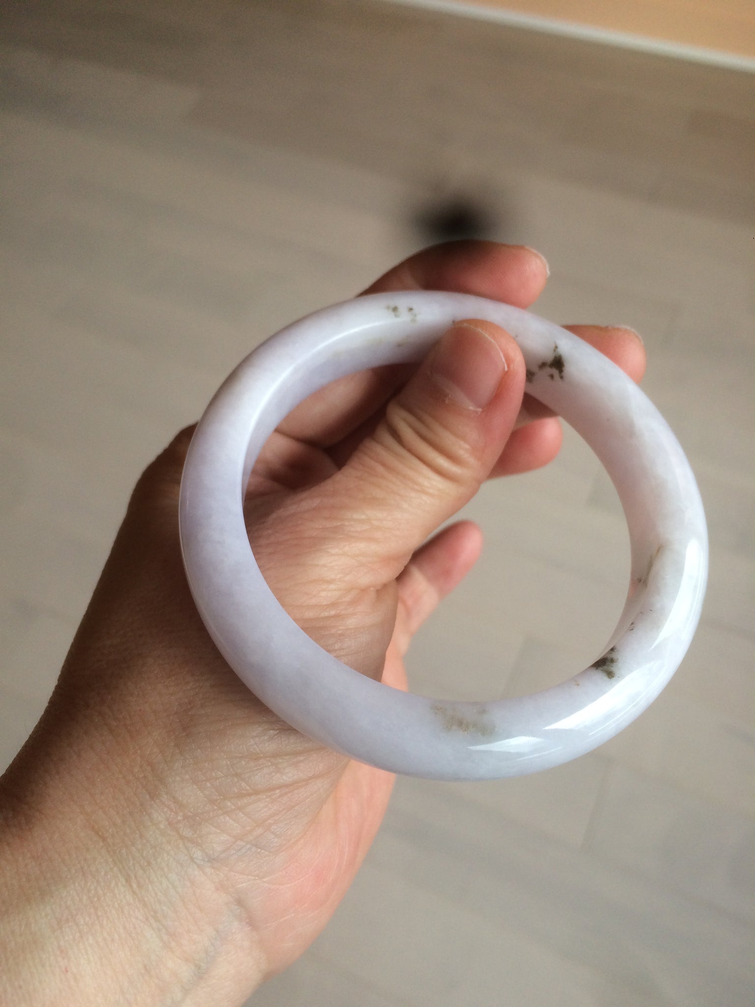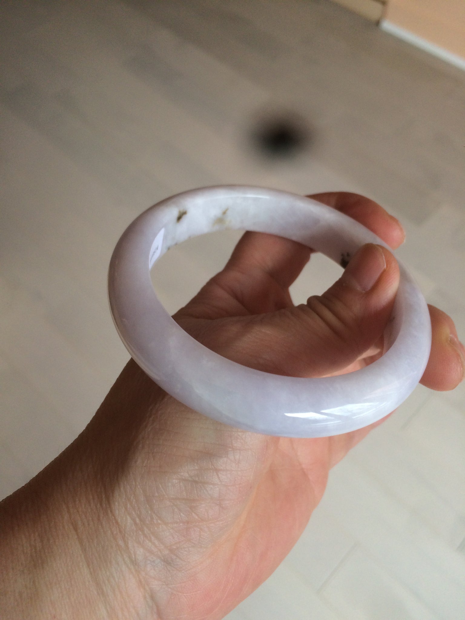 No crack. Some hairlines and cotton lines. The bangle is solid(guaranteed!). A few rough surfaces/mineral impurity/mine pits areas. Bown areas. Not transparent. The purple is super light (almost invisible). Lighter than in the photos.