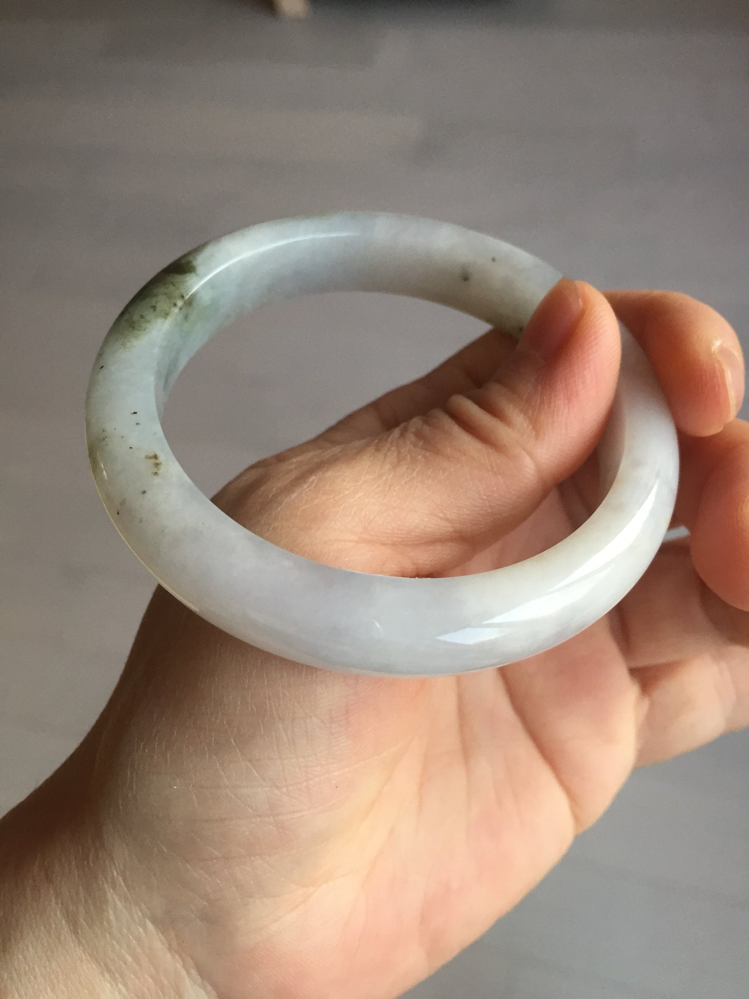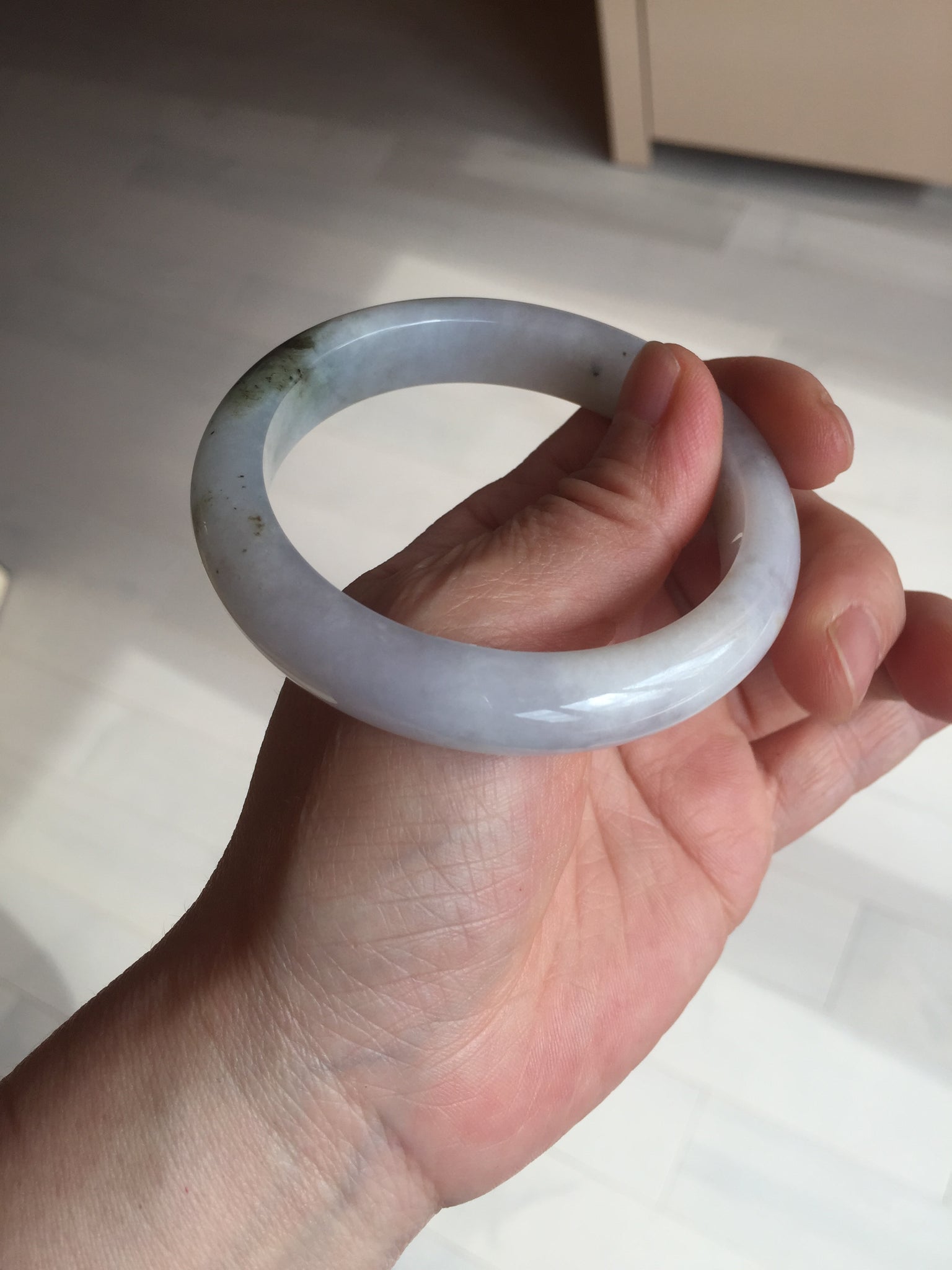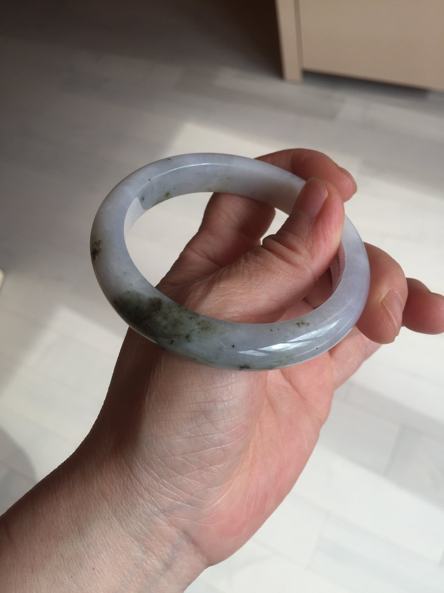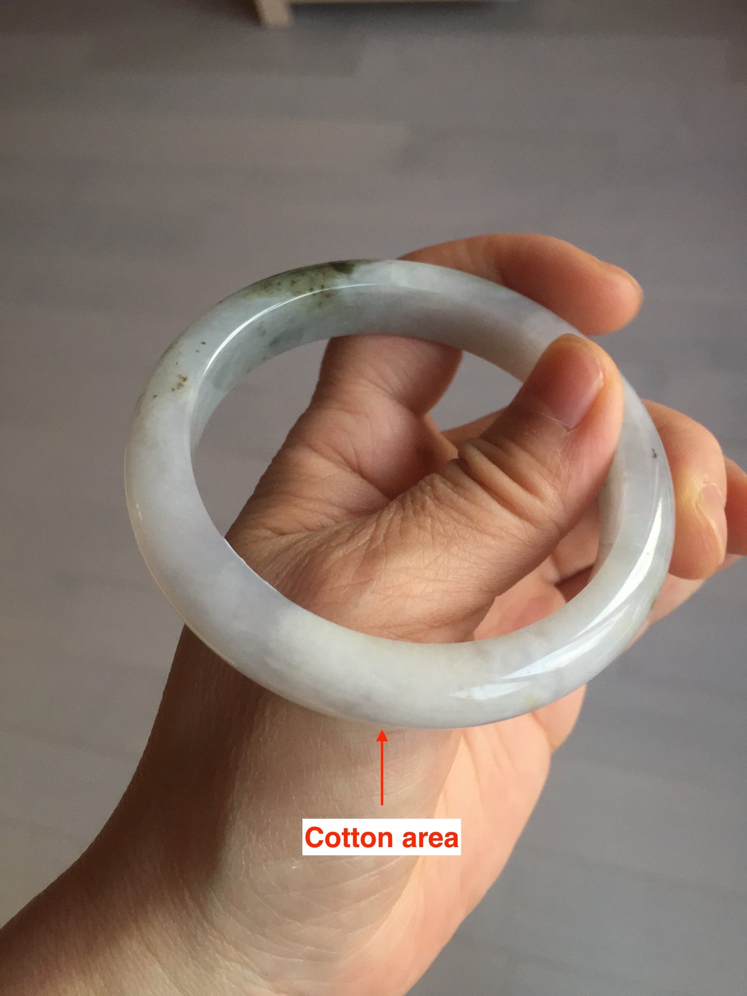 Some surface cracks on the black rough surface areas. The bangle is solid (Guaranteed!). Some cotton lines and cotton areas, black/ brown spots and areas. The purple is super light, only a hint of it.