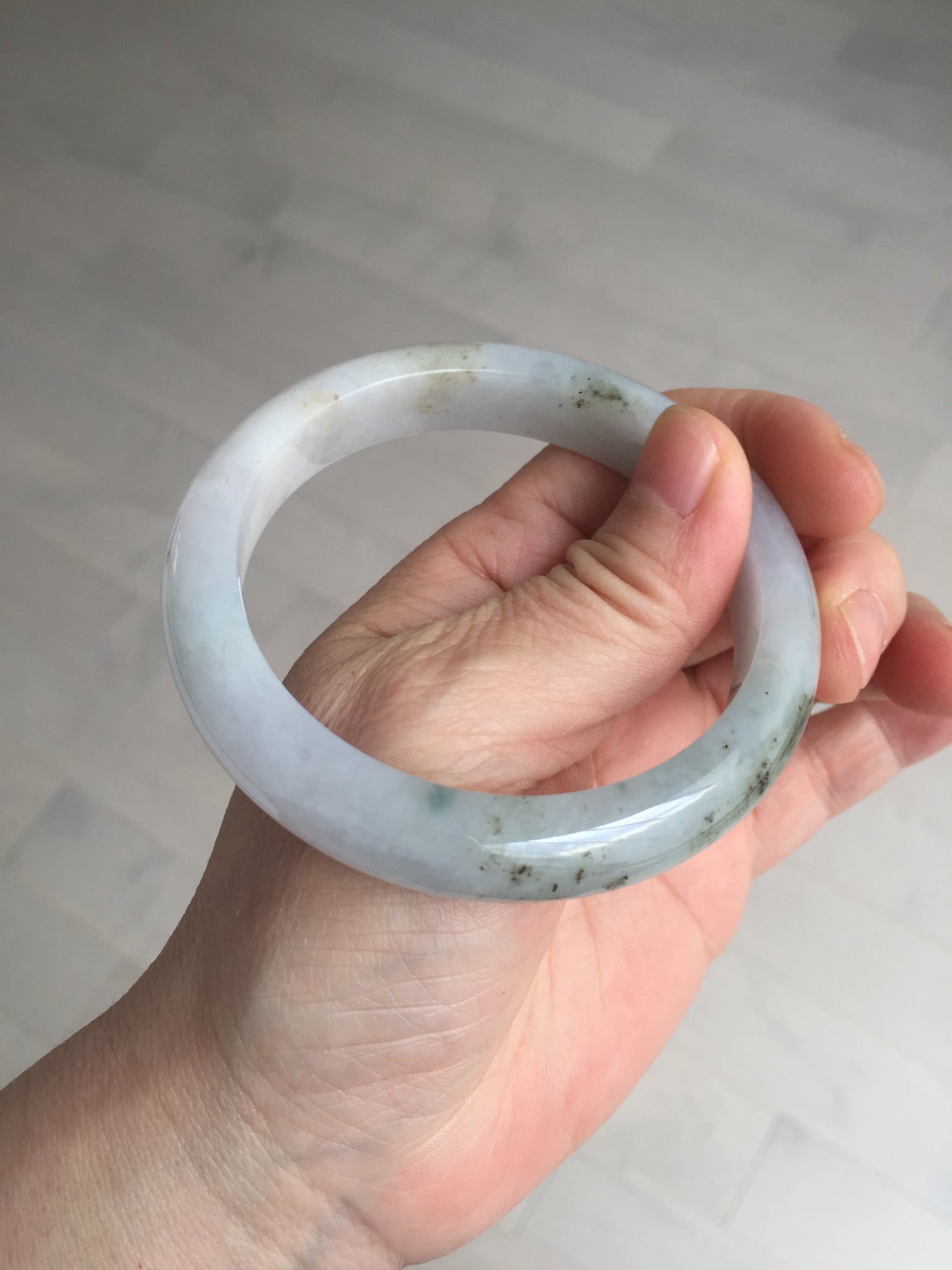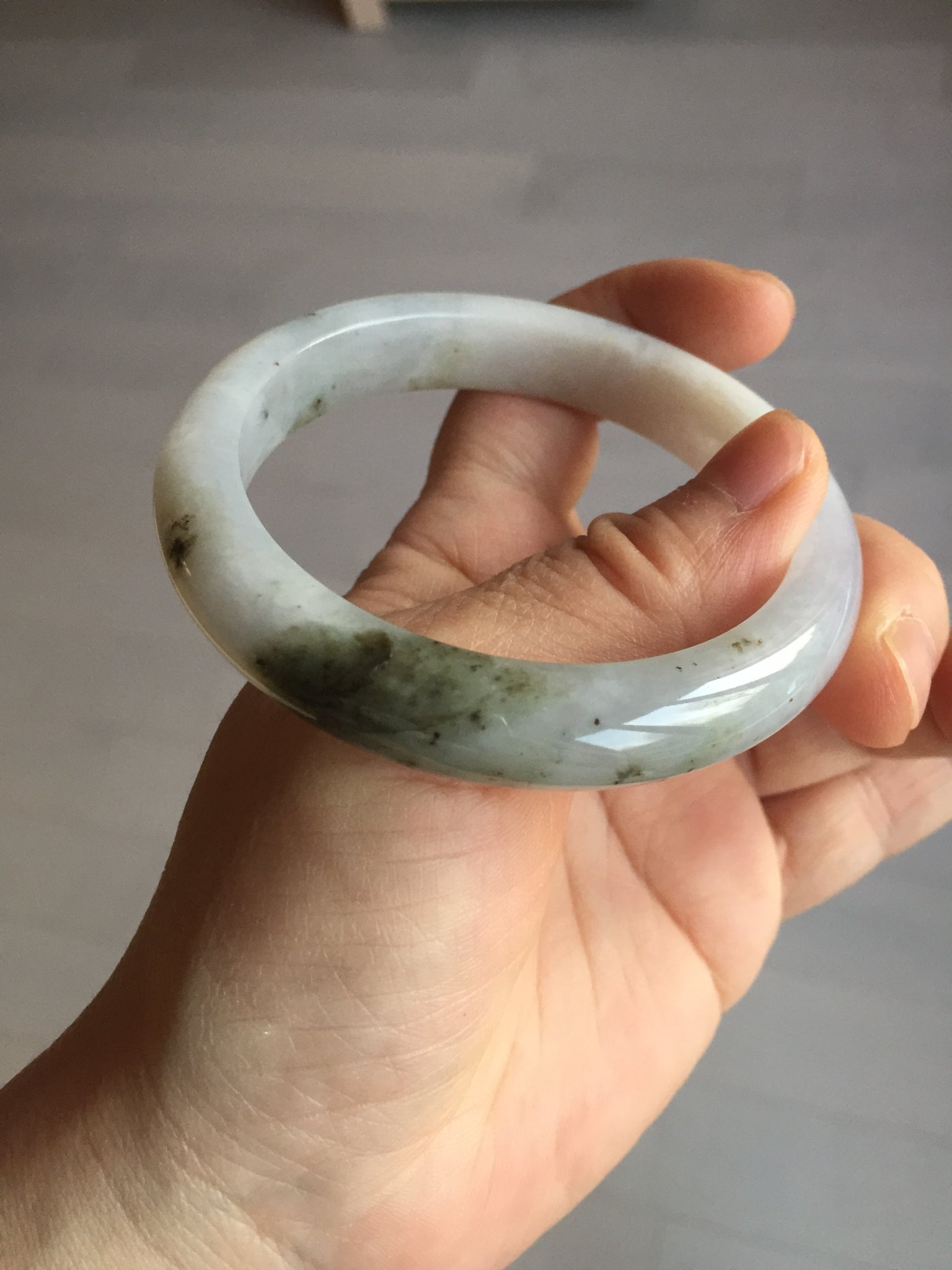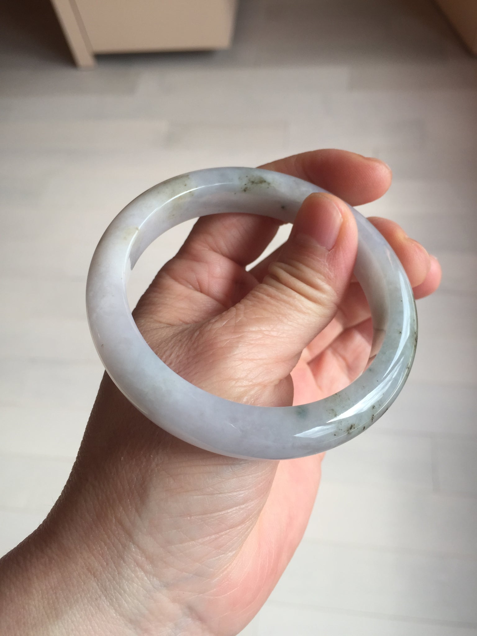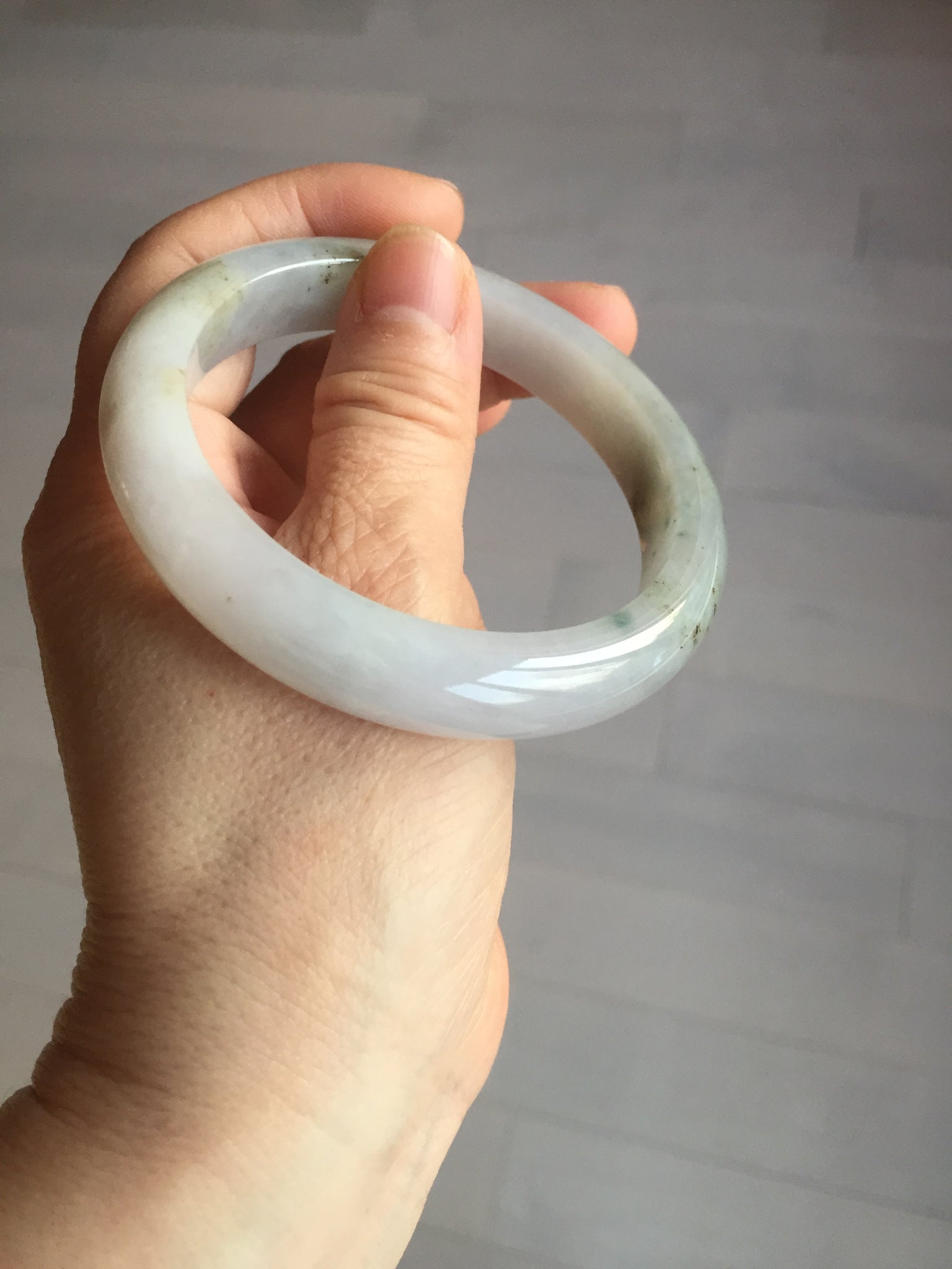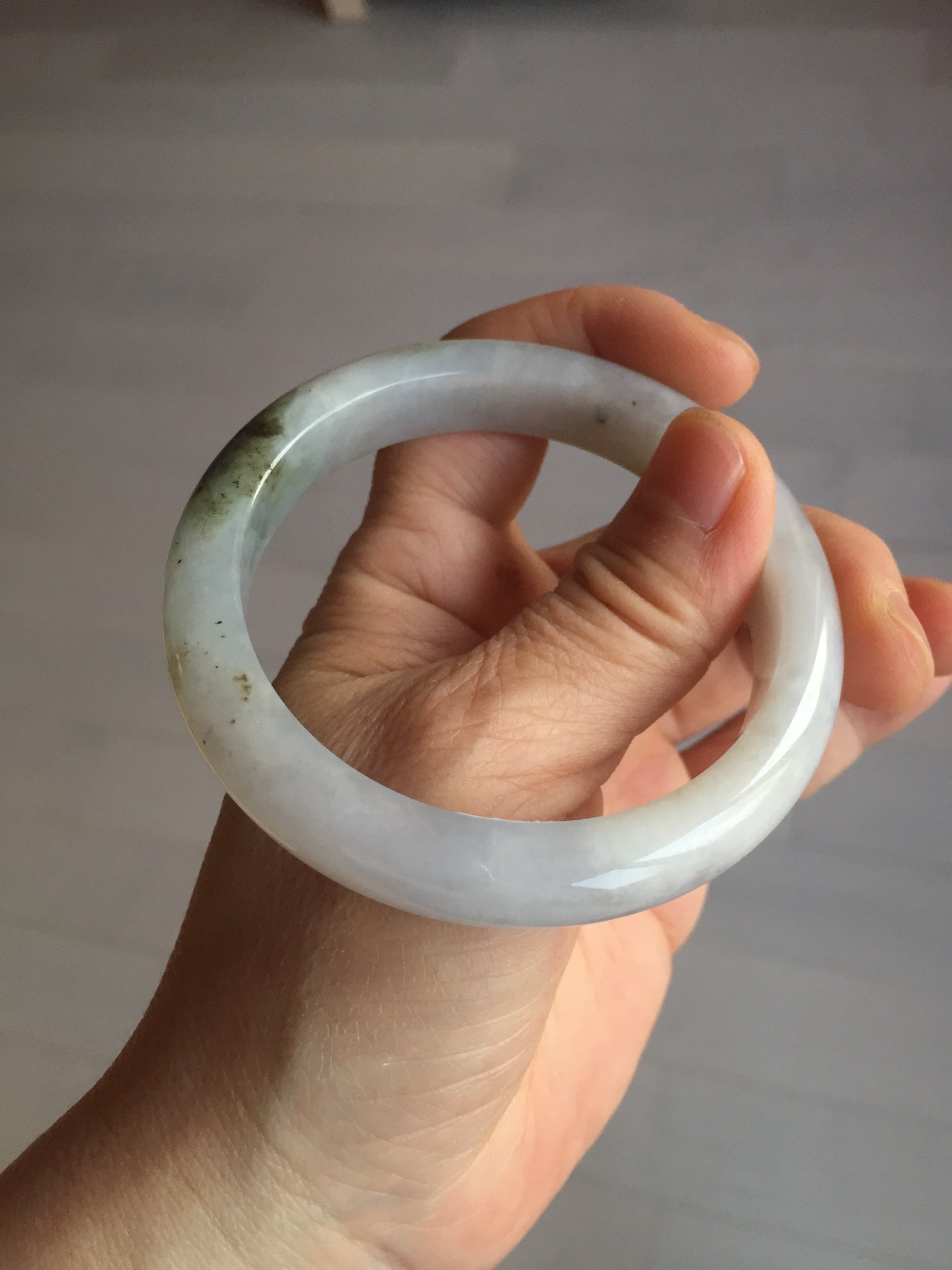 Some surface cracks on the black rough surface areas. The bangle is solid (Guaranteed!). Some cotton lines and cotton areas, black/ brown spots and areas. The purple is super light, only a hint of it.