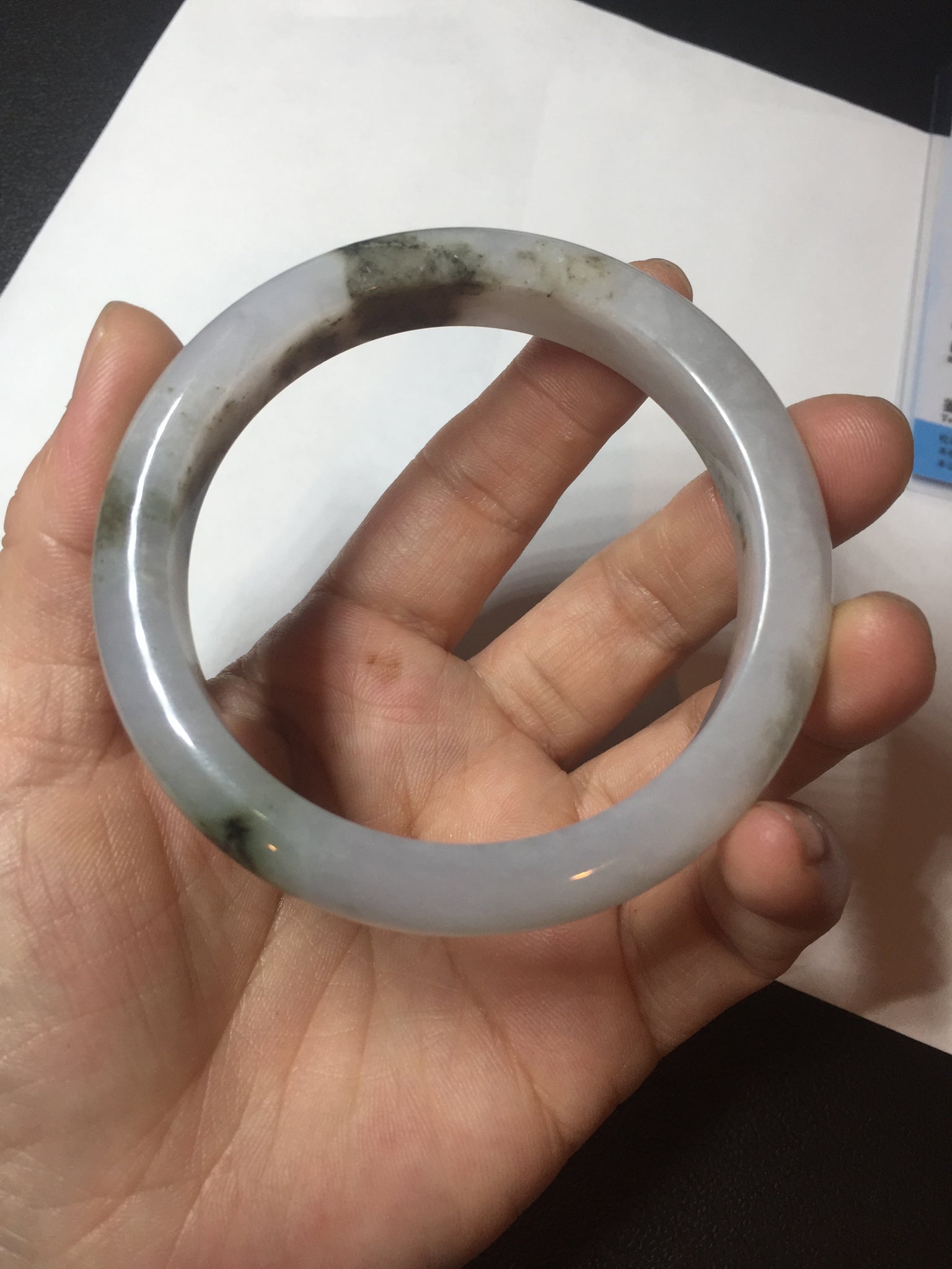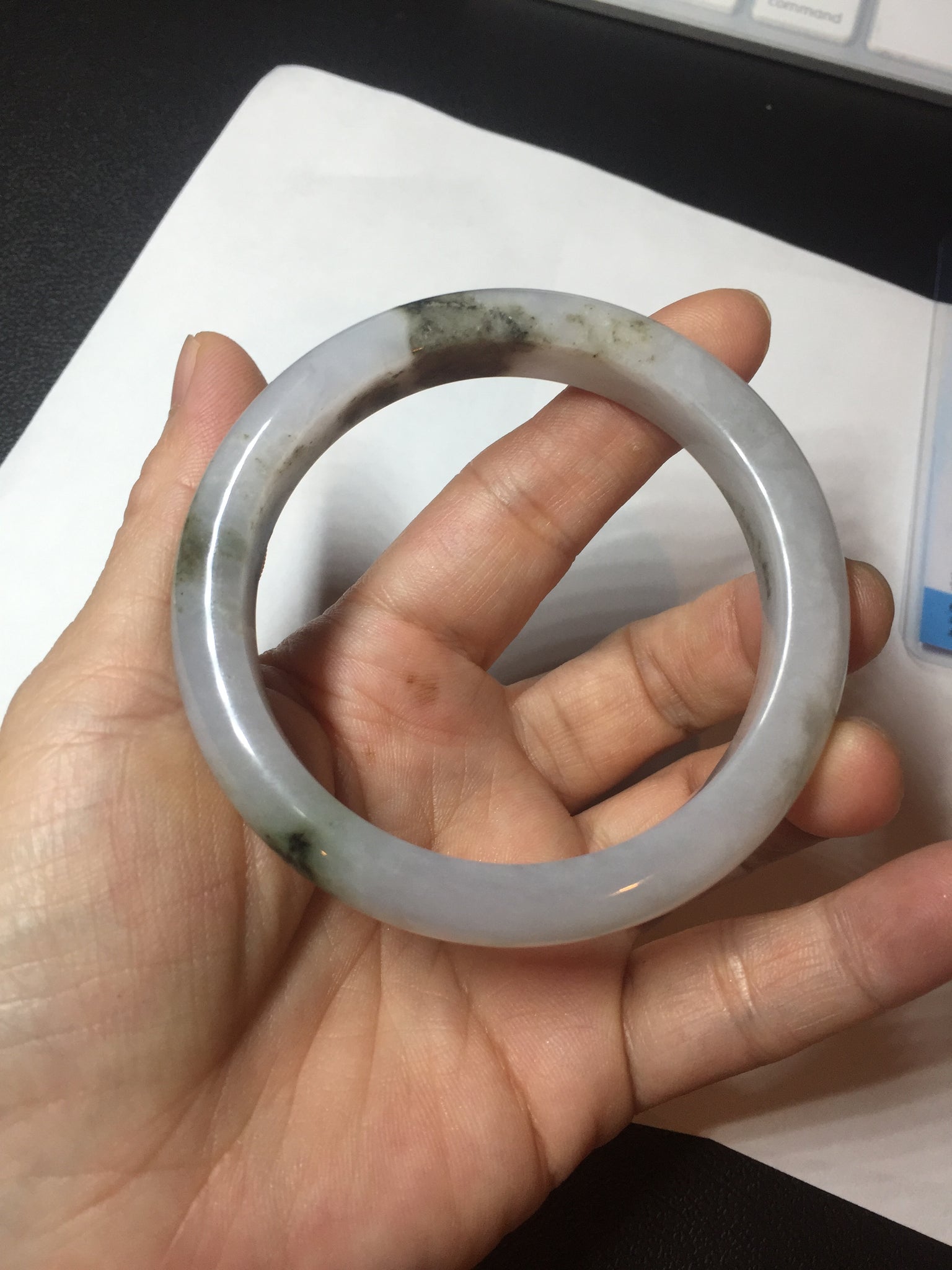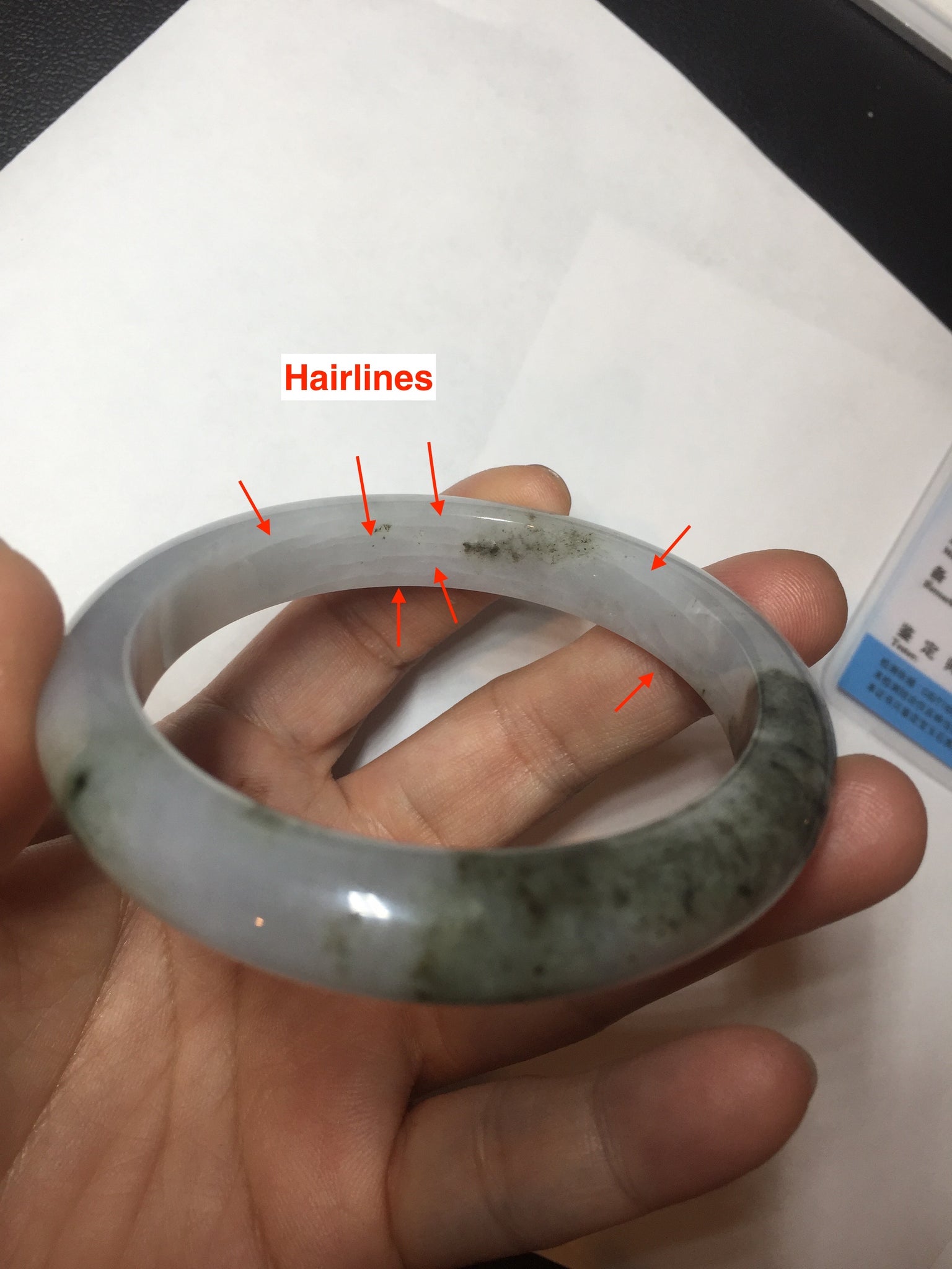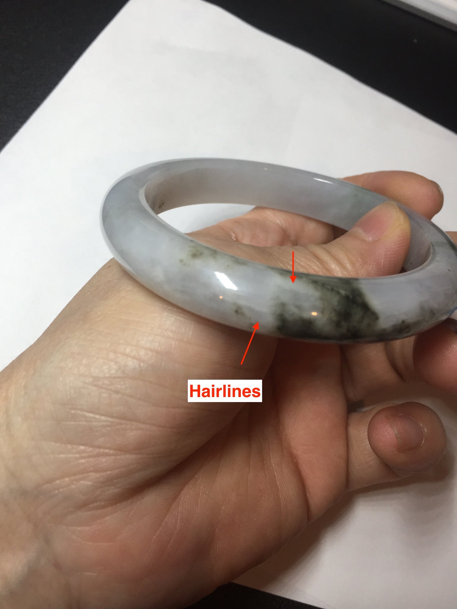 No cracks and the bangle is solid (Guaranteed!). Some hairlines, black rough surface areas, cotton lines and cotton areas, and black/ brown spots. The purple is super light, only a hint of it.