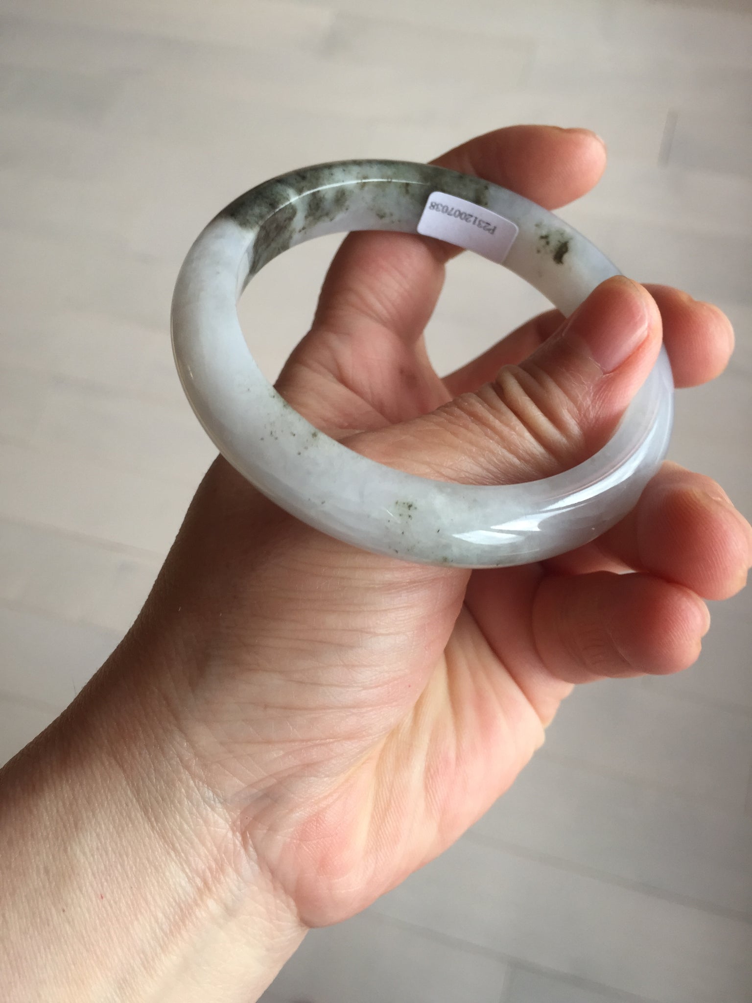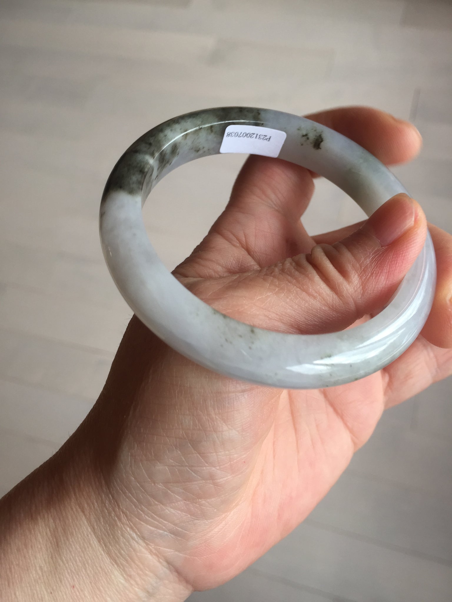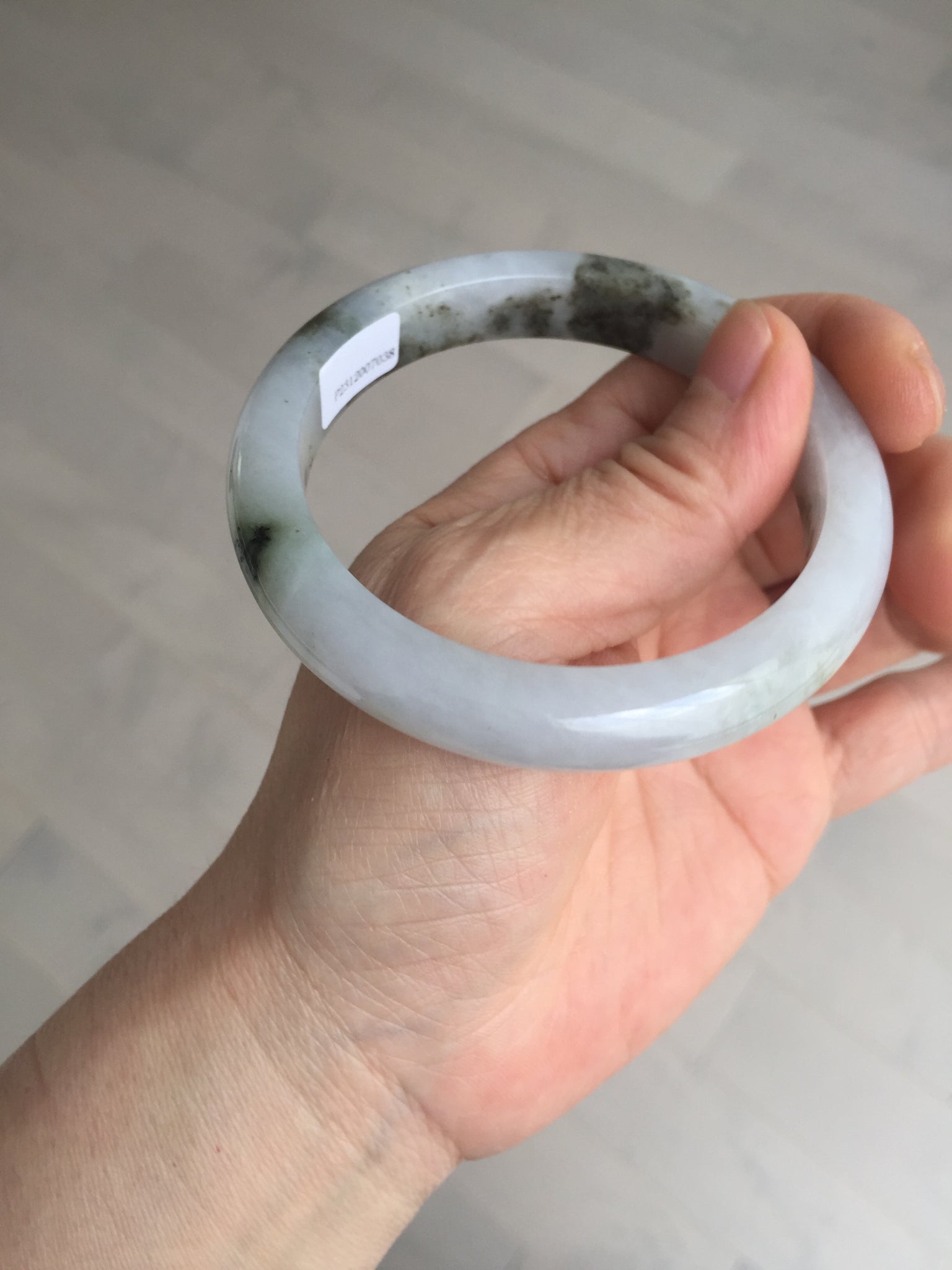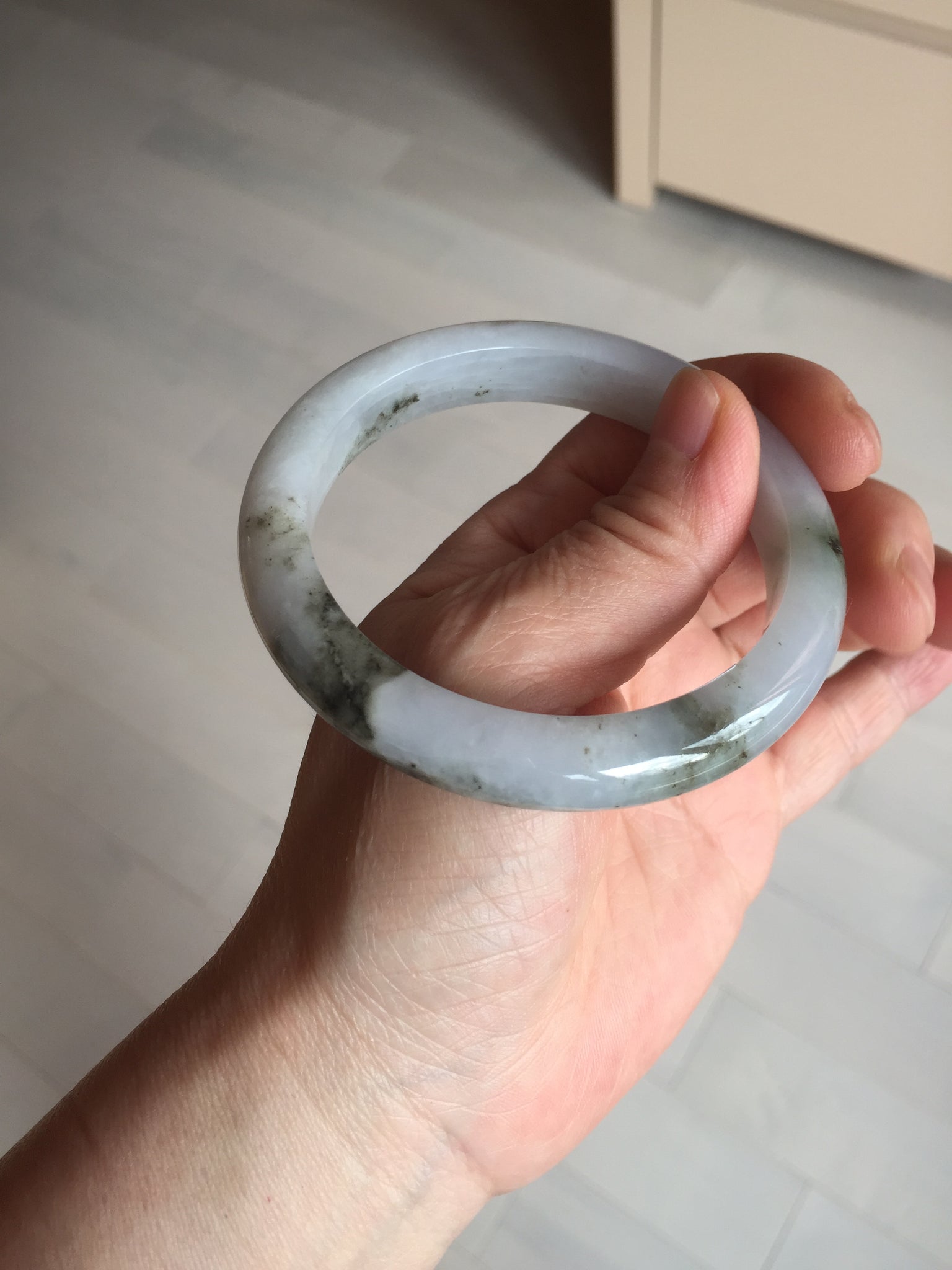 No cracks and the bangle is solid (Guaranteed!). Some hairlines, black rough surface areas, cotton lines and cotton areas, and black/ brown spots. The purple is super light, only a hint of it.