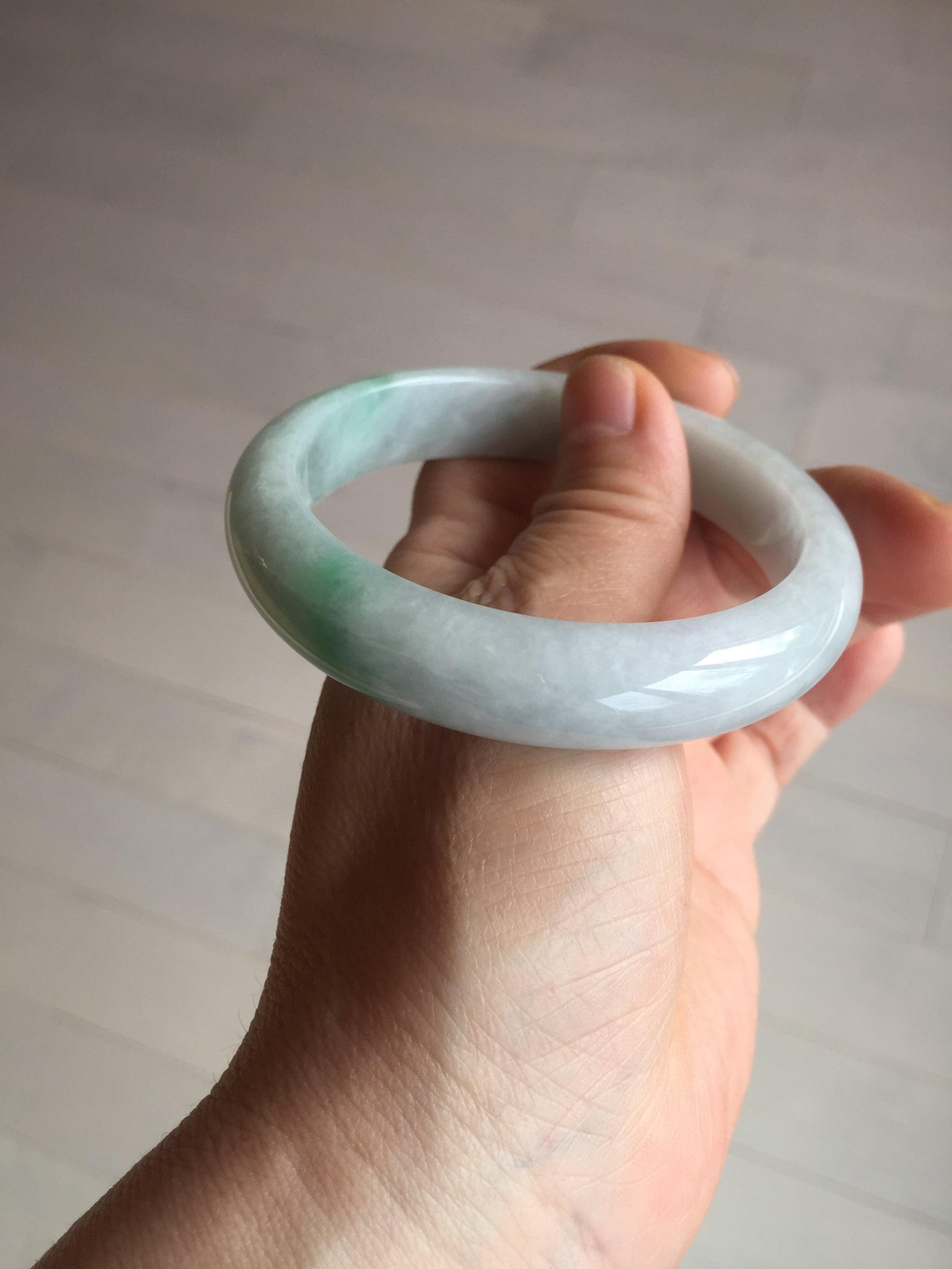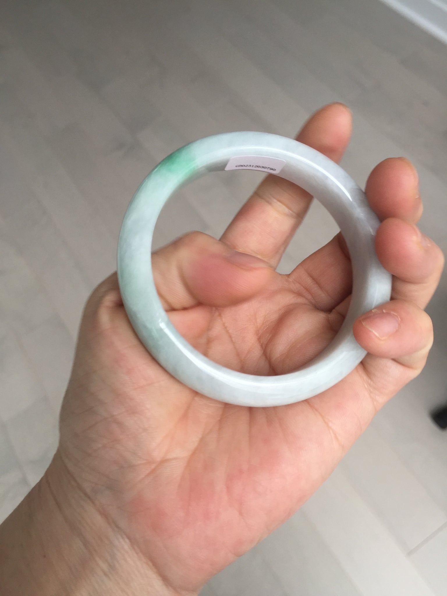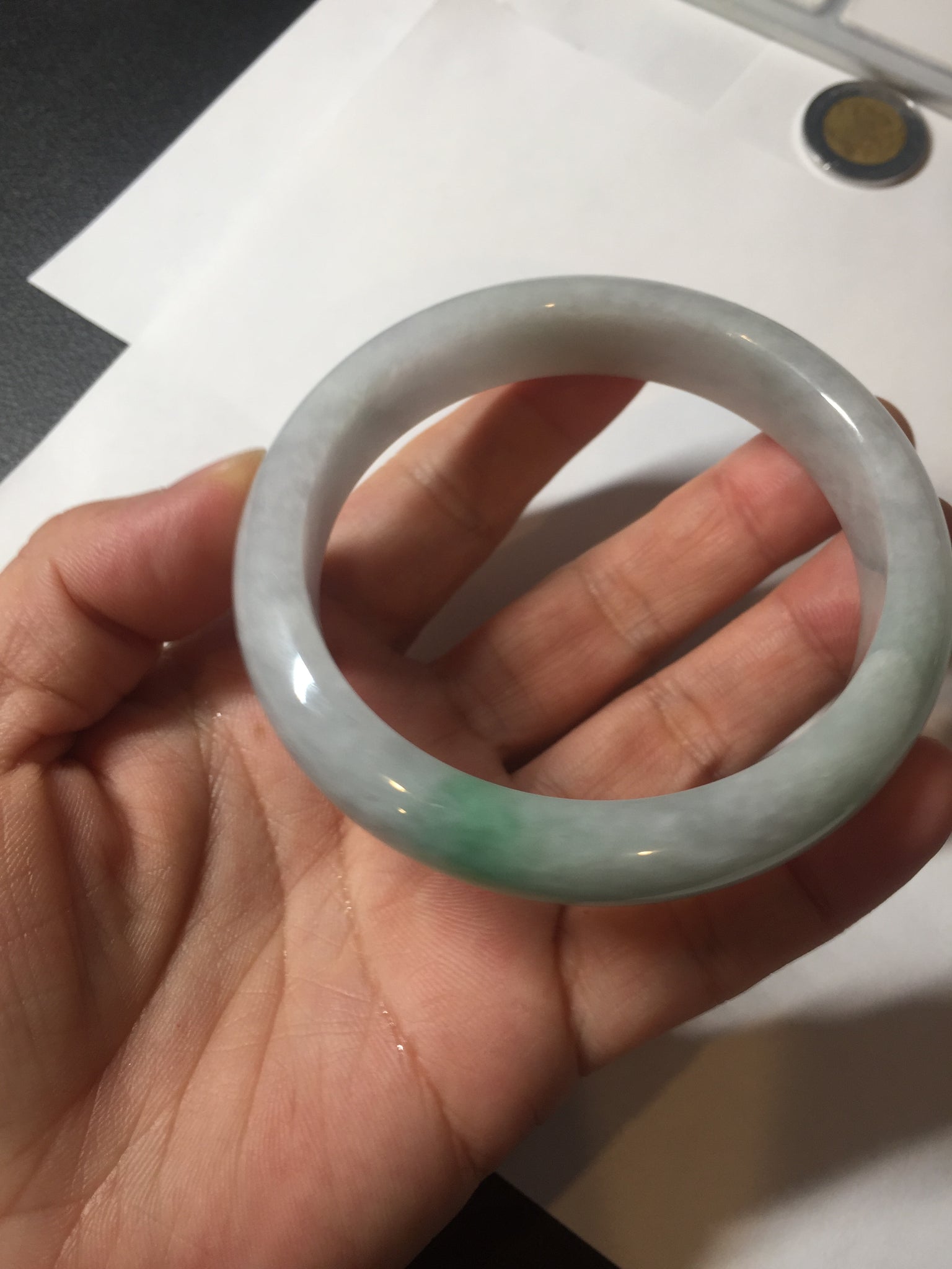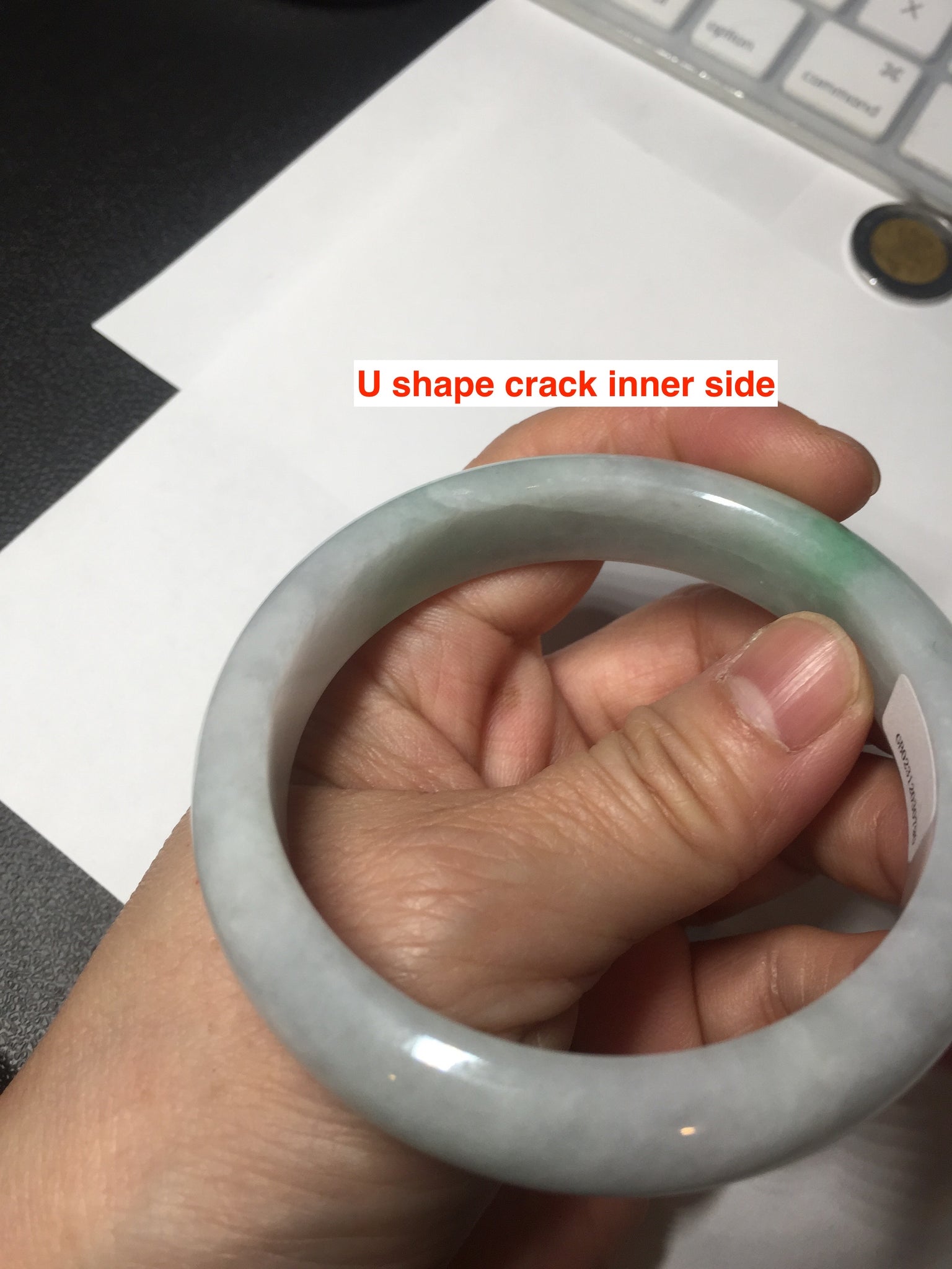 One long U shape crack. The bangle is solid. Guaranteed firmness(refund if break). Some hairlines or cotton areas. The purple is super light. lighter than in the photos.