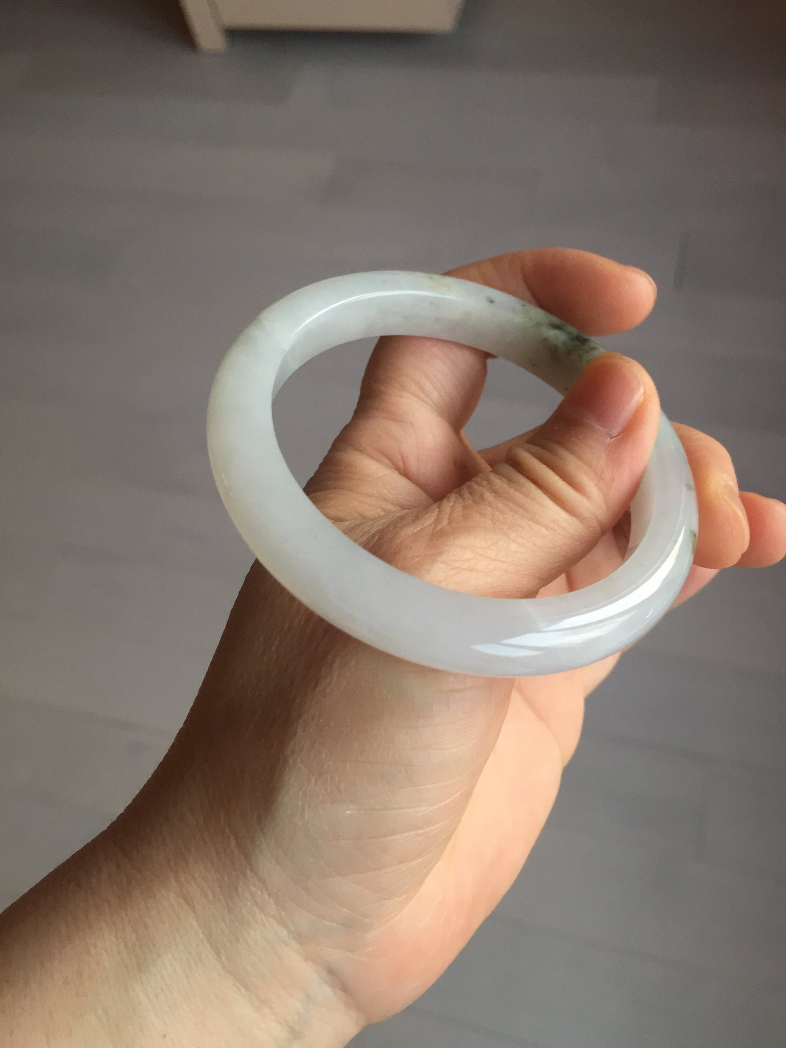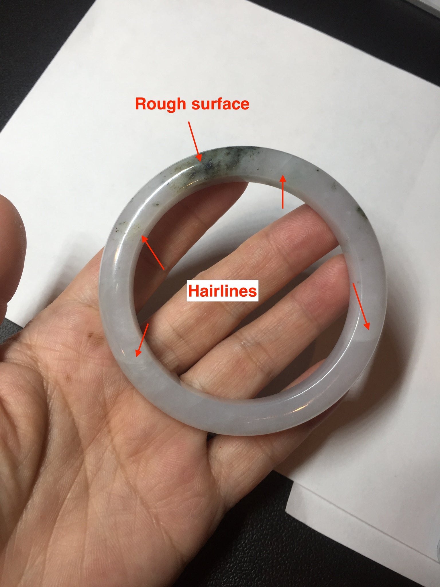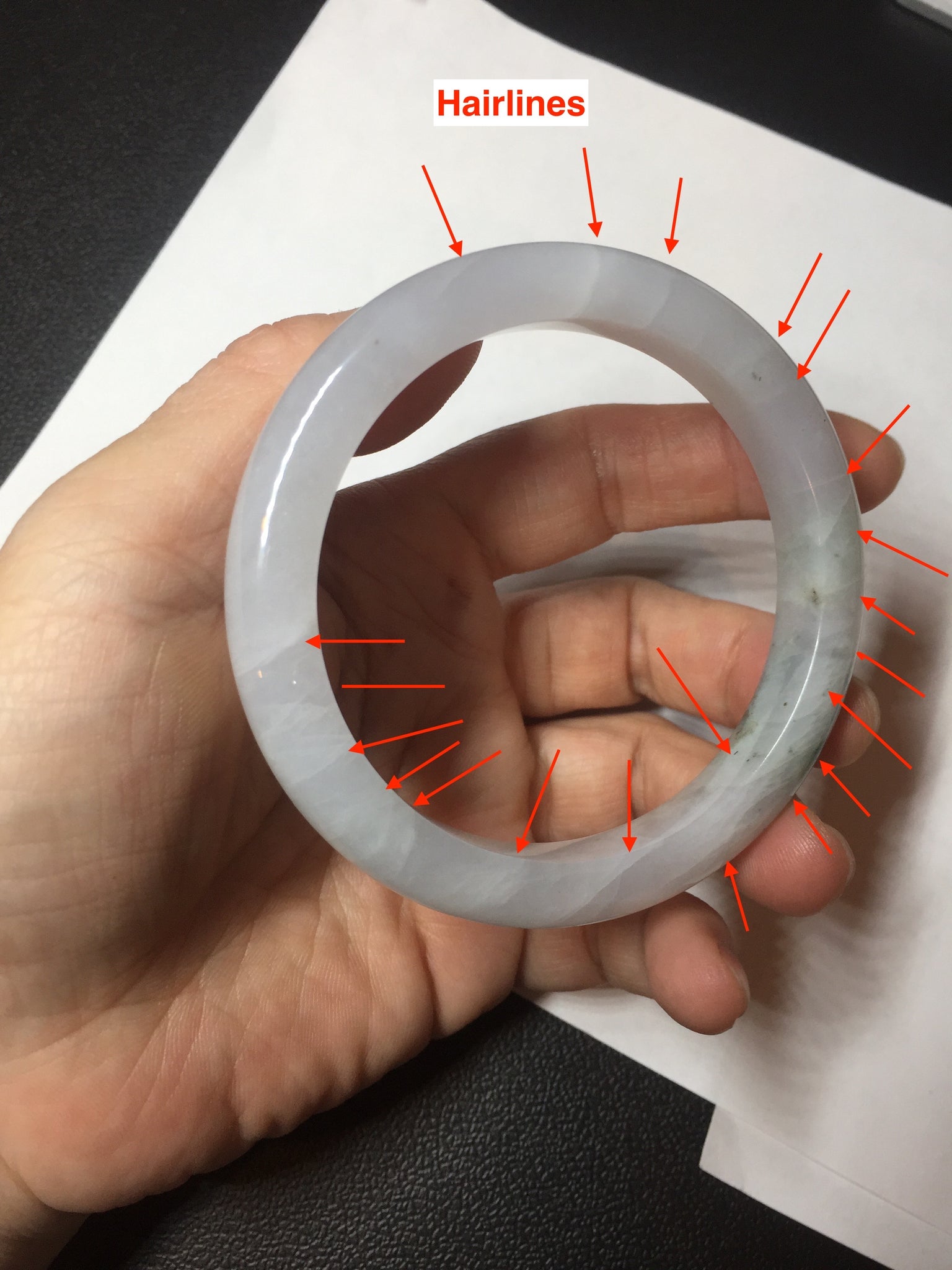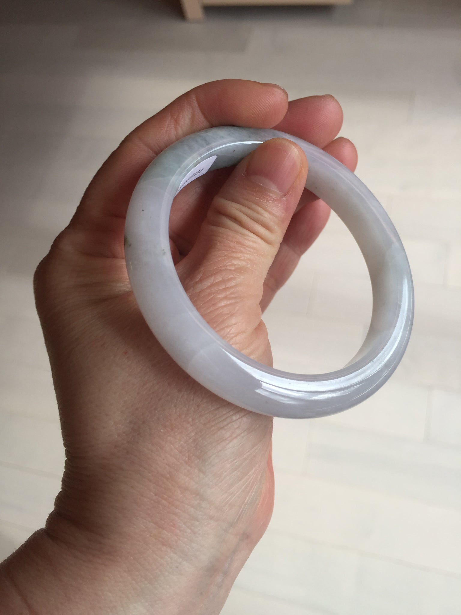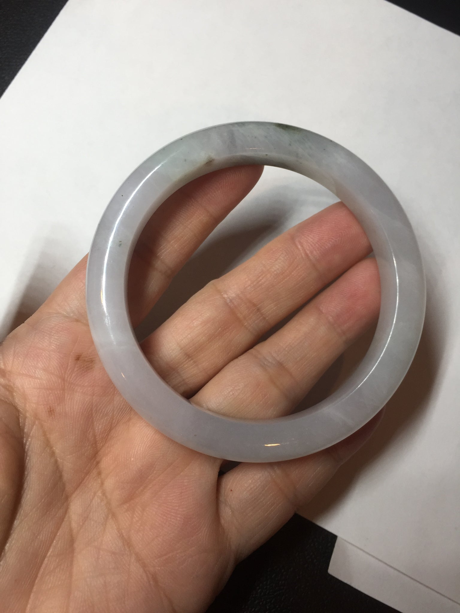 No cracks but quite a lot of hairlines. The bangle is solid (Guaranteed!). Some cotton lines and cotton areas, black/ brown spots and areas. The purple is super light and it is only a hint of it.