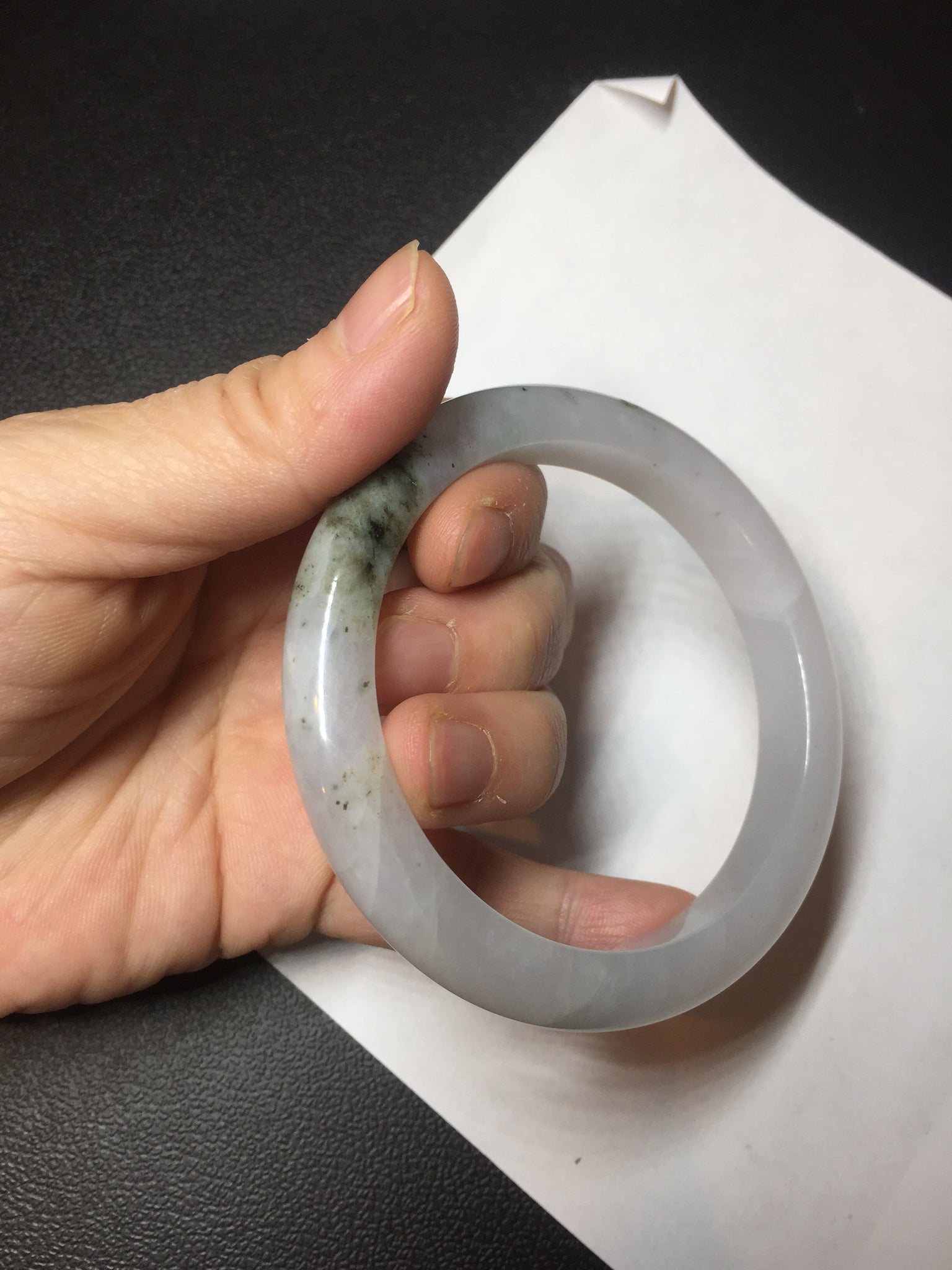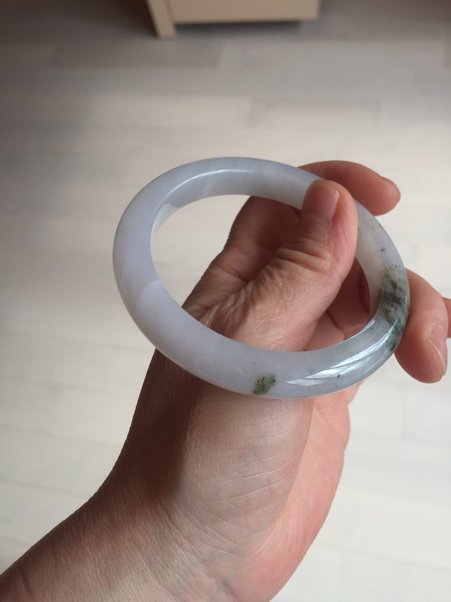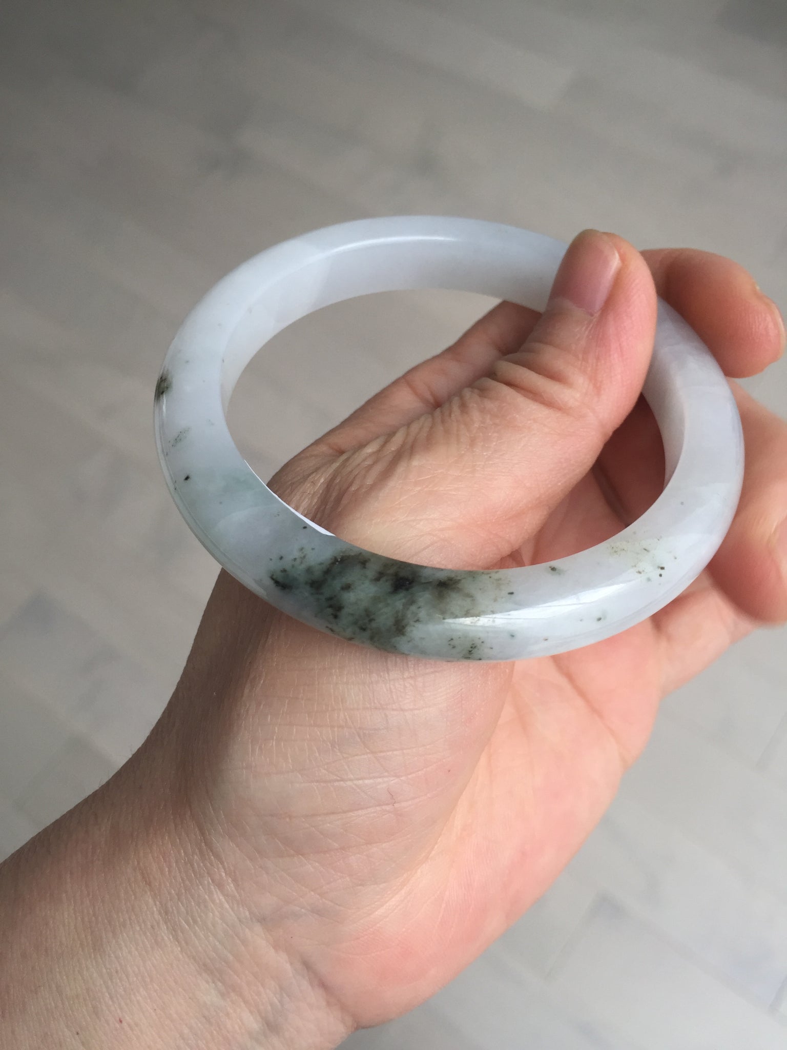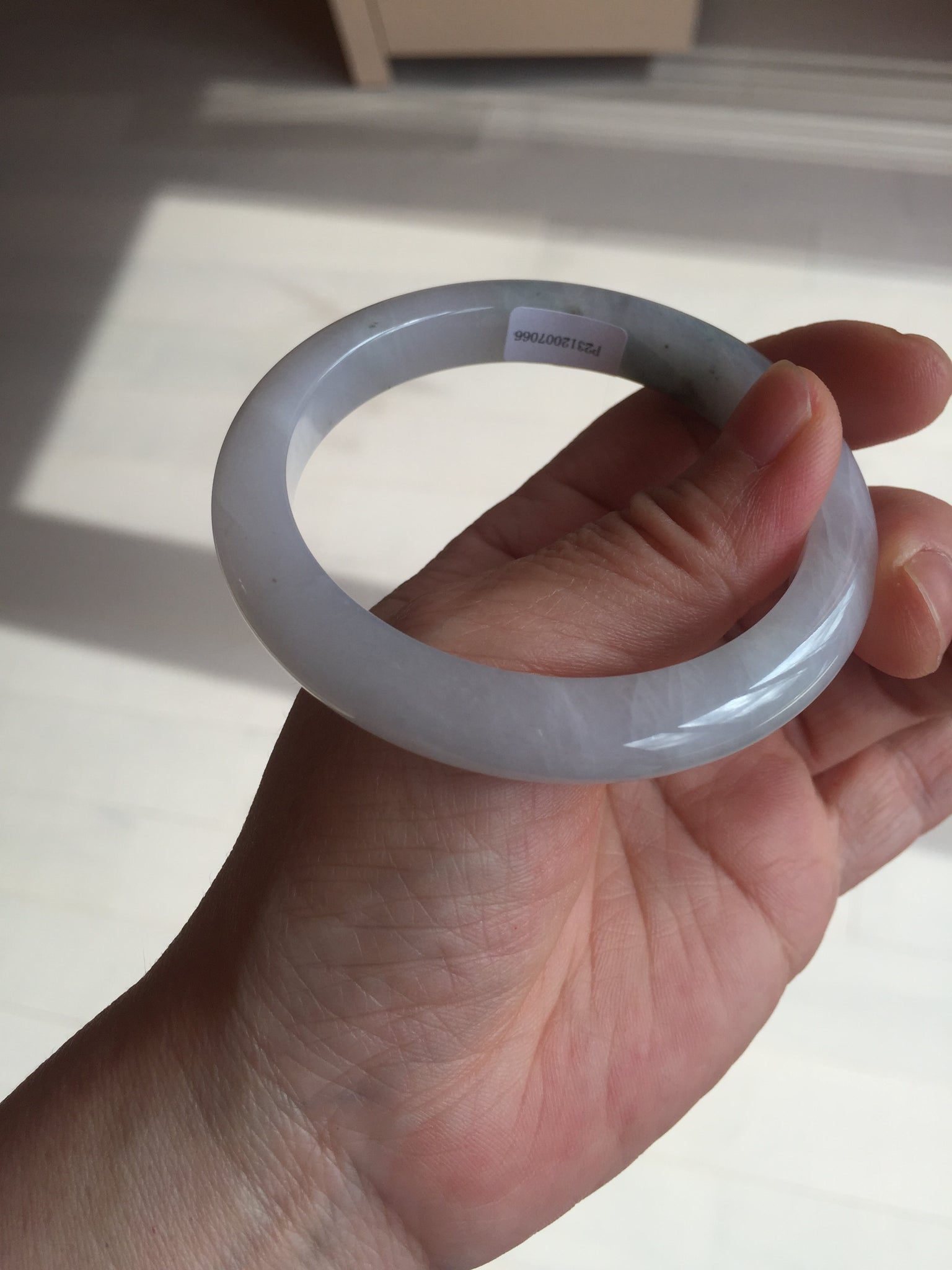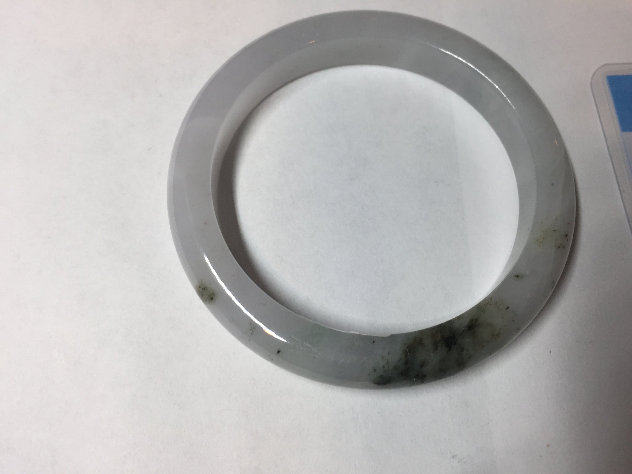 No cracks but quite a lot of hairlines. The bangle is solid (Guaranteed!). Some cotton lines and cotton areas, black/ brown spots and areas. The purple is super light and it is only a hint of it.